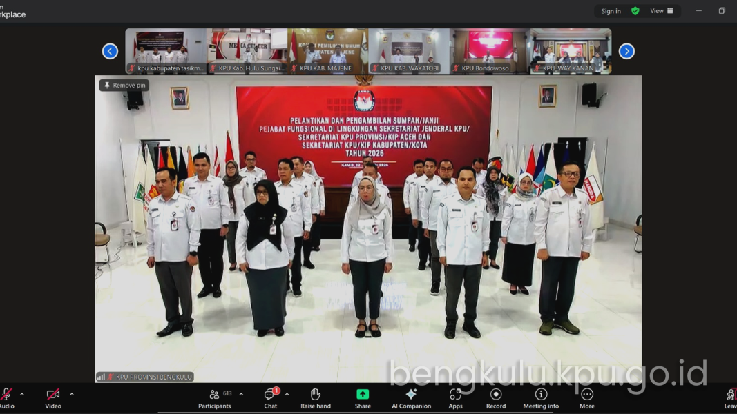 Bengkulu, Bengkulu.kpu.go.id – Komisi Pemilihan Umum Republik Indonesia secara resmi melantik dan mengambil sumpah/janji ribuan Pejabat Fungsional Penata Kelola Pemilihan Umum tahun 2026. Agenda besar ini diikuti secara serentak oleh jajaran Sekretariat Jenderal KPU, KPU Provinsi/KIP Aceh, hingga KPU/KIP Kabupaten/Kota di seluruh Indonesia pada Kamis (22/1/2026). Di Bengkulu sendiri, prosesi pelantikan berlangsung khidmat di Aula Demokrasi KPU Provinsi Bengkulu. Sebanyak 19 orang pegawai KPU Provinsi Bengkulu resmi menyandang status jabatan fungsional baru, bergabung dengan total 2.519 pejabat yang dilantik secara nasional oleh Sekretaris Jenderal KPU RI, Bernad Dermawan Sutrisno. Acara yang digelar secara hybrid ini disaksikan langsung oleh Sekretaris KPU Provinsi Bengkulu, Kemas Mohammad Ajir, bersama jajaran Pejabat Eselon III, Eselon IV, dan Pejabat fungsional di lingkungan KPU Provinsi Bengkulu. Pesan Sekjen KPU : Profesionalitas Tanpa Batas Dalam sambutannya, Sekjen KPU Bernad Dermawan Sutrisno menekankan bahwa perubahan status jabatan ini bukan sekadar formalitas administratif, melainkan sebuah amanah besar. "Status baru yang saudara emban merupakan tanggung jawab tersendiri. Saya berharap saudara mampu meningkatkan effort kerja yang lebih profesional, berintegritas, dan bertanggung jawab. Perlu diingat bahwa perubahan ini tidak disertai perpindahan lokus tugas, namun merupakan perubahan status jabatan. Tetaplah jaga komitmen, loyalitas, serta kualitas kinerja dalam mendukung fungsi organisasi," tegas Bernad. Ketua KPU : Jaga Integritas dan Semangat Baru Senada dengan Sekjen, Ketua KPU RI Mochammad Afifuddin memberikan arahan strategis bagi para pejabat yang baru dilantik. Ia berharap momentum ini menjadi pemicu semangat baru dalam birokrasi KPU. "Saya berharap seluruh pegawai semakin bersemangat dan mampu menunjukkan kinerja yang lebih baik dari waktu ke waktu. Perubahan status ini adalah awal yang baik. Kami sebagai pimpinan memberikan dukungan penuh dan mendorong adanya kerja sama, koordinasi, serta komunikasi yang efektif antarpegawai. Tetaplah menjunjung tinggi nilai integritas, disiplin, dan profesionalisme dalam setiap langkah tugas," ujar Afifuddin. Pelantikan ini menjadi langkah krusial bagi KPU dalam memperkuat struktur organisasi melalui jalur fungsional, guna memastikan pelaksanaan tahapan demokrasi di Indonesia berjalan lebih efektif dan akuntabel. (humas kpu firman/foto: surya) ....