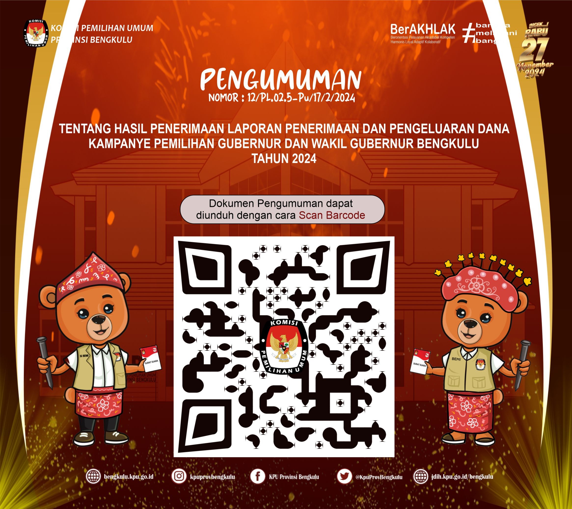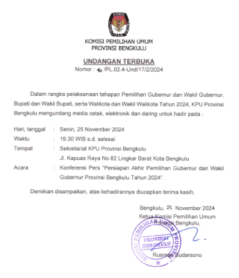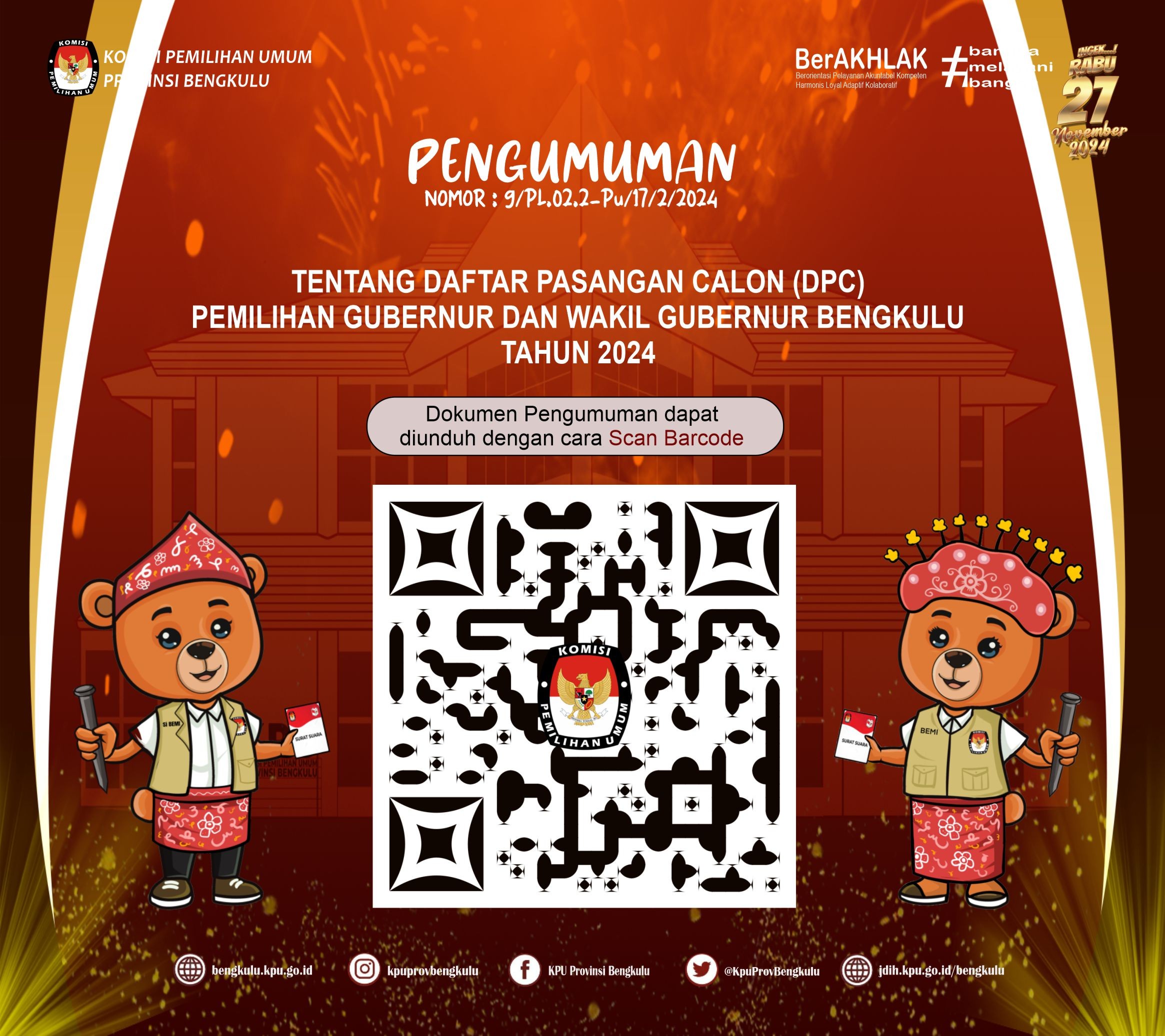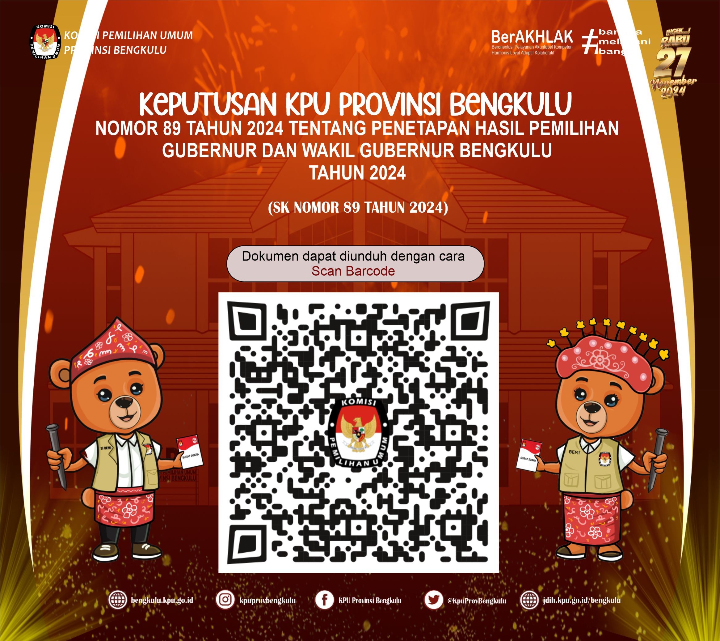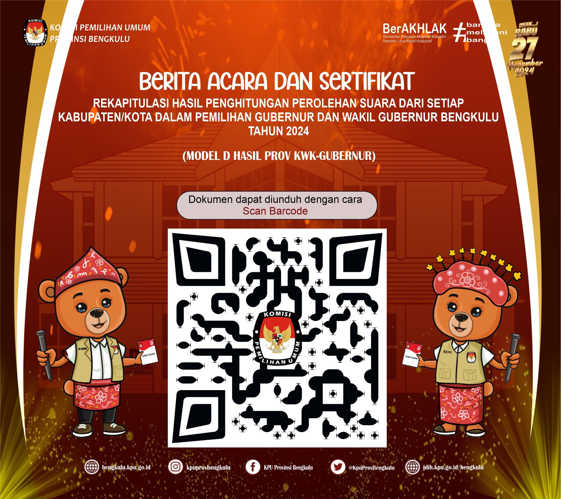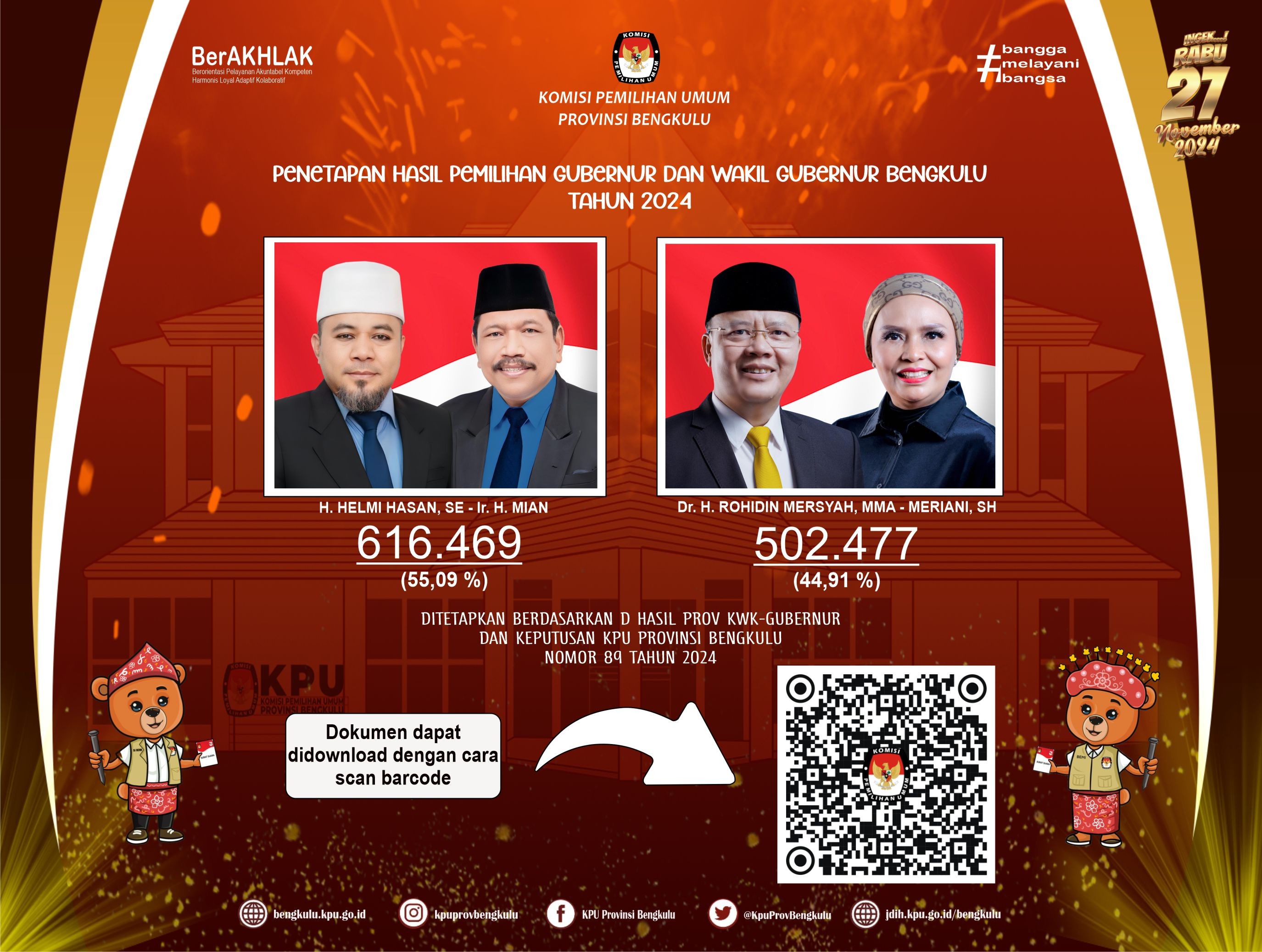 Bengkulu, bengkulu.kpu.go.id - KPU Provinsi Bengkulu telah menetapkan Perolehan Suara Gubernur dan Wakil Gubernur Bengkulu Tahun 2024 untuk Pasangan Calon Nomor Urut 1 (H. Helmi Hasan, SE - Ir. H. Mian) memperoleh sebanyak 616.469 (enam ratus enam belas ribu empat ratus enam puluh sembilan) suara dengan persentase 55.09 % dan Pasangan Calon Nomor Urut 2 (Dr. H. Rohidin Mersyah, MMA - Meriani, SH) memperoleh sebanyak 502.477 (lima ratus dua ribu empat ratus tujuh puluh tujuh) suara dengan persentase 44.91 %. KPU Provinsi Bengkulu telah menuangkan hasil perolehan suara ke dalam Berita Acara dan Sertifikat Hasil Penghitungan Perolehan Suara Dari Setiap Kabupaten/Kota Dalam Pemilihan Gubernur dan Wakil Gubernur Bengkulu Tahun 2024 (Formulir Model D Hasil Prov KWK-Gubernur) dan Keputusan Nomor 89 Tahun 2024 tentang Penetapan Hasil Pemilihan Gubernur dan Wakil Gubernur Bengkulu Tahun 2024.