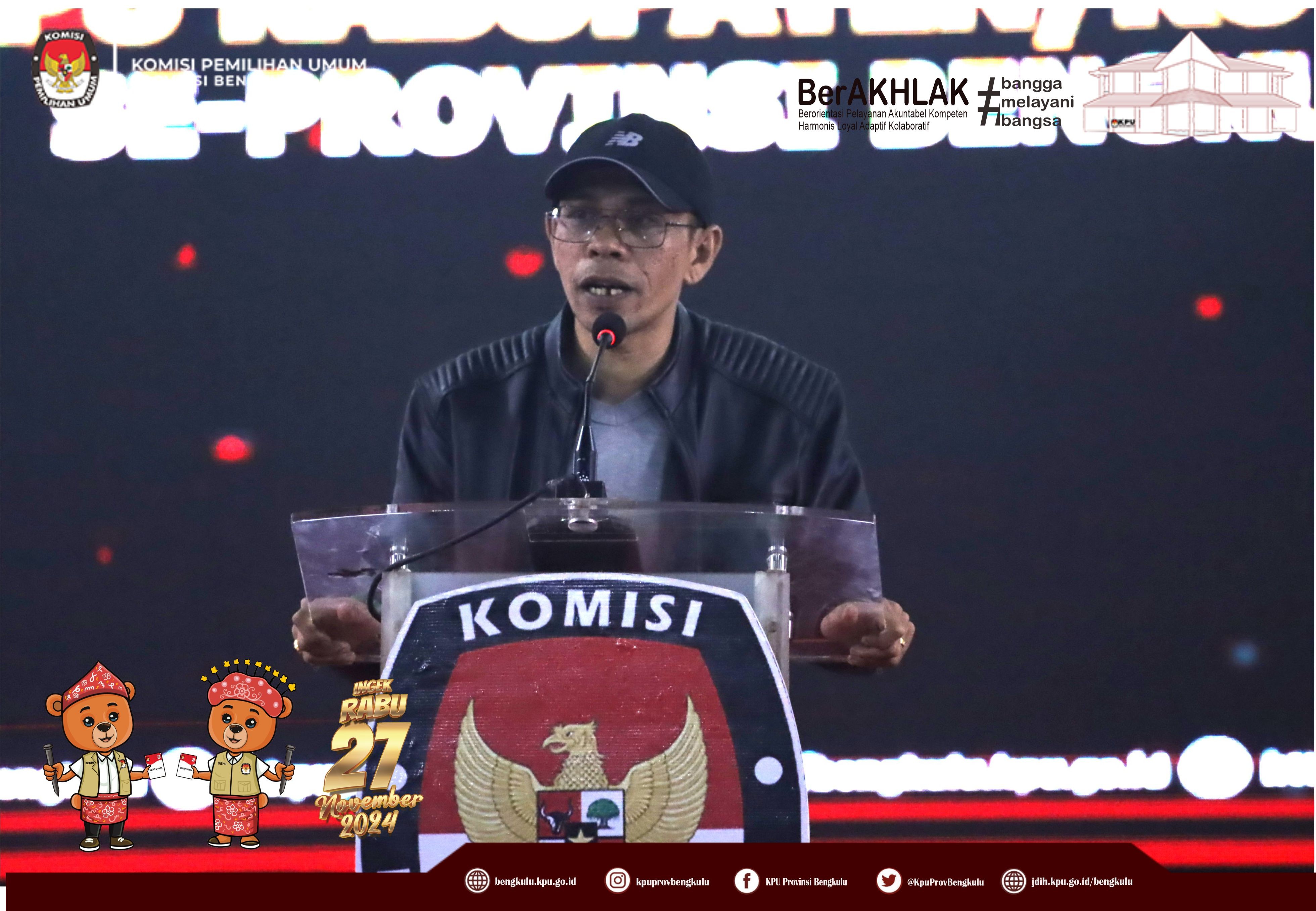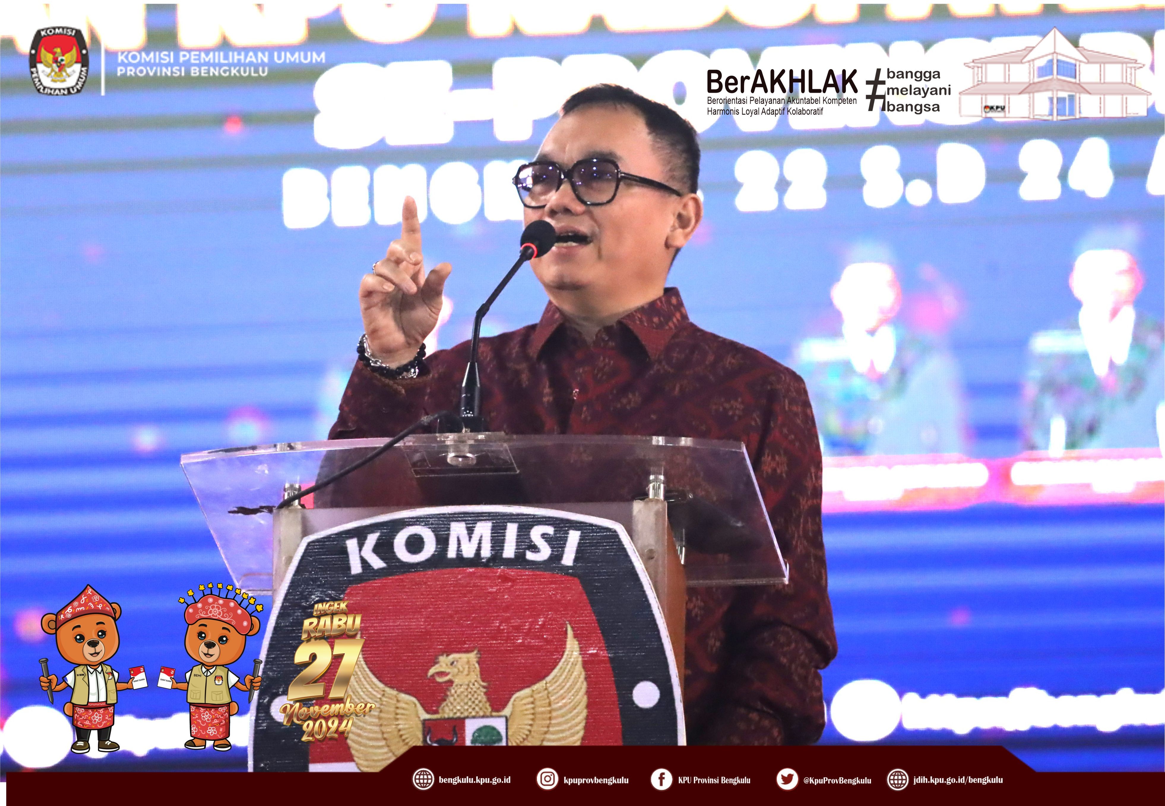 Bengkulu, bengkulu.kpu.go.id - Anggota KPU Bapak Parsadaan Harahap memberikan arahan dalam Konsolidasi Daerah KPU Provinsi Bengkulu dengan KPU Kabupaten/Kota, PPK dan PPS se-Provinsi Bengkulu Gelombang 2 Tahun 2024. Hadir Ketua KPU Provinsi Bengkulu Bapak Rusman Sudarsono dan Anggota KPU Provinsi Bengkulu,bengkulu.kpu.go.id - Bengkulu Bapak Alpin Samsen, Bapak Dodi Hendra Supiarso, Bapak Emex Verzoni, dan Bapak Sarjan Efendi serta Tenaga Ahli KPU Irwan Saputra dan Plh. Sekretaris Oktan Huzaeiry dan Plt. Kabag Rendatin Martoni, Jum'at (23/8/2024) di Gedung Serba Guna Universitas Bengkulu. Bapak Parsadaan dalam arahannya menekankan dan berharap kepada seluruh jajaran penyelenggara pemilihan KPU Provinsi, KPU Kabupaten/Kota, Sekretariat, PPK dan PPS untuk bekerja secara dengan menjaga integritas, profesional, soliditas dan mentalitas dalam melaksanakan penyelenggaraan pilkada Tahun 2024 di Provinsi Bengkulu. Selain itu, Bapak Parsadaan bahwa dalam bekerja KPU secara berjenjang harus satu komando, satu tujuan dan tidak ada Pemungutan Suara Ulang (PSU) di Provinsi Bengkulu.