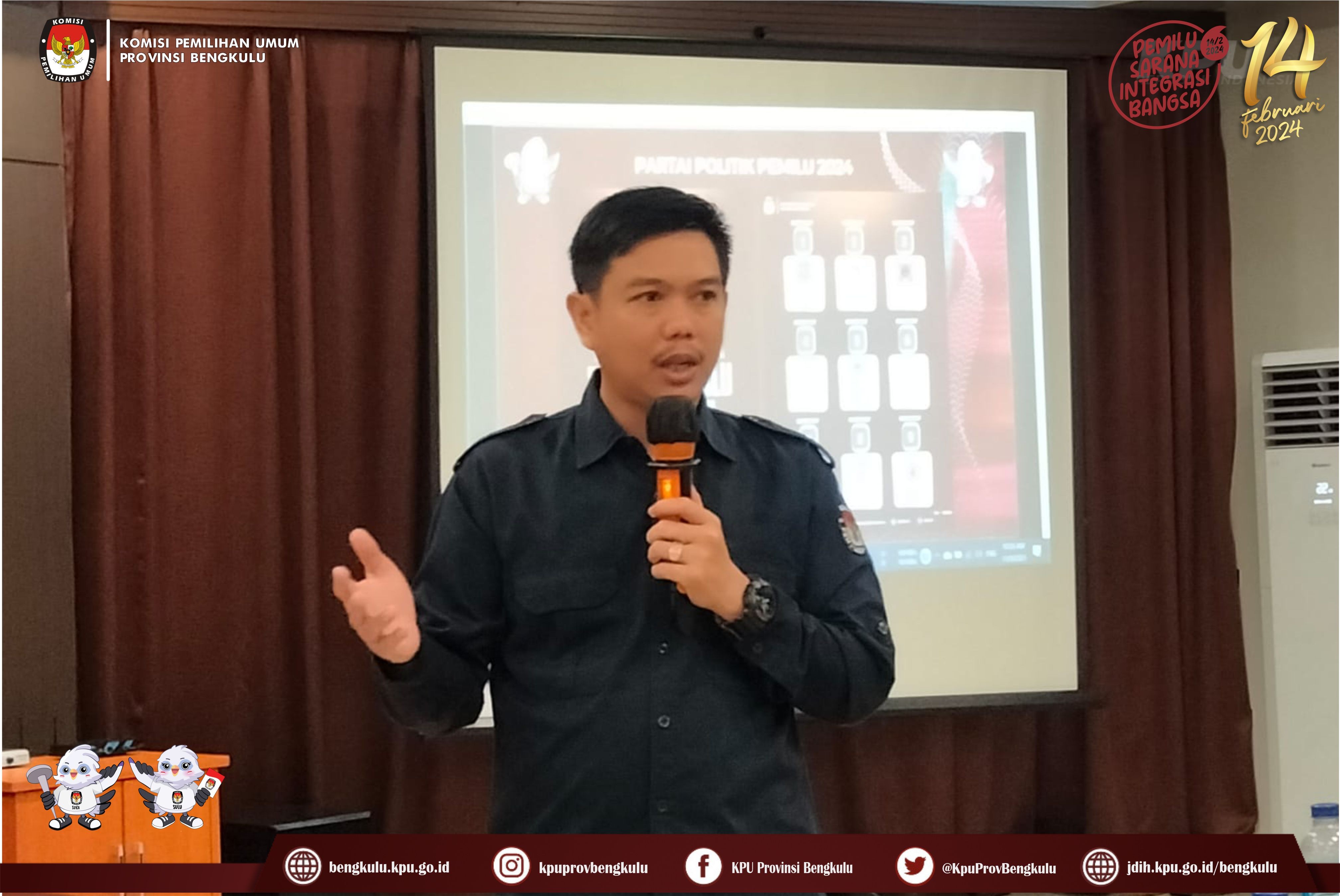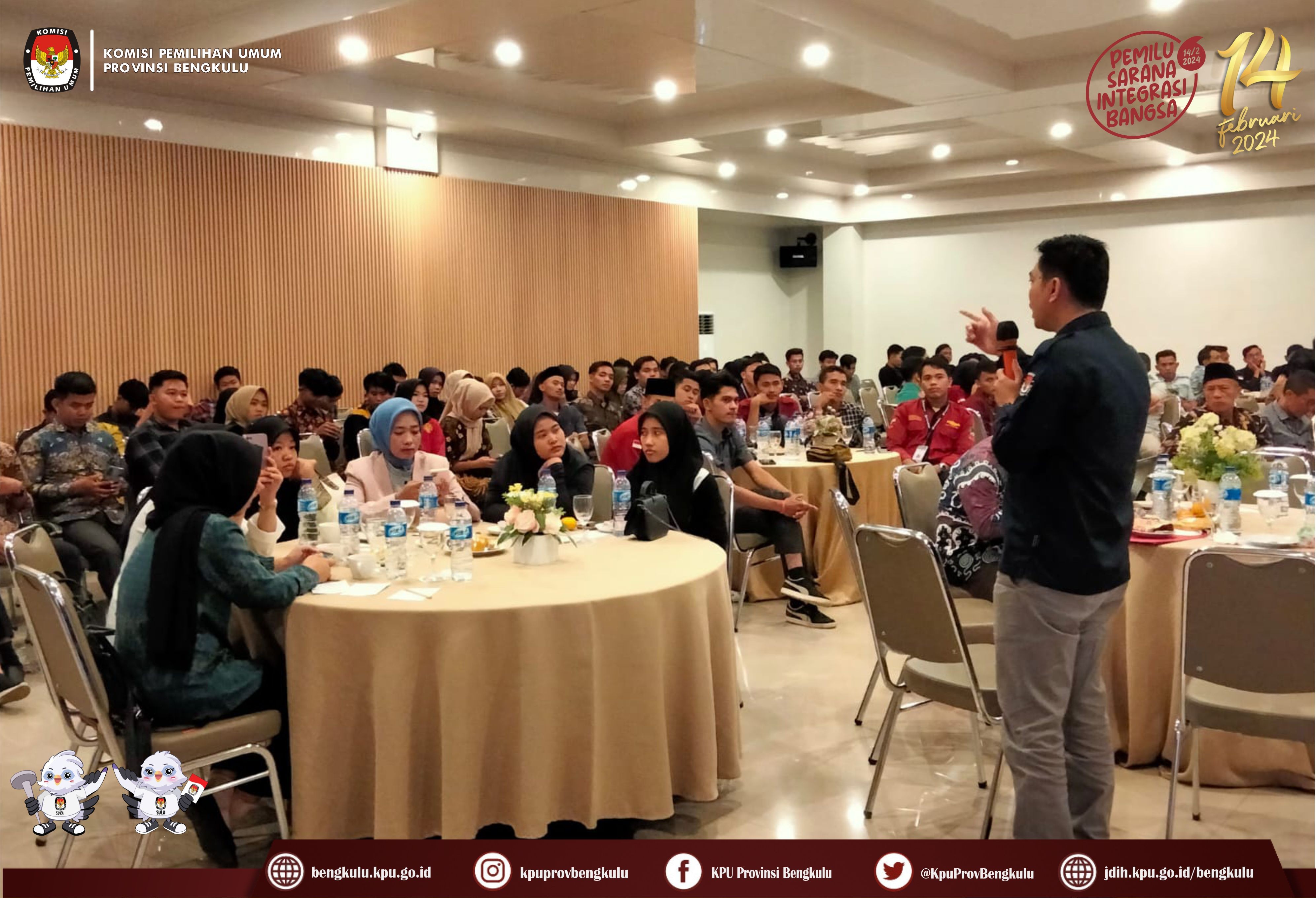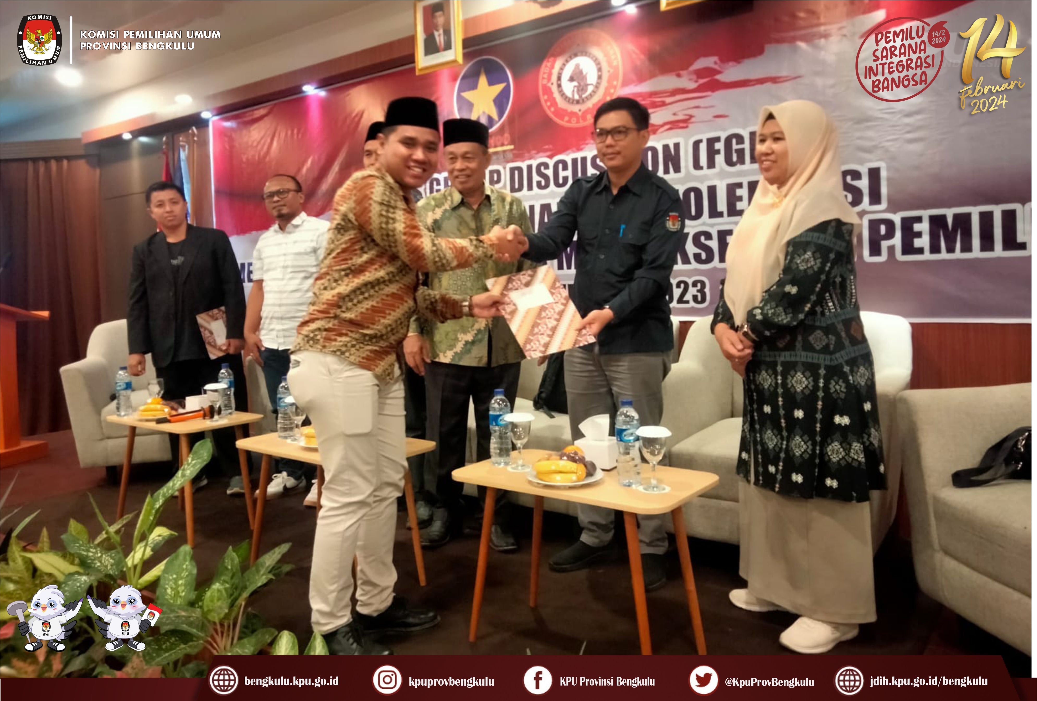 Bengkulu, bengkulu.kpu.go.id- Anggota KPU Provinsi Bengkulu Alpin Samsen menjadi Narasumbner Dalam Kegiatan Focus Discussion Group (FGD) dengan tema Menjaga dan Toleransi Menuju Bengkulu Damai Guna Menyukseskan Pemilu 2024 yang diselenggarakan DPP Komunitas Harapan Indonesia (HARPINDO) pada Kamis (9/11/2023) di Hotel Wilo Bengkulu. Peserta FGD meliputi Pemuda, Mahasiswa, Tokoh Masyarakat, Polda, Pengurus Masjid, Organda, OKP, Insan Pers dan sebagainya. Dalam materinya Alpin memaparkan Tahapan Penyelenggaraan Pemilu Tahun 2024, 18 Partai Politik Peserta Pemilu, DPT Provinsi Bengkulu sebanyak 1.494.828 pemilih, Pastikan terdaftar sebagai pemilih cek di link https://cekdptonline.kpu.go.id/, Syarat dan mekanisme pindah memilih, jumlah DCT Anggota DPRD Provinsi Bengkulu sebanyak 607 orang dan DCT DPRD Kabupaten/Kota se-Provinsi Bengkulu, DCT Anggota DPD RI Dapil Provinsi Bengkulu sebanyak 12 orang, jadwal dan pelaksanaan dan metode kampanye Pemilu 2024, cara menjadi pemilih cerdas dengan menolak politik uang, politik sara dan berita hoax (bohong) dan sebagainya.