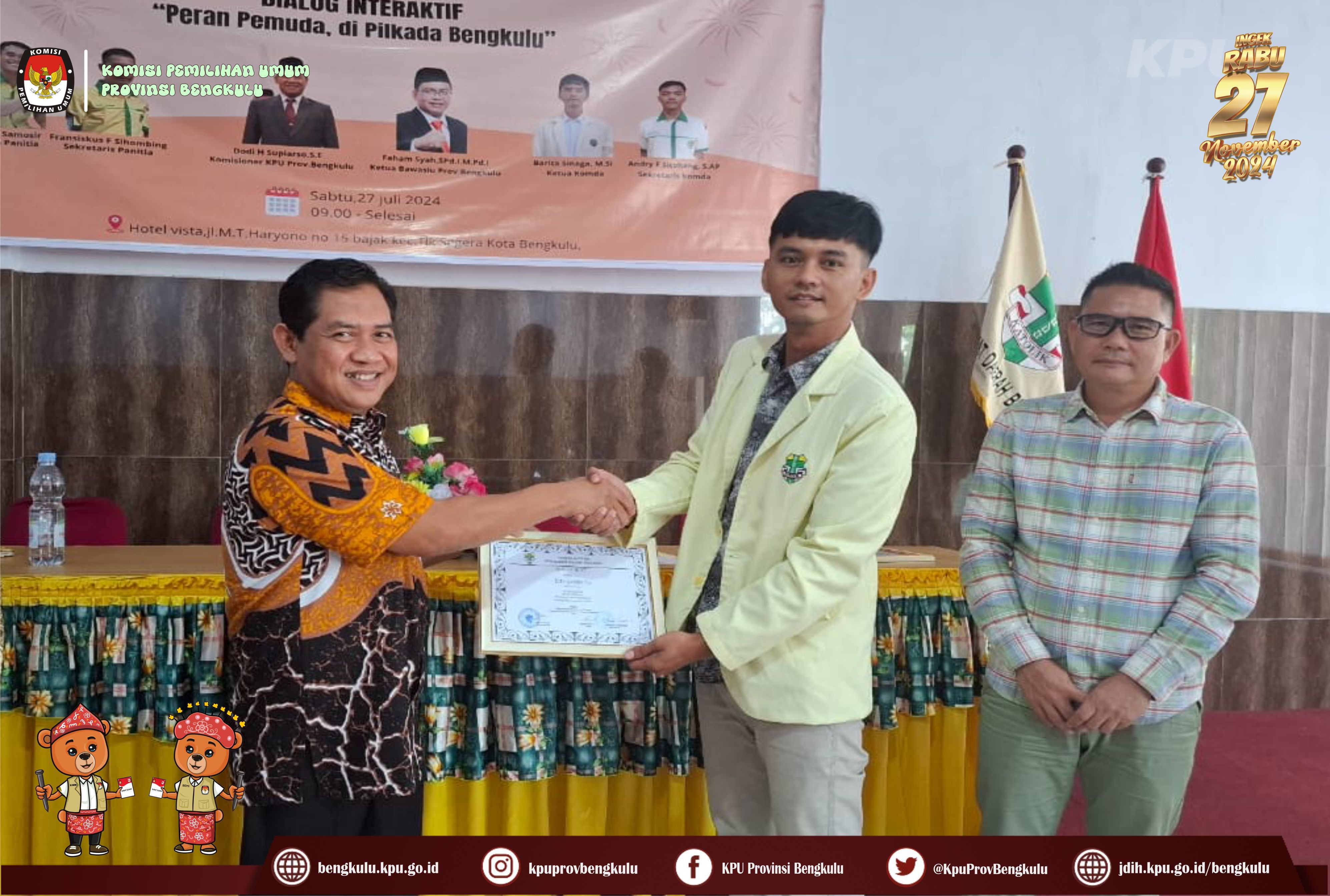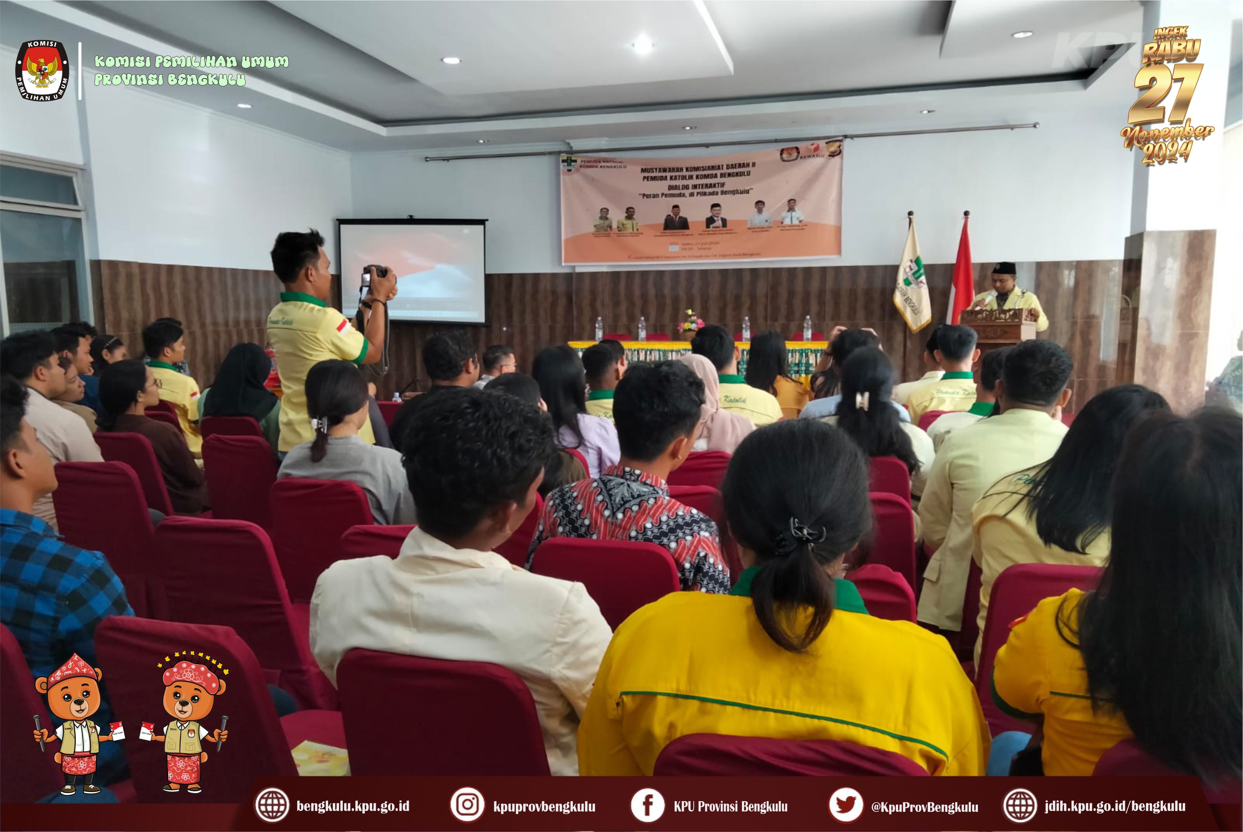 Bengkulu, bengkulu.kpu.go.id - Anggota KPU Provinsi Bengkulu Dodi Hendra Supiarso Hadir sebagai Narasumber Dialog Interaktif Pengurus Daerah Pemuda Katolik Komisariat Daerah Bengkulu dengan tema Peran Pemuda di Pilkada Bengkulu Bengkulu 2024, Sabtu (27/7/2024) di Hotel Vista Bengkulu. Peserta yang hadir adalah pelajar, masiswa dan pengurus Pemuda Katolik Komisariat Daerah Bengkulu. Dodi menyampaikan materi terkait tahapan penyelenggaraan pemilihan Serentak 2024 di Provinsi Bengkulu diantara regulasi tahapan sebagaimana diatur dalam PKPU Nomor 4 Tahun 2024, pemahaman demokrasi, trias politika, pemilihan, lembaga penyelenggara pemilihan, peserta pemilihan, mekanisme pencalonan, pemilih pemula dan jumlahnya, bada adhoc, partisipasi pemilih pada pilkada 2020 dan pemilu 2024, peran pemuda dalam pemilihan, cara menjadi pemilih cerdas dan sebagainya. Selain materi acara juga diisi dengan diskusi tanya jawab.