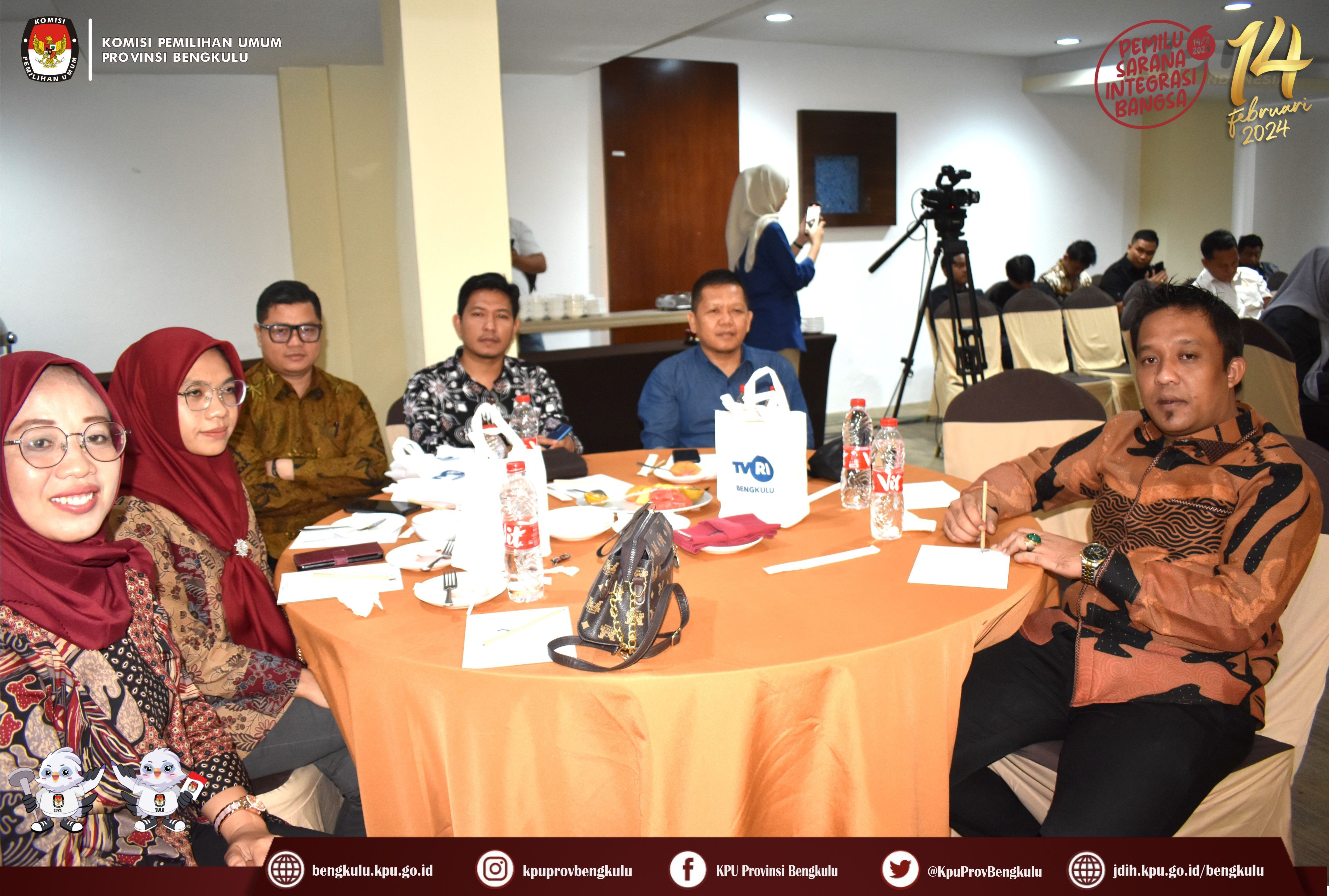 Bengkulu, bengkulu.kpu.go.id - Anggota KPU Provinsi Bengkulu Emex Verzoni hadir sebagai Narasumber dalam kegiatan Pertemuan Mitra dan Bertema "TVRI Bengkulu bersama KPU Menuju Pemilu 2024 yang diselenggarakan TVRI Bengkulu, Selasa (14/11/2023 di Hotel Santika Bengkulu. Hadir dalam kegiatan, yaitu Anggota dan Sekretaris KPU Kabupaten/Kota se-Provinsi Bengkulu. Emex menegaskan hadir pada kegiatan ini merupakan bentuk transparansi dan keterbukaan informasi tahapan Pemilu 2024 sebagaimana yang diamanat dalam peraturan perundang-undangan. Pada 3 November 2023 KPU Provinsi Bengkulu dan KPU Kabupaten/Kota se-Provinsi Bengkulu telah menetapkan Daftar Calon Tetap (DCT) Anggota DPRD sesuai tingkatan. Pada intinya ditambahkan Emex, KPU Provinsi Bengkulu siap membangun komunikasi dan koordinasi dengan pihak media baik cetak, elektronik dan daring agar dapat memberikan informasi seluas-luasnya kepada publik secara yang akurat dan berimbang.