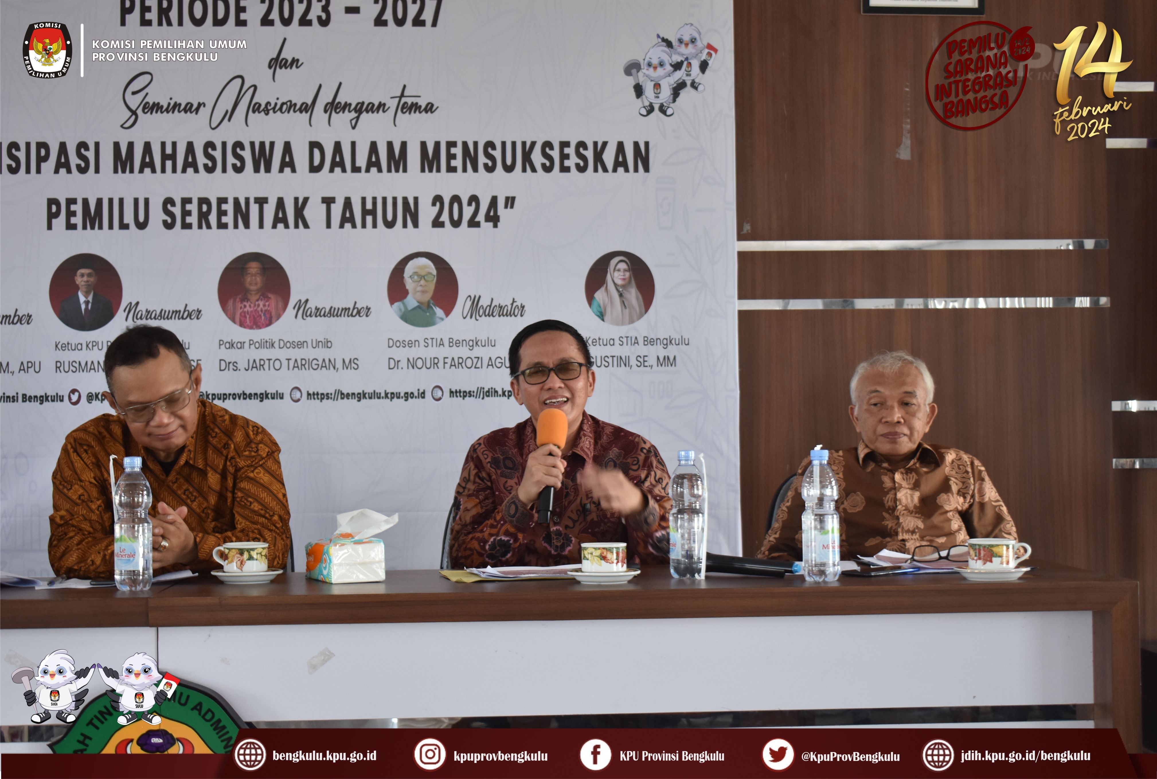 Anggota KPU Provinsi Bengkulu Emex Verzoni hadir sebagai Narasumber Seminar Nasional dengan Tema Partisipasi Mahasiswa Dalam Mensukseskan Pemilihan Umum Serentak Tahun 2024