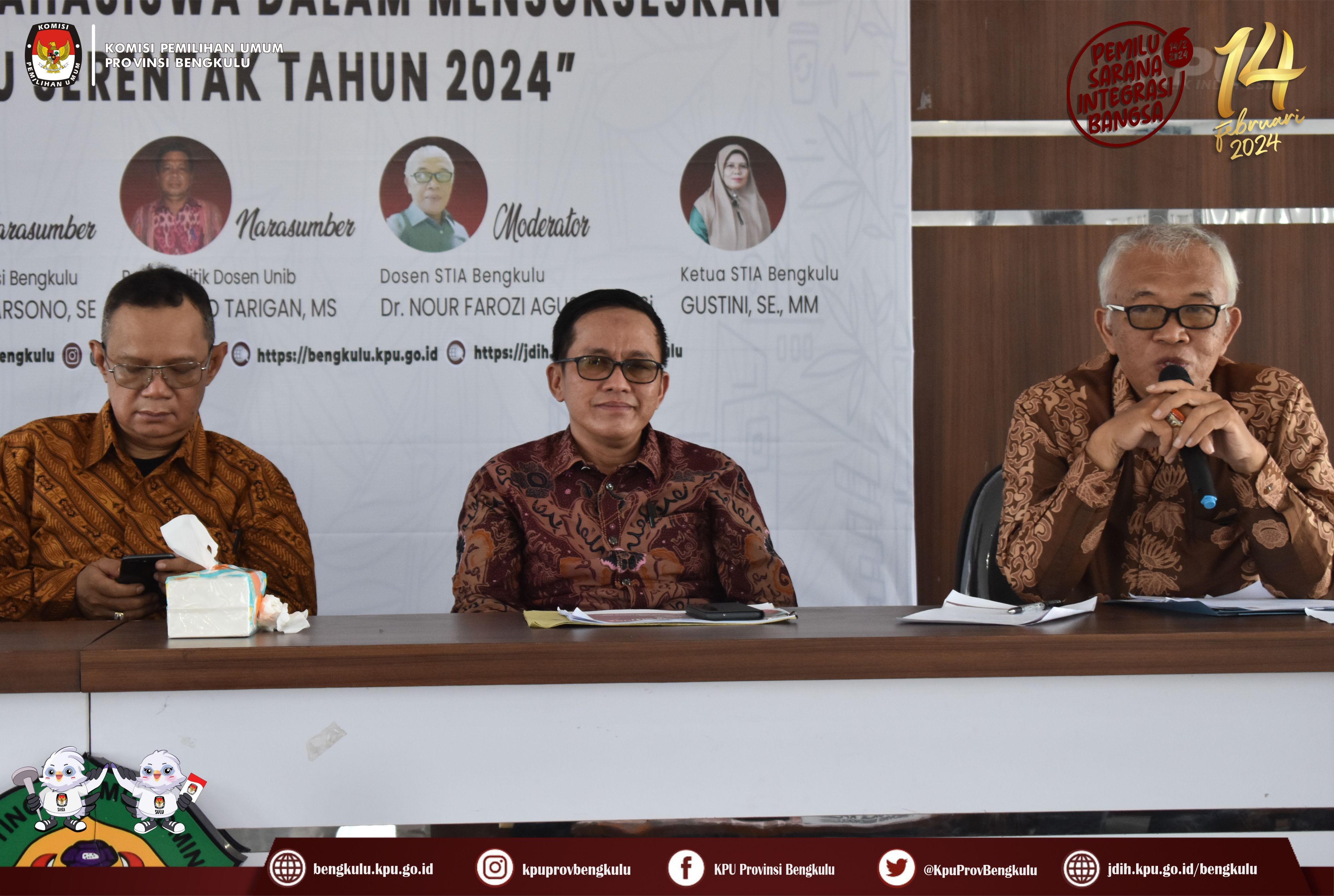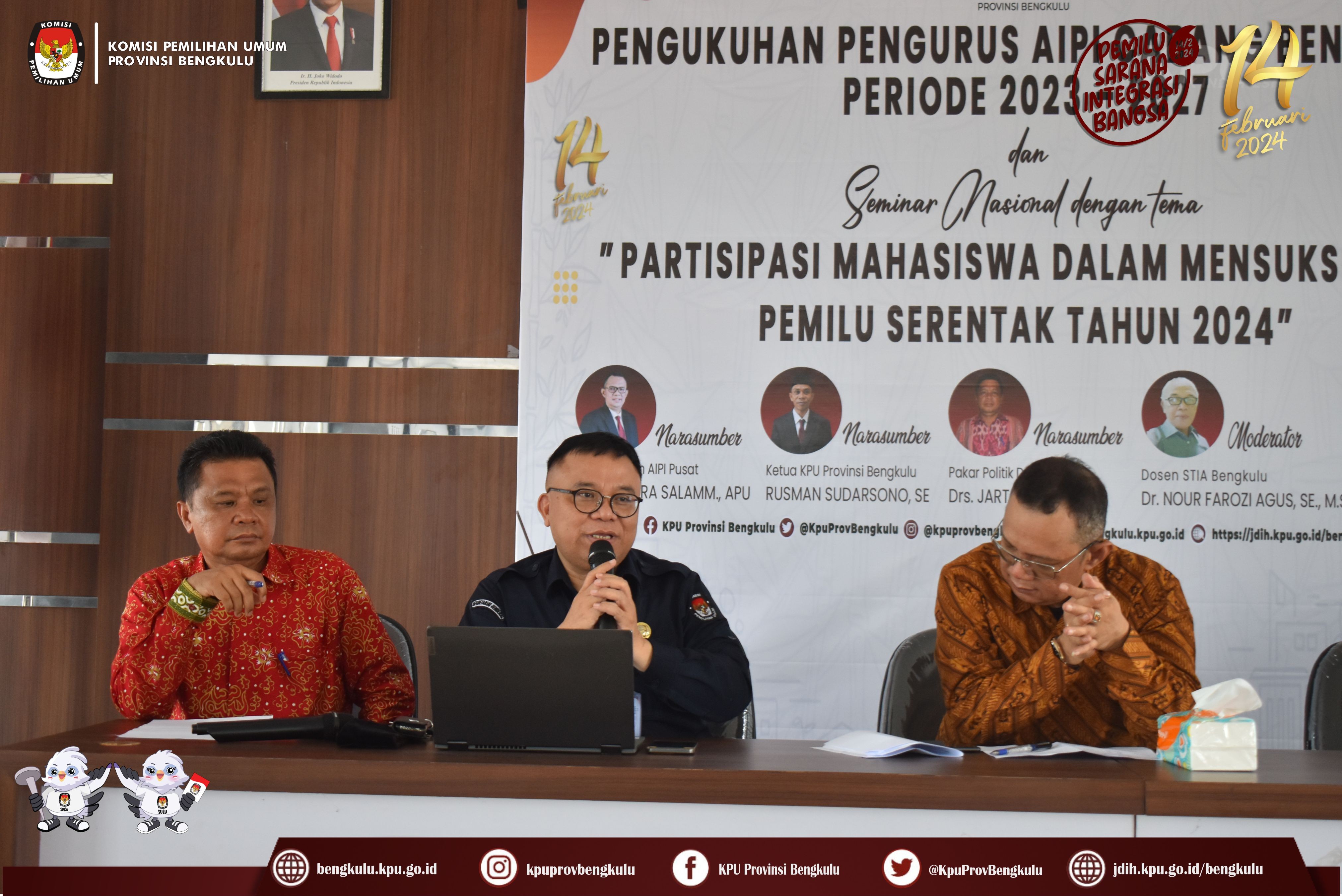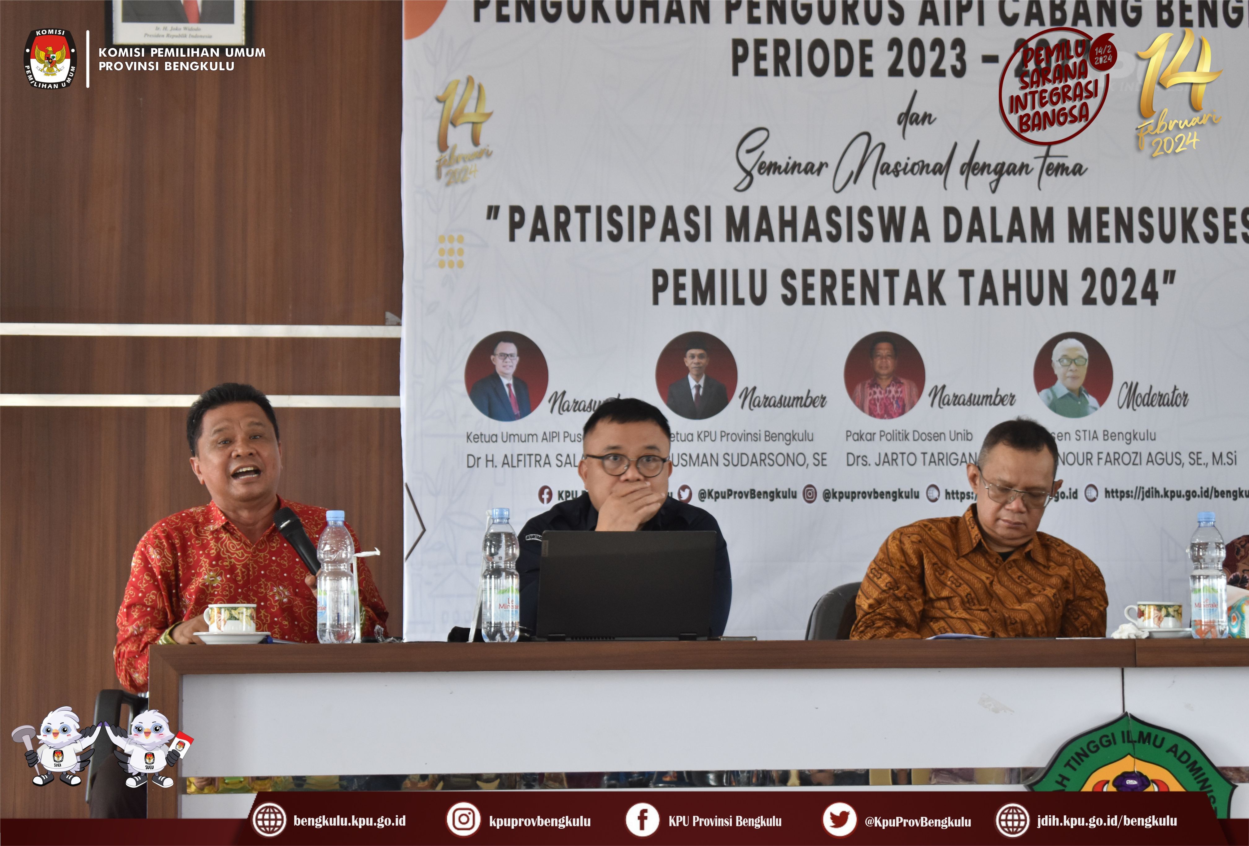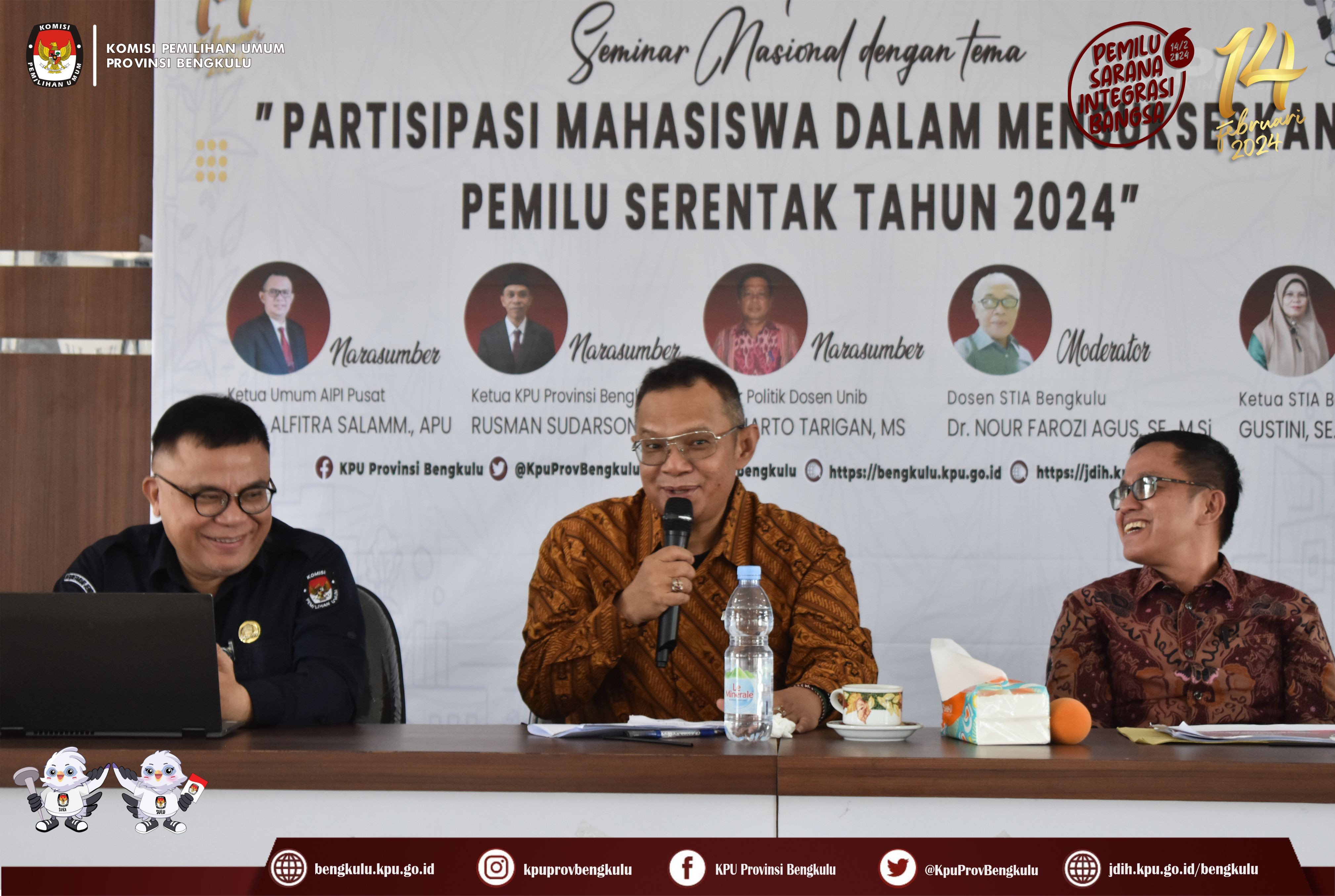 Bengkulu, bengkulu.kpu.go.id - Anggota KPU Provinsi Bengkulu Emex Verzoni hadir sebagai Narasumber Seminar Nasional dengan Tema Partisipasi Mahasiswa Dalam Mensukseskan Pemilihan Umum Serentak Tahun 2024 yang diselenggarakan oleh AIPI dan KPU Provinsi Bengkulu, Senin (1/8/2023) di Gedung Lantai 3 STIA Bengkulu. Peserta seminar berasal dari Ketua KPU kabupaten/kota, Dosen dan Mahasiswa PTN/PTS di Provinsi Bengkulu. Selain dari KPU Provinsi Bengkulu hadir sebagai Narasumber dari Ketua AIPI Pusat Alfitra Salamm, Sekretaris Jenderal KPU RI yang diwakil oleh Kabag Hubungan Antar Lembaga Dohardo Pakpahan, dan Dosen/Akademisi Unib Jarto Tarigan. Selain itu, hadir juga Ketua STIA Bengkulu Gustini. Dalam kesempatan setiap narasumber menyampaikan materi yang berbeda. Emex menyampaikan materi peran mahasiswa dalam Pemilu Tahun 2024 diantaranya partisipasi sebagai pemilih apakah sudah terdaftar di DPT atau belum, 5 jenis pemilihan, yaitu pemilihan presiden dan wakil presiden, DPR, DPD, DPRD Provinsi dan DPRD Kabupaten/Kota. Syarat menjadi pemilih untuk terdaftar di DPT, yaitu sudah berusia 17 tahun, sudah kawin atau sudah pernah kawin, Warga Negara Indonesia (WNI), berdomisili di wilayah NKRI dibuktikan dengan KTP el atau berdomisili di luar negeri dibuktikan dengan KTPel, Paspor dan/atau Surat Perjalanan Laksana, dan tidak sedang dicabut hak pilihnya berdasarkan putusan pengadilan yang telah mempunyai kekuatan hukum tetap dan tidak sedang menjadi prajurit Tentara Nasional Indonesia atau anggota Kepolisian Negara Republik Indonesia. Partisipasi pemilih pada Pemilu 2019 di Provinsi Bengkulu mencapai sebesar 85, 39 % sedangkan pada Pilkada 2020 sebesar 77,73 %. Sementara itu, Dohardo menjelaskan Sosialisasi dan Pendidikan Pemilu Serentak Tahun 2024, Jarto menjelaskan pentingnya partisipasi mahasiswa dalam Pemilu Tahun 2024, sedangkan Alfitra menekankan pada peran aktif mahasiswa sebagai agen perubahan dalam Pemilu Tahun 2024 dengan cara menjadi pengawas, menjadi penyelenggara pemilu maupun pemilih.