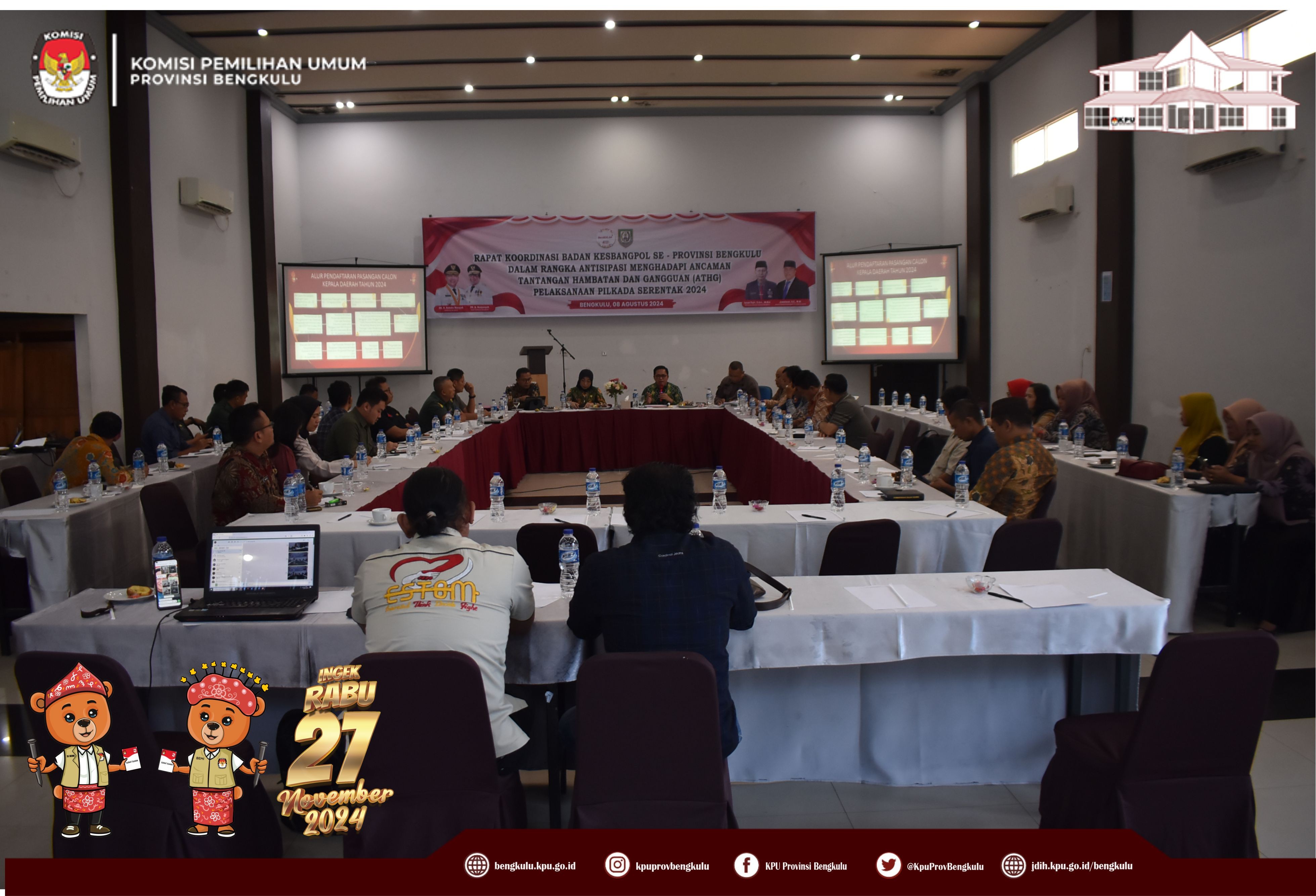 Bengkulu, bengkulu.kpu.go.id - Anggota KPU Provinsi Bengkulu Emex Verzoni hadir sebagai Narasumber Rapat Koordinasi Badan Kesbangpol se-Provinsi Bengkulu Dalam Rangka Antisipasi Menghadapi Ancaman Tantangan Hambatan dan Gangguan (ATHG) Pelaksanaan Pilkada Serentak 2024 yang diselenggarakan oleh Kesbangpol Provinsi Bengkulu, Kamis (8/8/2024) di Adeeva Hotel Bengkulu. Emex memaparkan materi terkait tahapan dan jadwal pelaksanaan pilkada serentak 2024 sebagaimana diatur dalam PKPU Nomor 8 Tahun 2024 tentang Pencalonan Gubernur dan Wakil Gubernur, Bupati dan Wakil Bupati serta Walikota dan Wakil Walikota Tahun 2024, tahapan yang telah dilaksanakan diantaranya pembentukan Badan Adhoc PPK, PPS dan Pantarlih, Pelaksanaan Coklit Serentak pada 24 Juni s.d 24 Juli 2024, Persiapan dan Pendaftaran Pasangan Calon pada 27-29 Agustus 2024, Kesiapan personil jajaran sekretariat KPU se-Provinsi Bengkulu, serta isu ATHG dalam Pilkada 2024 di Provinsi Bengkulu.