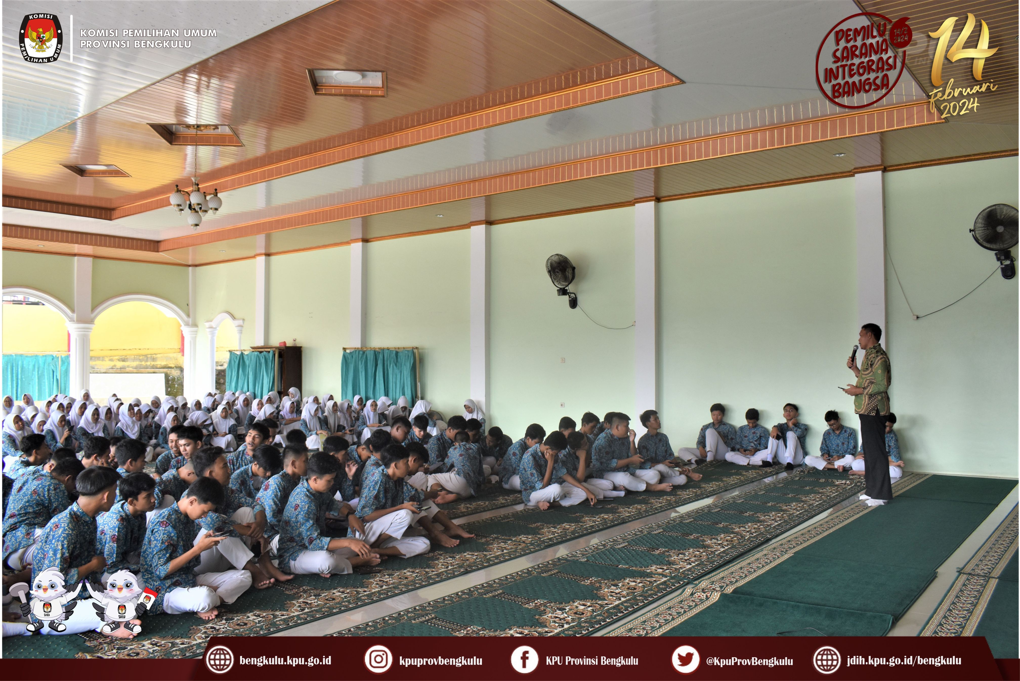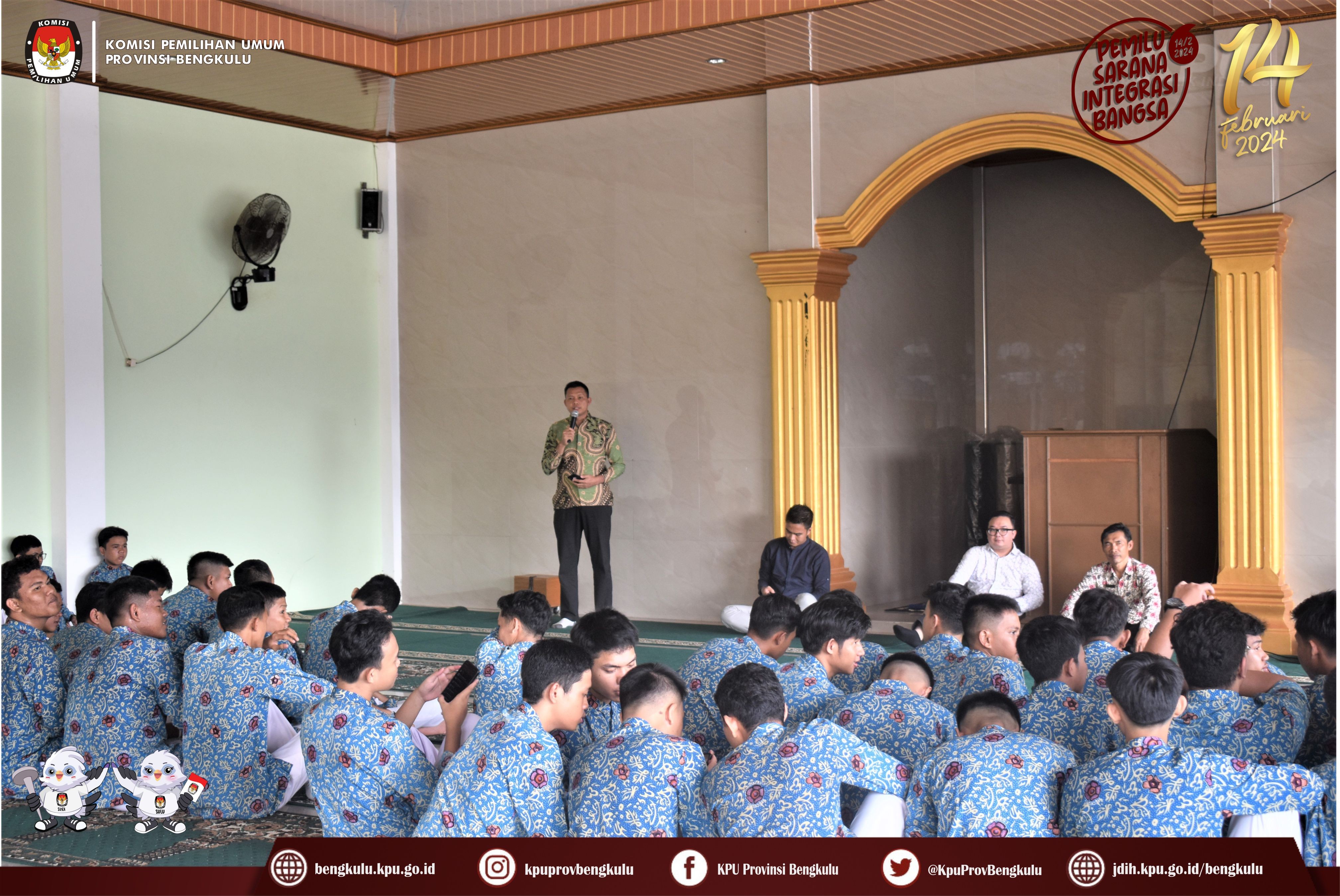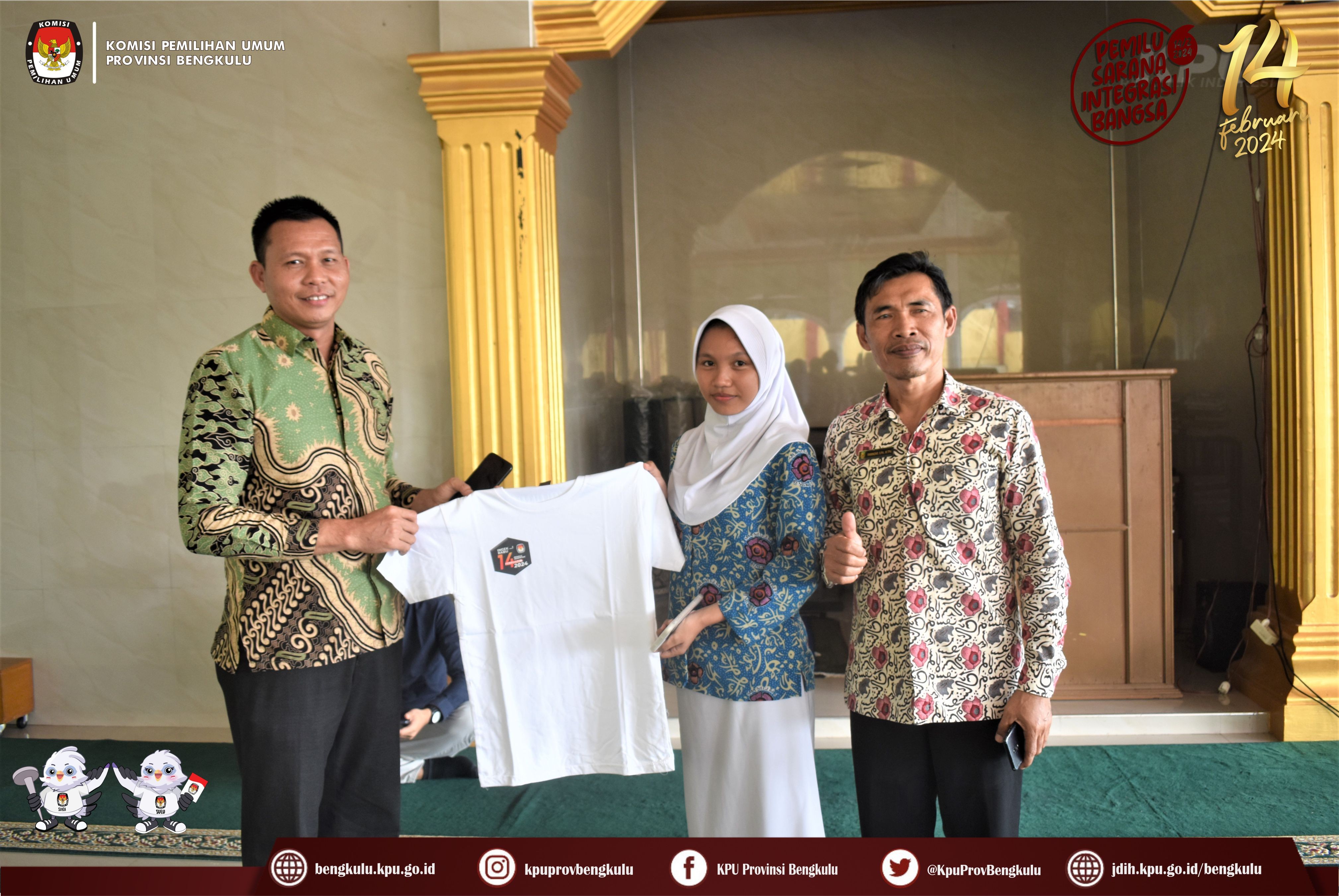 Bengkulu, bengkulu.kpu.go.id - Anggota KPU Provinsi Bengkulu Sarjan Efendi hadir sebagai Narasumber Roadshow Sosialisasi Pemilu Serentak Tahun 2024 yang diselenggarakan kerjasama KPU Provinsi Bengkulu dan Harian Rakyat Bengkulu, Kamis (10/8/2023) bertempat di Aula SMAN 6 Kota Bengkulu. peserta kegiatan adalah Siswa Siswi SMAN 6 Kota Bengkulu. Dalam kesempatan itu, Sarjan menyampaikan materi terkait peran pemilih pemula dalam Pemilu Tahun 2024, diantaranya Tahun Pemilu 2024, Cek DPT online di https://dptonline.kpu.go.id/ , cara cerdas menjadi pemilih pemula, syarat menjadi pemilih, dan sebagainya. Selain itu, ada diskusi tanya jawab dan pembagian doorprize.