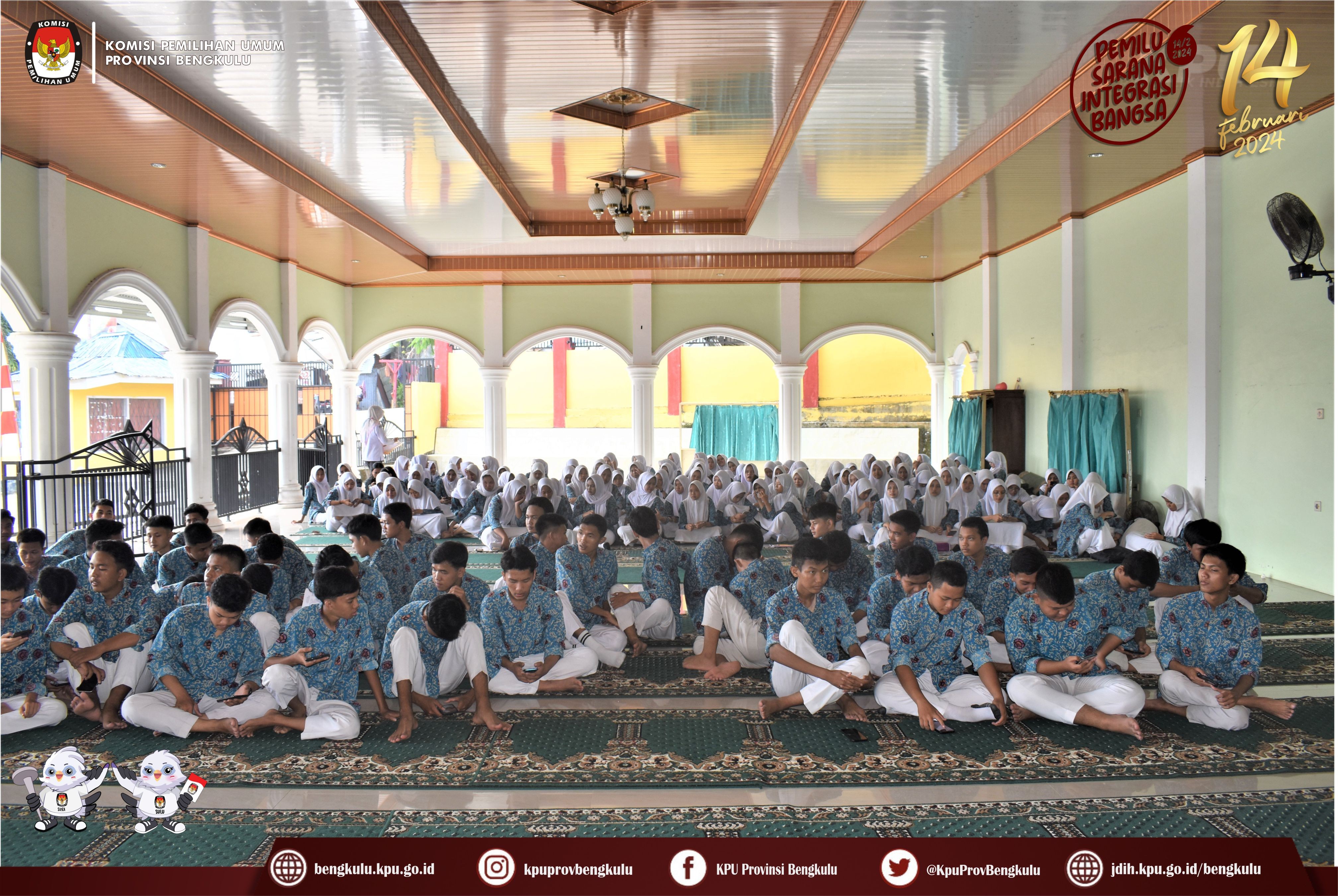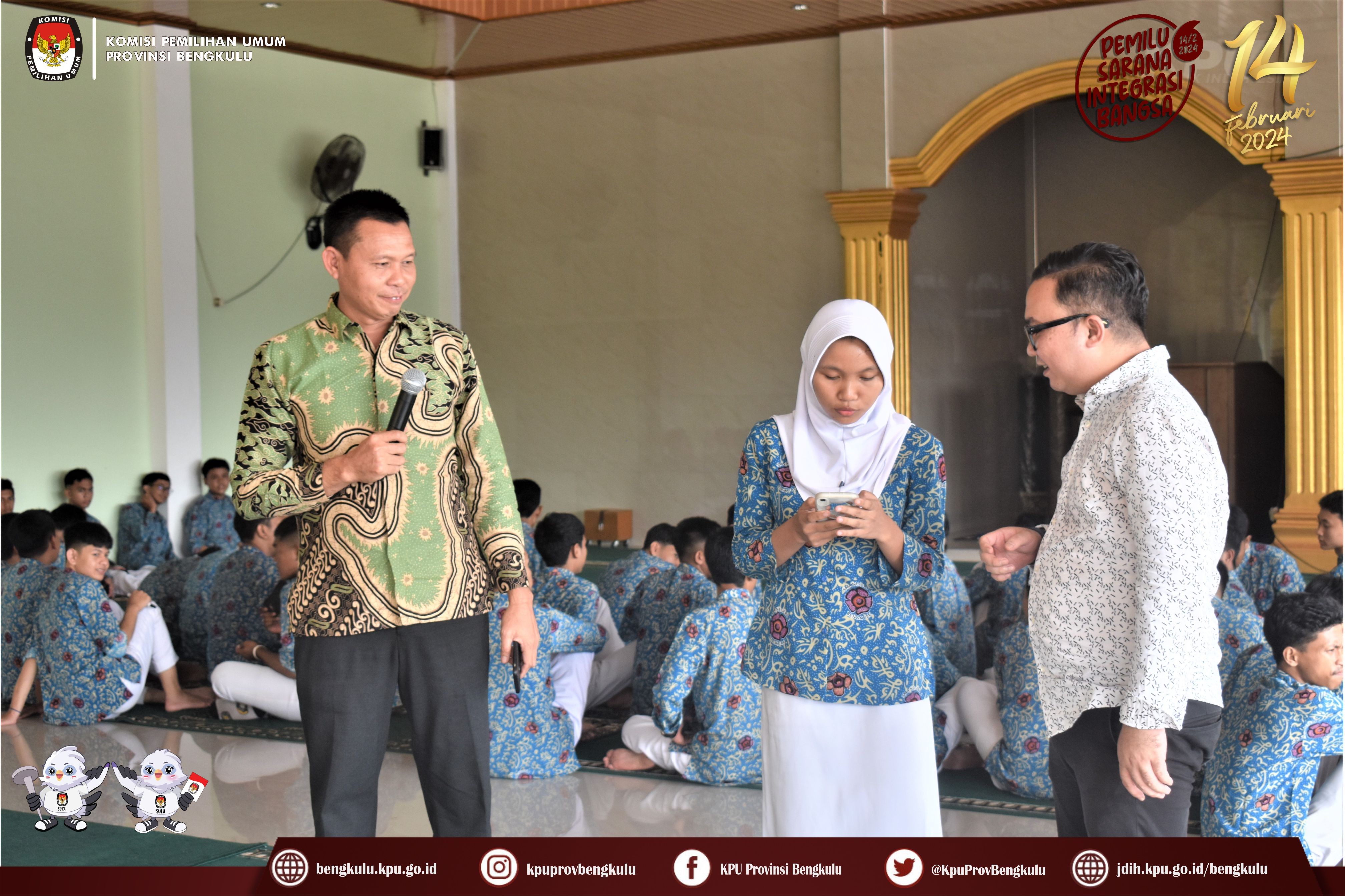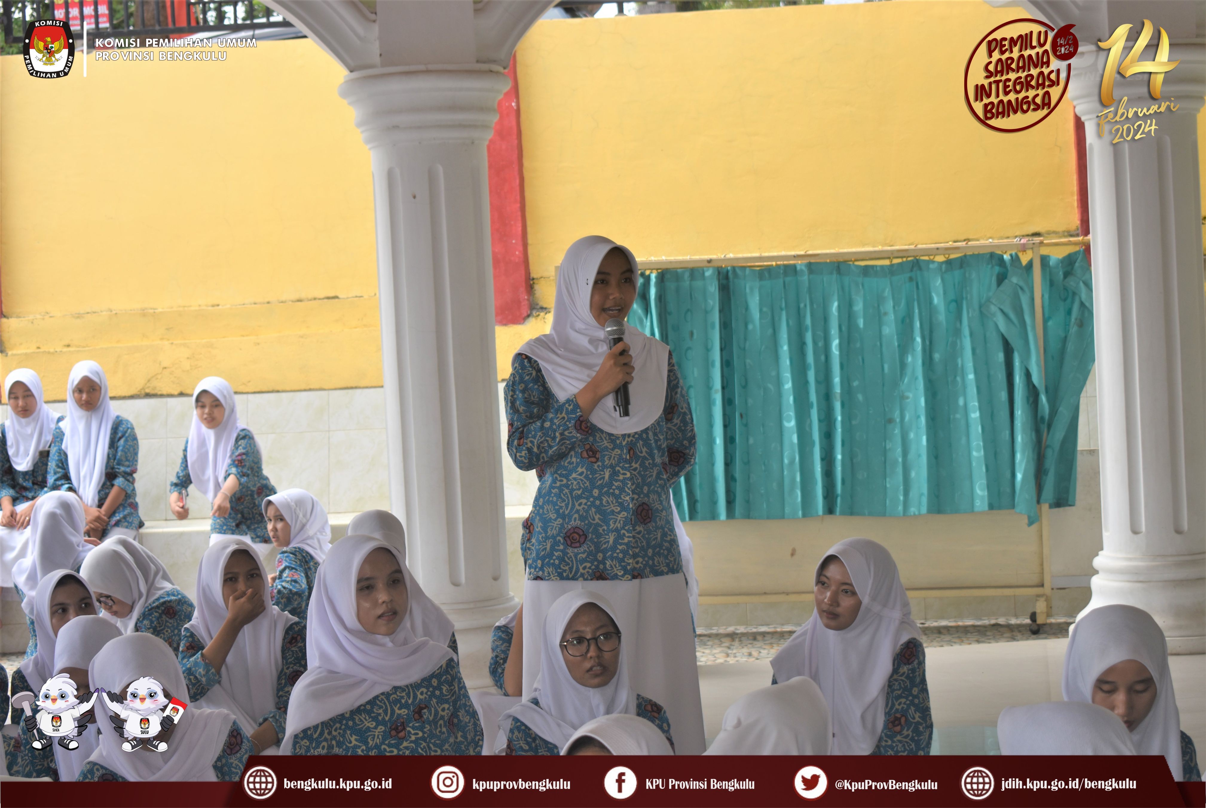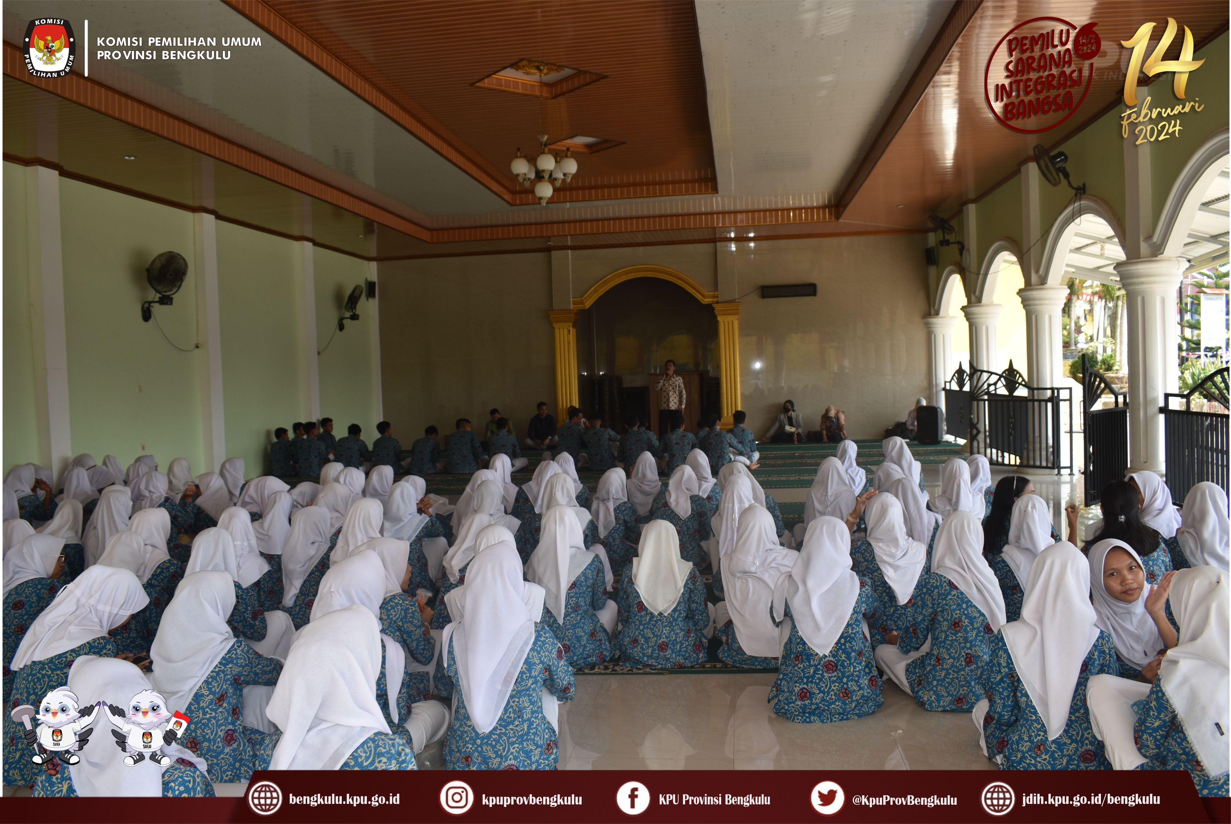Bengkulu, bengkulu.kpu.go.id - Anggota KPU Provinsi Bengkulu Sarjan Efendi hadir sebagai Narasumber Roadshow Sosialisasi Pemilu Serentak Tahun 2024 yang diselenggarakan kerjasama KPU Provinsi Bengkulu dan Harian Rakyat Bengkulu, Kamis (10/8/2023) bertempat di Aula SMAN 6 Kota Bengkulu. peserta kegiatan adalah Siswa Siswi SMAN 6 Kota Bengkulu. Dalam kesempatan itu, Sarjan menyampaikan materi terkait peran pemilih pemula dalam Pemilu Tahun 2024, diantaranya Tahun Pemilu 2024, Cek DPT online di https://dptonline.kpu.go.id/ , cara cerdas menjadi pemilih pemula, syarat menjadi pemilih, dan sebagainya. Selain itu, ada diskusi tanya jawab dan pembagian doorprize.