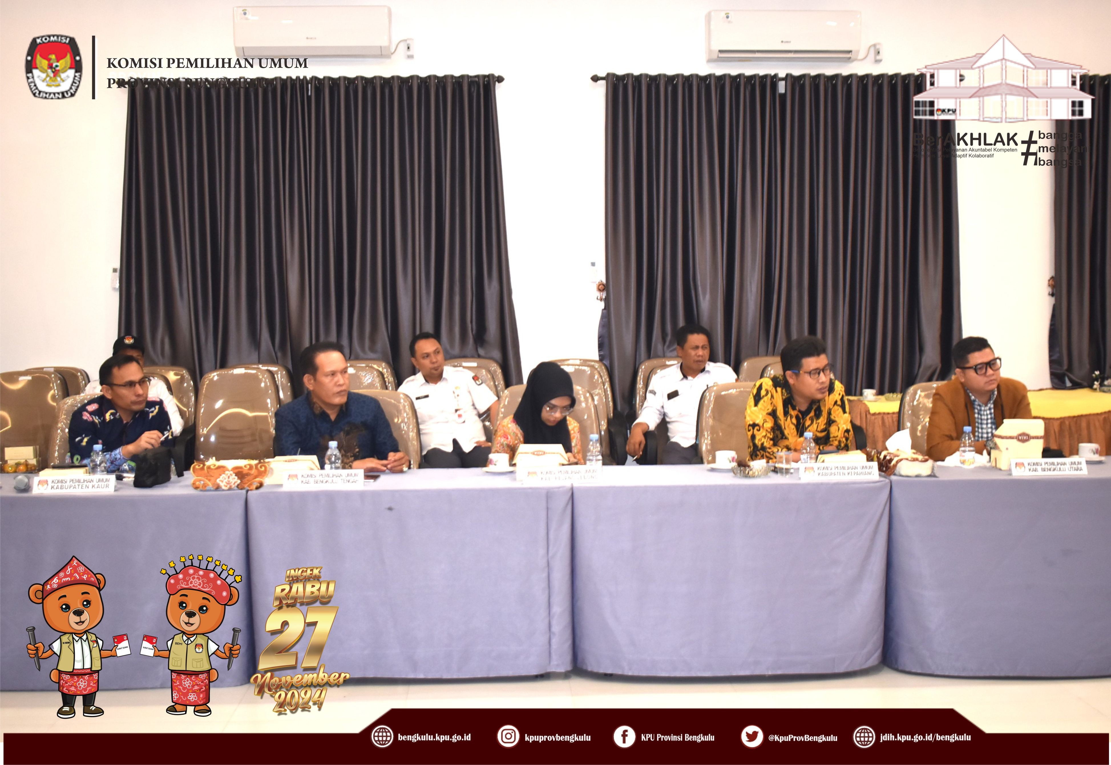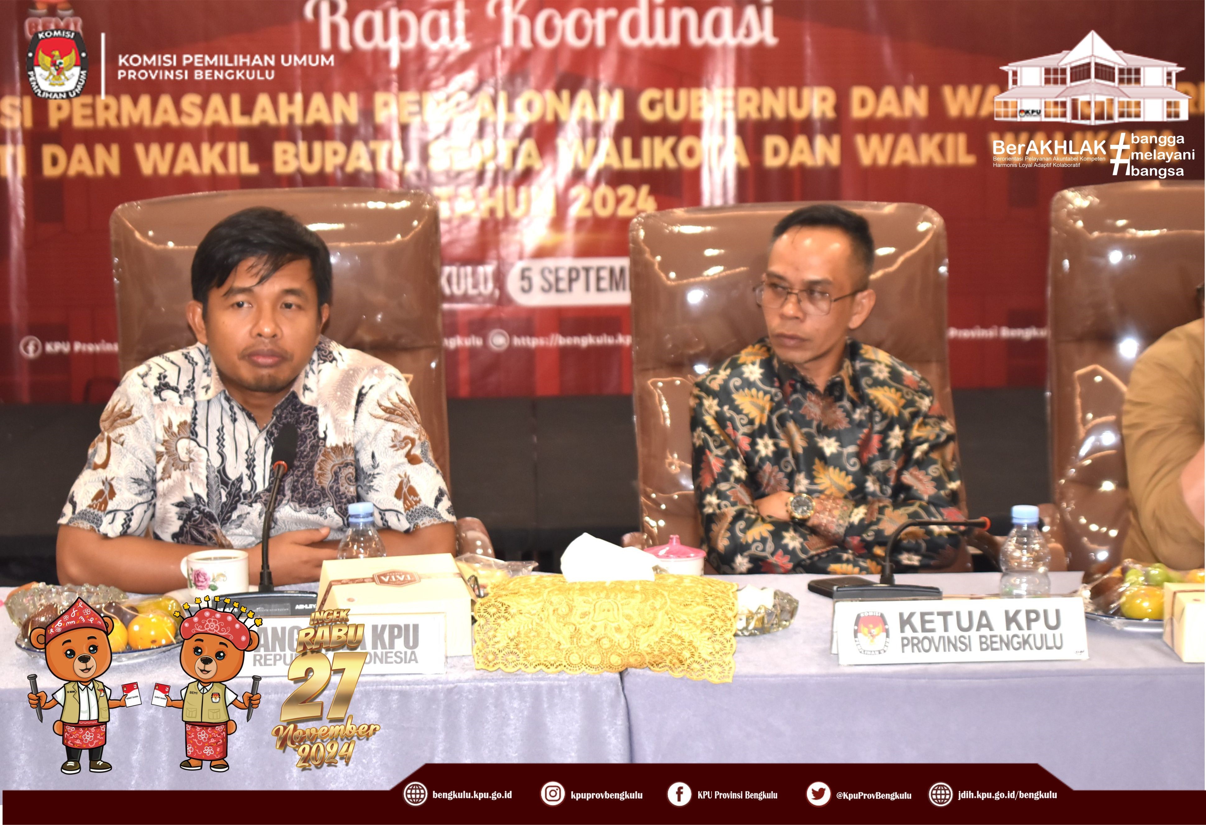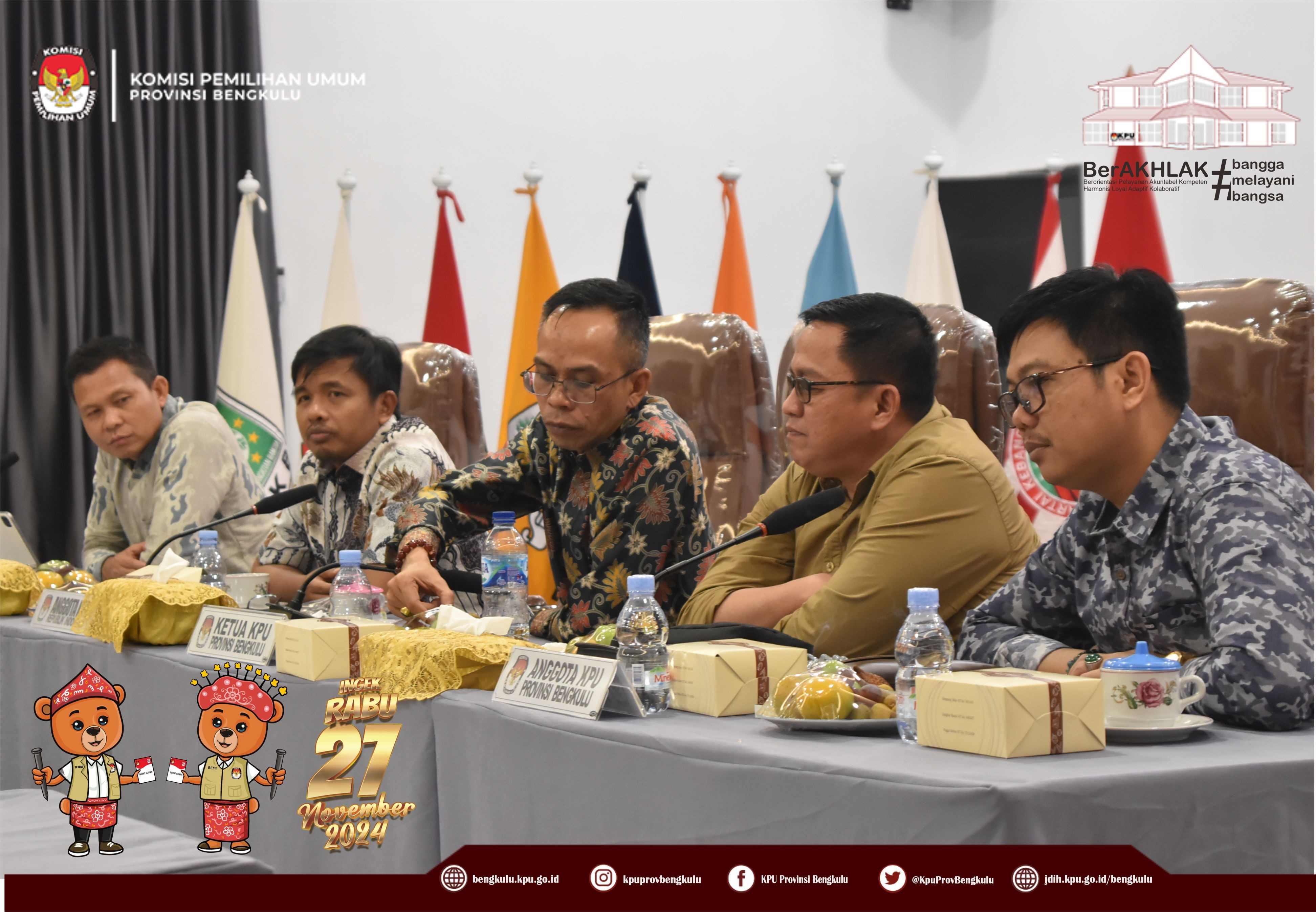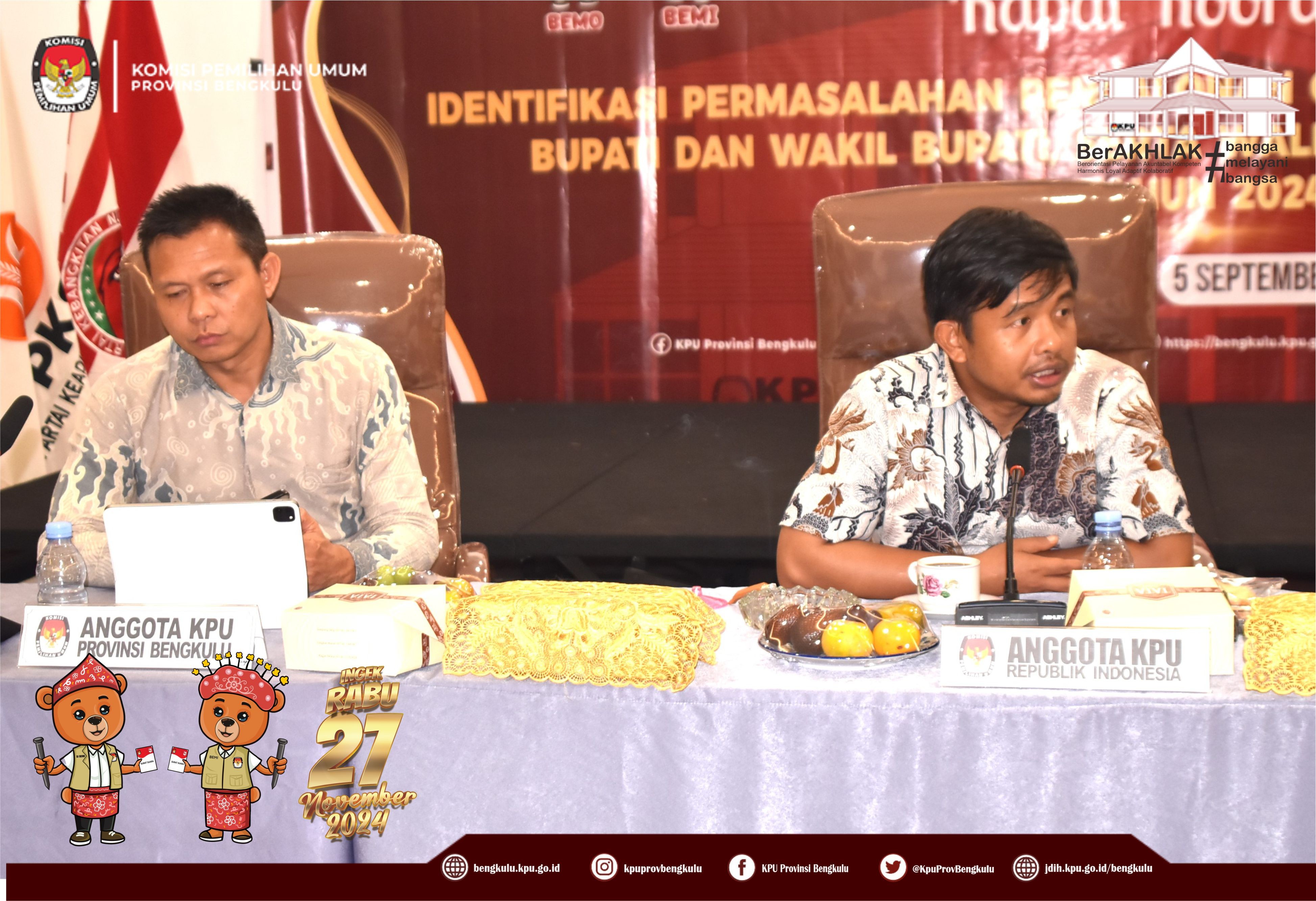 Bengkulu, bengkulu.kpu.go.id - Anggota KPU RI Bapak Idham Holik bersama Ketua KPU Provinsi Bengkulu Bapak Rusman Sudarsono, dan Anggota KPU Provinsi Bengkulu Bapak Alpin Samsen, Bapak Emex Verzoni dan Bapak Alpin Samsen hadir dalam Rapat Koordinasi Identifikasi Permasalahan Pencalonan Gubernur dan Wakil Gubernur, Bupati dan Wakil Bupati serta Walikota dan Wakil Walikota Dalam Pemilihan Serentak Tahun 2024, Kamis (5/9/2024) di Aula Demokrasi KPU Provinsi Bengkulu. Hadir Ketua Divisi Teknis Penyelenggaraan KPU Kabupaten/Kota se-Provinsi Bengkulu. Bapak Idham menjelaskan gambaran potensi permasalahan pada tahapan pencalonan pada pemilihan serentak 2024. Ketua Divisi Teknis Penyelenggaraan KPU Kabupaten/Kota memaparkan gambaran pelaksanaan pencalonan di masing-masing satker serta potensi permasalahan dan diskusi tanya jawab.