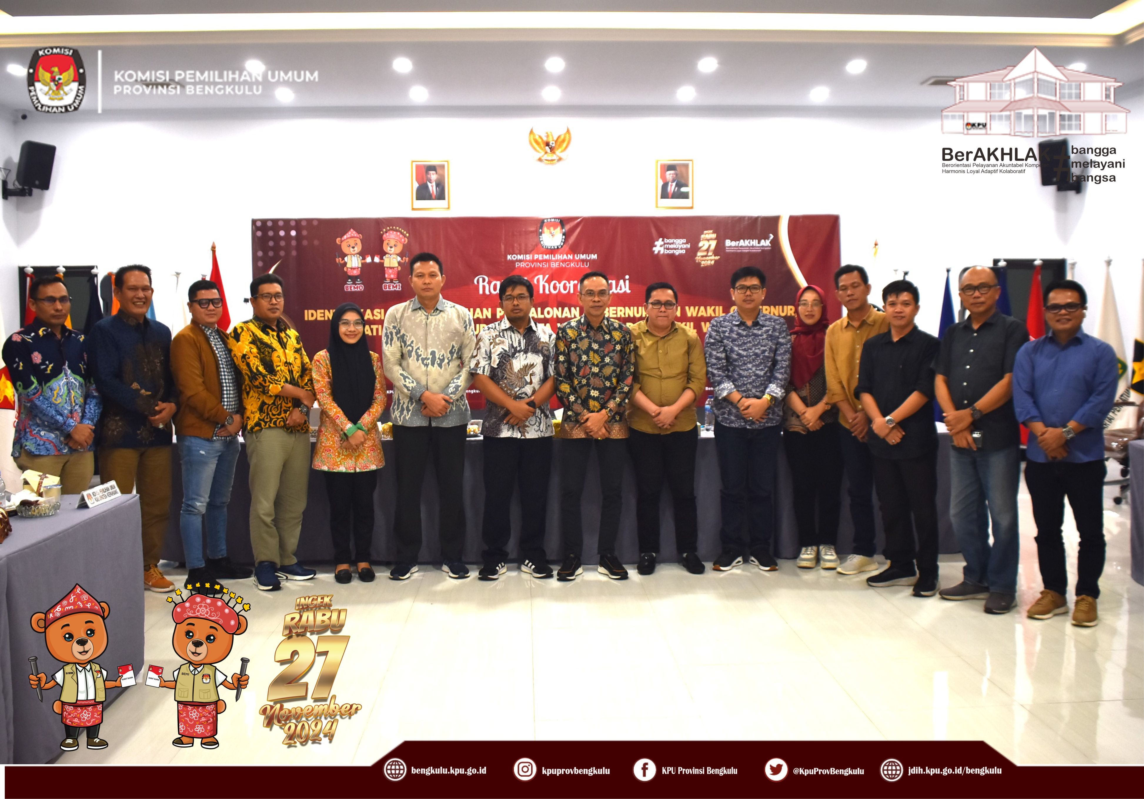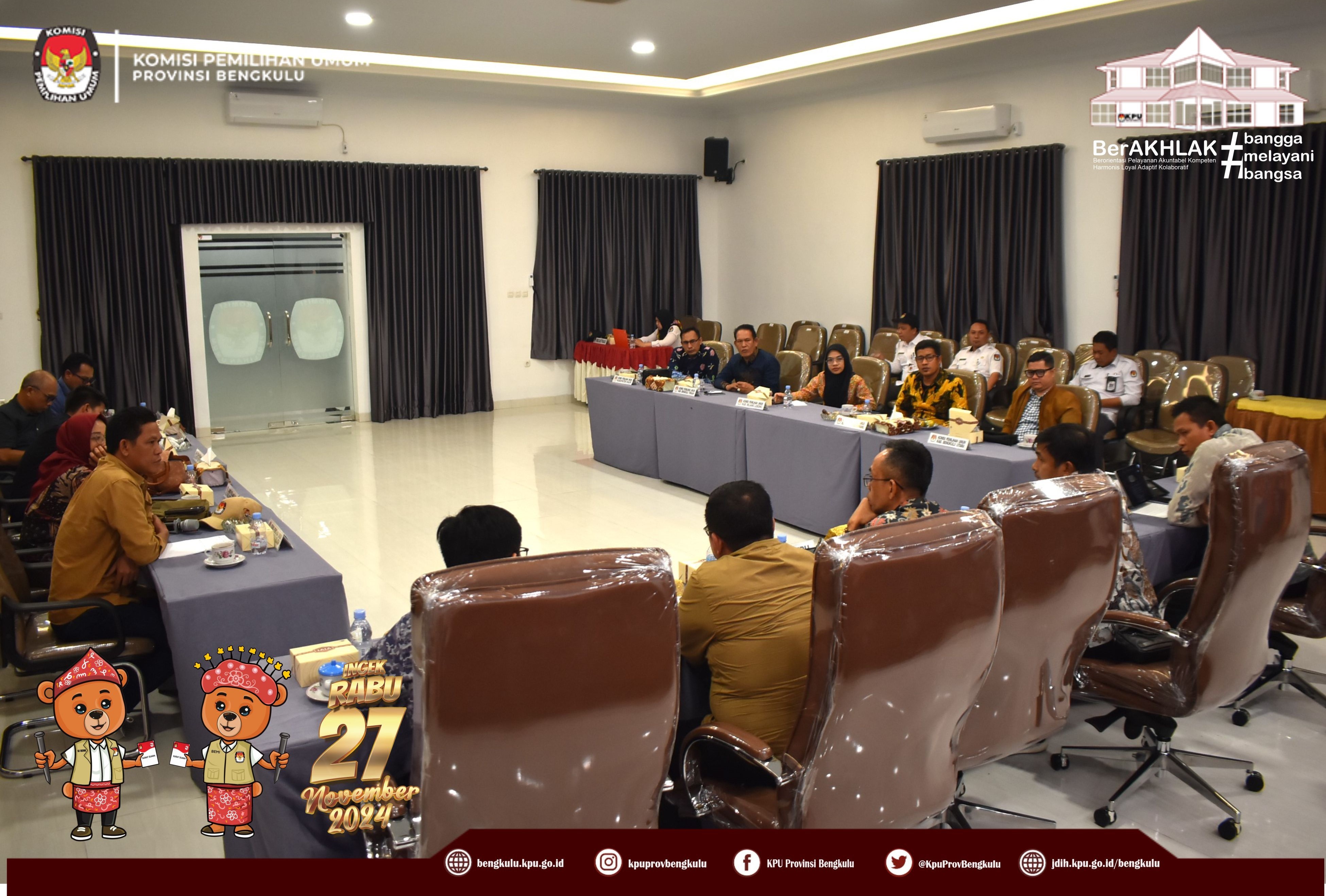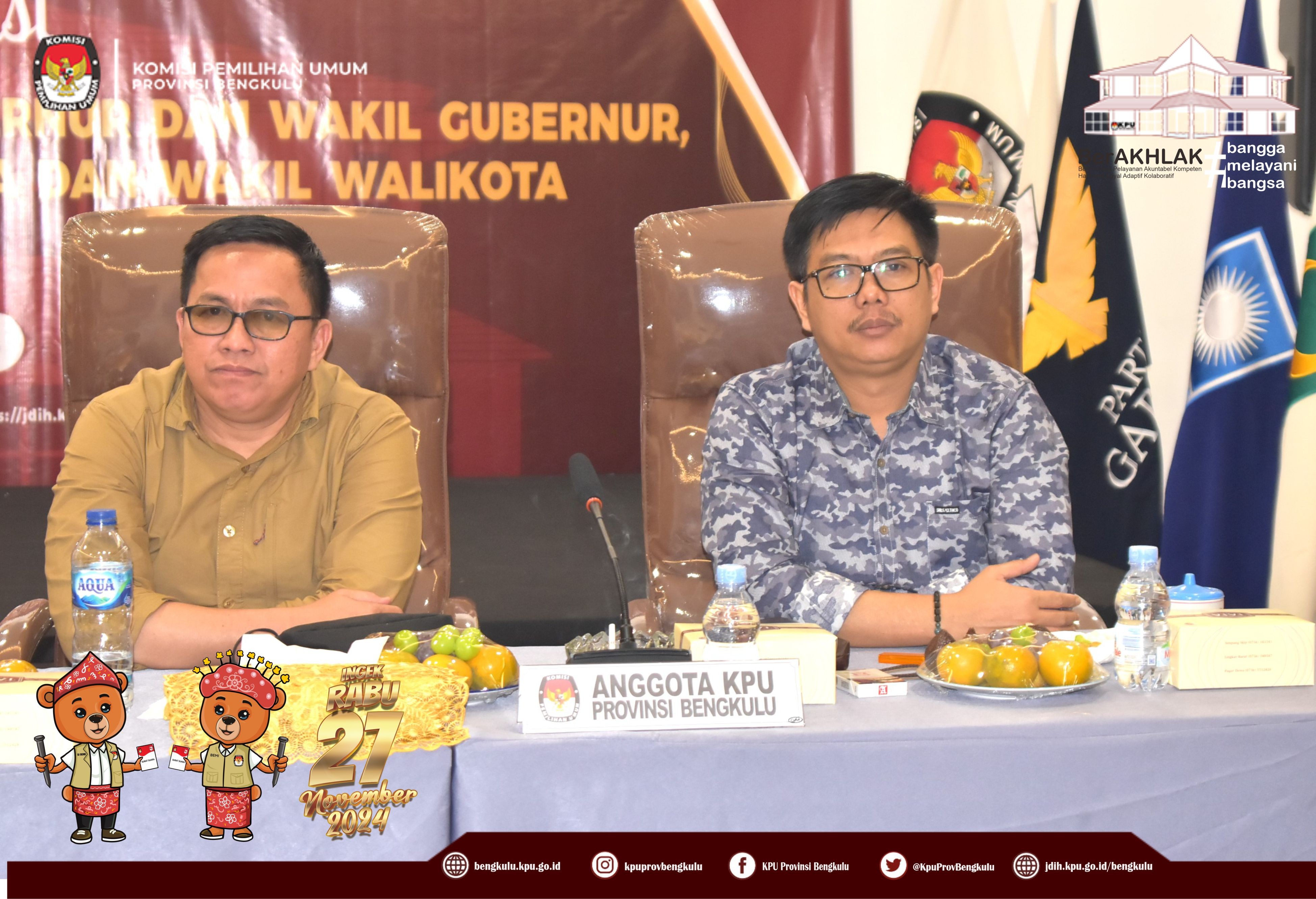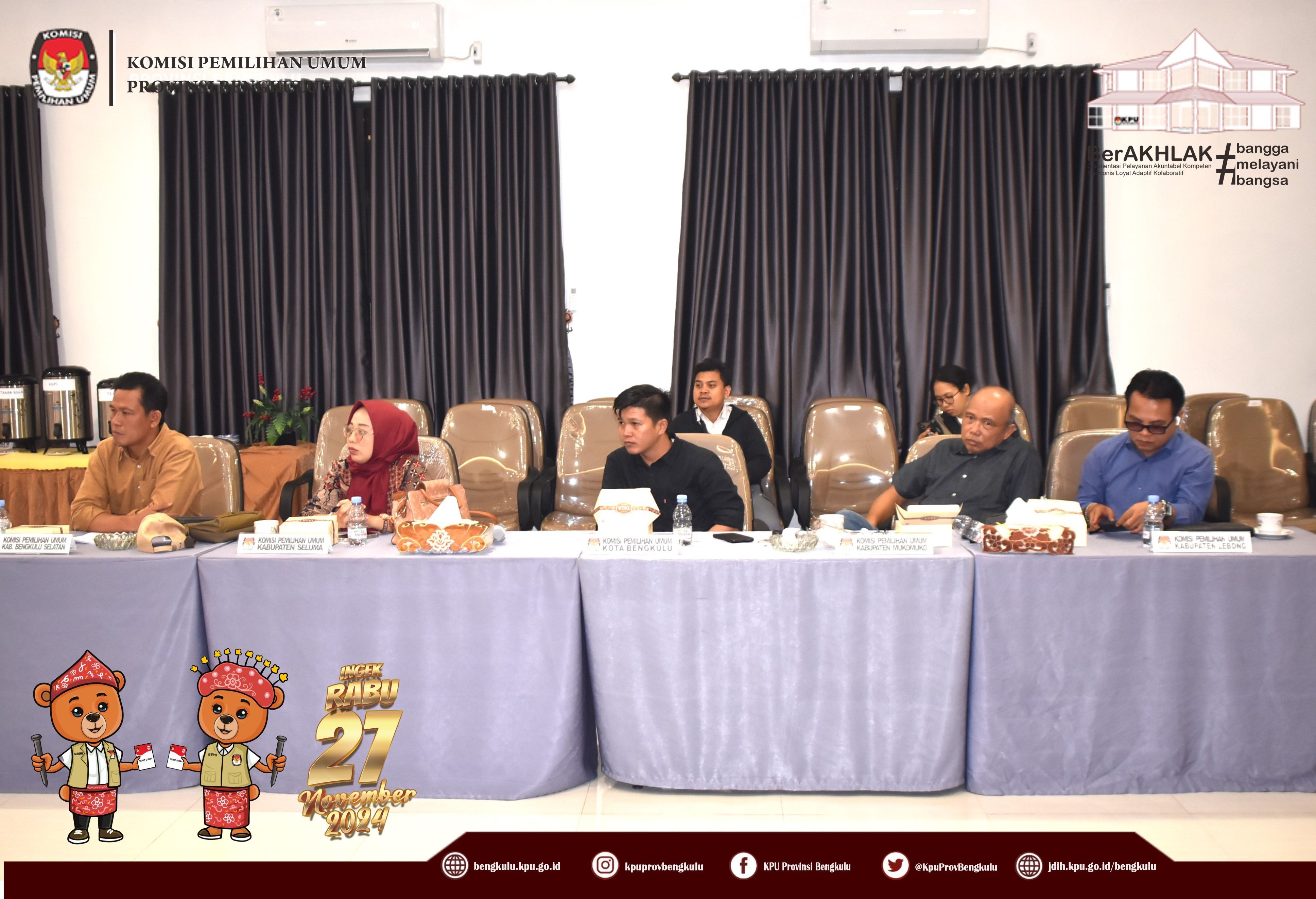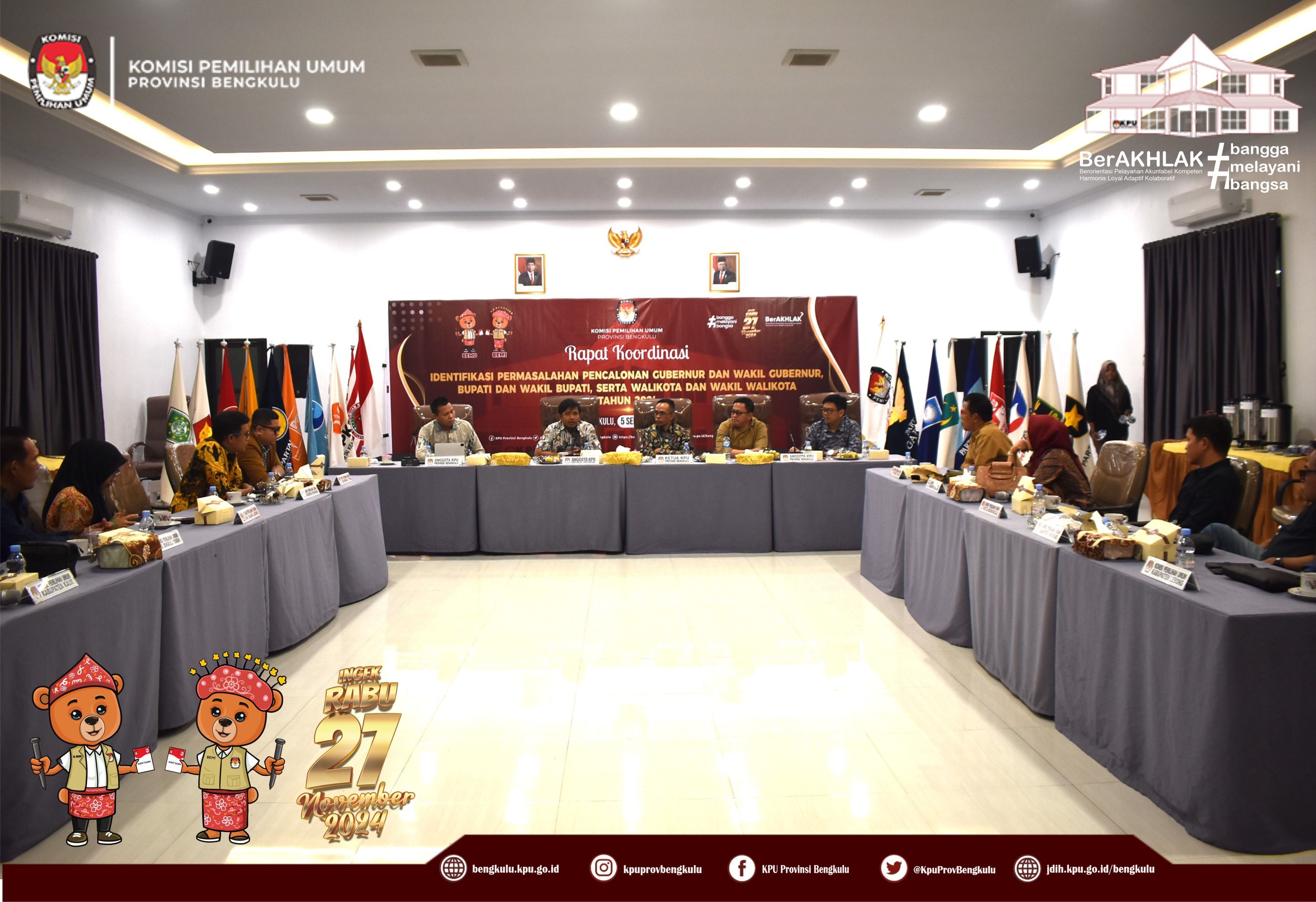 Bengkulu, bengkulu.kpu.go.id - Anggota KPU RI Bapak Idham Holik bersama Ketua KPU Provinsi Bengkulu Bapak Rusman Sudarsono, dan Anggota KPU Provinsi Bengkulu Bapak Alpin Samsen, Bapak Emex Verzoni dan Bapak Alpin Samsen hadir dalam Rapat Koordinasi Identifikasi Permasalahan Pencalonan Gubernur dan Wakil Gubernur, Bupati dan Wakil Bupati serta Walikota dan Wakil Walikota Dalam Pemilihan Serentak Tahun 2024, Kamis (5/9/2024) di Aula Demokrasi KPU Provinsi Bengkulu. Hadir Ketua Divisi Teknis Penyelenggaraan KPU Kabupaten/Kota se-Provinsi Bengkulu. Bapak Idham menjelaskan gambaran potensi permasalahan pada tahapan pencalonan pada pemilihan serentak 2024. Ketua Divisi Teknis Penyelenggaraan KPU Kabupaten/Kota memaparkan gambaran pelaksanaan pencalonan di masing-masing satker serta potensi permasalahan dan diskusi tanya jawab.