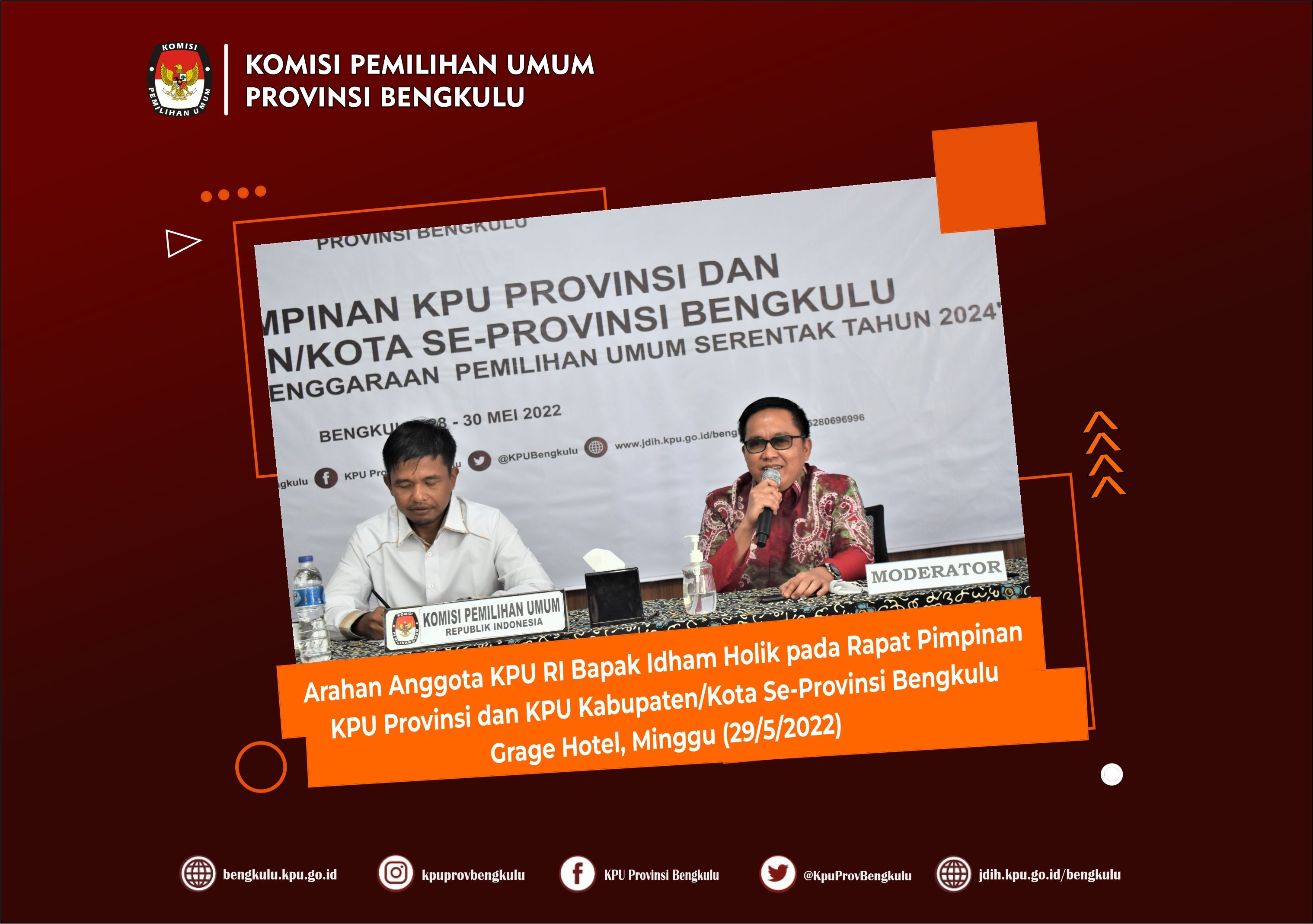 Bengkulu-bengkulu.kpu.go.id, Anggota KPU Republik Indonesia Bapak Idham Holik hadir dalam diskusi Rapat Pimpinan KPU Provinsi dan KPU Kabupaten/Kota Se-Provinsi Bengkulu, Minggu (29/5). Bertindak sebagai Moderator Anggota KPU Provinsi Bengkulu Bapak Emex Verzoni.