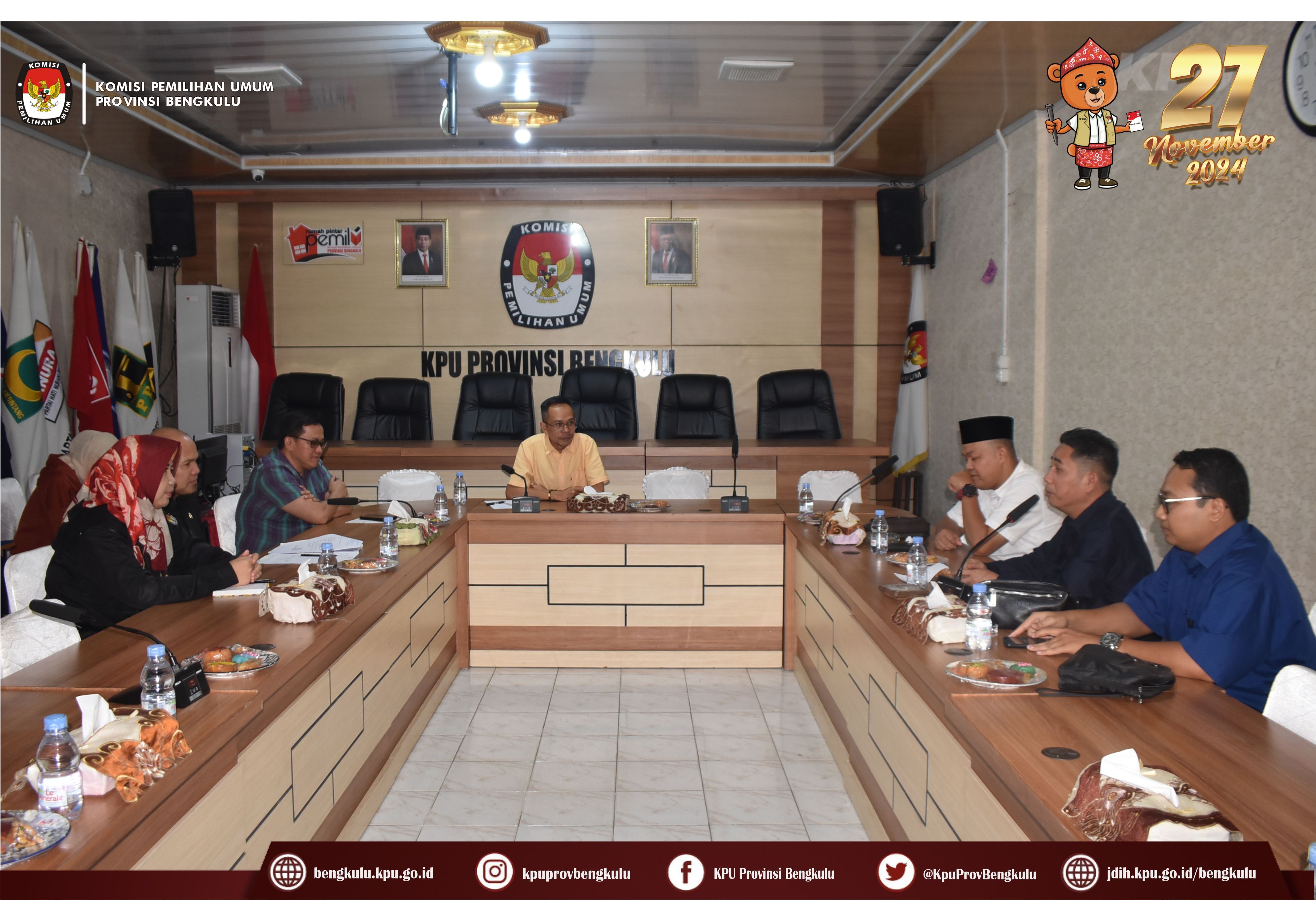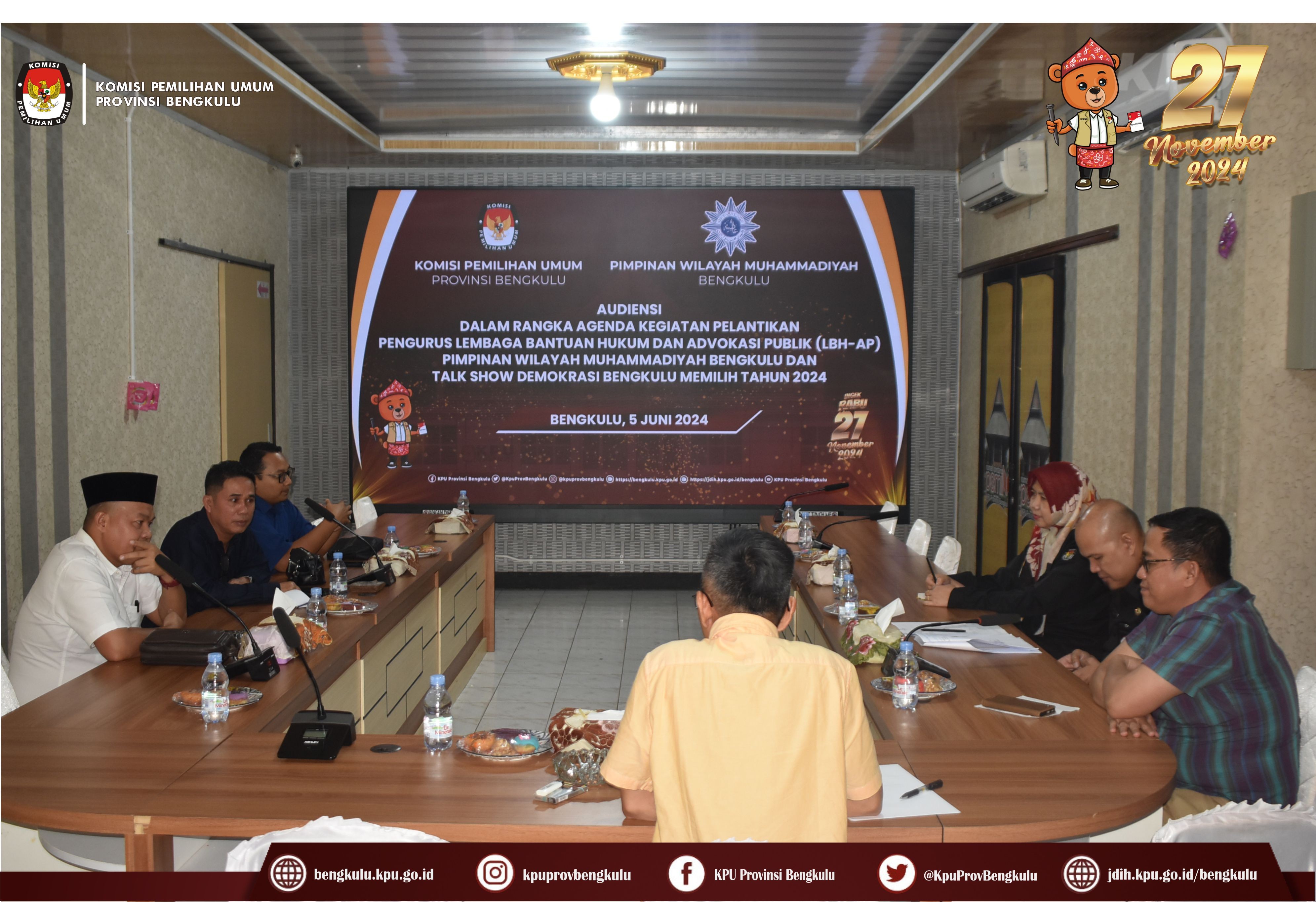 Bengkulu, bengkulu.kpu.go.id - Ketua KPU Provinsi Bengkulu Rusman Sudarsono bersama Anggota KPU Provinsi Bengkulu Emex Verzoni serta Kasubbag Teknis Penyelenggaraan Pemilu Partisipasi dan Hubungan Masyarakat M. Benny Eka Putra menerima Audiensi Pimpinan Wilayah Muhammadiyah Bengkulu, Rabu (5/6/2024) di Ruang Audio Visual Rumah Pintar Pemilu. Rombongan PW Muhammadiyah dipimpin Ketua LBH AP Elfahmi Lubis dan Dedi Nopiandi dan Rahmat Audiensi ini dalam rangka Agenda Kegiatan Pelantikan Pengurus Lembaga Bantuan Hukum dan Advokasi Publik (LBH-AP) dan Talkshow Demokrasi Bengkulu Memilih Tahun 2024.