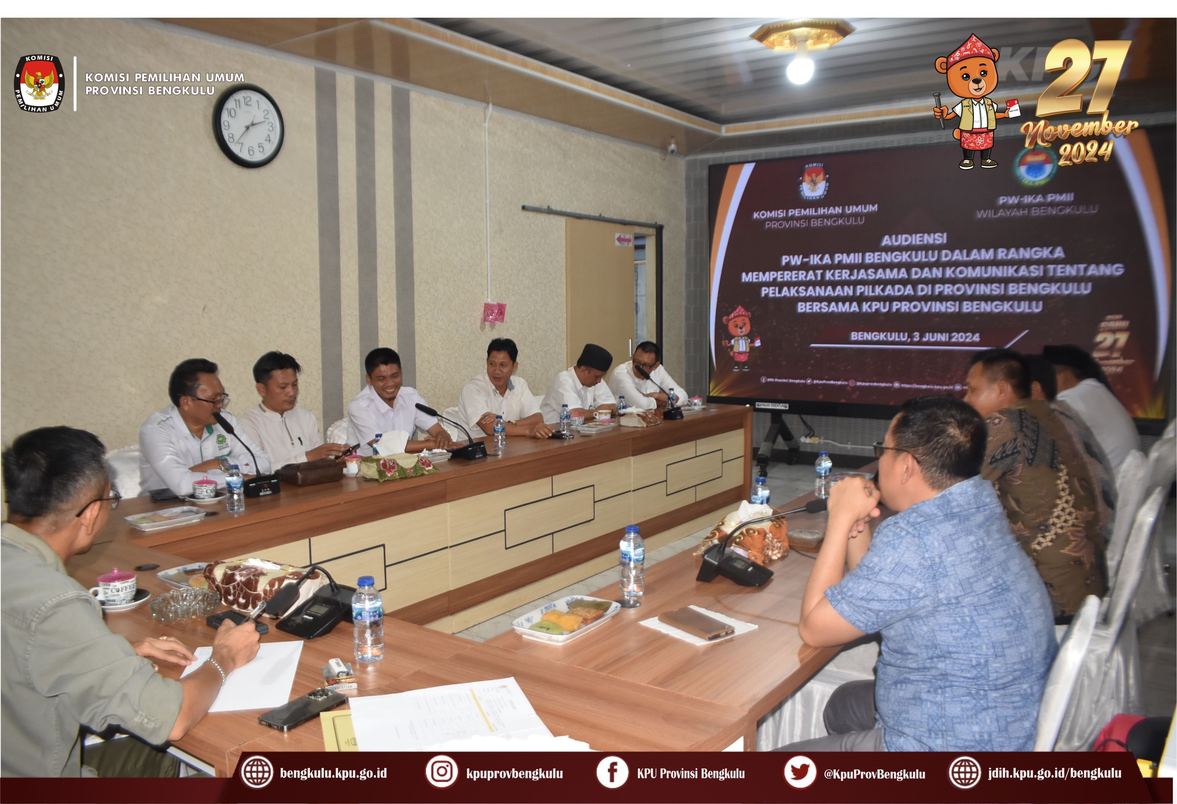 Bengkulu, bengkulu.kpu.go.id - KPU Provinsi Bengkulu menerima audiensi Pimpinan Wilayah Ikatan Mahasiswa Persatuan Mahasiswa Islam Indonesia (PW-IKA PMII) Bengkulu, Senin (3/6/2024) di Ruang Audio Visual Rumah Pintar Pemilu. Rombongan PW IKA PMII dipimpin Ketua Subhan didampingi Sekretaris Japarudin dan Anggota. Ketua KPU Provinsi Bengkulu Rusman Sudarsono bersama Anggota Dodi Hendra Supiarso, Emex Verzoni dan Sarjan Efendi serta Kabag TPHS Oktan Huzaeiry. Audiensi ini dalam rangka mempererat kerjasama dan komunikasi tentang pelaksanaan Pilkada di Provinsi Bengkulu Tahun 2024.