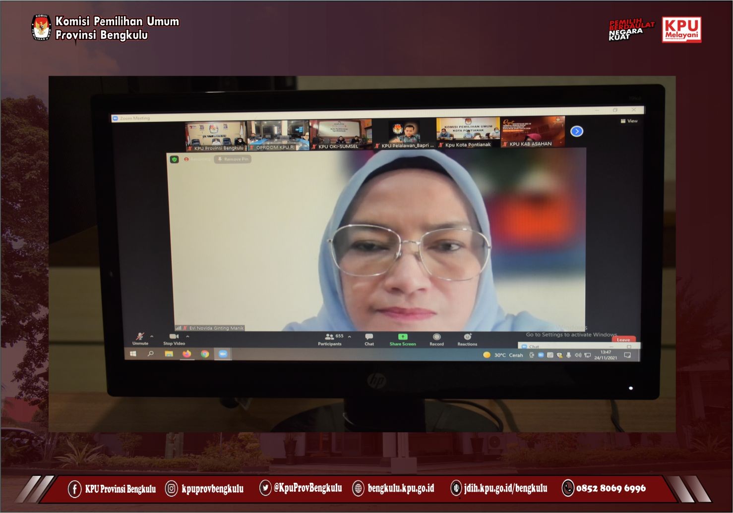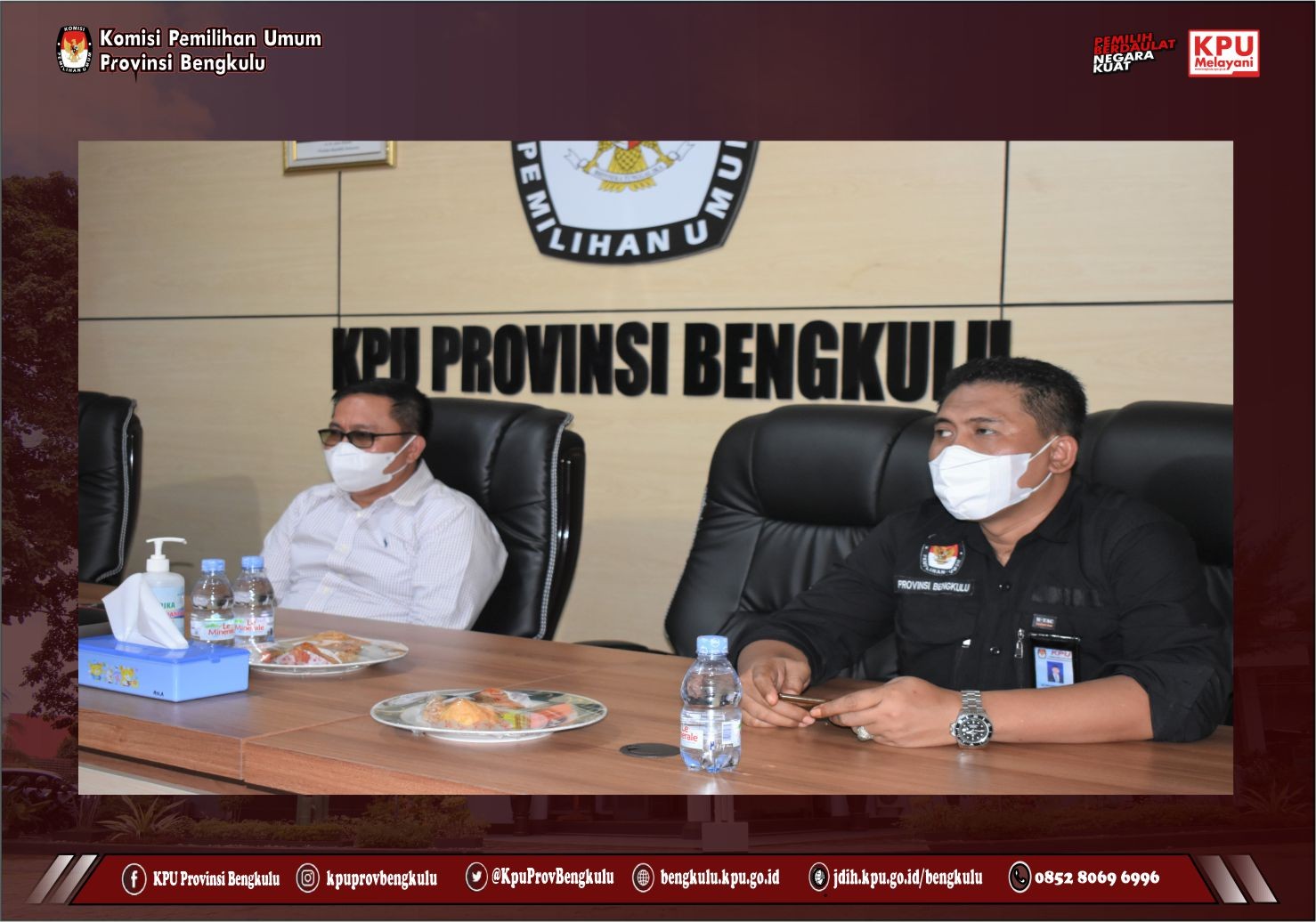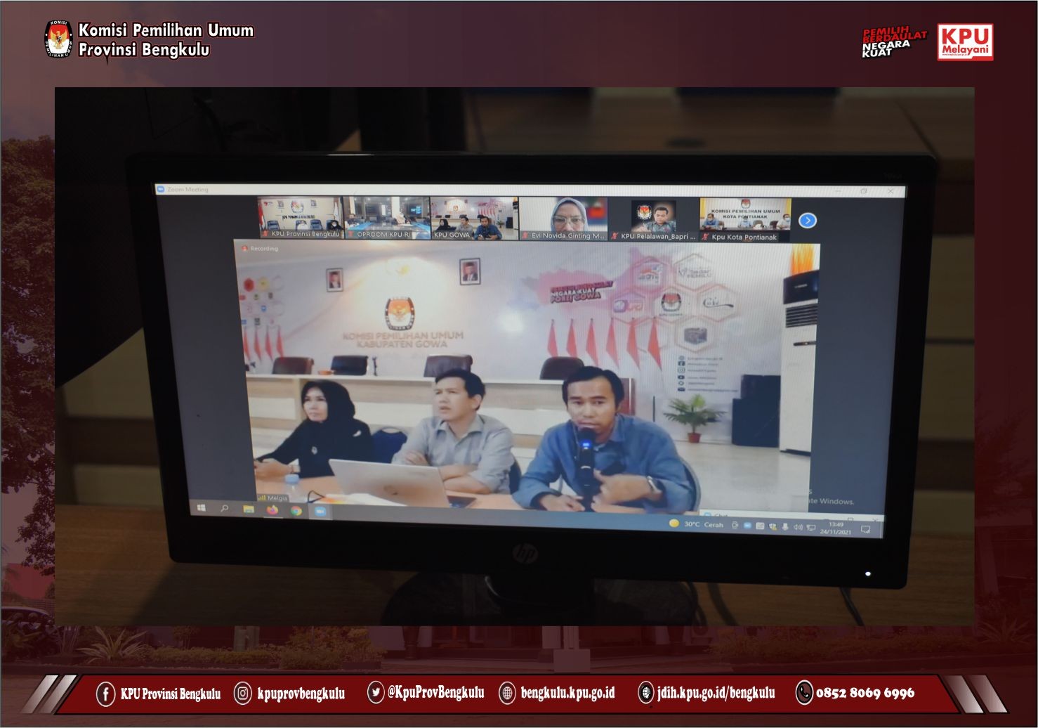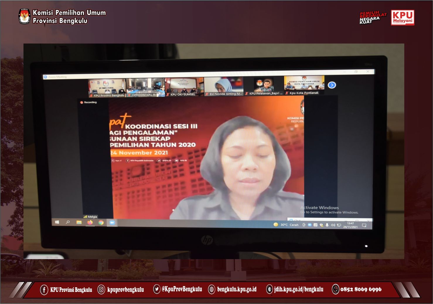 Ketua Dvisi Teknis Penyelenggaraan KPU Provinsi Bengkulu Emex Verzoni dan Kabag Hukum Teknis dan Hupmas Oktan Huzaeiry mengikuti Berbagi Pengalaman Penggunaan Sirekap pada pemilihan Tahun 2020 (Sesi III) yang diselenggarakan KPU Republik Indonesia secara daring pada Selasa (23/11). Rapat Koordinasi yang diikuti oleh KPU Provinsi dan KPU Kabupaten/Kota Se-Indonesia ini dibuka langsung oleh Anggota KPU RI Evi Novida Ginting Manik. Rangkaian acara diisi sharing pengalaman Penggunaan Sirekap pada pemilihan Tahun 2020 sebagai Narasumber, yakni KPU Kabupaten Tabanan, KPU Gowa dan KPU Indramayu.
