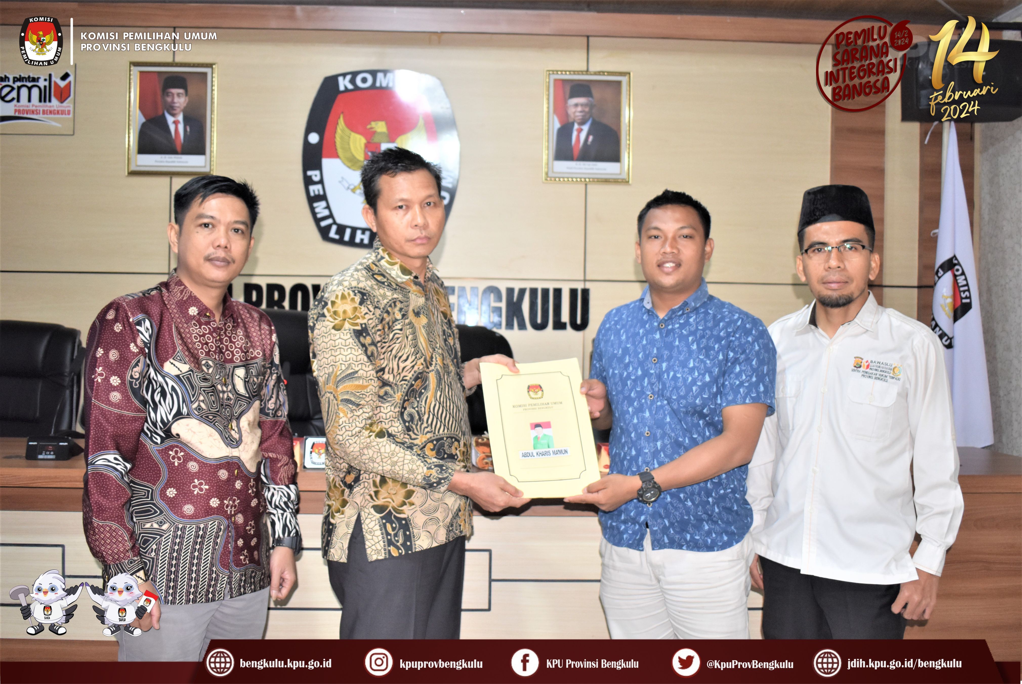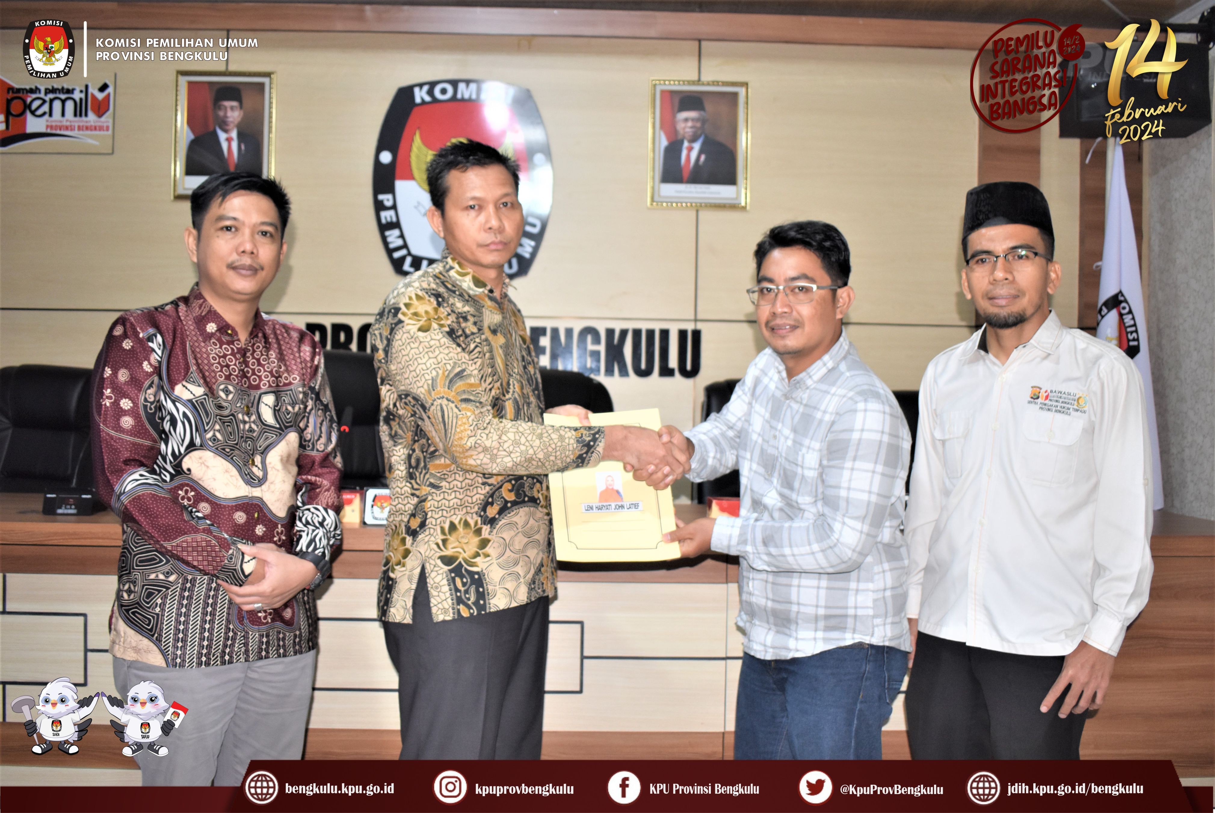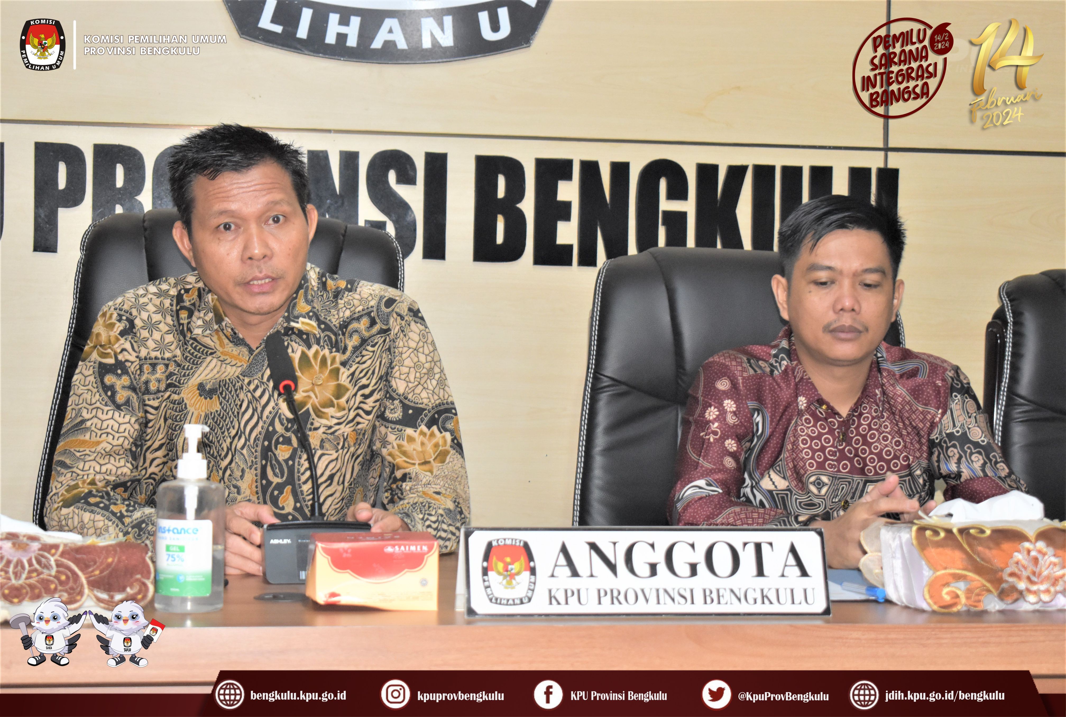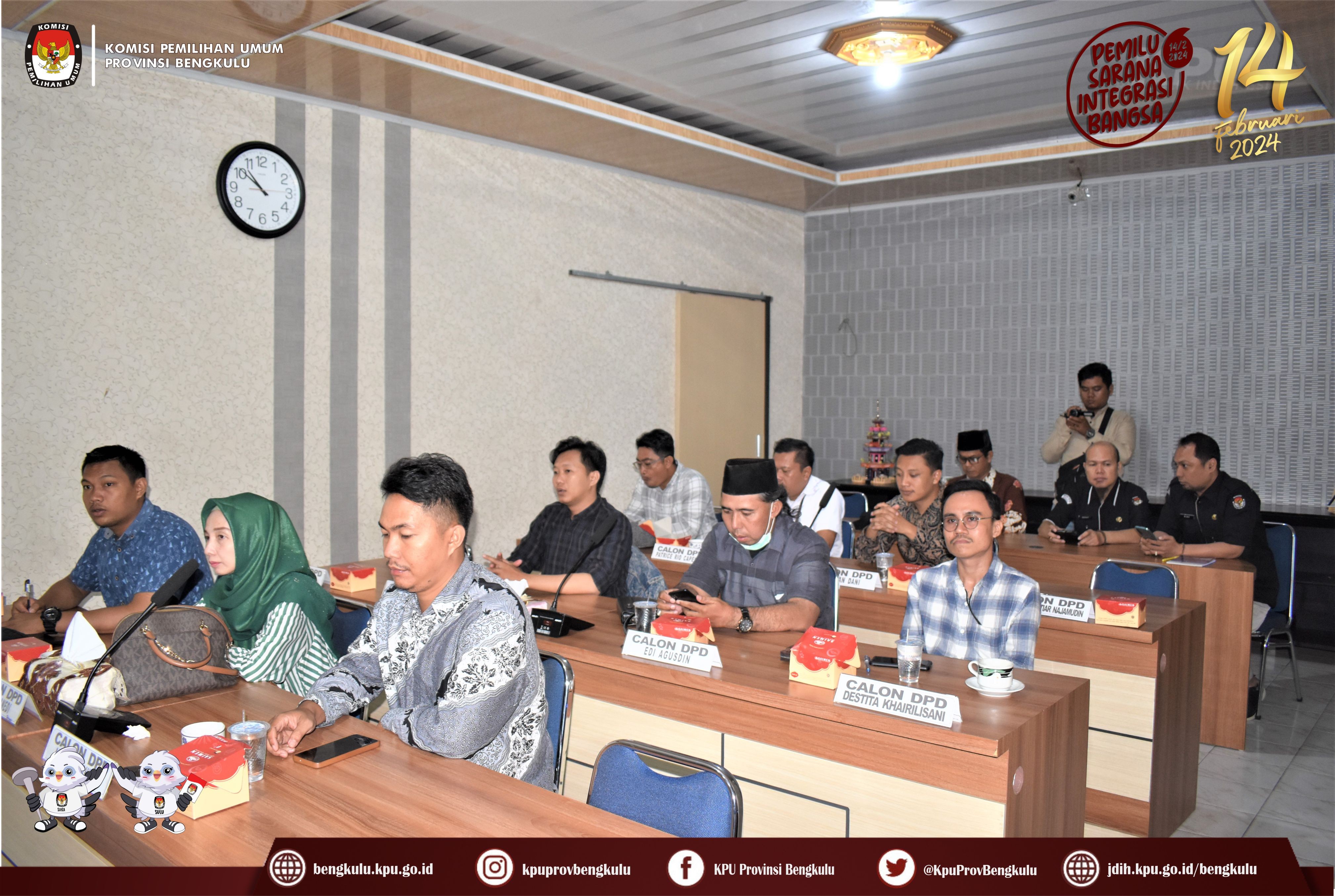 Bengkulu, bengkulu.kpu.go.id - Anggota KPU Provinsi Bengkulu Sarjan Efendi dan Alpin Samsen hadir dalam Penyampaian Berita Acara Verifikasi Administrasi Perbaikan dan Berita Acara Hasil Akhir Verifikasi Administrasi Dokumen Persyaratan Bakal Calon Anggota DPD Daerah Pemilihan Provinsi Bengkulu, Minggu (6/8/2023) di Ruang Audio Visual Rumah Pintar Pemilu KPU Provinsi Bengkulu. Penyampaian diserahkan langsung oleh Anggota KPU Provinsi Bengkulu Sarjan Efendi disaksikan Sekretariat Bawaslu Provinsi Bengkulu kepada Petugas Penghubung (LO) Bakal Calon Anggota DPD Daerah Pemilihan Provinsi Bengkulu. Selain ke Bakal Calon Berita Acara tersebut juga disampaikan kepada Bawaslu Provinsi Bengkulu.