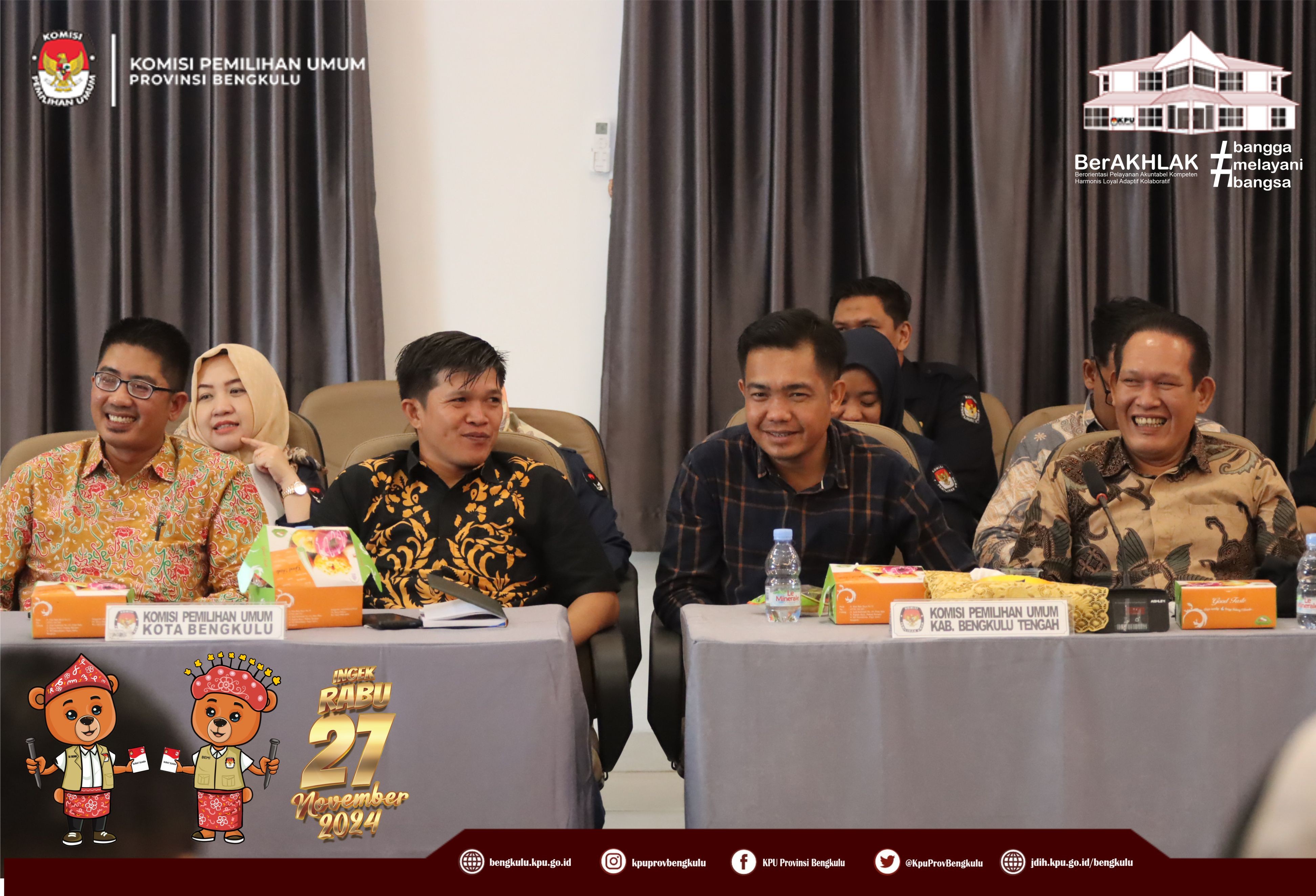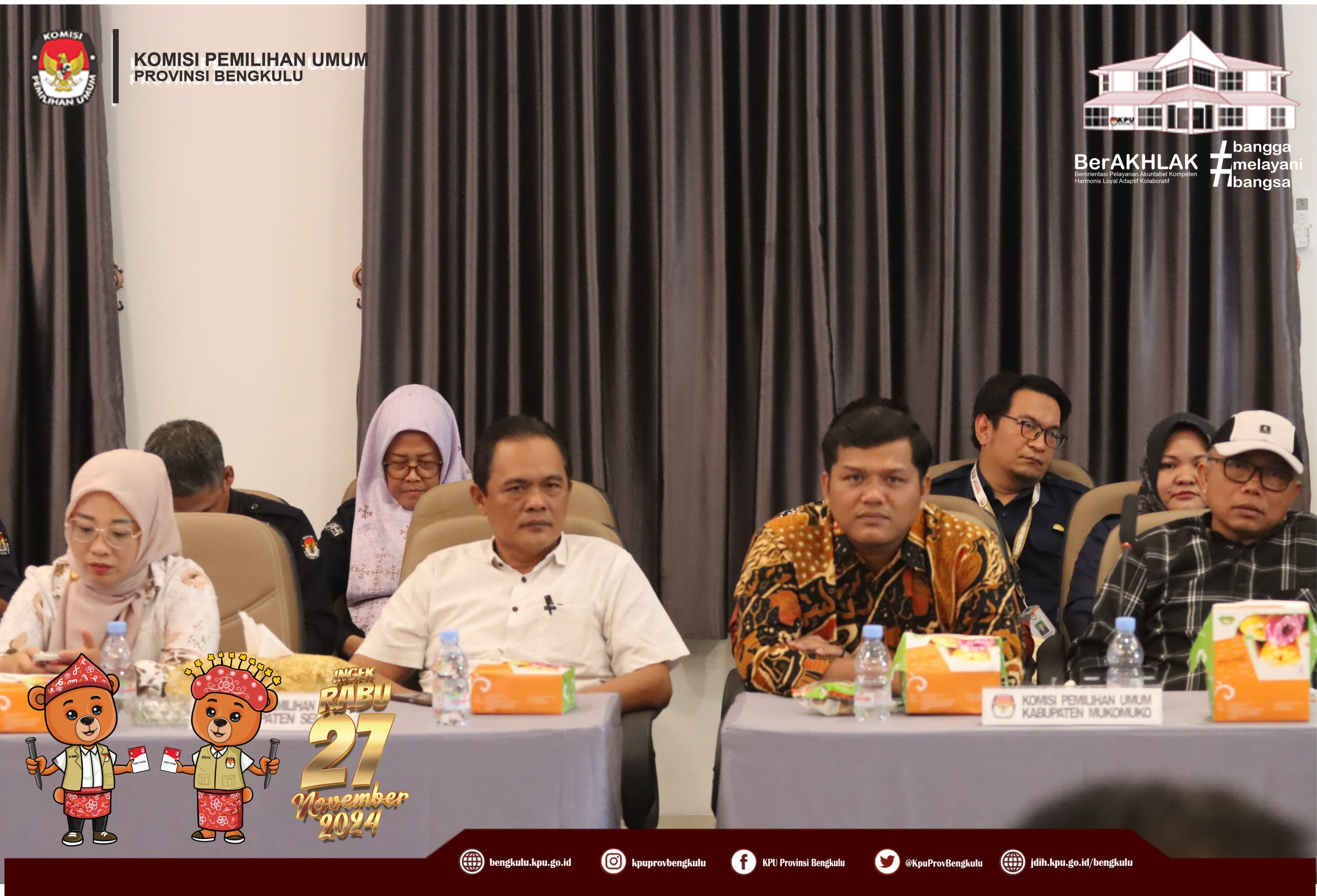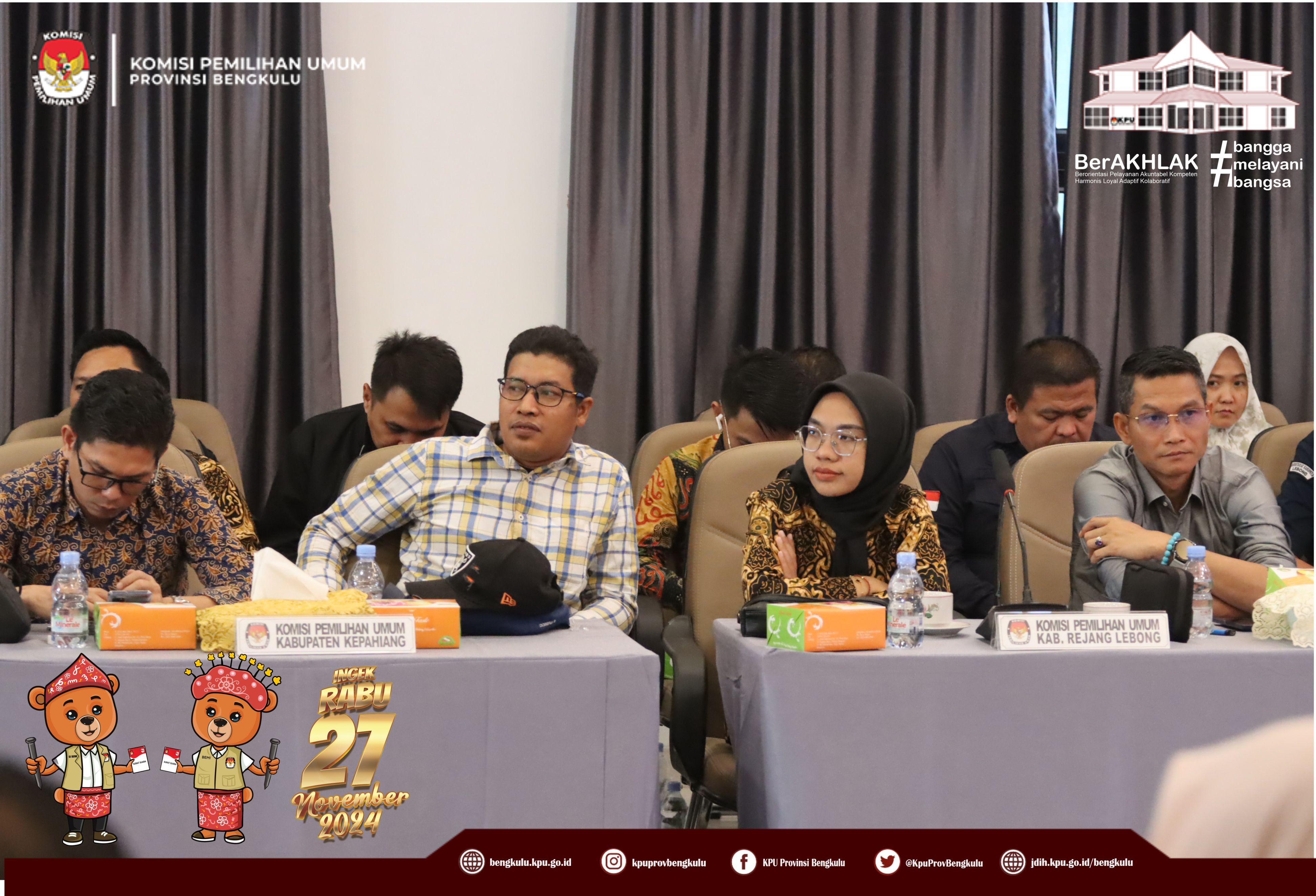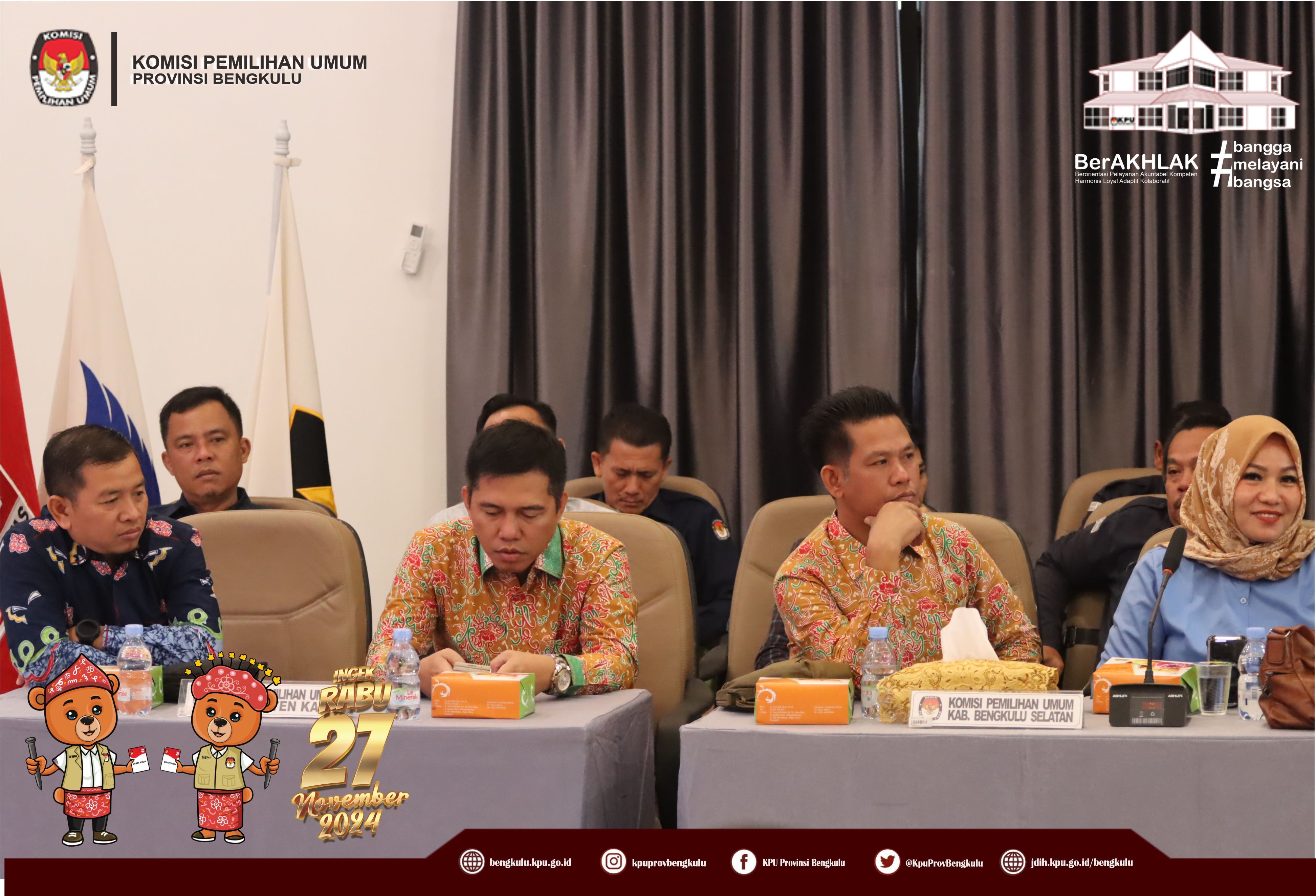 Bengkulu, bengkulu.kpu.go.id - Ketua KPU Provinsi Bengkulu Bapak Rusman Sudarsono, Anggota KPU Provinsi Bapak Dodi Hendra Supiarso dan Bapak Sarjan Efendi serta Kabag TPHS Bapak Oktan Huzaeiry membuka Bimbingan Teknis Pemungutan dan Penghitungan serta Rekapitulasi Penghitungan Perolehan Suara dan Penetapan Hasil Dalam Pemilihan Gubernur dan Wakil Gubernur, Bupati dan Wakil Bupati serta Walikota dan Wakil Walikota Tahun 2024, Sabtu (19/10/2024) di Aula Demokrasi KPU Provinsi Bengkulu. Hadir Ketua, Ketua Divisi Teknis Penyelenggaraan, Ketua Divisi Hukum dan Pengawasan, Kasubbag TPHM dan Kasubbag Rendatin KPU Kabupaten/Kota se-Provinsi Bengkulu. Dalam arahannya Bapak Rusman menyampaikan bahwa Bimbingan Teknis dalam rangka menyamakan persepsi dan pemahaman terkait Pemungutan dan Penghitungan serta Rekapitulasi Penghitungan Perolehan Suara dan Penetapan Hasil Pemilihan Dalam Pemilihan Serentak Tahun 2024 di Provinsi Bengkulu. Bapak Sarjan menjelaskan materi terkait Gambaran Umum Pemungutan dan Penghitungan serta Rekapitulasi Penghitungan Perolehan Suara dan Penetapan Hasil Pemilihan. Selain materi, acara juga diisi dengan diskusi tanya jawab.