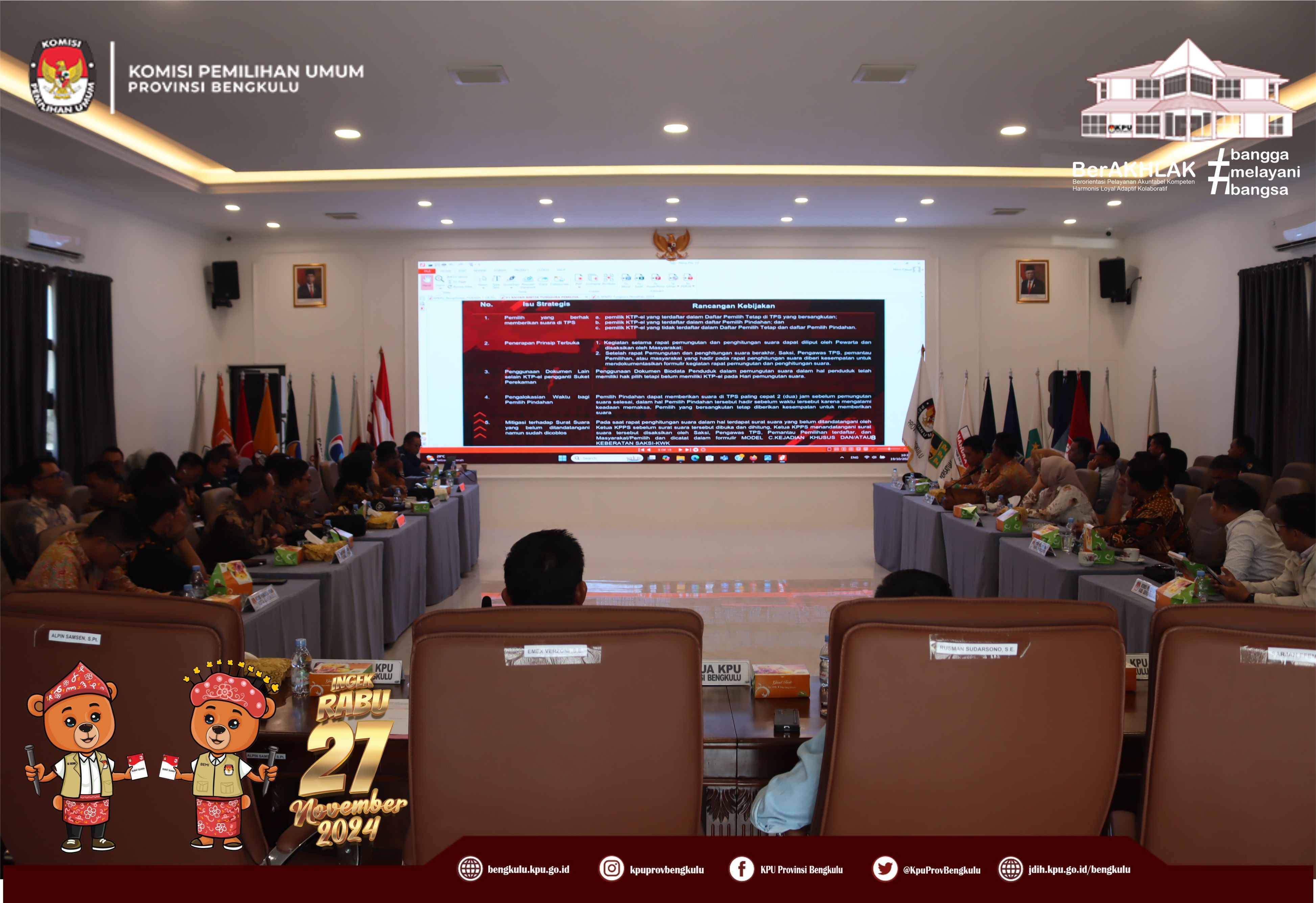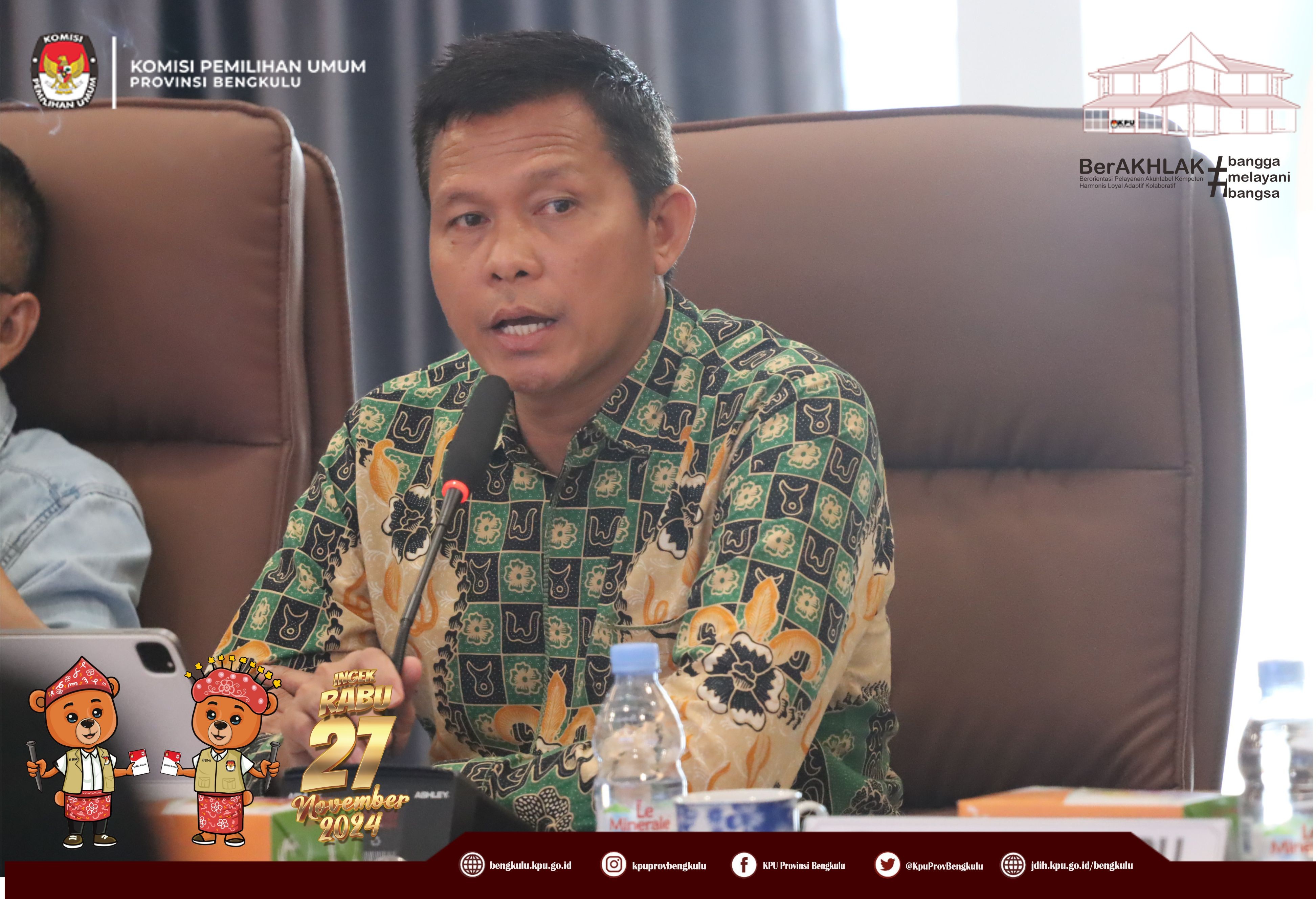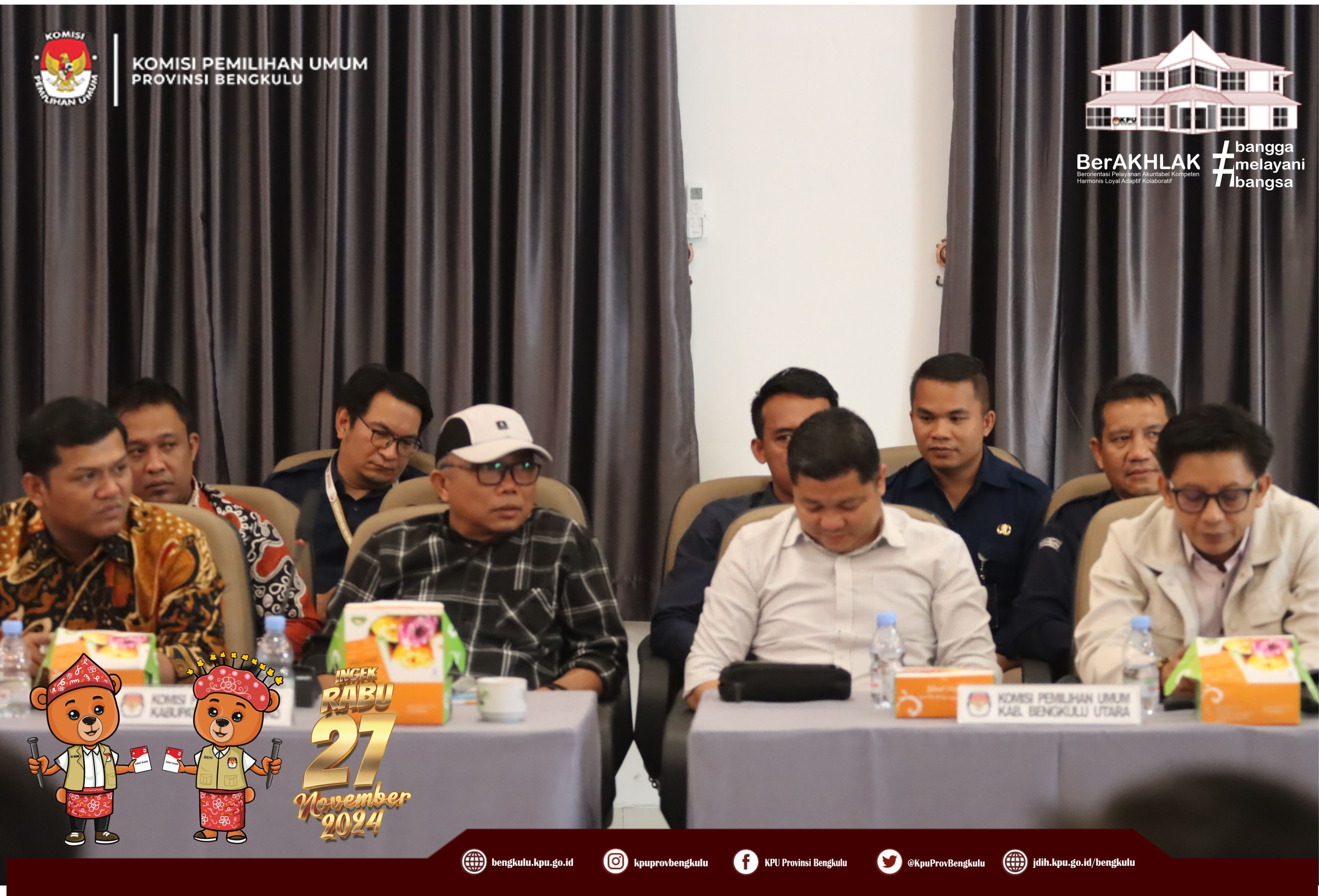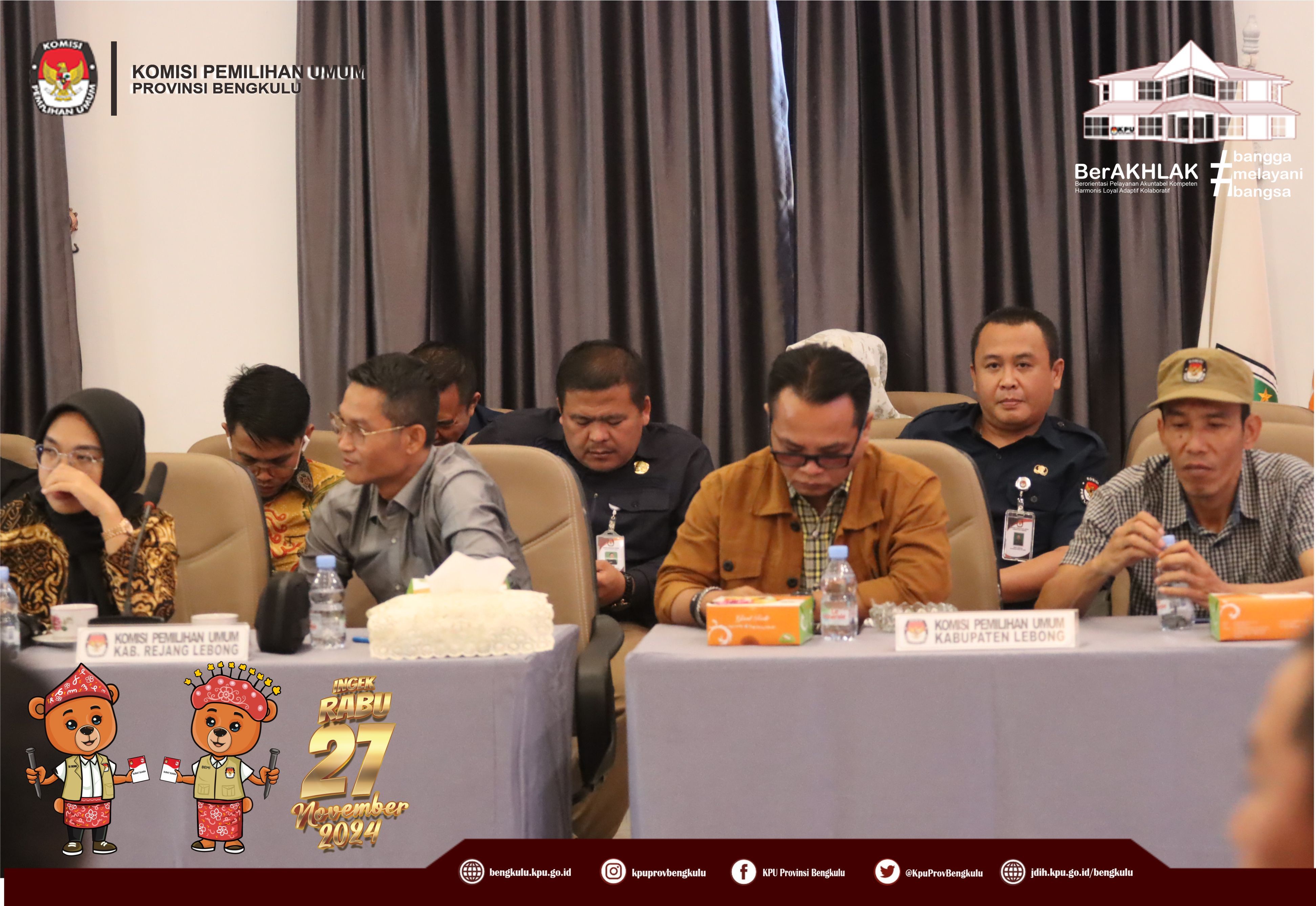 Bengkulu, bengkulu.kpu.go.id - Ketua KPU Provinsi Bengkulu Bapak Rusman Sudarsono, Anggota KPU Provinsi Bapak Dodi Hendra Supiarso dan Bapak Sarjan Efendi serta Kabag TPHS Bapak Oktan Huzaeiry membuka Bimbingan Teknis Pemungutan dan Penghitungan serta Rekapitulasi Penghitungan Perolehan Suara dan Penetapan Hasil Dalam Pemilihan Gubernur dan Wakil Gubernur, Bupati dan Wakil Bupati serta Walikota dan Wakil Walikota Tahun 2024, Sabtu (19/10/2024) di Aula Demokrasi KPU Provinsi Bengkulu. Hadir Ketua, Ketua Divisi Teknis Penyelenggaraan, Ketua Divisi Hukum dan Pengawasan, Kasubbag TPHM dan Kasubbag Rendatin KPU Kabupaten/Kota se-Provinsi Bengkulu. Dalam arahannya Bapak Rusman menyampaikan bahwa Bimbingan Teknis dalam rangka menyamakan persepsi dan pemahaman terkait Pemungutan dan Penghitungan serta Rekapitulasi Penghitungan Perolehan Suara dan Penetapan Hasil Pemilihan Dalam Pemilihan Serentak Tahun 2024 di Provinsi Bengkulu. Bapak Sarjan menjelaskan materi terkait Gambaran Umum Pemungutan dan Penghitungan serta Rekapitulasi Penghitungan Perolehan Suara dan Penetapan Hasil Pemilihan. Selain materi, acara juga diisi dengan diskusi tanya jawab.