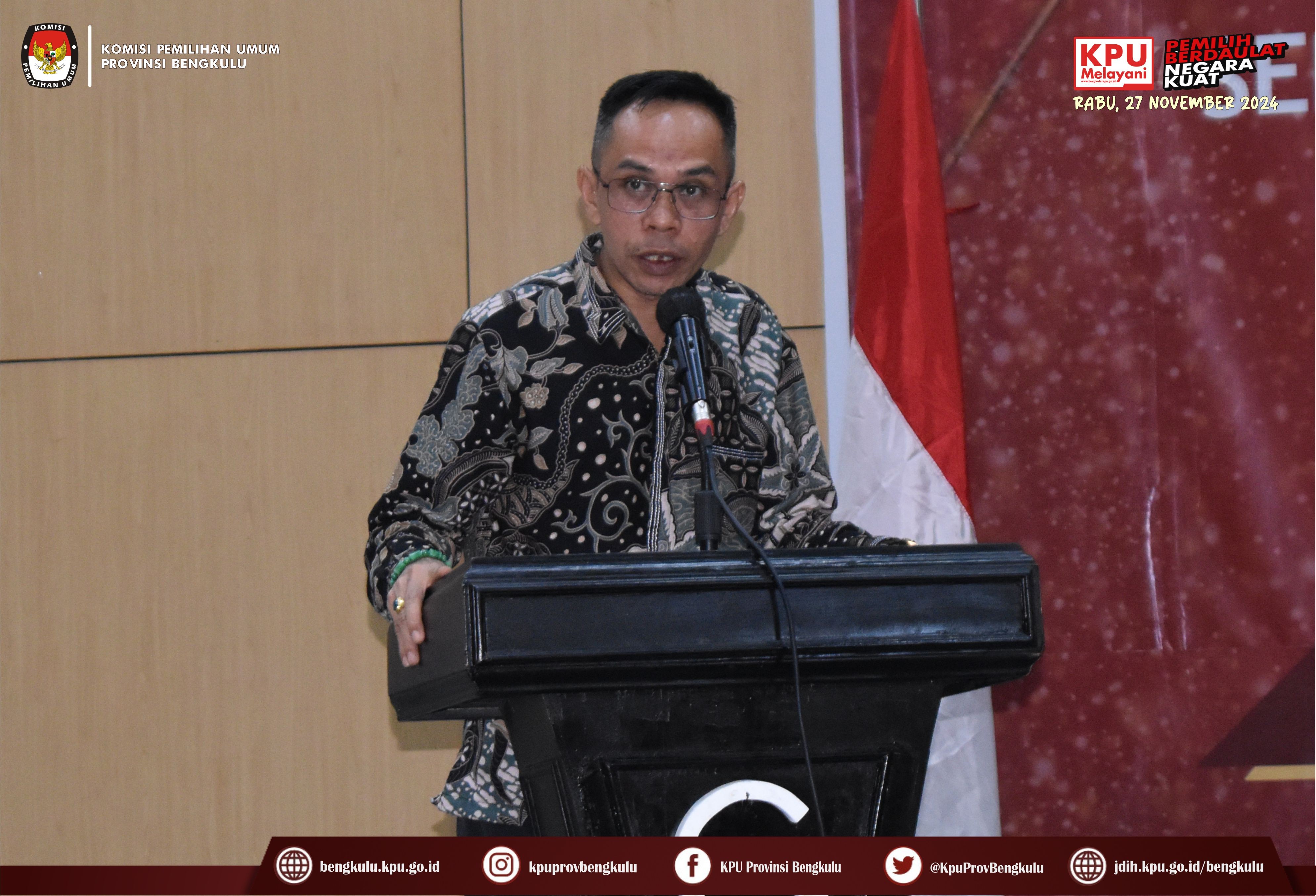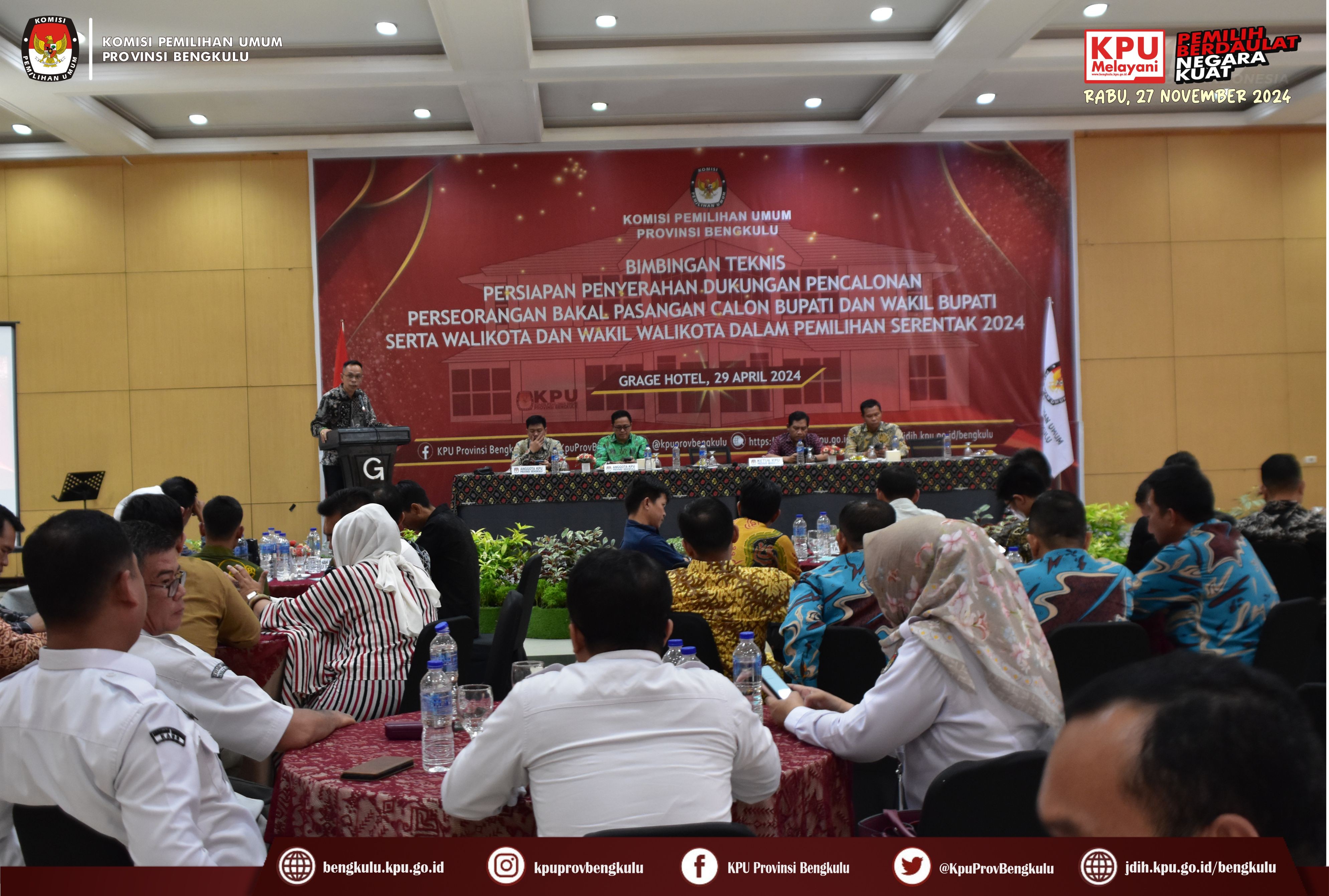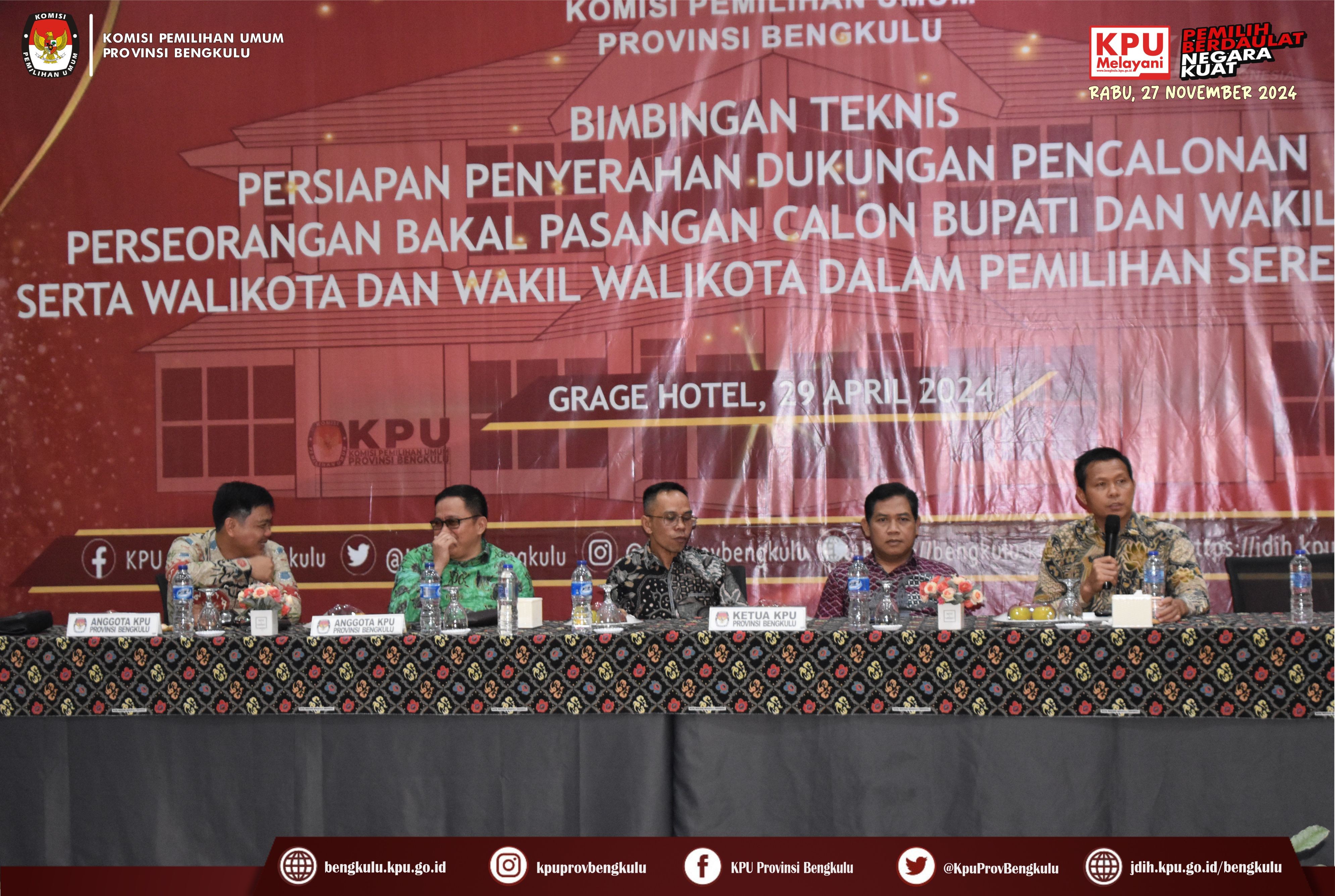 Bengkulu, bengkulu.kpu.go.id - KPU Provinsi Bengkulu menggelar Bimbingan Teknis Persiapan Penyerahan Dukungan Pencalonan Perseorangan Bakal Pasangan Calon Bupati dan Wakil Bupati serta Walikota dan Wakil Walikota Dalam Pemilihan Serentak 2024, Senin (29/4/2024) di Grage Hotel Bengkulu. Acara dibuka oleh Ketua KPU Provinsi Bengkulu Rusman Sudarsono bersama Anggota KPU Provinsi Bengkulu Alpin Samsen, Dodi Hendra Supiarso, Emex Verzoni dan Sarjan Efendi. Kegiatan Bimbingan Teknis diikuti Ketua, Anggota, Sekretaris, Kasubbag Teknis Penyelenggaraan Pemilihan Umum Partisipasi dan Hubungan Masyarakat serta Admin/Operator Silon KPU Kabupaten/Kota se-Provinsi Bengkulu. Dalam sambutannya Rusman mengatakan bahwa kegiatan ini dalam rangka memberikan pemahaman dan penyamaan persepsi mengenai Persiapan Penyerahan Dukungan Pencalonan Perseorangan Bakal Pasangan Calon Bupati dan Wakil Bupati serta Walikota dan Wakil Walikota Dalam Pemilihan Serentak 2024 yang akan pada 5 Mei 2024. Setelah dibuka acara dilanjutkan dengan arahan dari Anggota KPU Provinsi Bengkulu Alpin Samsen yang membahas tentang persiapan penerimaan DP4 oleh KPU Kabupaten/Kota, Emex Verzoni membahas tentang perkembangan proses sengketa pilpres dan pileg 2024 di Mahkamah Konstitusi, sedangkan Dodi Hendra Supiarso membahas tentang perkembangan penerimaan pendaftaran PPK yang dimulai pada 23-29 April 2024. Sementara itu, Sarjan Efendi yang membahas tentang tahapan dan jadwal pemilihan serentak Tahun 2024 sebagaimana yang diatur dalam PKPU Nomor 2 Tahun 2024. Selain itu, Sarjan menjelaskan hal teknis berkaitan dengan pencalonan perseorangan mulai dari Syarat Minimal Dukungan dan Sebaran, dokumen pendukung B.1 KWK Perseorangan, verifikasi administrasi dan verifikasi faktual sampai dengan penetapan pasangan calon, gambaran umum penggunaan SILON dan sebagainya. Selain materi acara diisi juga dengan diskusi tanya jawab.