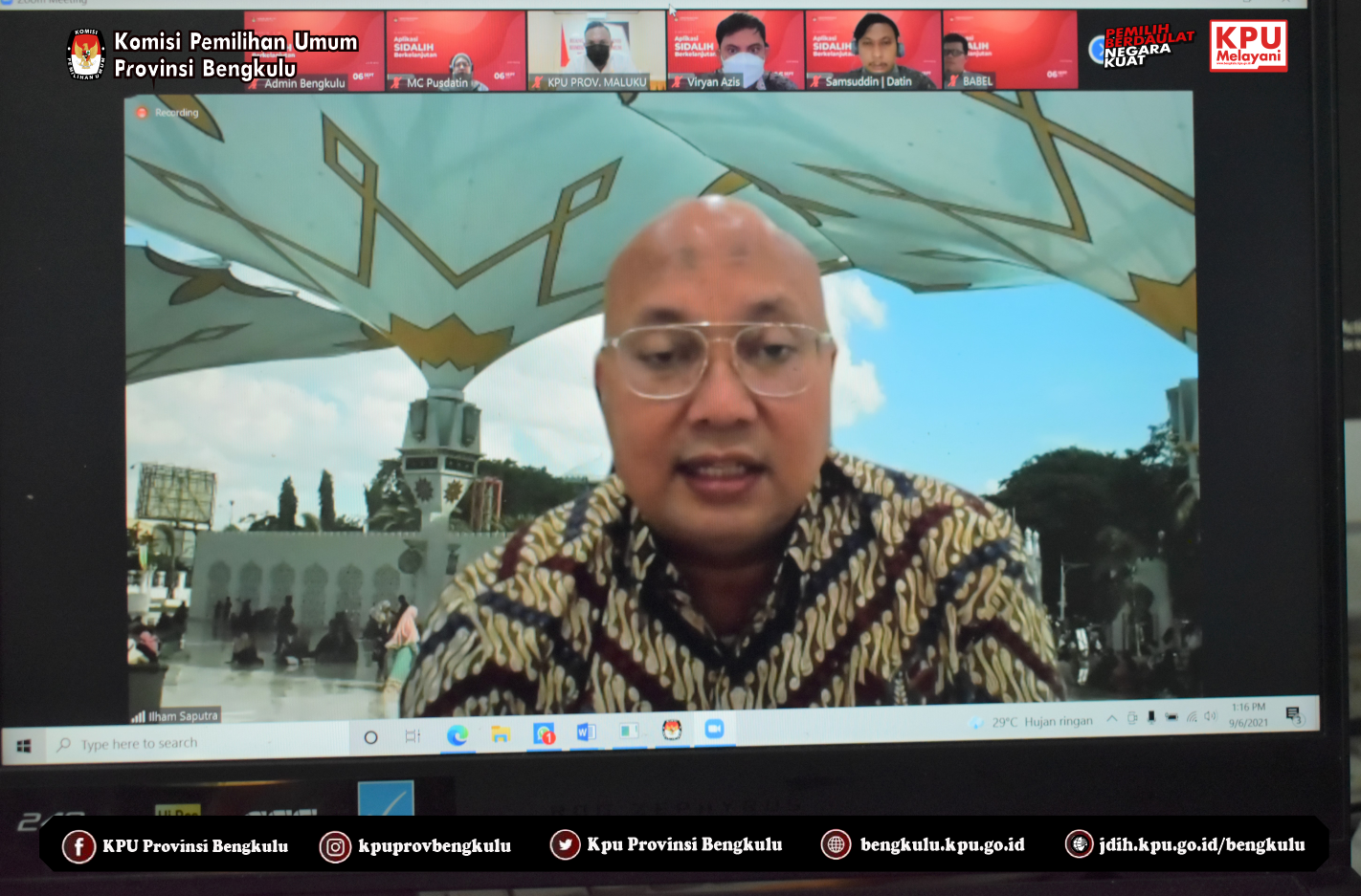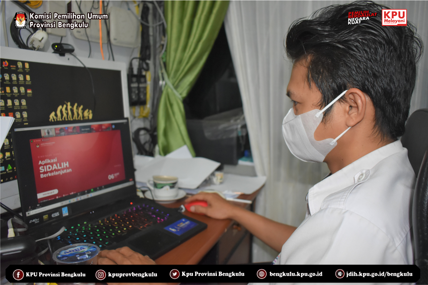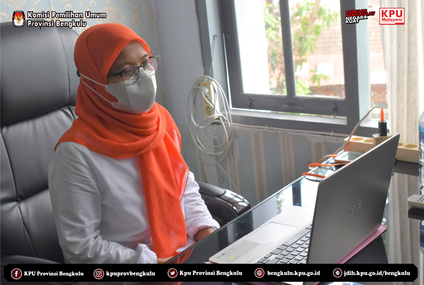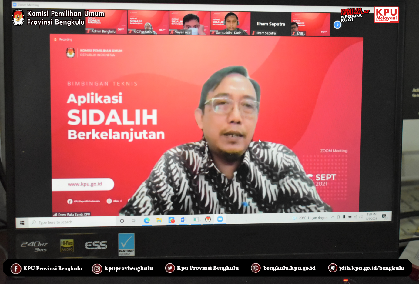 Anggota KPU Provinsi Bengkulu Siti Baroroh dan Operator Sidalih Hendra Kurniawan mengikuti Bimbingan Teknis Aplikasi Sistem Informasi Data Pemilih (Sidalih) Berkelanjutan yang diselenggarakan secara daring (zoom meeting) oleh KPU Republik Indonesia pada Senin (6/9). Peserta kegiatan ini diikuti oleh KPU Provinsi dan KPU Kabupaten/Kota Se-Indonesia. Acara dibuka langsung oleh Ketua KPU Bapak Ilham Saputra dan Anggota KPU RI Bapak Viryan, Bapak Pramono Ubaid Tanthowi dan Bapak I Dewa Kade Wiarsa Raka Sandi. Setelah pembukaan acara dilanjutkan dengan Penyampaian materi oleh Bapak Viryan.