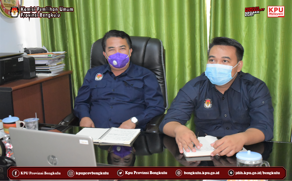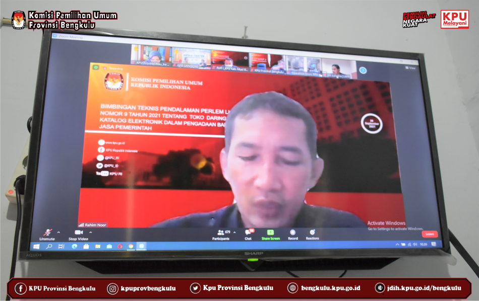 PU Provinsi Bengkulu yang diwakili oleh Kabag Keuangan Umum dan Logistik Sudirman dan Staf Umum dan Logistik Jasmen Fantoni mengikuti Bimbingan Teknis Pendalaman Peraturan Kebijakan Pengadaan Barang/Jasa Pemerintah Nomor 9 Tahun 2021 tentang Toko Daring dan Katalog Elektronik dalam Pengadaan Barang/Jasa Pemerintah yang diselenggarakan oleh KPU Republik Indonesia secara daring (zoom meeting) pada Selasa (28/9). Peserta kegiatan ini adalah PPK dan Pejabat Pengadaan KPU Provinsi/KIP Aceh dan KPU/KIP Kabupaten/Kota Se-Indonesia. Kegiatan ini diisi penyampaian materi dari Ahli Madya Fungsional Pengadaan barang/Jasa Sekretariat Jenderal KPU RI Rahim Noor.