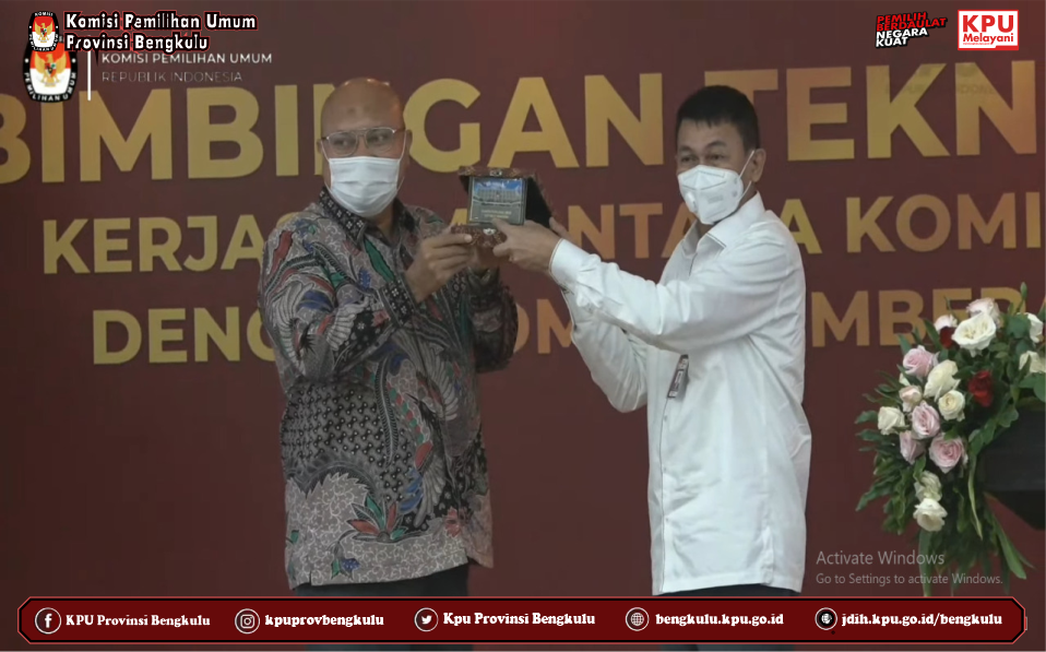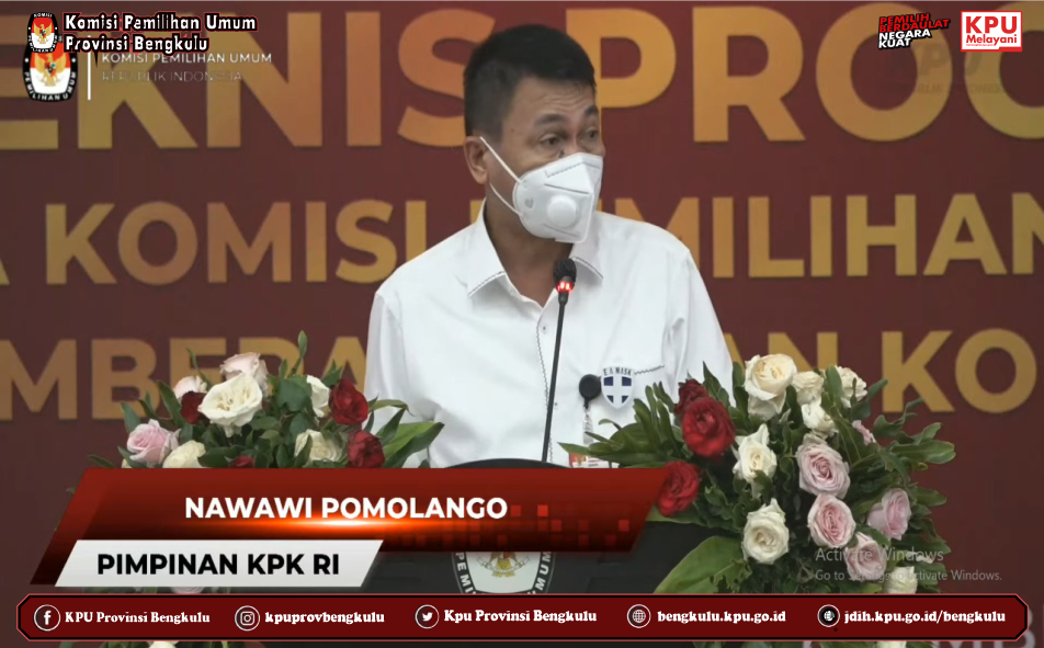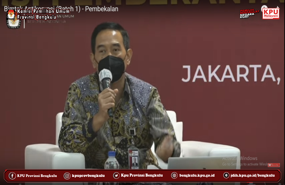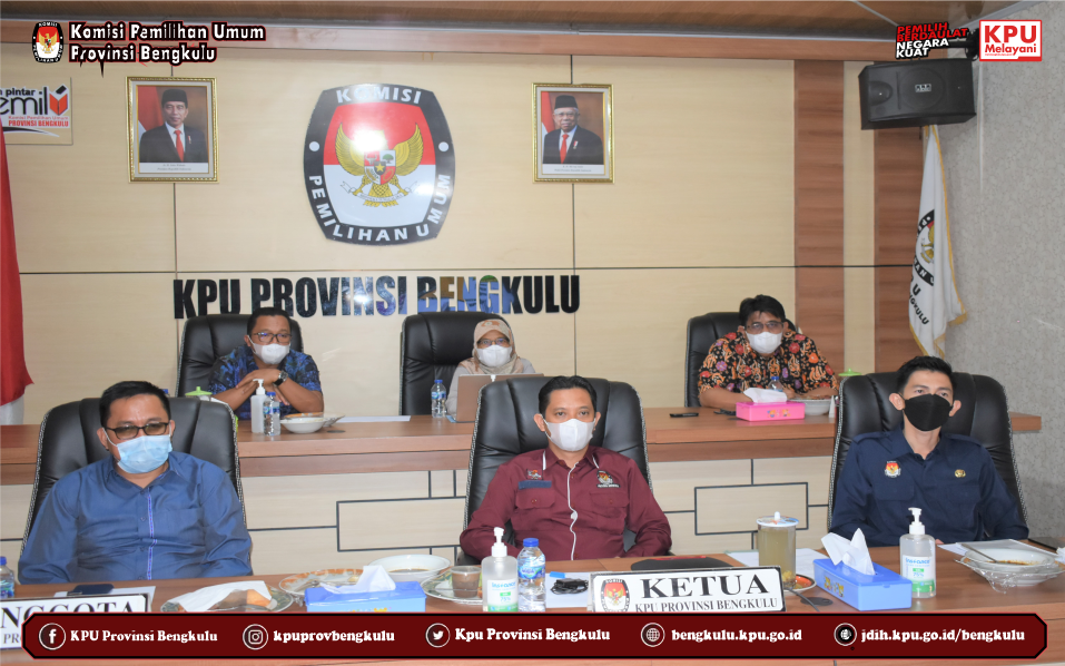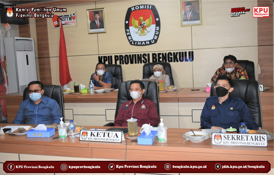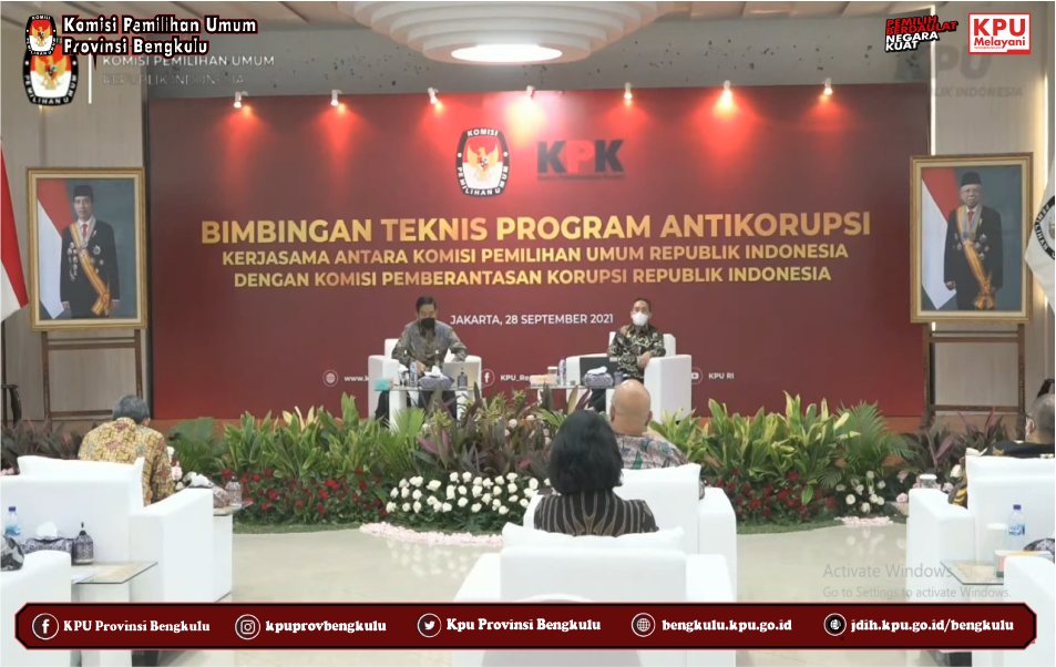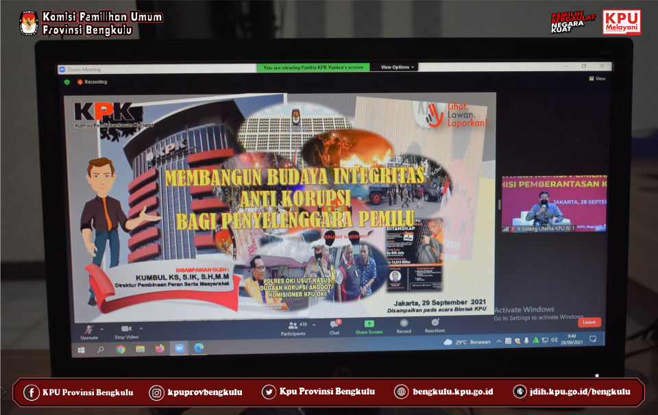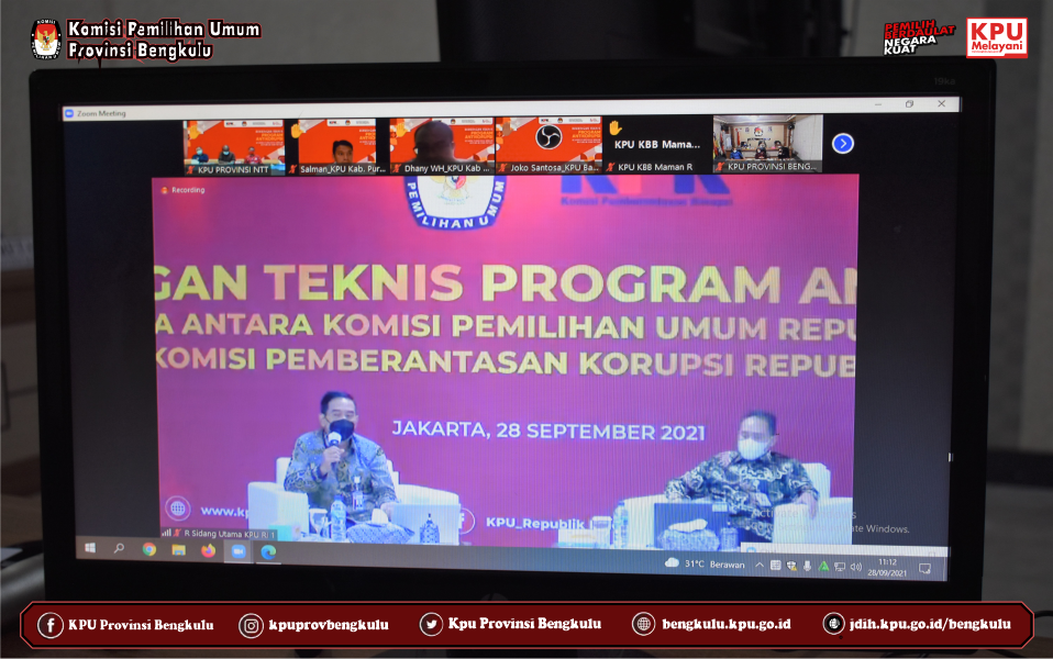 Ketua KPU Provinsi Bengkulu Irwan Saputra dan Anggota Eko Sugianto, Siti Baroroh, Darlinsyah dan Emex Verzoni serta Sekretaris Kemas M Ajir mengikuti Bimbingan Teknis Program Antikorupsi yang diselenggarakan kerjasama KPU RI dan KPK RI secara daring (zoom meeting) pada Selasa (28/9). Peserta kegiatan ini adalah Ketua dan Anggota KPU Provinsi/KIP Aceh serta Ketua dan Anggota KPU/KIP Kabupaten/Kota Se Indonesia yang menjadi beberapa gelombang (batch). Acara dibuka dan dihadiri oleh Ketua KPU RI Ilham Saputra dan Pimpinan KPK RI Nawawi Pomolango. Rangkaian kegiatan diisi dengan penyampaian materi oleh Direktur Pembinaan Peran Serta Masyarakat Kumbul, KS, S.IK.,SH.,MM yang membahas materi Membangun Budaya Integritas Anti Korupsi Bagi Penyelenggara Pemilu serta diskusi tanya jawab.