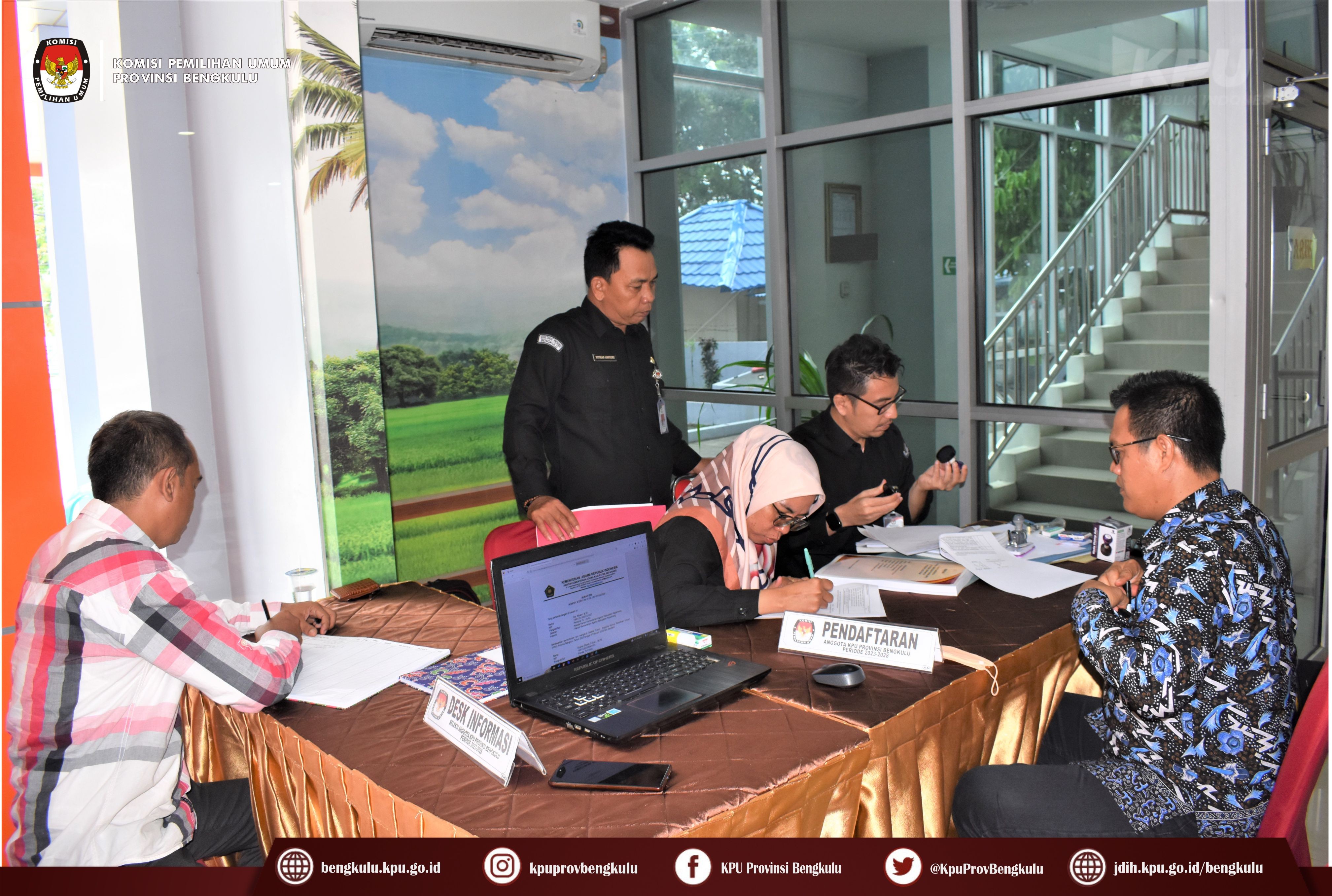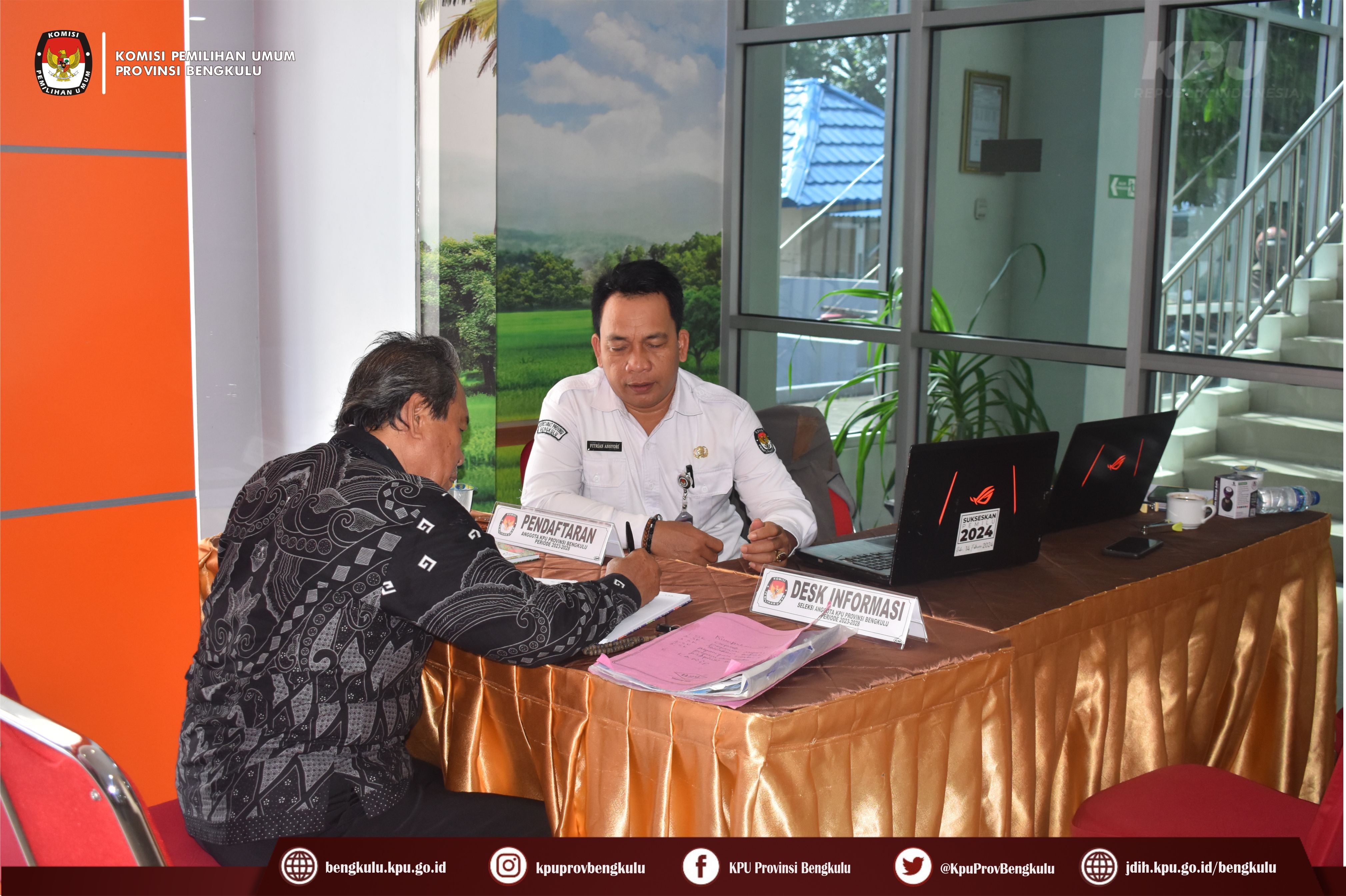 Bengkulu-bengkulu.kpu.go.id, Sekretariat Tim Seleksi Calon Anggota KPU Provinsi Bengkulu Periode 2023-2028 membuka layanan desk informasi dan pendaftaran bagi masyarakat Bengkulu yang mau ikut dalam Seleksi Anggota KPU Provinsi dapat datang langsung ke alamat Gedung GTC Polkeslu Jl. Seruni Nusa Indah Kec. Ratu Agung Kota Bengkulu atau dapat menghubungi Call Center dengan nomor 085280696996. Pendaftaran dibuka pada tanggal 10 s.d 21 Februari 2023 mulai pukul 08.00 s.d 16.00 WIB. Hari Sabtu dan Minggu tetap buka untuk penerimaan berkas. Dokumen yang diserahkan dalam bentuk Hardcopy (fisik) yang telah dijilid sebanyak 2 (dua) rangkap dengan rincian 1 asli dan 1 copy dengan warna tidak ditentukan.