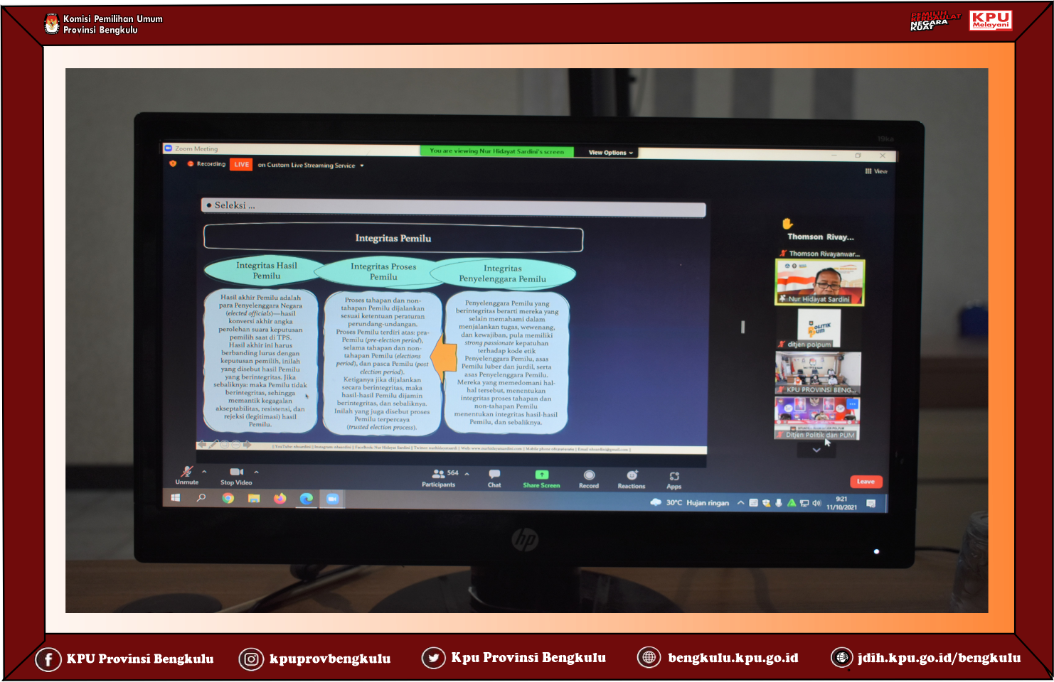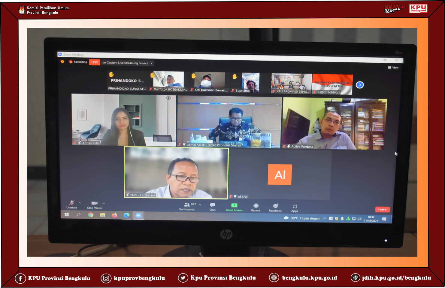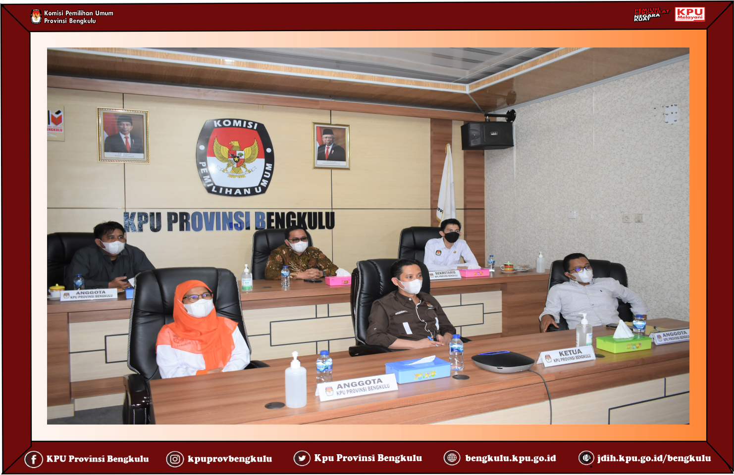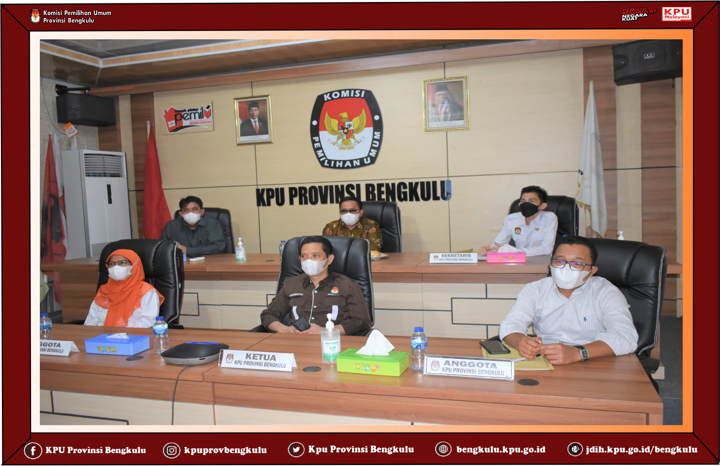 Ketua, Anggota dan Sekretaris KPU Provinsi Bengkulu mengikuti Webinar dengan Tema Seleksi Anggota KPU RI dan Bawaslu RI Periode 2022-2027 Untuk Mengelola Pemilu dan Pilkada Serentak Tahun 2024 di Tengah Pandemi Covid-19 yang diselenggarakan oleh Direktorat Jenderal Politik dan PUM Kementerian Dalam Negeri Republik Indonesia secara Daring (zoom meeting) pada Senin (11/10).