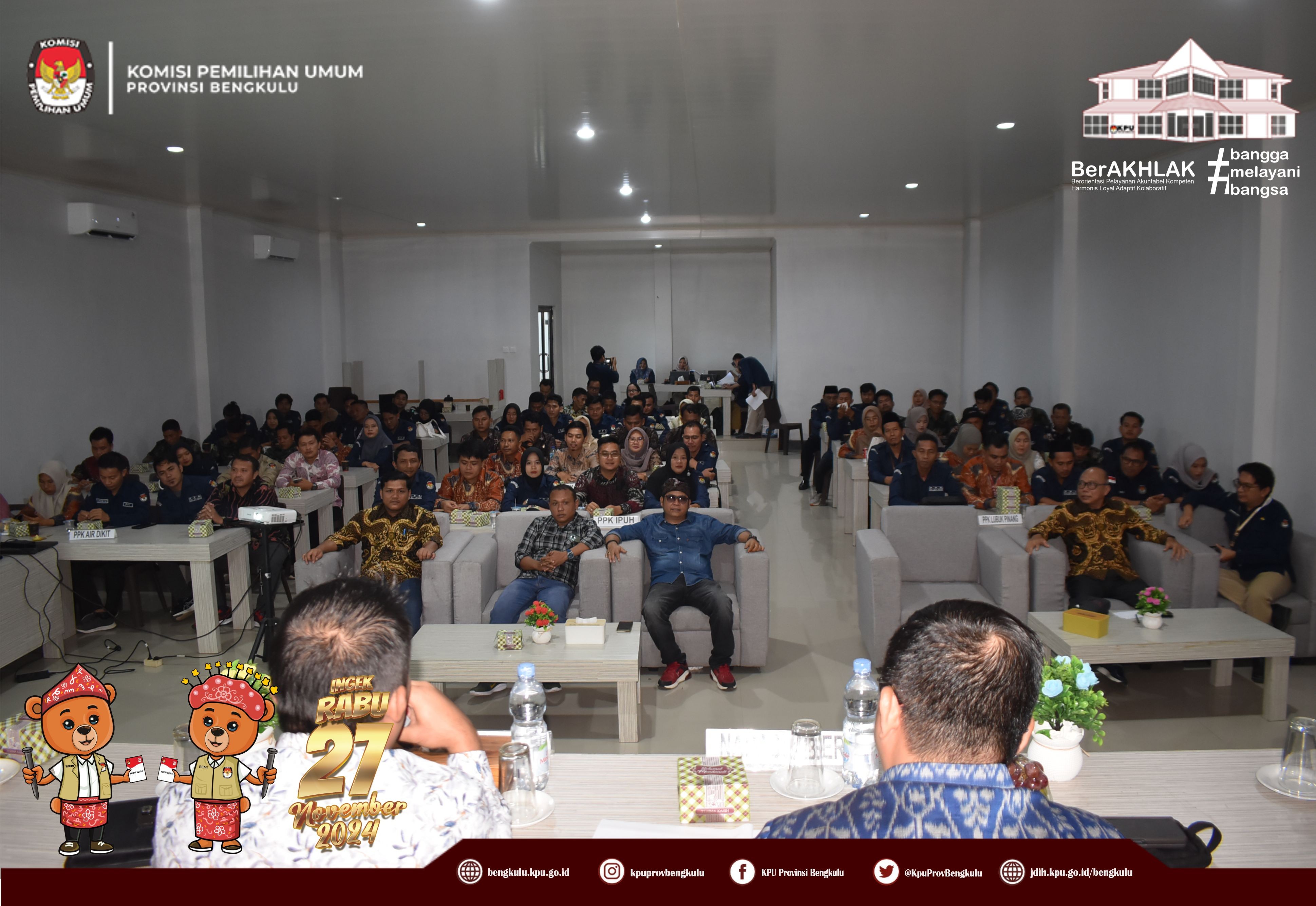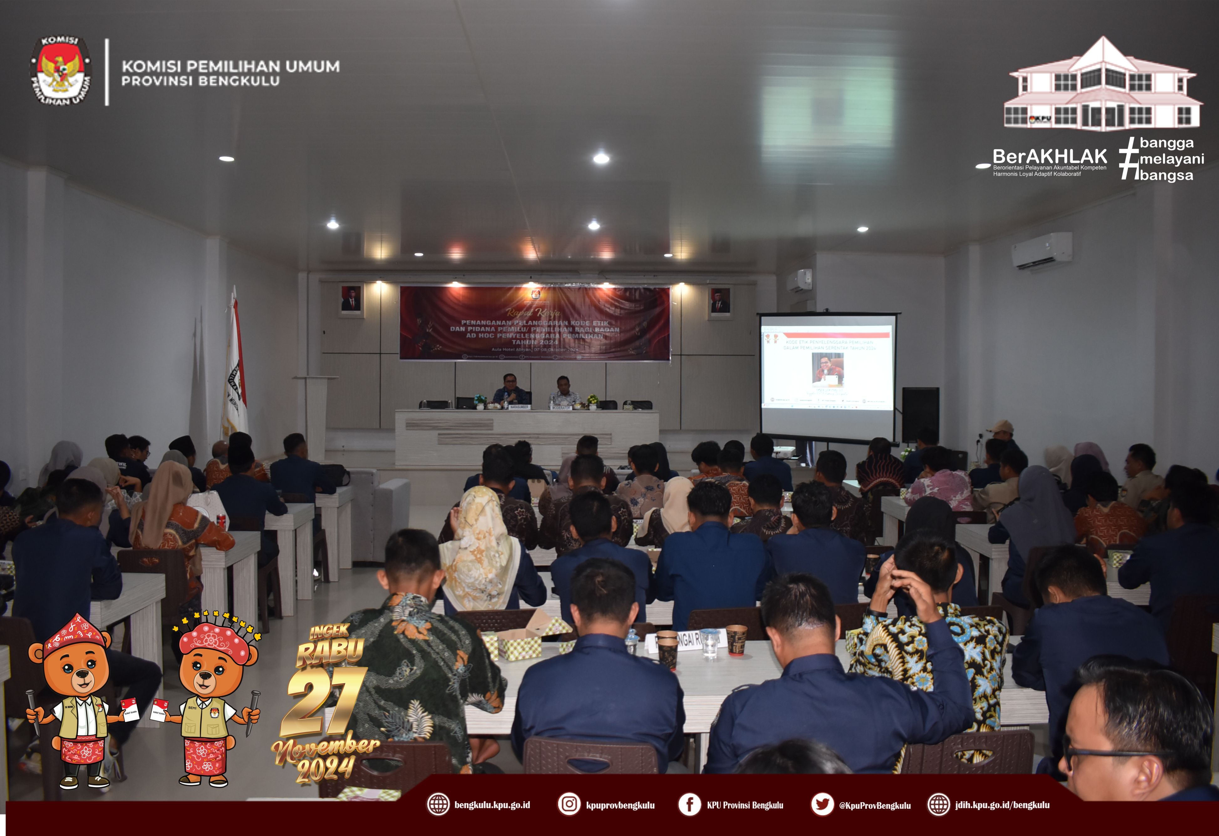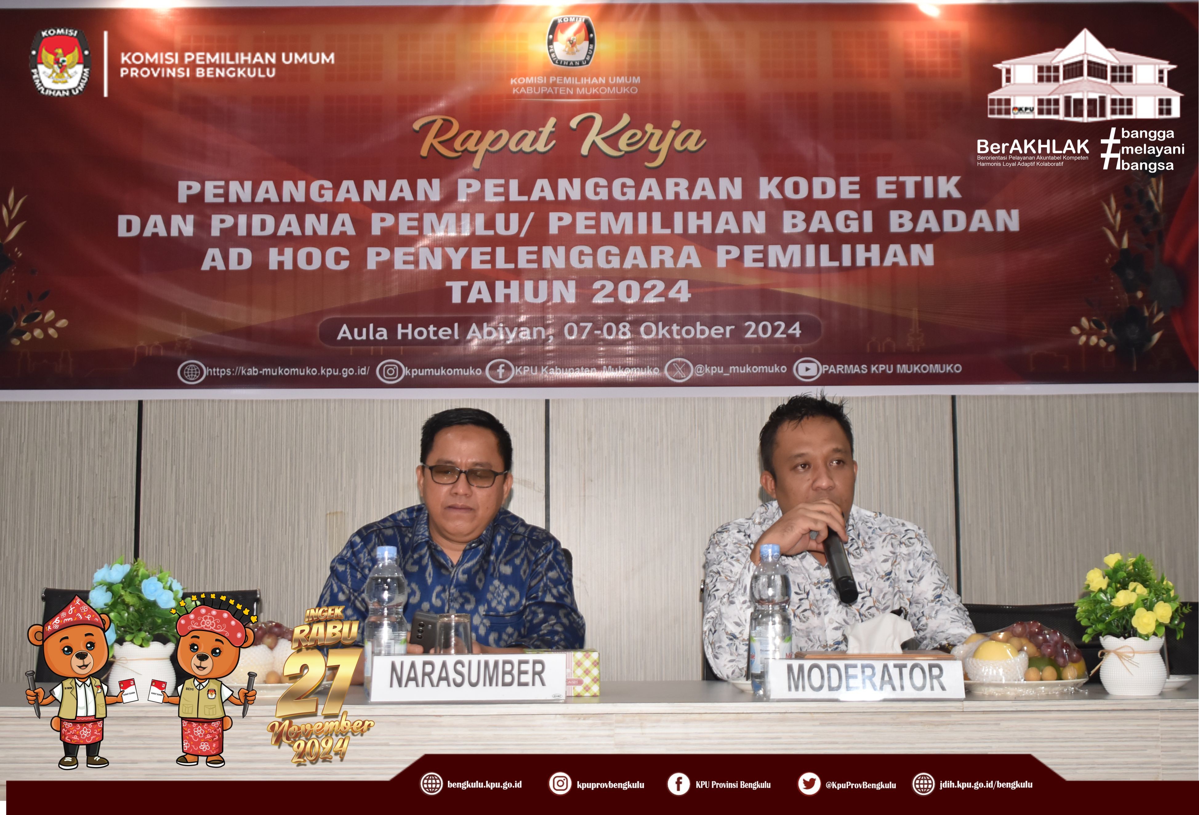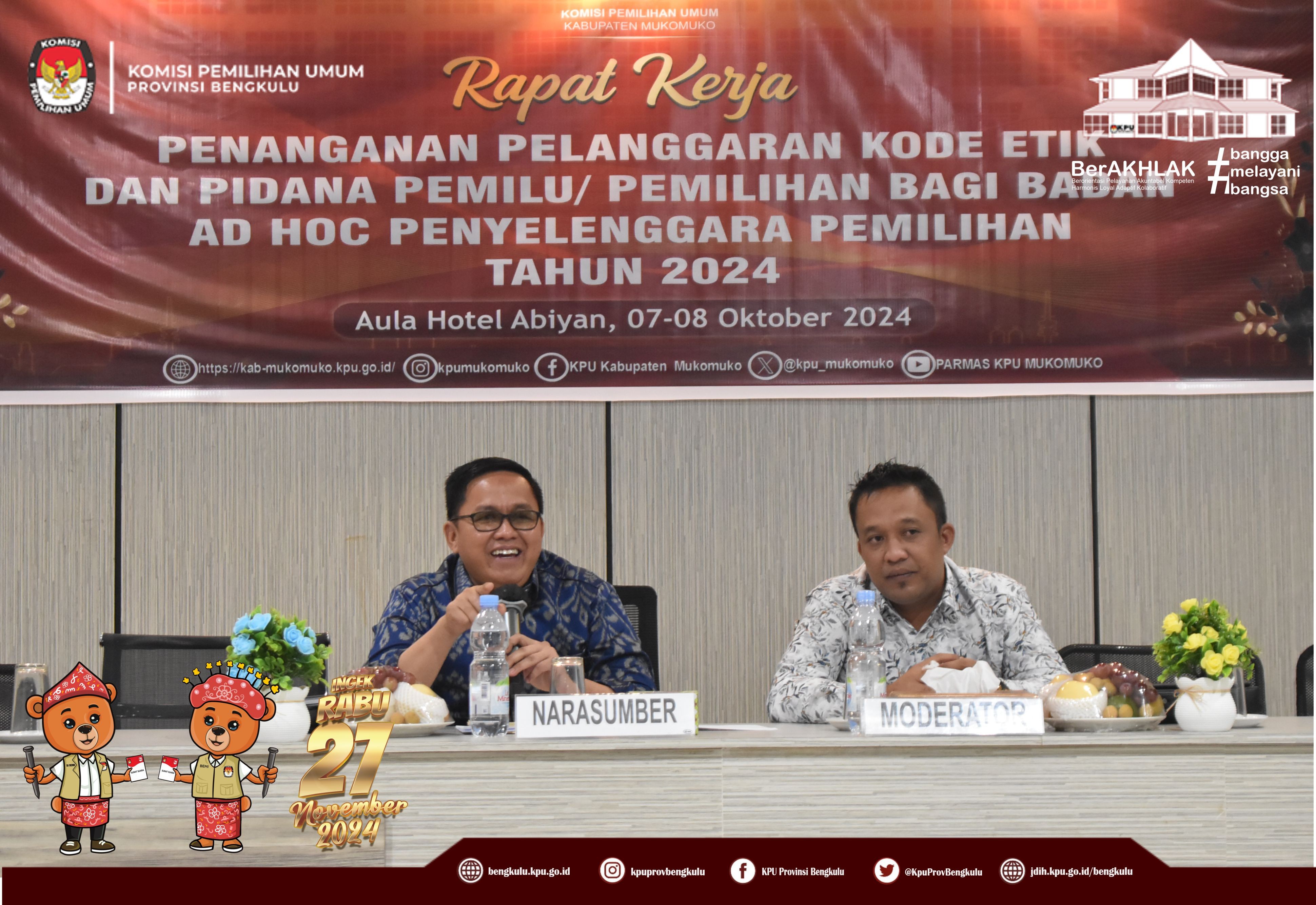 Bengkulu, bengkulu.kpu.go.id - Anggota KPU Provinsi Bengkulu Bapak Emex Verzoni memberikan arahan sekaligus narasumber dalam Rapat Kerja Penanganan Pelanggaran Kode Etik dan Pidana Pemilu/Pemilihan Bagi Badan Adhoc Penyelenggara Pemilihan Tahun 2024, Selasa (8/10/2024) di Hotel Abyan Mukomuko. Hadir Ketua KPU Kabupaten Mukomuko Marjono, Anggota KPU Kabupaten Mukomuko Efra Budiman, Endang Surya Bakti, Deni Setiabudi dan Misbahul Amri, serta PPK se-Kabupaten Mukomuko. Bapak Emex menjelaskan materi terkait Kode Etik Penyelenggara Pemilihan Dalam Pemilihan Serentak Tahun 2024 diantaranya kode etik sebagaimana diatur dalam regulasi, prinsip - prinsip penyelenggara pemilu/pemilihan, jenis-jenis pelanggaran serta sanksi bagi penyelenggara pemilihan. Kunci dalam bekerja ditegaskan Bapak Emex, penyelenggara pemilihan pada Pilkada Tahun 2024 harus bekerja secara profesional, menjaga integritas, soliditas, kolektif kolegial, melayani serta bebas dari perilaku Korupsi, Kolusi dan Nepotisme. Bapak Emex berharap pelaksanaan tahapan pilkada baik Gubernur dan Wakil Gubernur serta Bupati dan Wakil Bupati Tahun 2024 di Kabupaten Mukomuko berjalan aman lancar sukses dan tidak ada permasalahan yang berimbas pada kita selaku penyelenggara di kemudian hari.