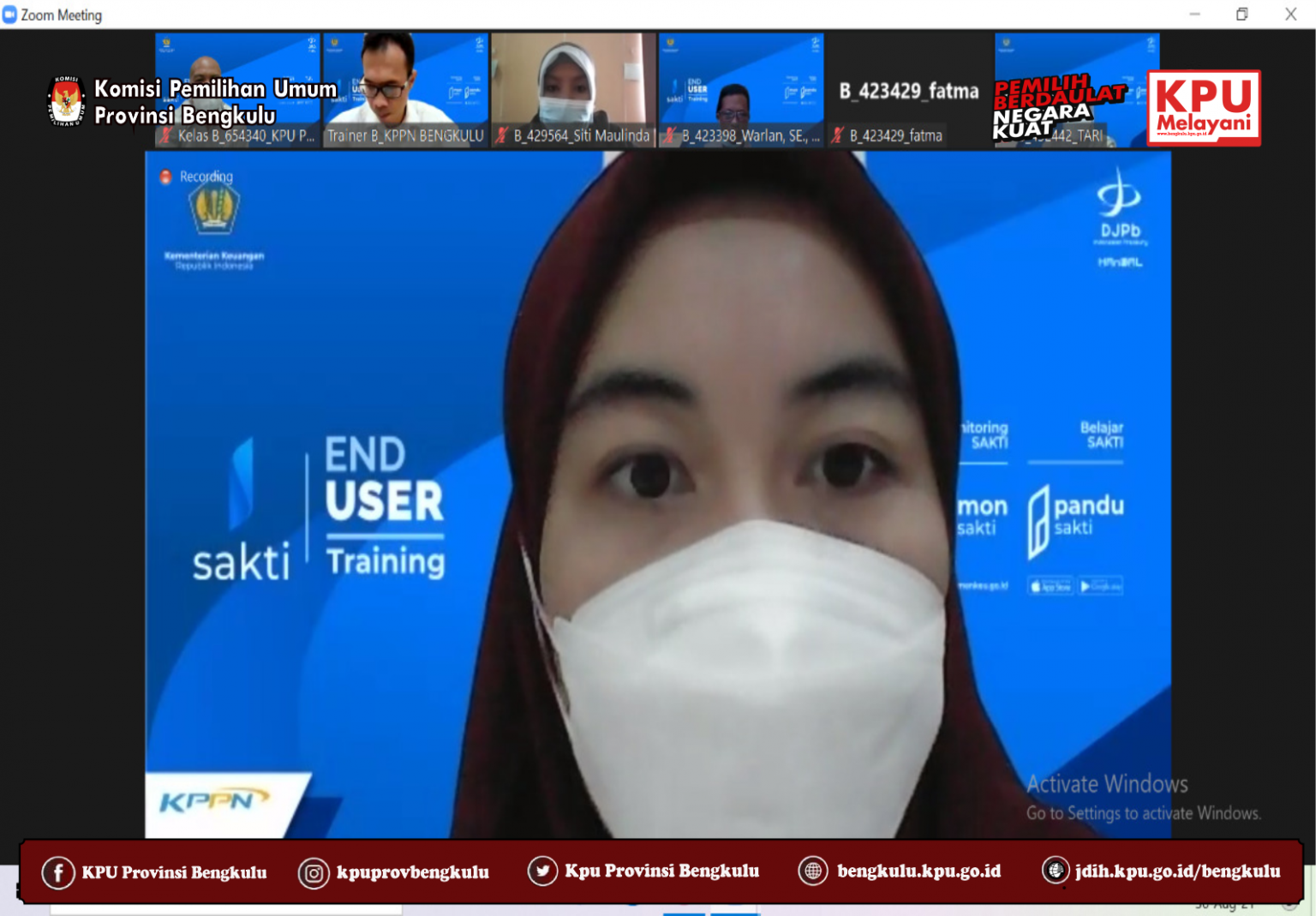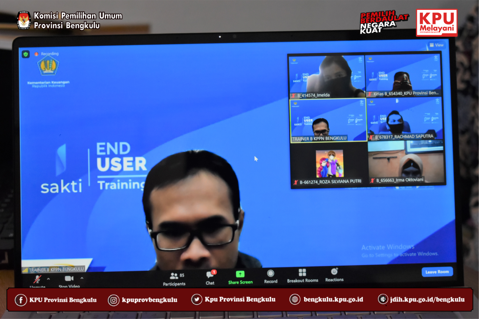 KPU Provinsi Bengkulu yang diwakili Kabag Keuangan Umum dan Logistik Sudirman, Kasubbag Keuangan M. Beni Eka Putra, Staf Keuangan dan Perencanaan mengikuti End User Training (EUT) Sistem Aplikasi Keuangan Tingkat Instansi (SAKTI) secara daring (zoom meeting) yang diselenggarakan oleh Kantor Pelayanan Perbendaharaan Negara (KPPN) Bengkulu dimulai dari 30 Agustus s.d 3 September 2021 untuk Modul Pelaksanaan. Penyampaian materi dan modul Pelaksanaan disampaikan langsung Narasumber dari KPPN Bengkulu.