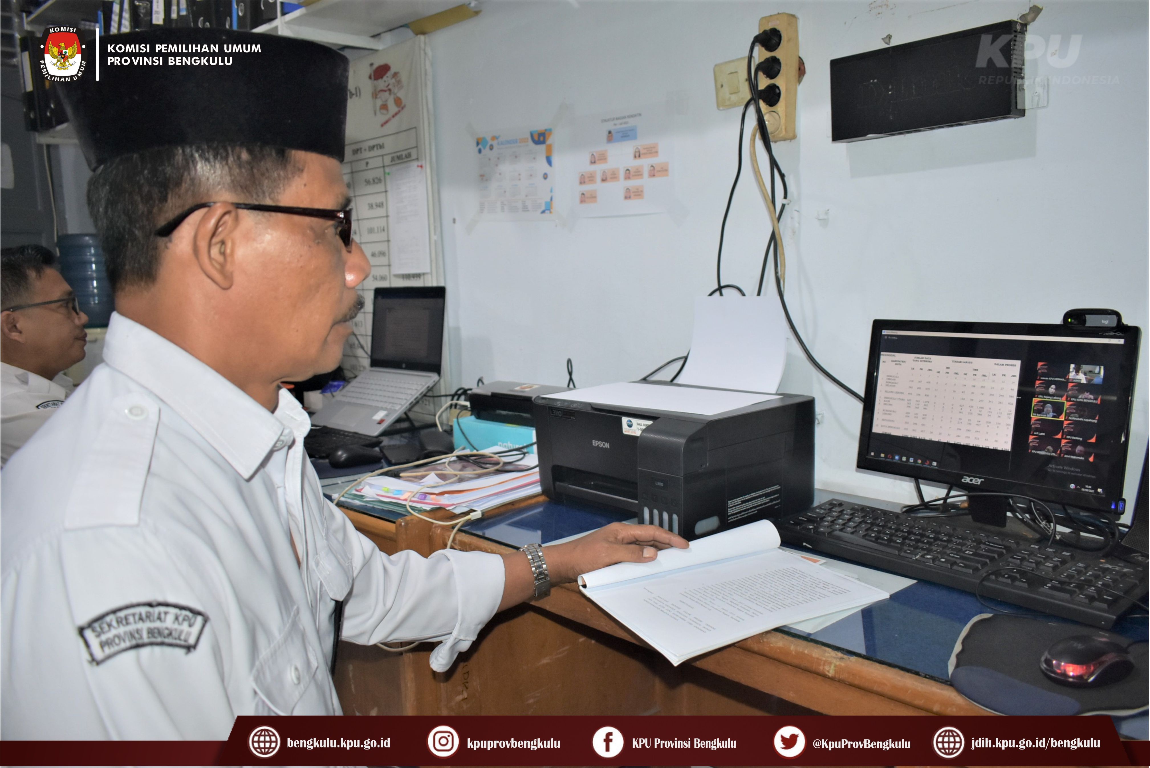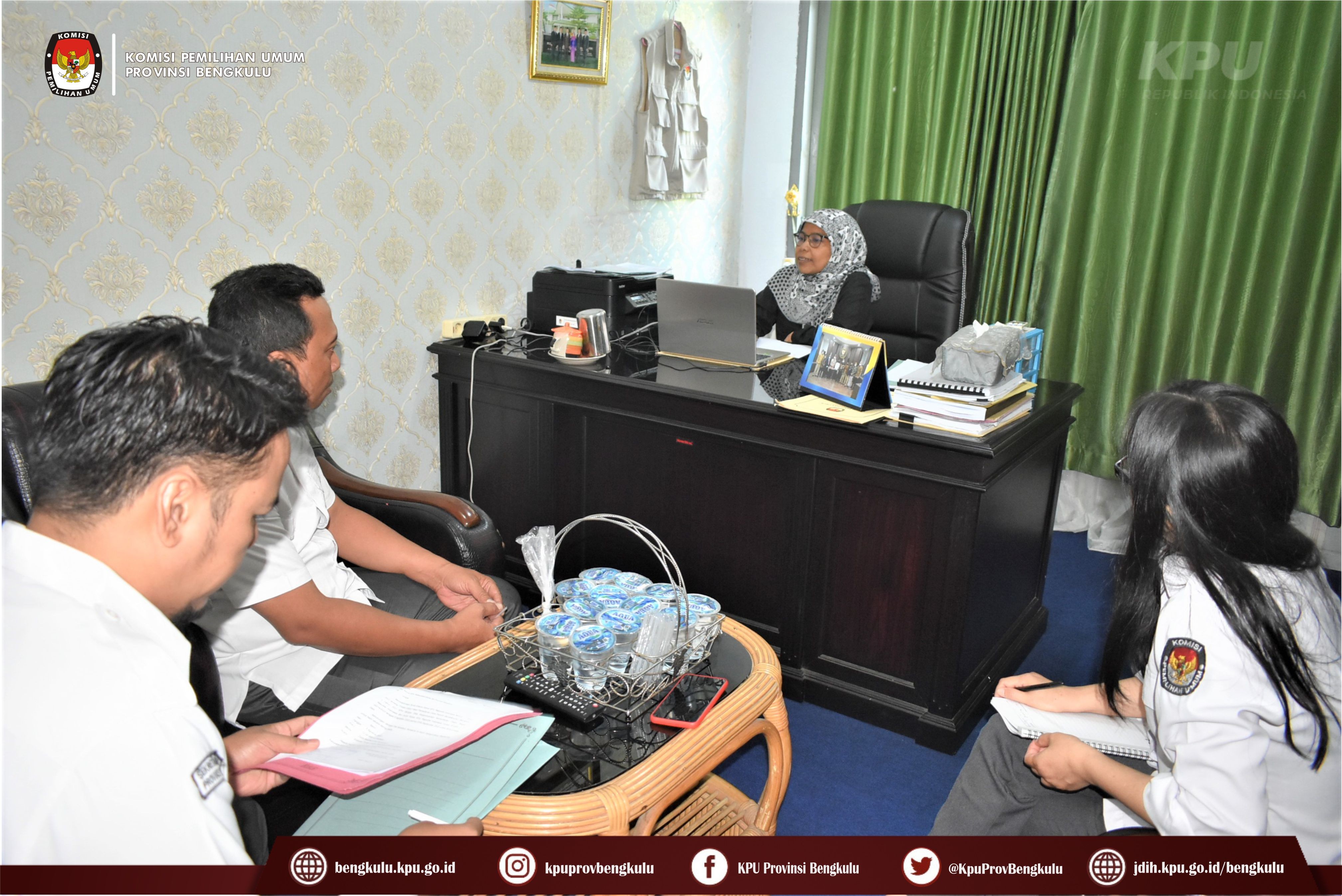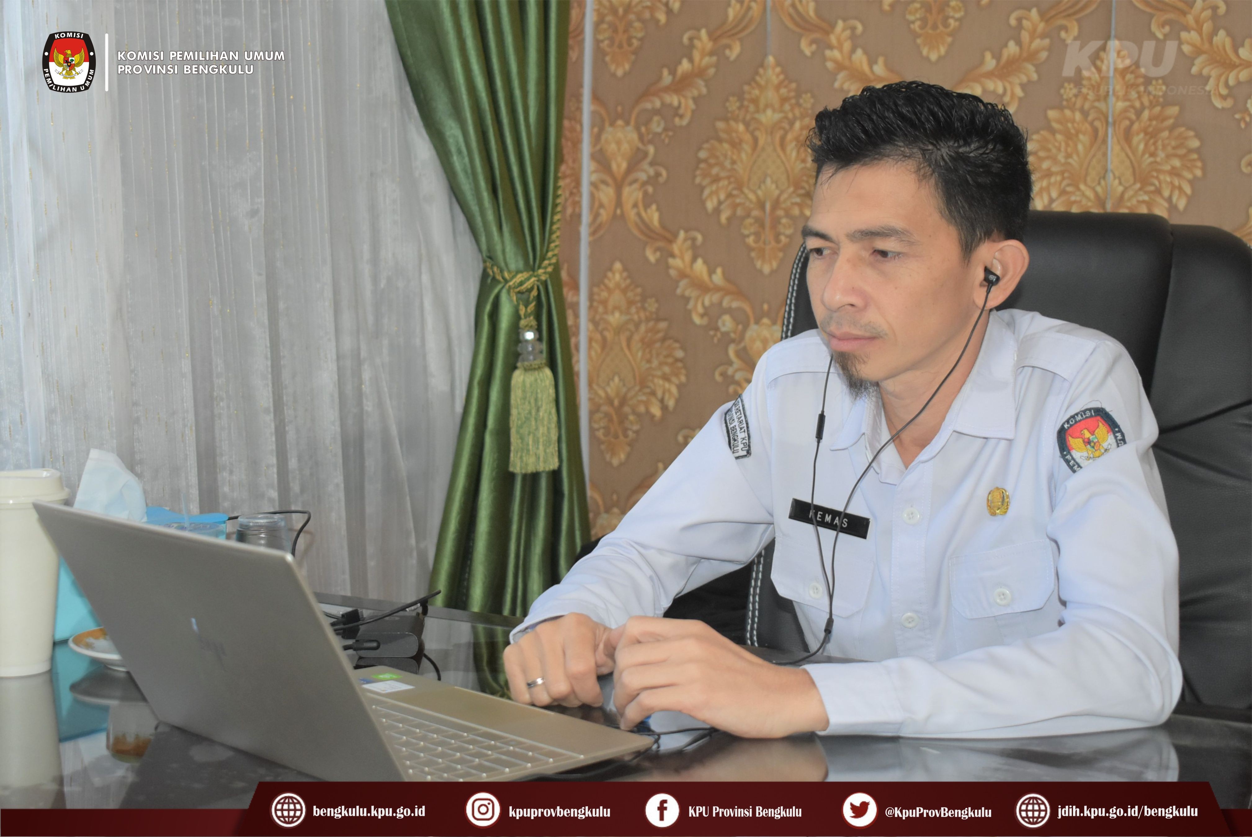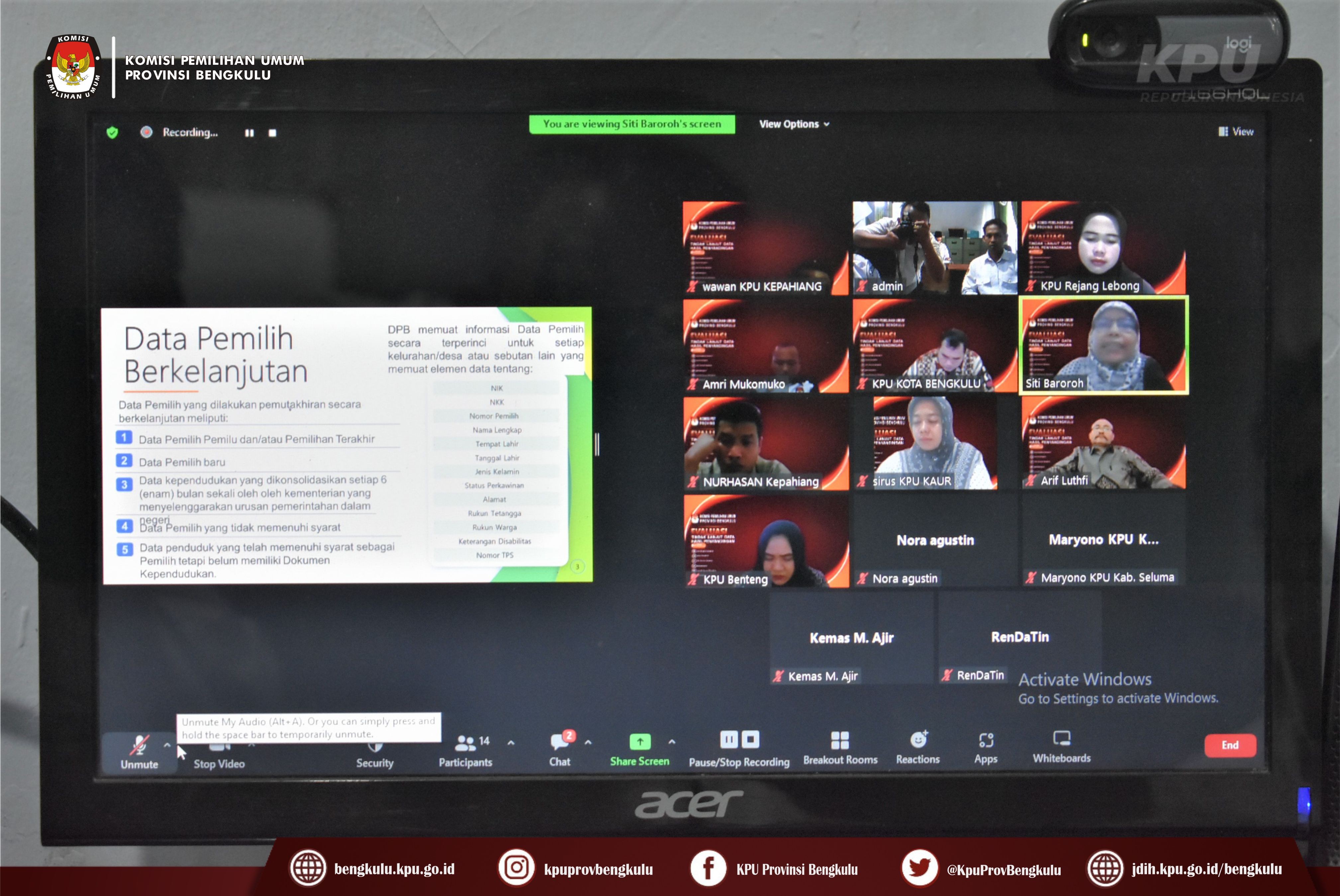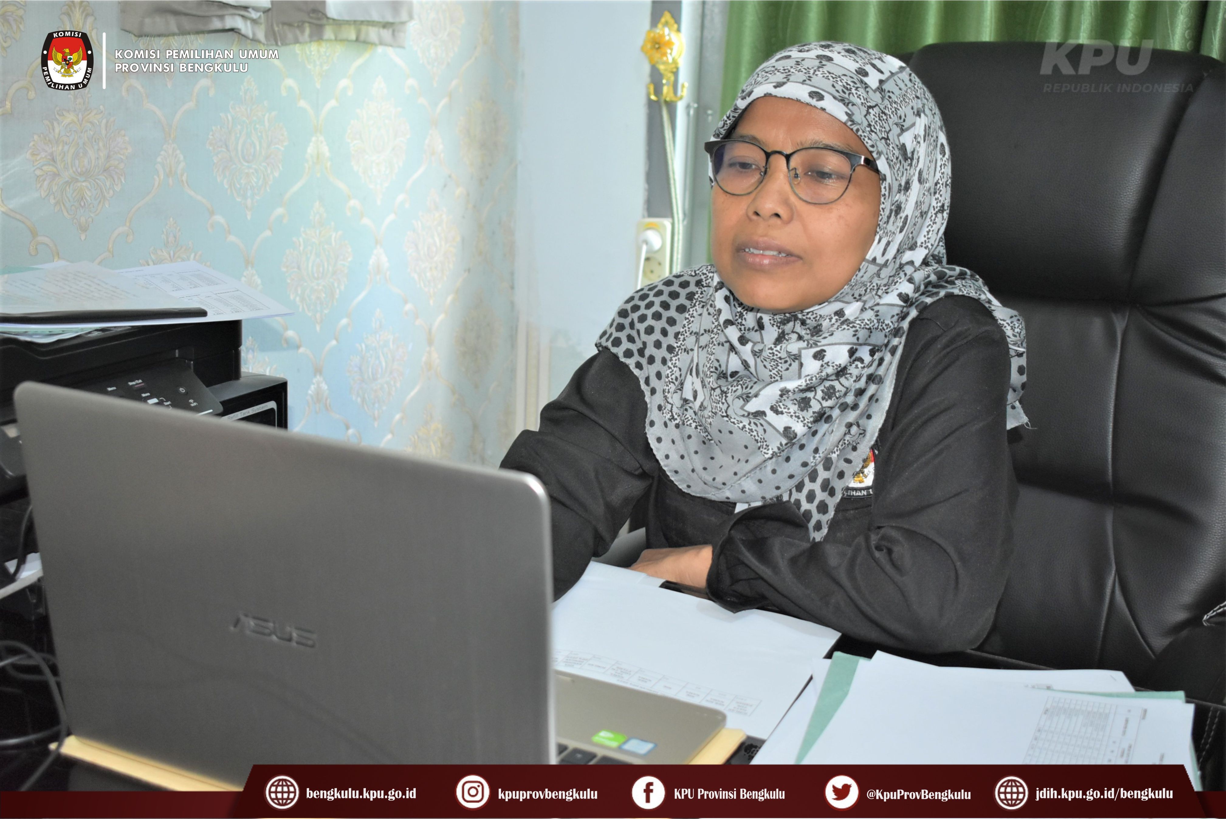 Bengkulu-bengkulu.kpu.go.id, Anggota KPU Provinsi Bengkulu Siti Baroroh didampingi Sekretaris KPU Provinsi Bengkulu Kemas Mohammad Ajir, Kabag Perencaan Data dan Informasi Hamzah, serta Kasubbag Data dan Informasi Yunita Dika Fitri melaksanakan Evaluasi Tindak Lanjut Data Hasil Penyandingan secara daring (zoom meeeting), Senin (7/8). Hadir dalam kegiatan tersebut Ketua Divisi Perencanaan Data dan Informasi KPU Kabupaten/Kota se-Provinsi Bengkulu.