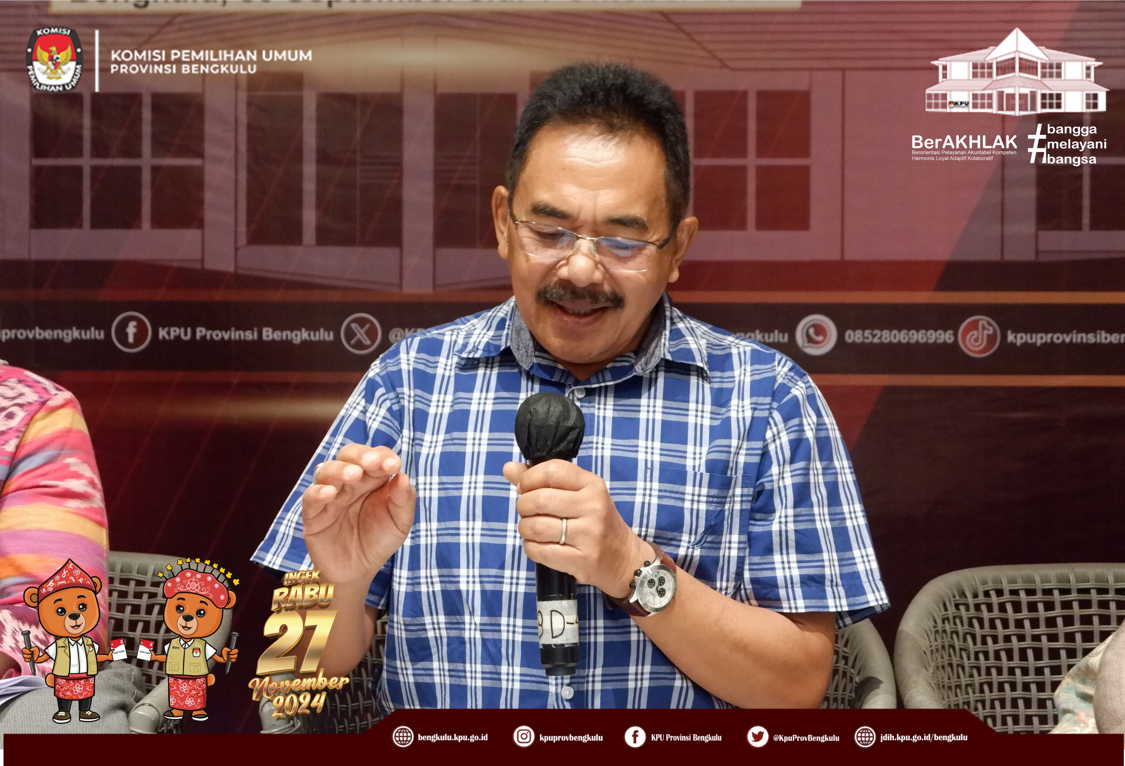 Bengkulu, bengkulu.kpu.go.id - Ketua KPU Provinsi Bengkulu Bapak Rusman Sudarsono, Anggota KPU Provinsi Bengkulu Bapak Alpin Samsen, bapak Dodi Hendra Supiarso, Bapak Emex Verzoni serta Sekretaris Kemas Mohammad Ajir membuka Focus Group Discussion (FGD) Penyusunan Laporan Evaluasi Pemilu Tahun 2024 KPU Provinsi Bengkulu dan KPU Kabupaten/Kota se-Provinsi Bengkulu, Senin (30/9/2024) di Hotel Mercure Bengkulu. Hadir Ketua, Ketua Divisi Perencanaan Data dan Informasi serta Kasubbag Perencanaan Data dan Informasi KPU Kabupaten/Kota se-Provinsi Bengkulu. Dalam FGD Penyusunan Laporan Evaluasi Pemilu Tahun 2024 menghadirkan narasumber dari Akademisi, yaitu Bapak DR. Arie Elcaputra, Ibu Sa'adah Madliyati, S.Ag.,M.A, dan Prof. DR. Priyono Prawito, Anggota KPU Provinsi Bengkulu Periode 2013-2018 dan Periode 2018-2023 Ibu Siti Baroroh, M.Si dan Tenaga Ahli KPU RI Bapak Nanang Indra Suyitno serta Bapak Ilham Kurniawan Ardi.