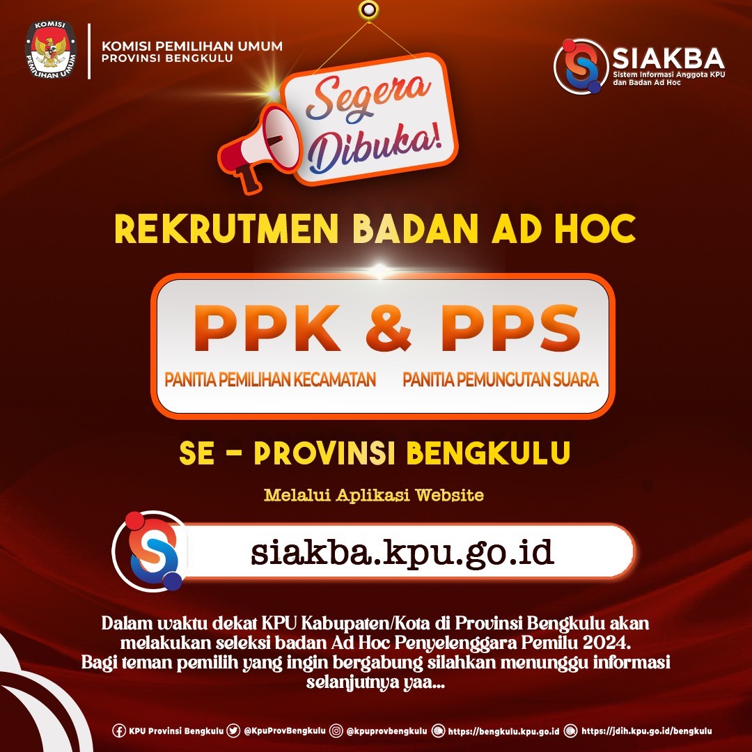 Bengkulu-bengkulu.kpu.go.id, Segera dibuka Rekrutmen Badan Ad Hoc, Panitia Pemilihan Kecamatan (PPK) dan Panitia Pemungutan Suara (PPS) Se-Provinsi Bengkulu melalui Aplikasi Sistem Informasi Anggota KPU dan Badan Ad Hoc (SIAKBA) pada link https://siakba.kpu.go.id/. Dalam waktu dekat KPU Kabupaten/Kota di Provinsi Bengkulu melakukan Seleksi Badan Ad Hoc Penyelenggara Pemilu 2024. Bagi Teman Pemilih yang ingin bergabung silahkan menunggu informasi selanjutnya ya!!
