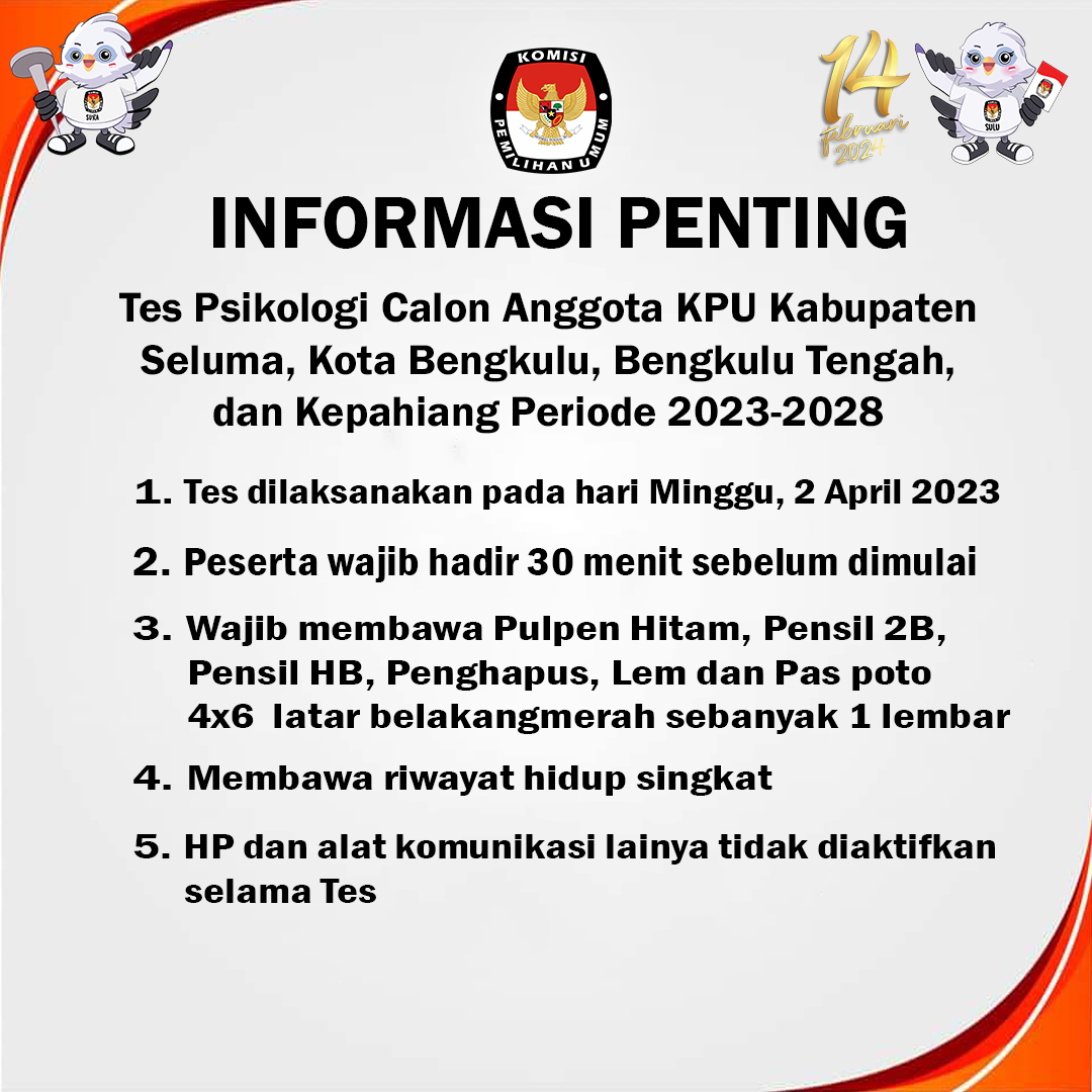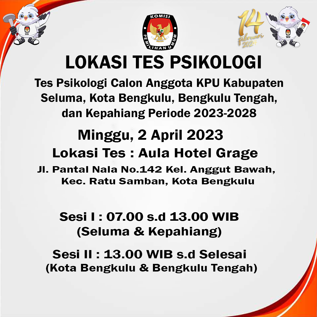 JADWAL PELAKSANAAN TES PSIKOLOGI CALON ANGGOTA KPU KABUPATEN SELUMA, KOTA BENGKULU, BENGKULU TENGAH DAN KEPAHIANG PERIODE 2023-2028