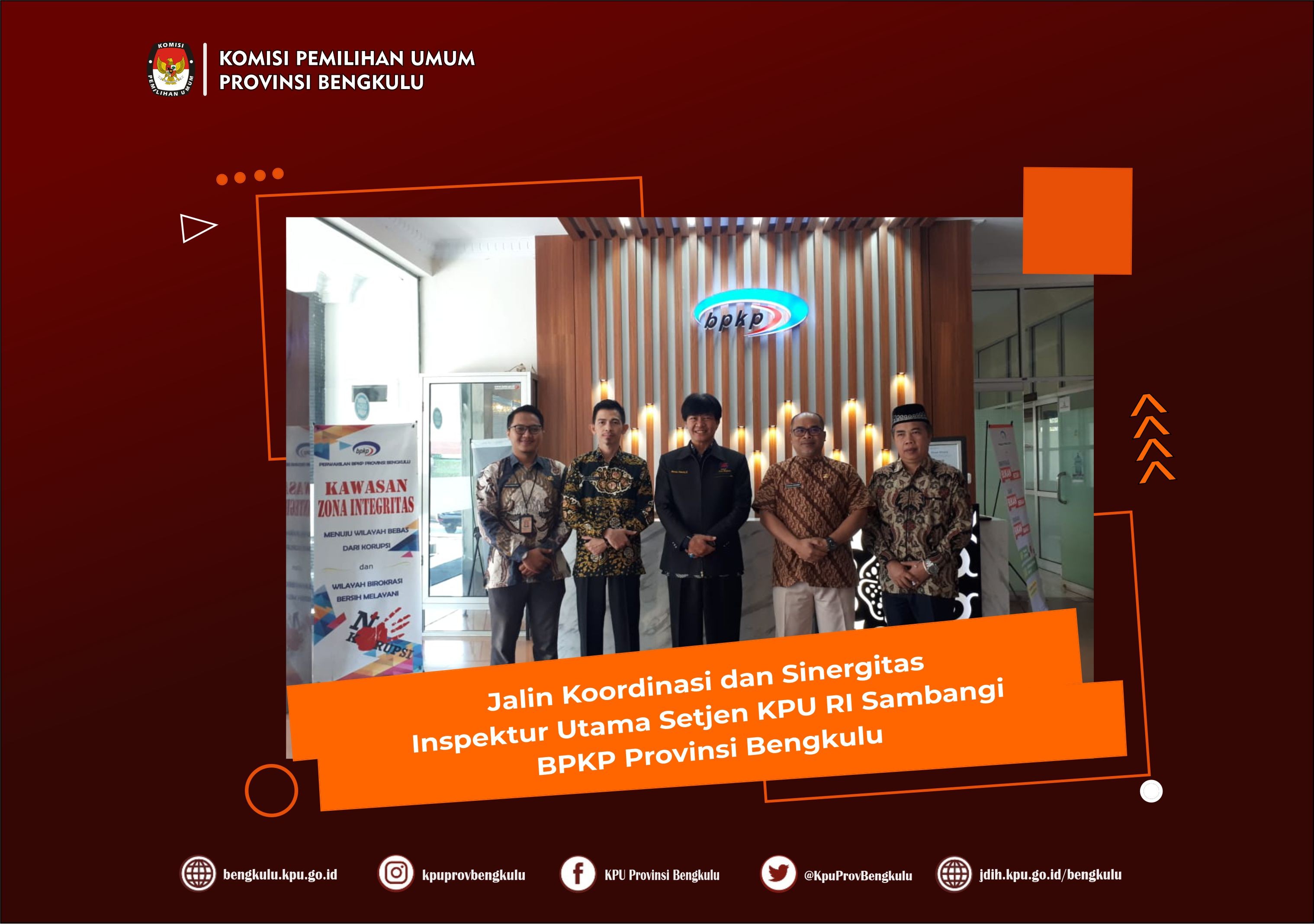 Bengkulu-bengkulu.kpu.go.id, Inspektur Utama Setjen KPU RI Bapak Nanang Priyatna didampingi Sekretaris KPU Provinsi Bengkulu Kemas M Ajir dan Kabag Keuangan Umum dan Logistik Sudirman mengunjungi BPKP Perwakilan Provinsi Bengkulu, Jum'at (17/6). Kedatangan jajaran KPU disambut hangat Kepala BPKP Perwakilan Provinsi Bengkulu Bapak Iskandar Novianto dan jajarannya. Nanang menyampaikan bahwa kedatangan KPU ke BPKP Perwakilan Provinsi Bengkulu dalam rangka memperkuat kerjasama dan sinergitas guna menghadapi Tahapan Penyelenggaraan Pemilu Serentak Tahun 2024 yang telah dimulai pada 14 Juni 2022 yang lalu. Sementara itu, Iskandar menyambut baik dan siap bekerjasama dalam rangka memperkuat sinergitas dalam pengawasan pengelolaan keuangan selama penyelenggaraan pemilu serentak 2024 nantinya.