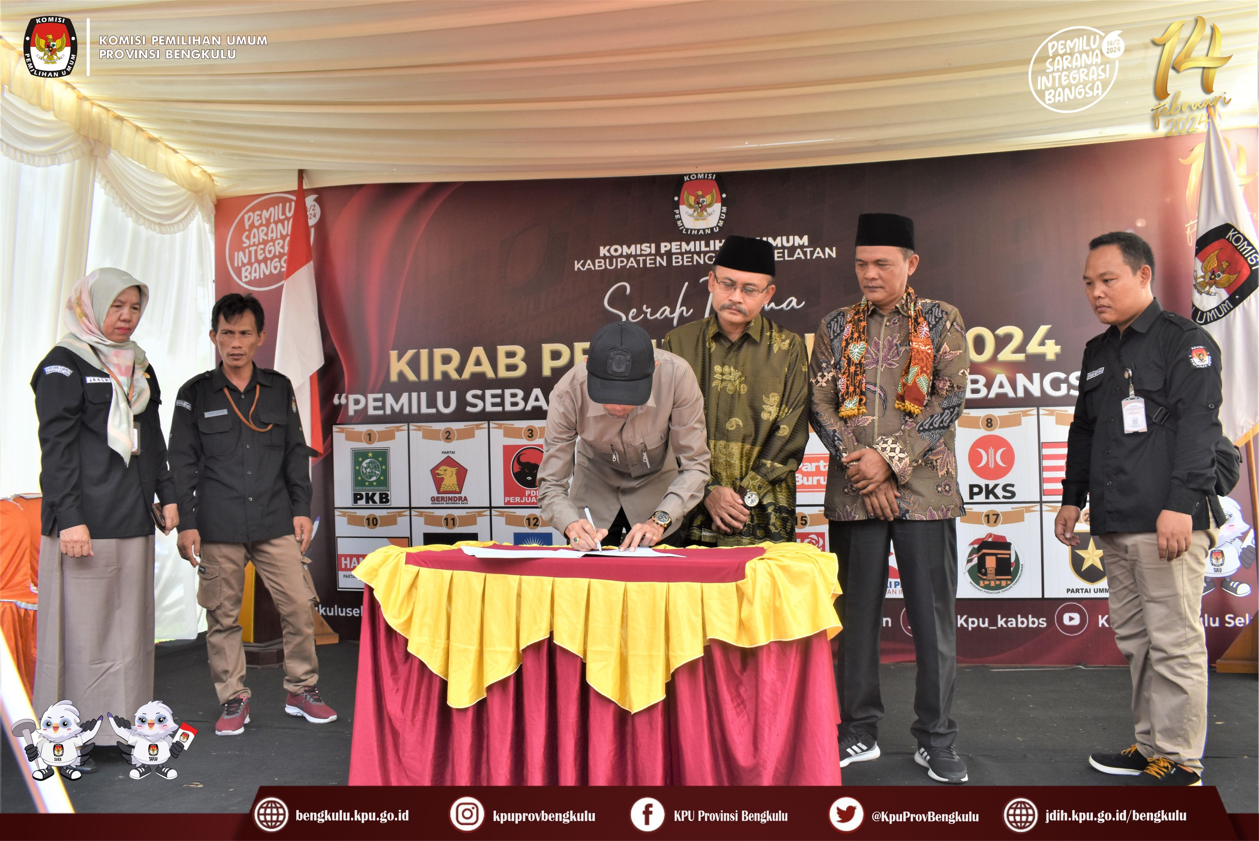 Bengkulu, bengkulu.kpu.go.id - Ketua dan Anggota KPU Provinsi Bengkulu hadir pada Serah Terima Kirab Pemilu 2024 dari KPU Kabupaten Seluma kepada KPU Kabupaten Bengkulu Selatan, Rabu (30/8/2023) di Halaman Kantor KPU Kabupaten Bengkulu Selatan. Hadir dalam serah terima kirab adalah Bupati, Forkopimda, Ketua dan Anggota KPU Kabupaten Seluma dan KPU Kabupaten Bengkulu Selatan, PPK dan PPS se-Kabupaten Bengkulu Selatan. Rangkaian acara dibuka dengan menyanyikan Lagu Kebangsaan Indonesia Raya, Sambutan Ketua KPU Kabupaten Seluma dan Bengkulu Selatan, Bupati Bengkulu Selatan, dan Ketua KPU Provinsi Bengkulu Rusman Sudarsono, Pembacaan dan Penandatanganan Deklarasi Pemilu Sebagai Sarana Integrasi Bangsa, Penandatanganan berita acara serah terima kirab, penyerahan Maskot Pemilu 2024, dan ditutup foto bersama dan Pelepasan Kirab Pemilu 2024 di KPU Kabupaten Bengkulu Selatan oleh Anggota KPU Provinsi Bengkulu Dodi Hendra Supiarso.