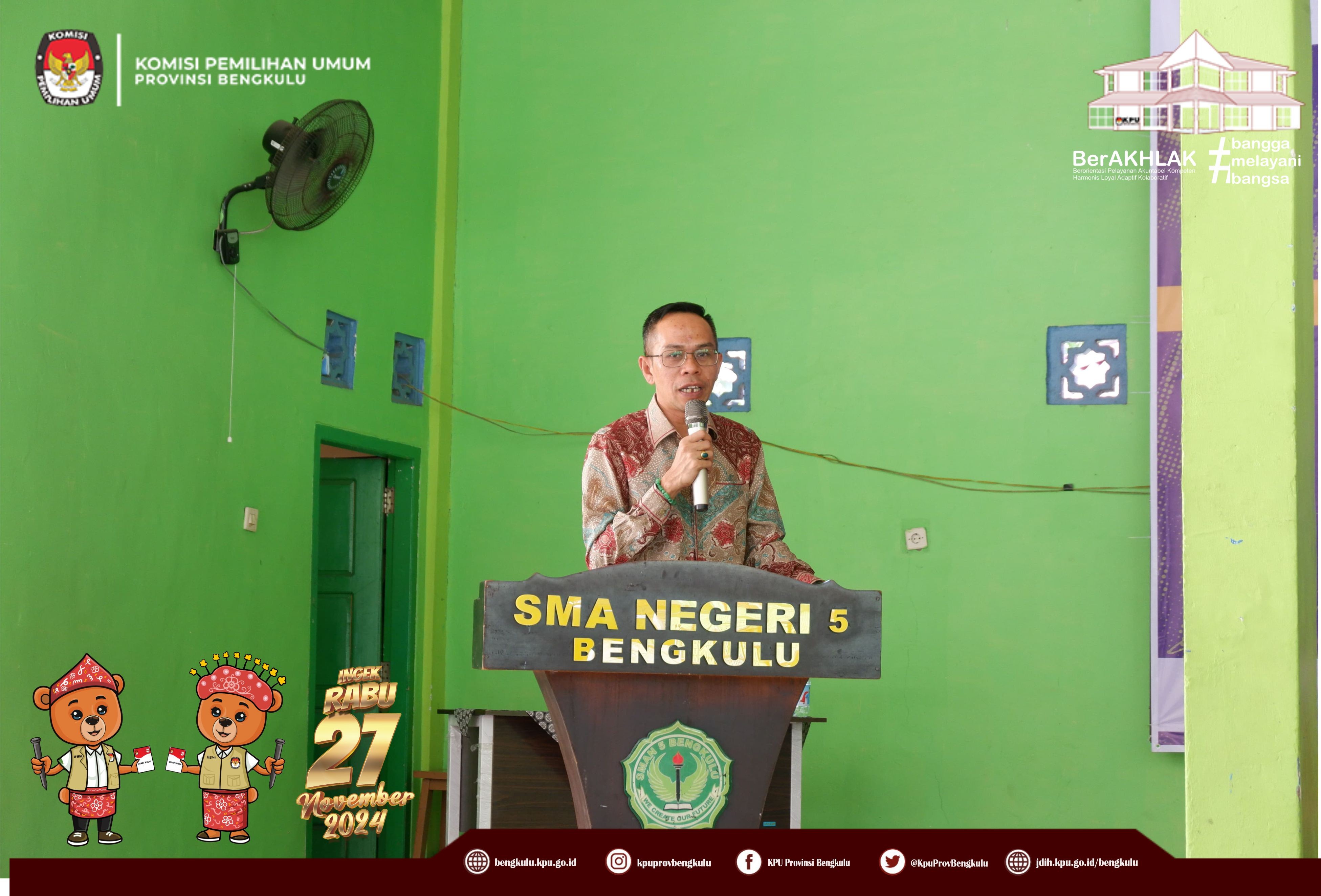 Bengkulu, bengkulu.kpu.go.id - Ketua KPU Provinsi Bengkulu Bapak Rusman Sudarsono hadir dalam Kegiatan Sekolah Kebangsaan dengan Tema Literasi Digital Bagi Pemilih Pemula Menyongsong Pilkada Tahun 2024 yang diselenggarakan Japelidi Bengkulu, Kamis (24/10/2024) di SMA Negeri 5 Kota Bengkulu. Hadir dalam kegiatan Pengurus Japelidi Bengkulu, Wakil Kepala SMA Negeri 5 Kota Bengkulu dan Siswa-Siswi SMA Negeri 5 Kota Bengkulu. Dalam sambutannya Bapak Rusman menyampaikan bahwa kegiatan adalah bentuk sosialisasi / pendidikan pemilih dengan sasaran pemilih pemula tingkat pelajar SMA sederajat dengan tujuan mengajak seluruh pemilih pemula untuk berpartisipasi aktif pada Pemilihan Gubernur dan Wakil Gubernur, Bupati dan Wakil Bupati serta Walikota dan Wakil Walikota Tahun 2024 di Provinsi Bengkulu dengan cara Gunakan Hak Pilihmu pada Rabu 27 November 2024, tidak golput dan Pastikan terdaftar sebagai pemilih dapat di cek pada link https://cekdptonline.kpu.go.id/ .