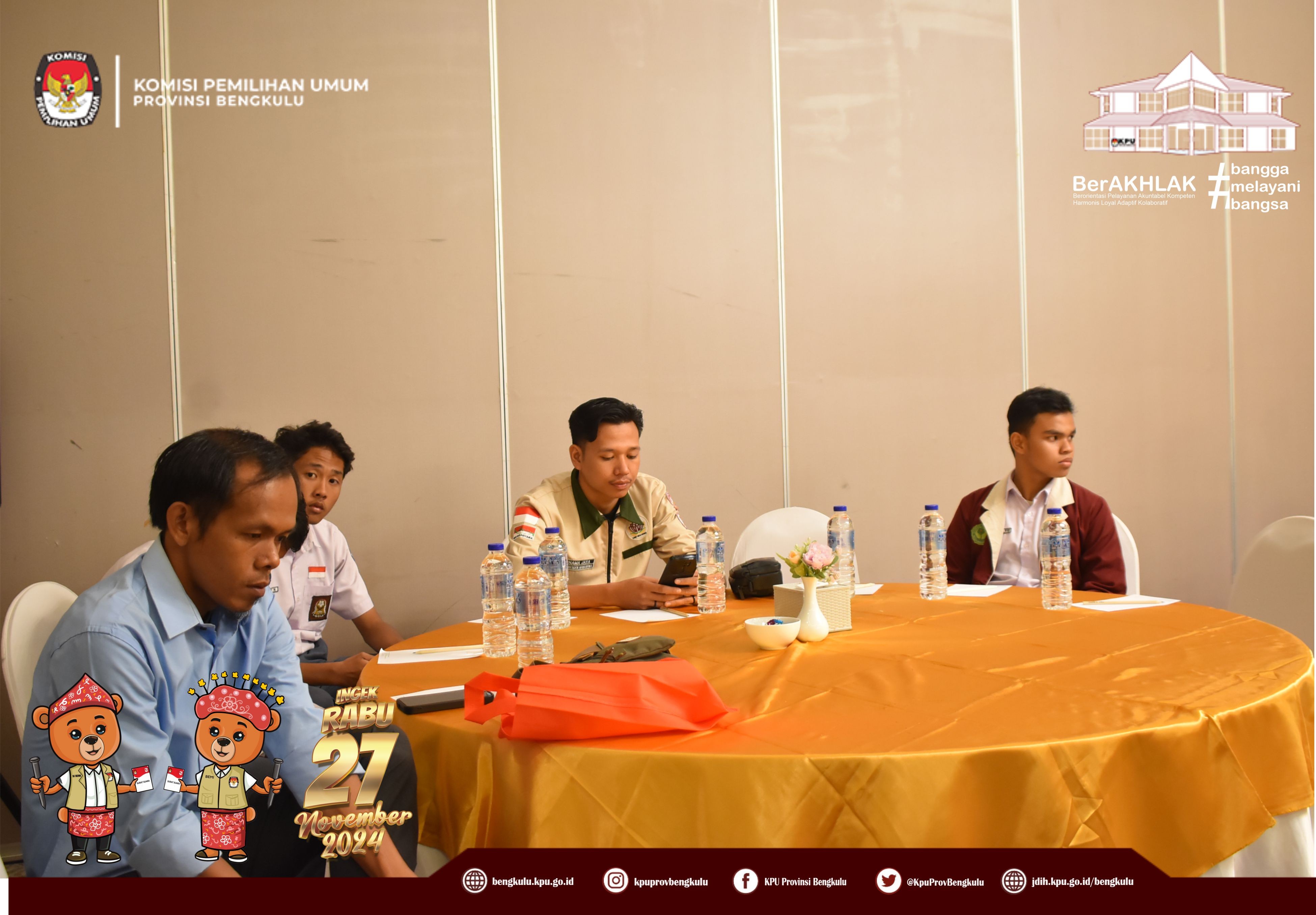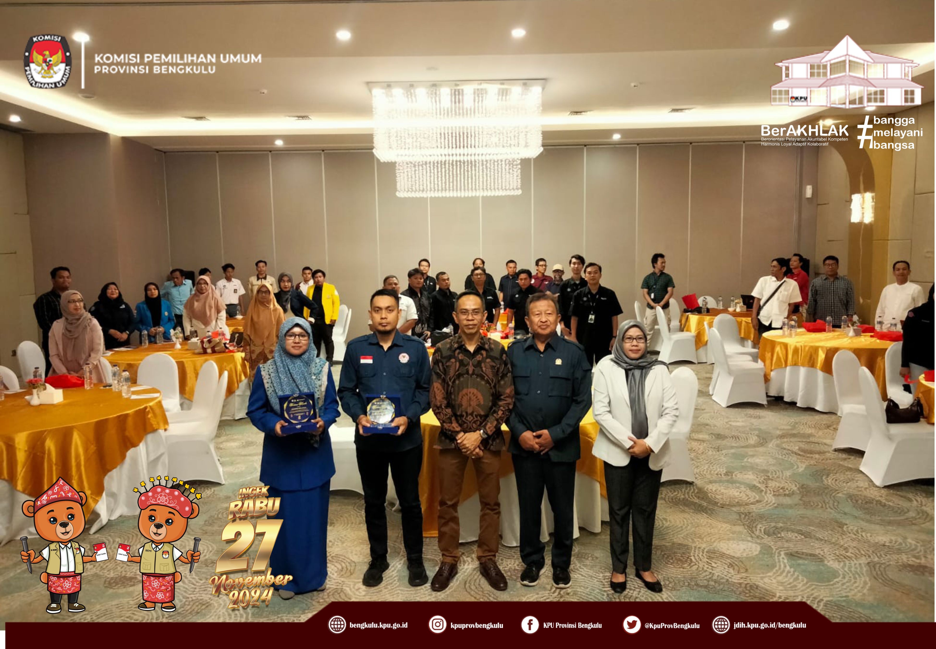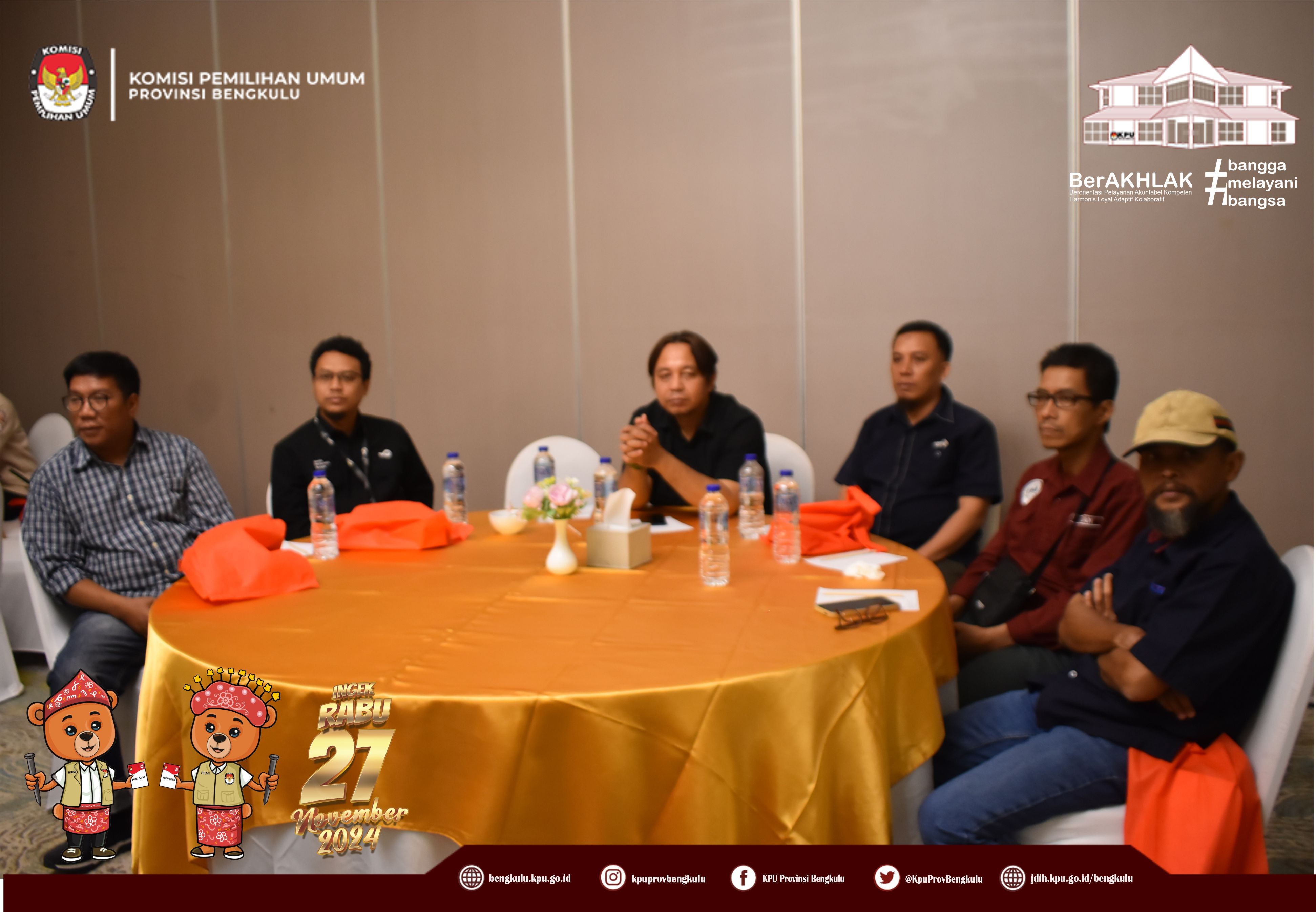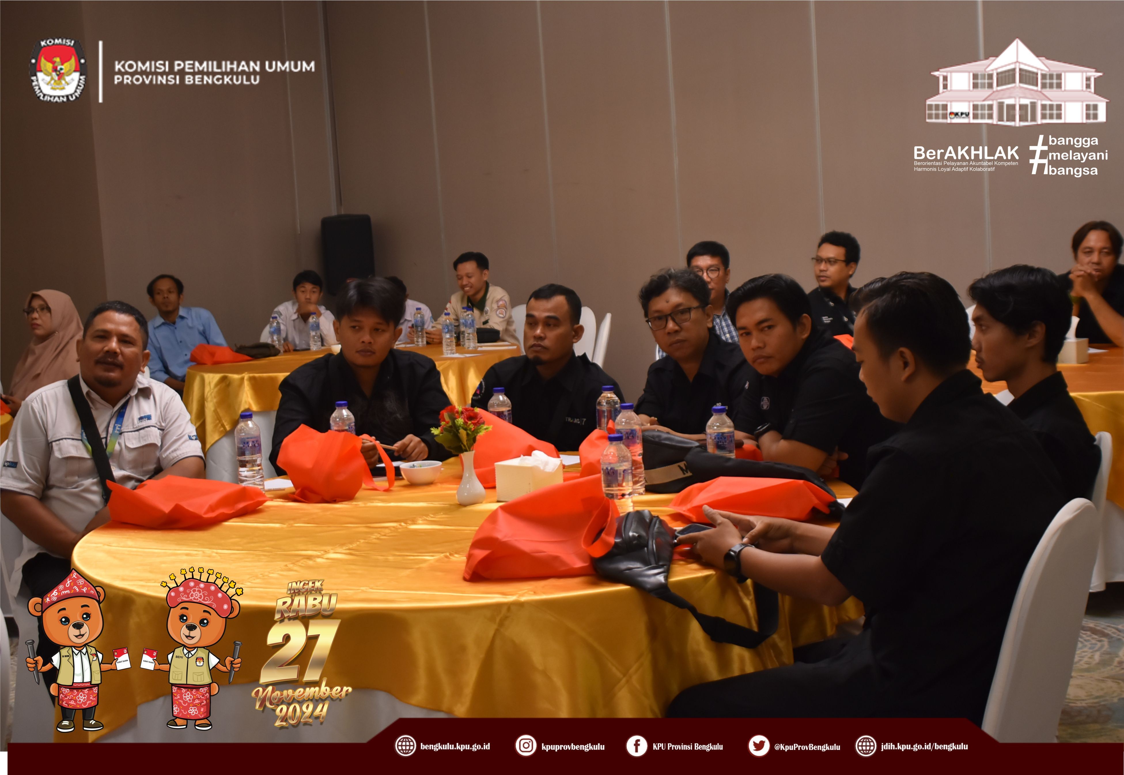 Bengkulu, bengkulu.kpu.go.id - Ketua KPU Provinsi Bengkulu Bapak Rusman Sudarsono hadir sekaligus membuka Sosialisasi Pilkada yang Baik, Bersih, dan Berintegritas Tanpa Hoax yang diselenggarakan KPID Provinsi Bengkulu, Senin (28/10/2024) di Two K Azana Style Hotel Bengkulu. Hadir Ketua dan Anggota KPID Provinsi Bengkulu,Insan Media Massa Cetak, Media Massa Elektronik, Pelajar, Konten Kreator, Youtuber, Penggiat Media Sosial dan sebagainya. Bapak Rusman menyampaikan apresiasi kepada KPID Bengkulu yang telah melaksanakan sosialisasi ini karena secara langsung membantu KPU Provinsi Bengkulu dalam rangka mengajak masyarakat berpartisipasi pada Pemilihan Serentak Tahun 2024. Selain itu, Bapak Kemas menegaskan KPU Provinsi Bengkulu berkomitmen melaksanakan Pemilihan Serentak Tahun 2024 dengan bertanggung jawan dan berintegritas dan segenap jajaran KPU Provinsi dan KPU Kabupaten/Kota melaksanakan tahapan secara profesional dan melayani. Tentunya pelaksanaan pemilihan dapat berjalan aman, lancar dan kondusif jika semua pihak bersatu saling mendukung satu sama sehingga tercipta pemilihan yang berkualitas dan partisipatif. Sementara itu, Ketua KPID Bengkulu Albertce Rolando Thomas menyampaikan bahwa sosialisasi ini dalah bentuk nyata komitmen KPID Bengkulu mendukung penuh KPU Provinsi Bengkulu untuk menyukseskan Pemilihan Serentak Tahun 2024 dengan harapan masyarakat datang pada Rabu 27 November 2024 datang ke TPS menggunakan hak pilinya.