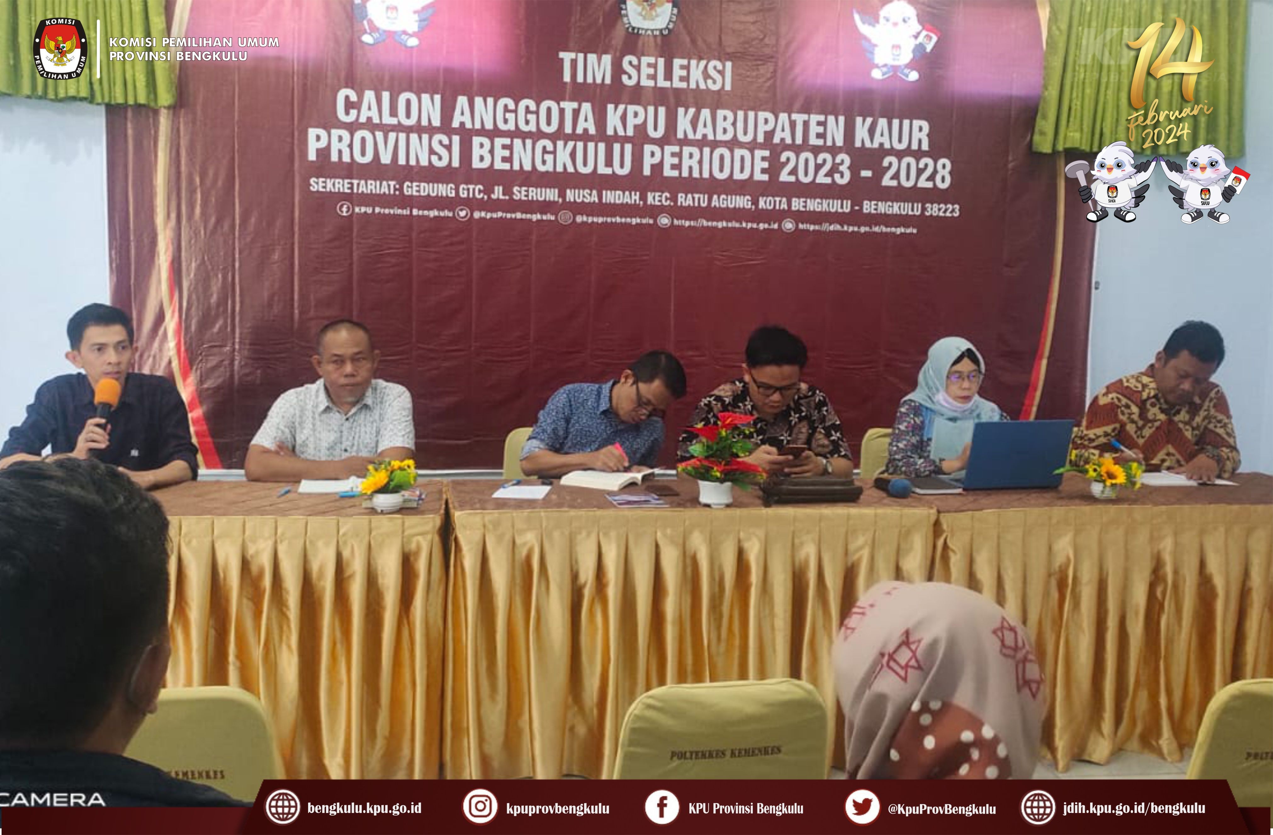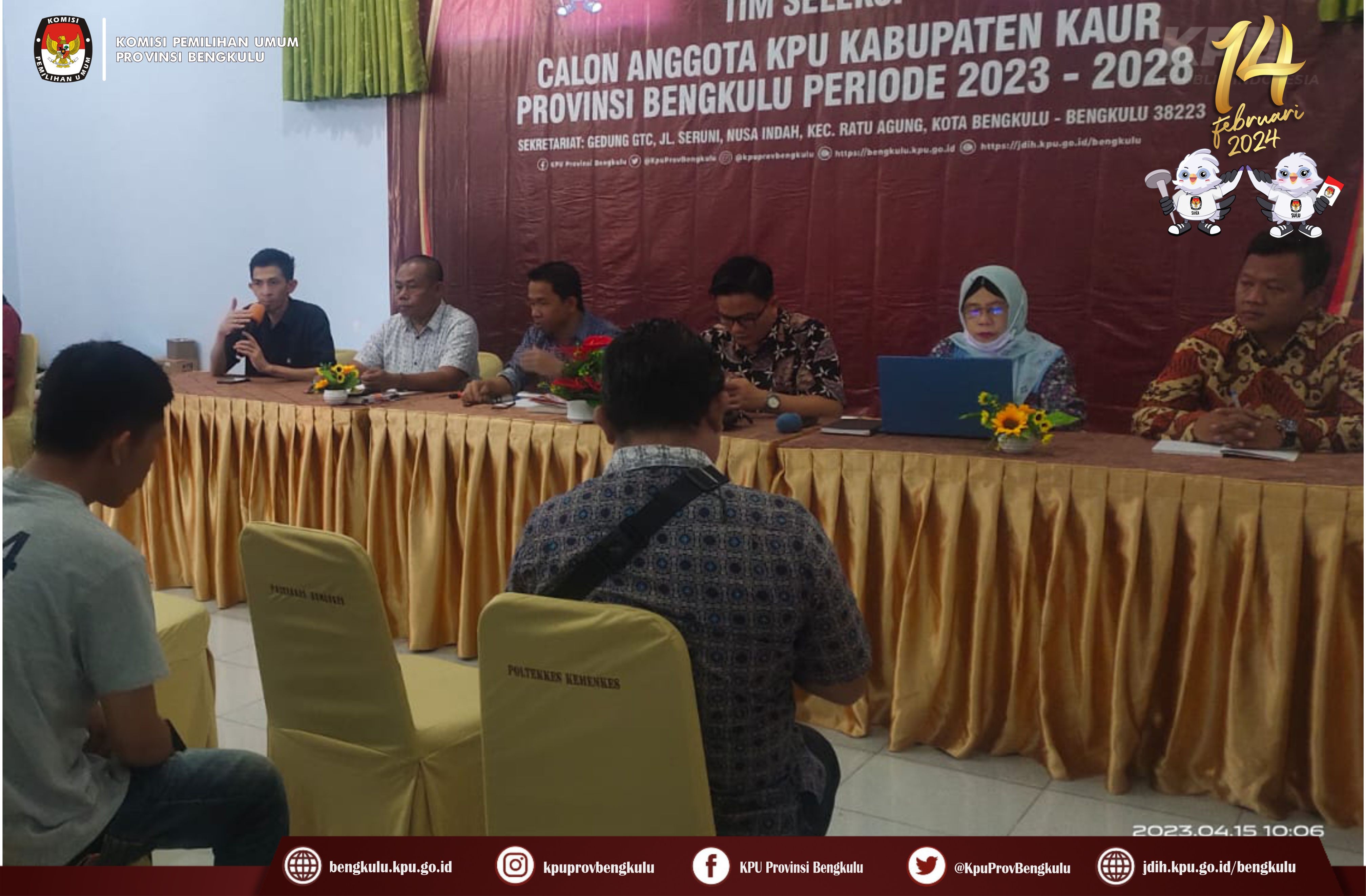 Bengkulu-bengkulu.kpu.go.id, Ketua Tim Seleksi Anggota KPU Kabupaten Kaur Provinsi Bengkulu Periode 2023-2028 Firnandes Maurisya didampingi Sekretaris Suryani, Anggota Hexa Primaputra, Pasmah Chandra dan Wahyu Prasetyo serta Sekretaris KPU Provinsi Bengkulu Kemas Mohammad Ajir menggelar Konferensi Pers dalam rangka Pendaftaran dan Penggunaan SIAKBA pada Seleksi Anggota KPU Kabupaten Kaur Provinsi Bengkulu Periode 2023-2028 di Gedung GTC Polkeslu Jl. Seruni Nusa Indah, Sabtu (15/4/2023).
