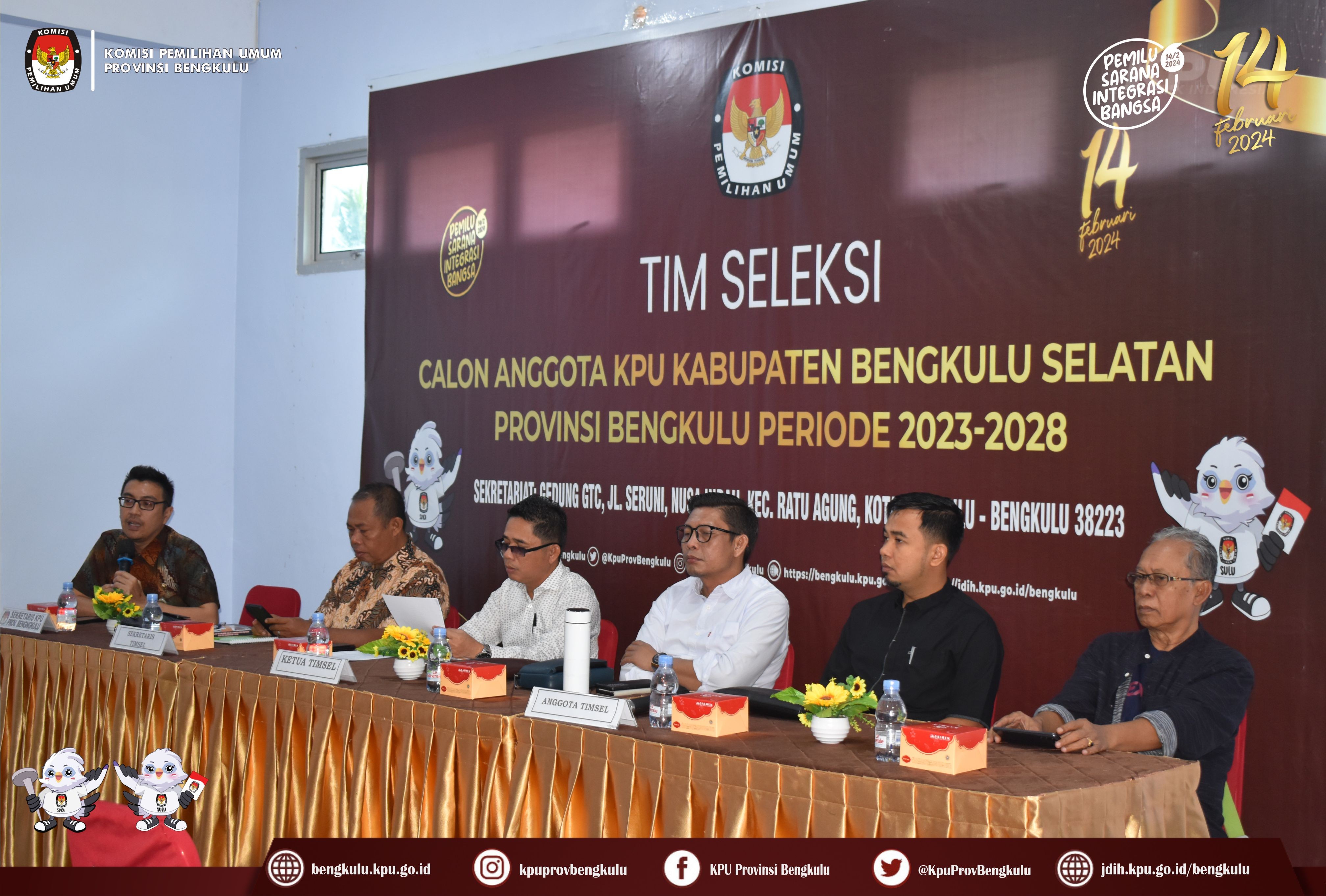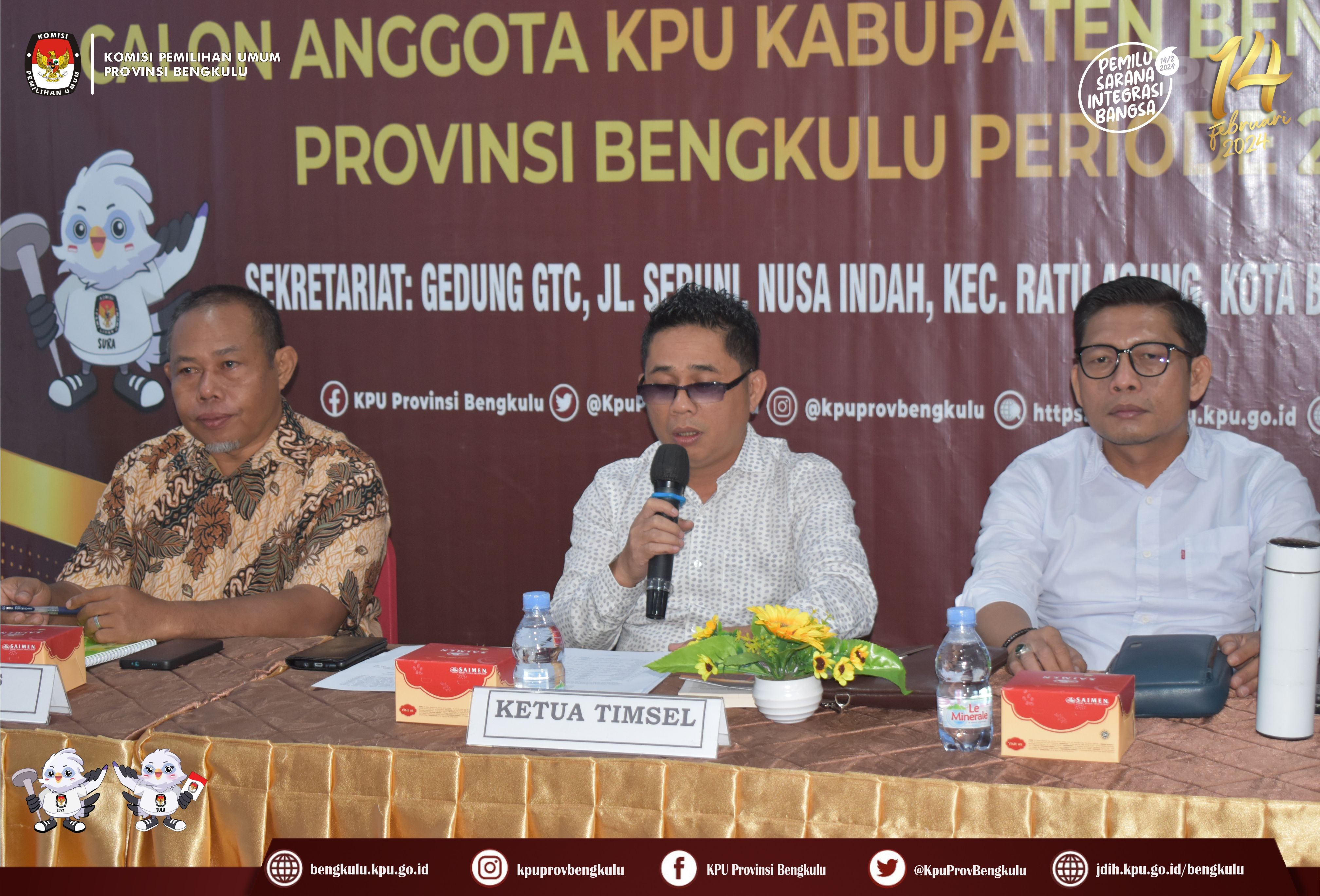Bengkulu, bengkulu.kpu.go.id - Ketua Tim Seleksi Anggota KPU Kabupaten Bengkulu Selatan Provinsi Bengkulu Periode 2023-2028 Elfahmi Lubis didampingi Sekretaris Hexa Prima Putra, Anggota Armin Tedy, Heri Supriyanto dan Fathan Fauzi serta Kasubbag Hukum dan SDM KPU Provinsi Bengkulu Hafiz Umar menggelar Konferensi Pers dalam rangka Pendaftaran dan Penggunaan SIAKBA pada Seleksi Anggota KPU Kabupaten Bengkulu Selatan Provinsi Bengkulu Periode 2023-2028 di Gedung GTC Polkeslu Jl. Seruni Nusa Indah, Jum'at (1/9/2023).