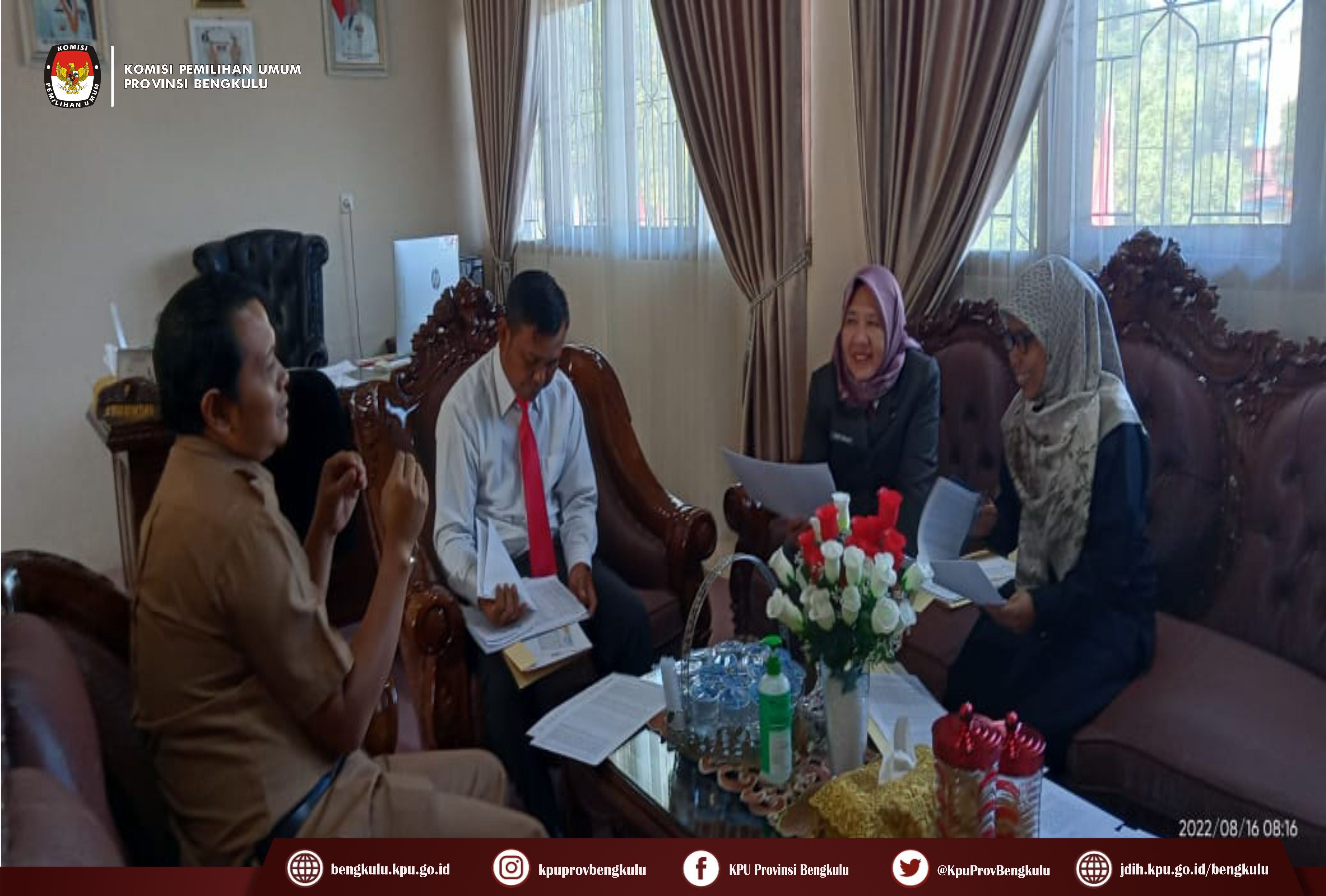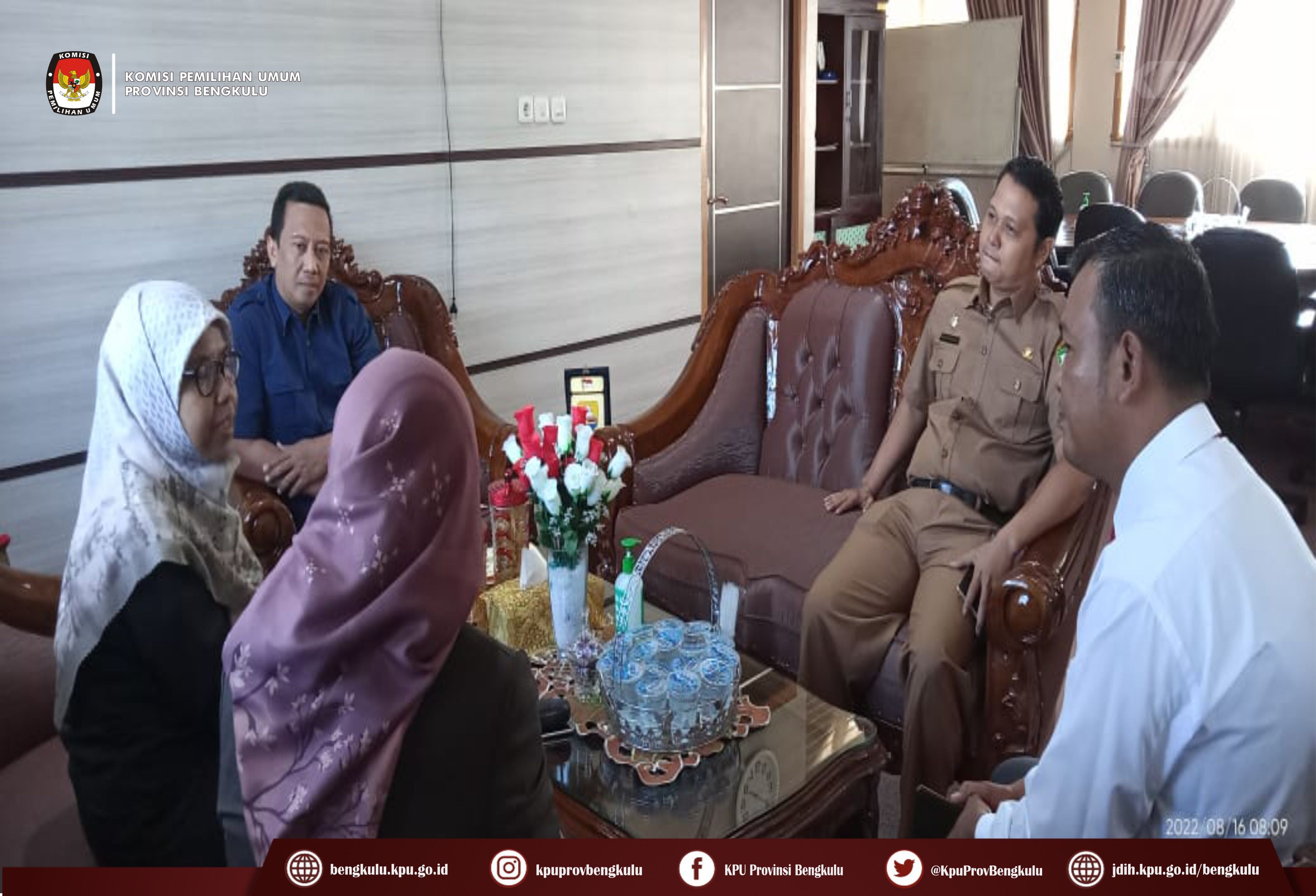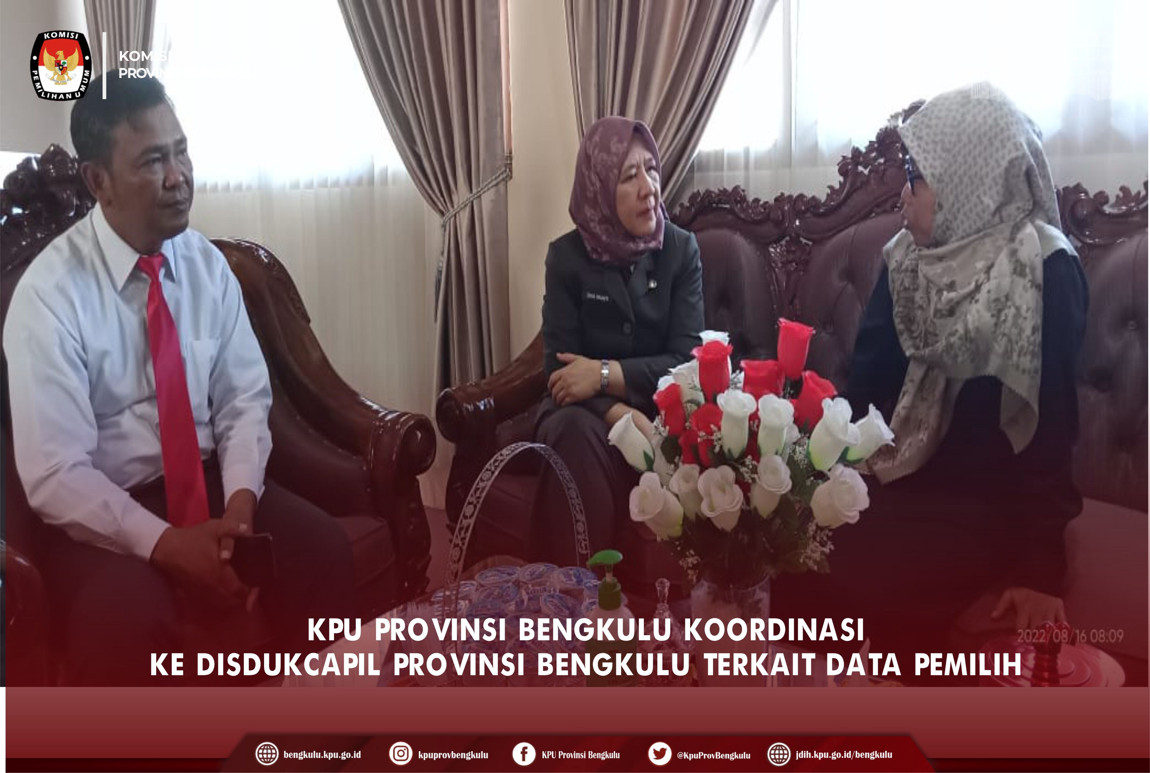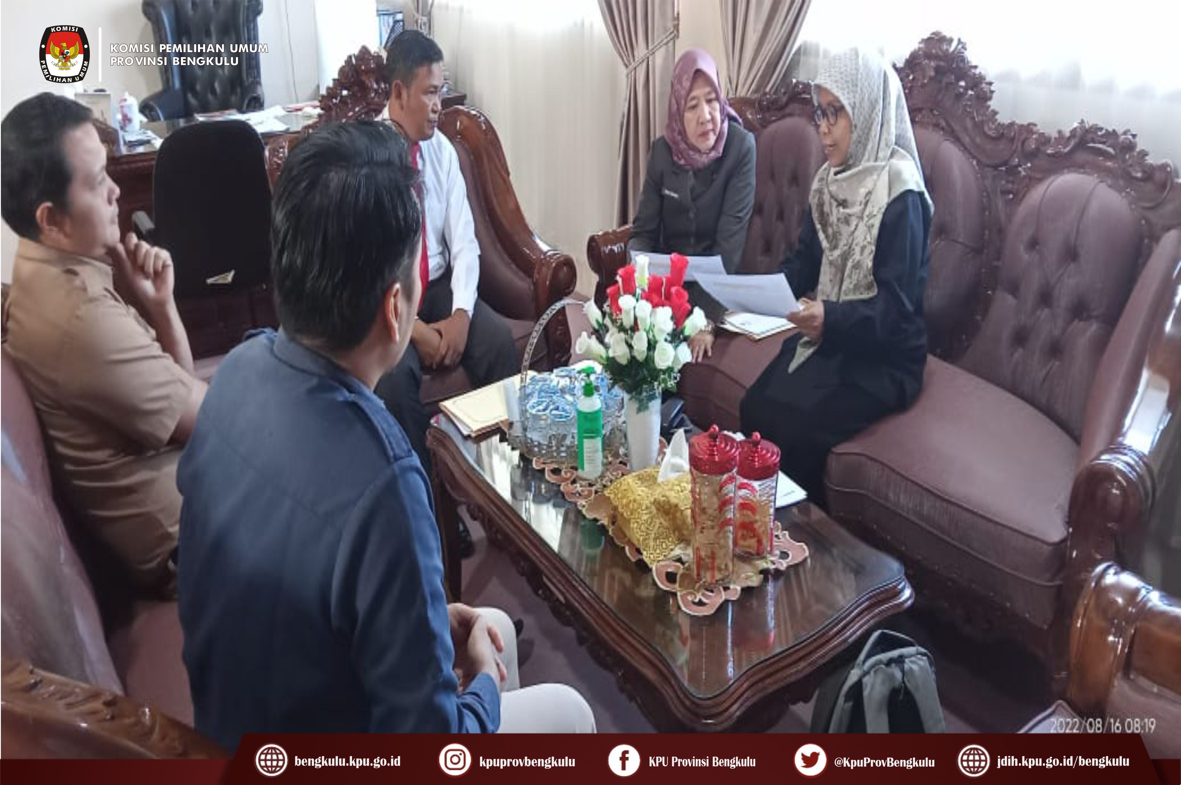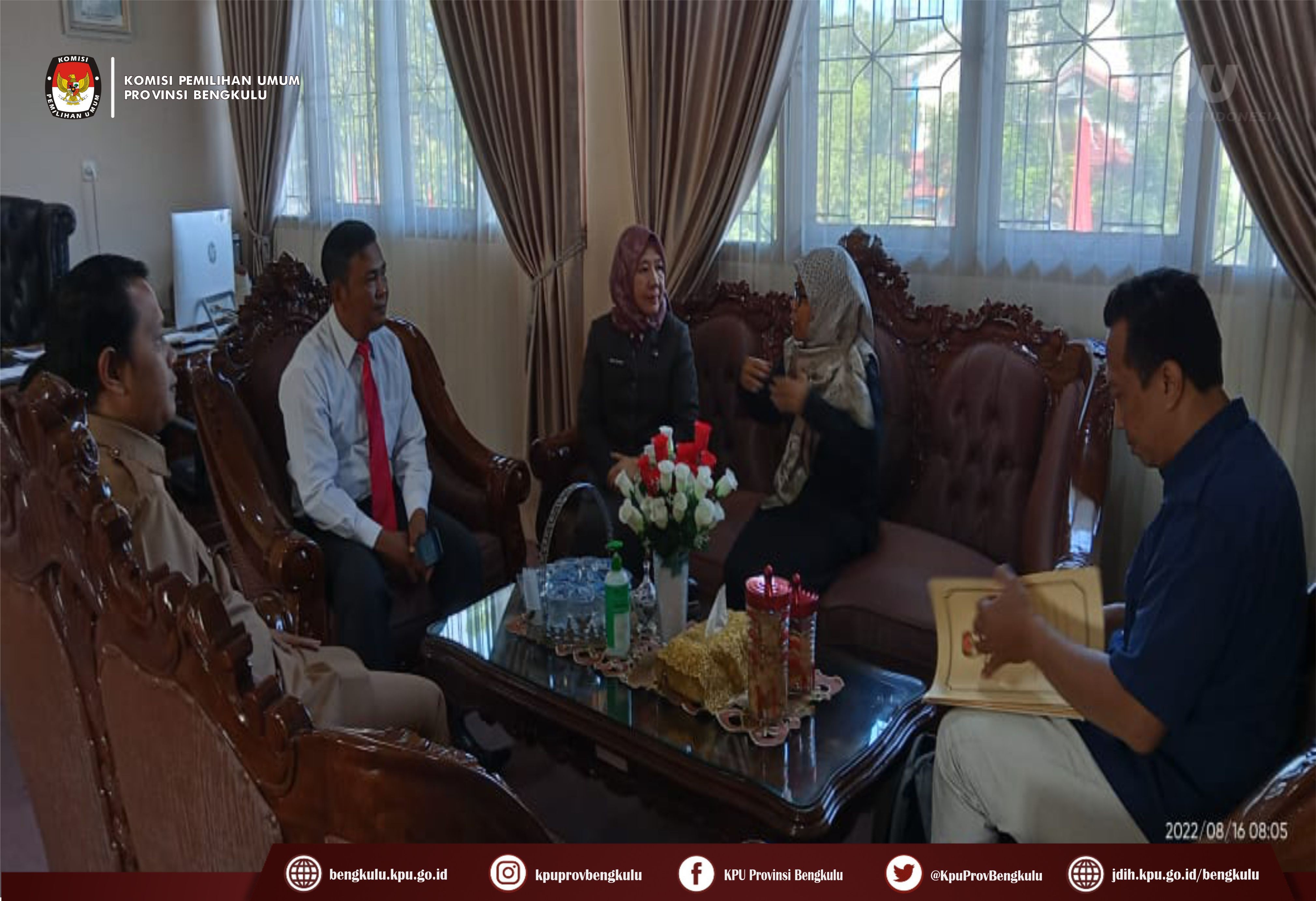 Bengkulu-bengkulu.kpu.go.id, Anggota KPU Provinsi Bengkulu Siti Baroroh didampingi Staf Zomi Putra dan Danang Tri Andono melaksanakan koordinasi terkait Data Pemilih dengan Dinas Kependudukan dan Catatan Sipil Provinsi Bengkulu, Selasa (16/8). Koordinasi KPU Provinsi Bengkulu diterima langsung oleh Kepala Dinas Dukcapil Provinsi Bengkulu Diah Irianti didampingi Kabid Pengelolaan Informasi Administrasi Kependudukan Taslim Arsi dan Kasi Pengolahan dan Penyajian Data Kependudukan Gunawan Wibisono di ruang kerjanya.