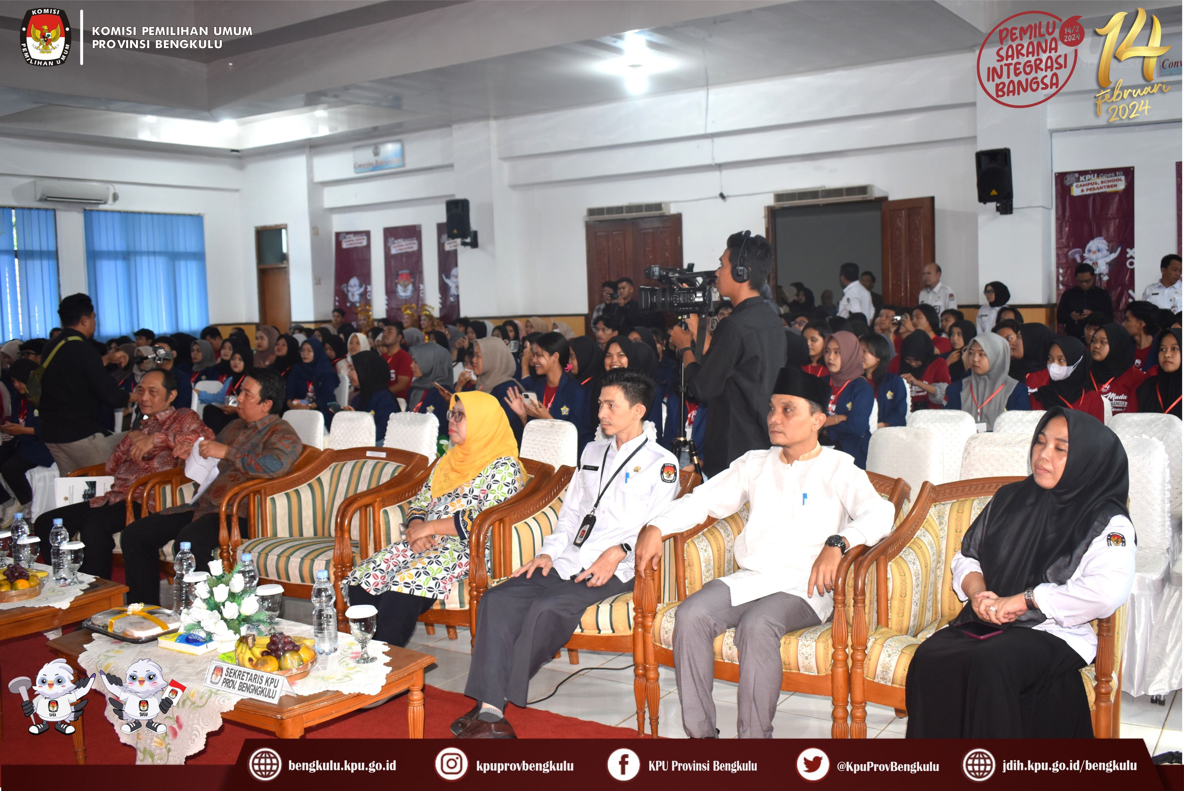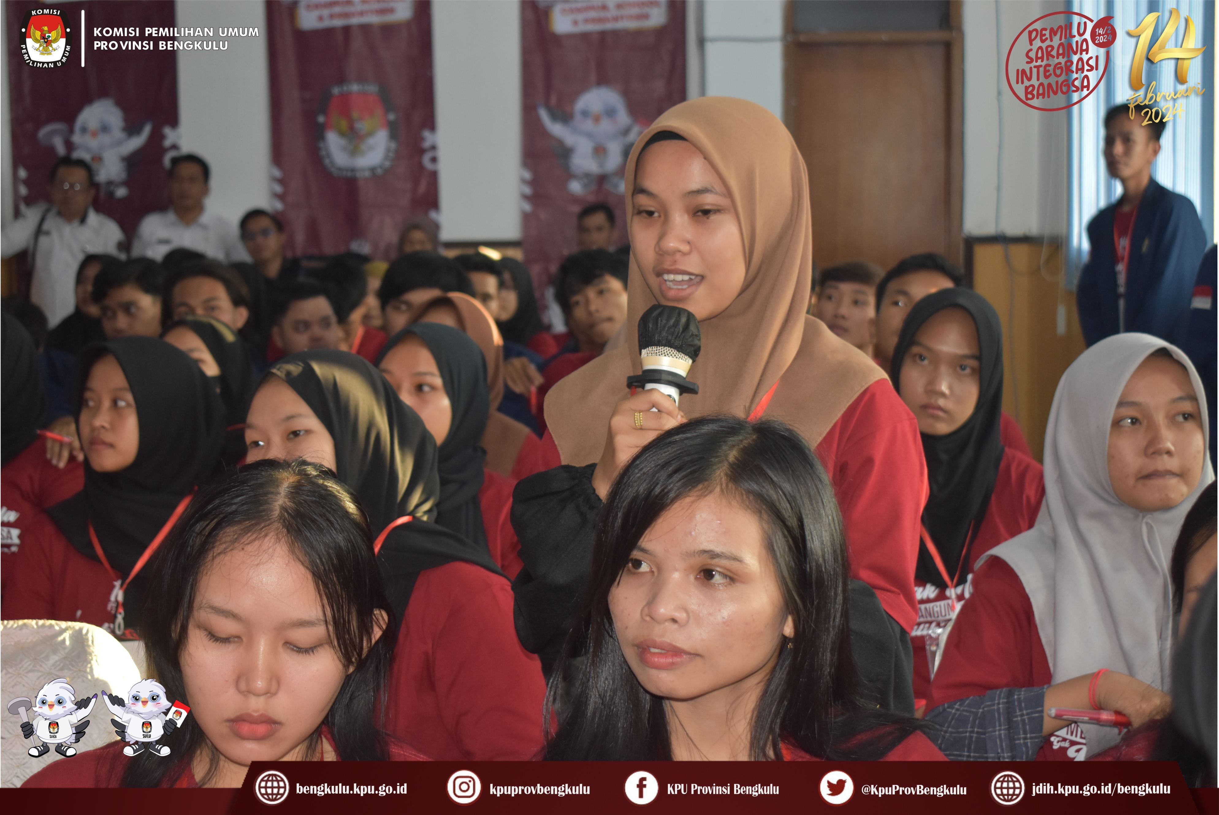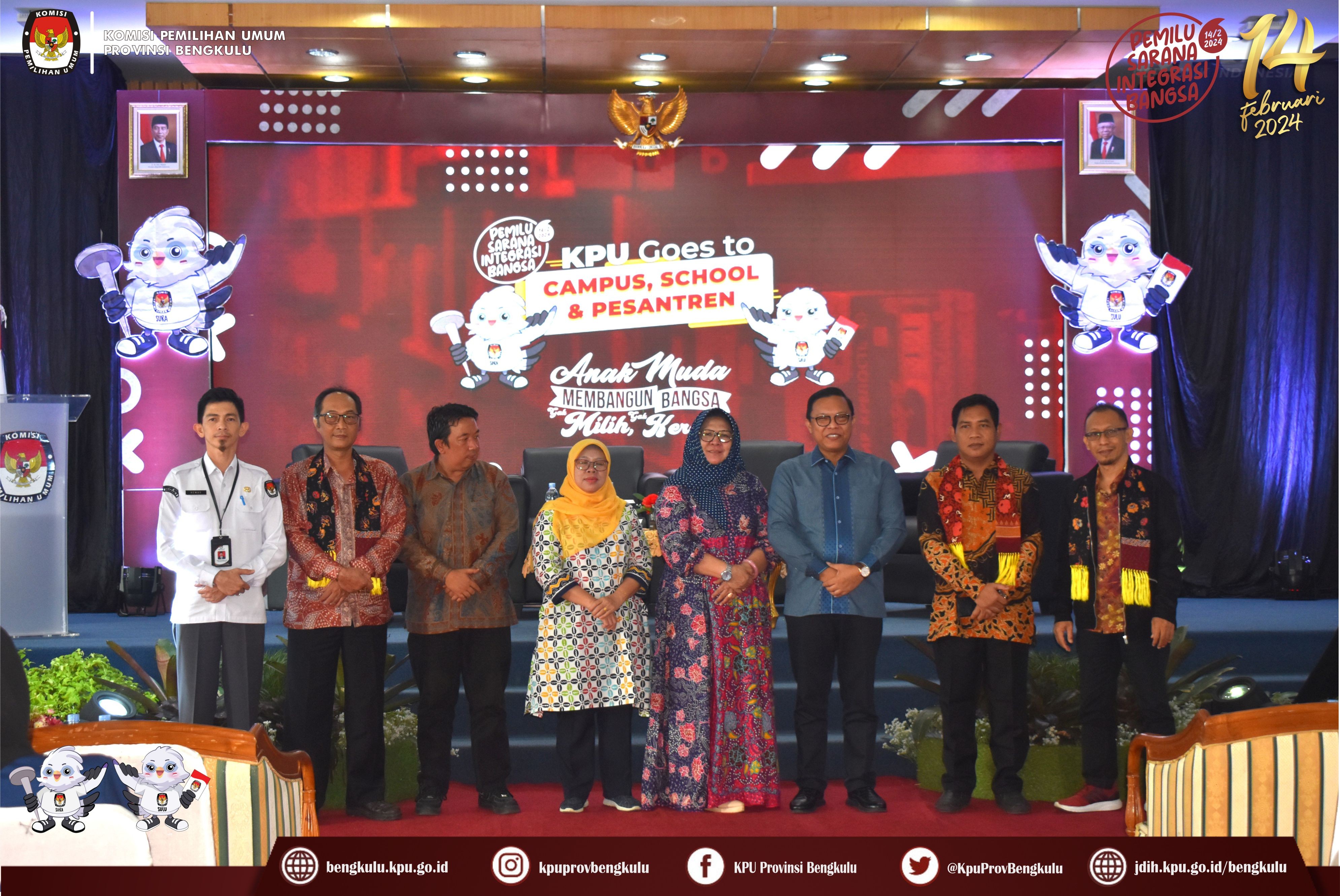 Bengkulu, bengkulu.kpu.go.id - Menindaklanjuti Surat KPU Nomor 4863/PP.06-SD/09/2023 dalam rangka meningkatkan partisipasi masyarakat, KPU melaksanakan kegiatan Sosialisasi dan Pendidikan Pemilu dalam bentuk KPU Goes To Campus bertema Anak Muda Membangun Bangsa Gak Milih Gak Keren di Universitas Bengkulu pada Senin, (11/12/2023). Peserta yang hadir mahasiswa/i berasal dari perwakilan fakultas dan program studi yang berjumlah 200 orang. Hadir dalam kegiatan Tenaga Ahli KPU RI Bapak Yenli Elmanoferi, Dekan Fisip Unib Dr. Yunilisiah, M.Si dan Narasumber Anggota KPU Provinsi Bengkulu Dodi Hendra Supiarso, Koordinator Program Pascasarjana Magister Administrasi Publik Fisip Unib Prof. Assoc. Dr. Sugeng Suharto, MM.,M.Si dan Analis Politik Exposit Strategic Dosen LSPR Jakarta Arif Susanto, Sekretaris KPU Provinsi Bengkulu Kemas Mohammad Ajir serta Moderator Dr. Mas Agus Firmansyah, S.Sos.,M.Si. Acara dipandu MC Afifa Manca Nabila dan dibuka dengan menyanyikan Lagu Kebangsaan Indonesia Raya dan Jingle Pemilu, Pembacaan Doa oleh Hasbi, Penampilan Tari Persembahan, Sambutan sekaligus pembukaan acara oleh Dekan Fisip Unib Dr. Yunilisiah, M.Si, Sambutan dan arahan Tenaga Ahli KPU RI Bapak Yenli Elmanoferi yang mengajak seluruh peserta untuk melakukan sosialisasi kepada masyarakat agar datang ke TPS menggunakan hak pilihnya pada Rabu 14 Februari 2024 agar partisipasi pemilih di Provinsi Bengkulu meningkat dari pemilu sebelumnya, kemudian dilanjutkan foto bersama dan penyampaian materi, sayembara video dan merchandise. Sugeng menyampaikan materi terkait peran pemilih pemula dalam pemilu 2024 salah satunya datang ke TPS pada Rabu 14 Februari 2024 dan jangan golput, Dodi menyampaikan materi peran pemilih muda dalam pemilu diantaranya pemahaman apa itu demokrasi dan pemilu, 5 jenis surat suara, yaitu Abu-Abu (Presiden dan Wakil Presiden), Merah (DPD RI), Kuning (DPR RI), Biru (DPRD Provinsi) dan Hijau (DPRD Kabupaten/Kota), Tris Politika (Legislatif, Eksekutif, dan yudikatif), partikan Terdaftar di DPT dengan cara cek pada link https://cekdptonline.kpu.go.id/, Penyelenggara Pemilu, Partisipasi Pemilih pada Pemilu 2019 dan Pilkada 2020, dan cara menjadi pemilih cerdas, Sedangkan Arif memaparkan materi peran penting pemilih dalam menyukseskan Pemilu Tahun 2024.