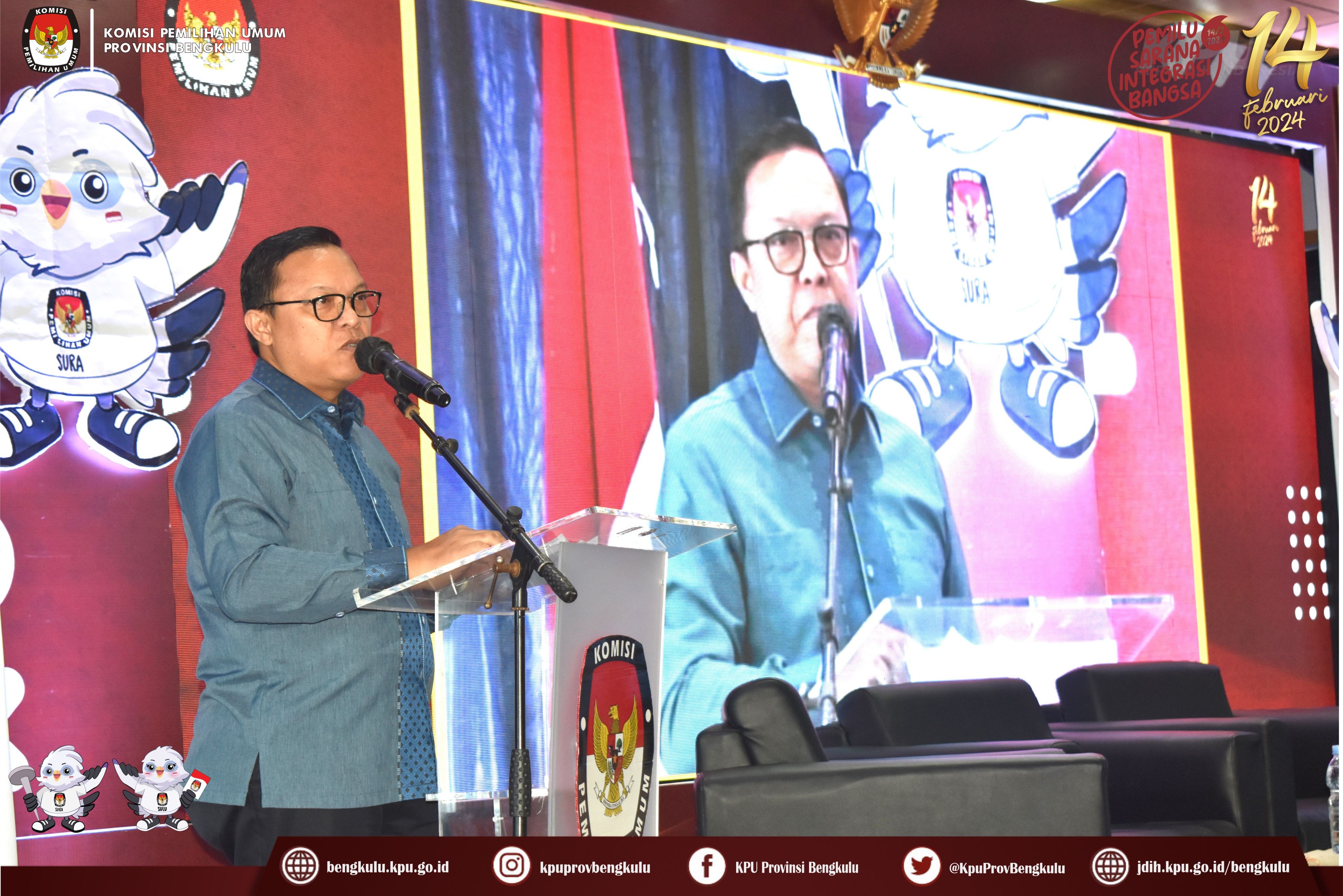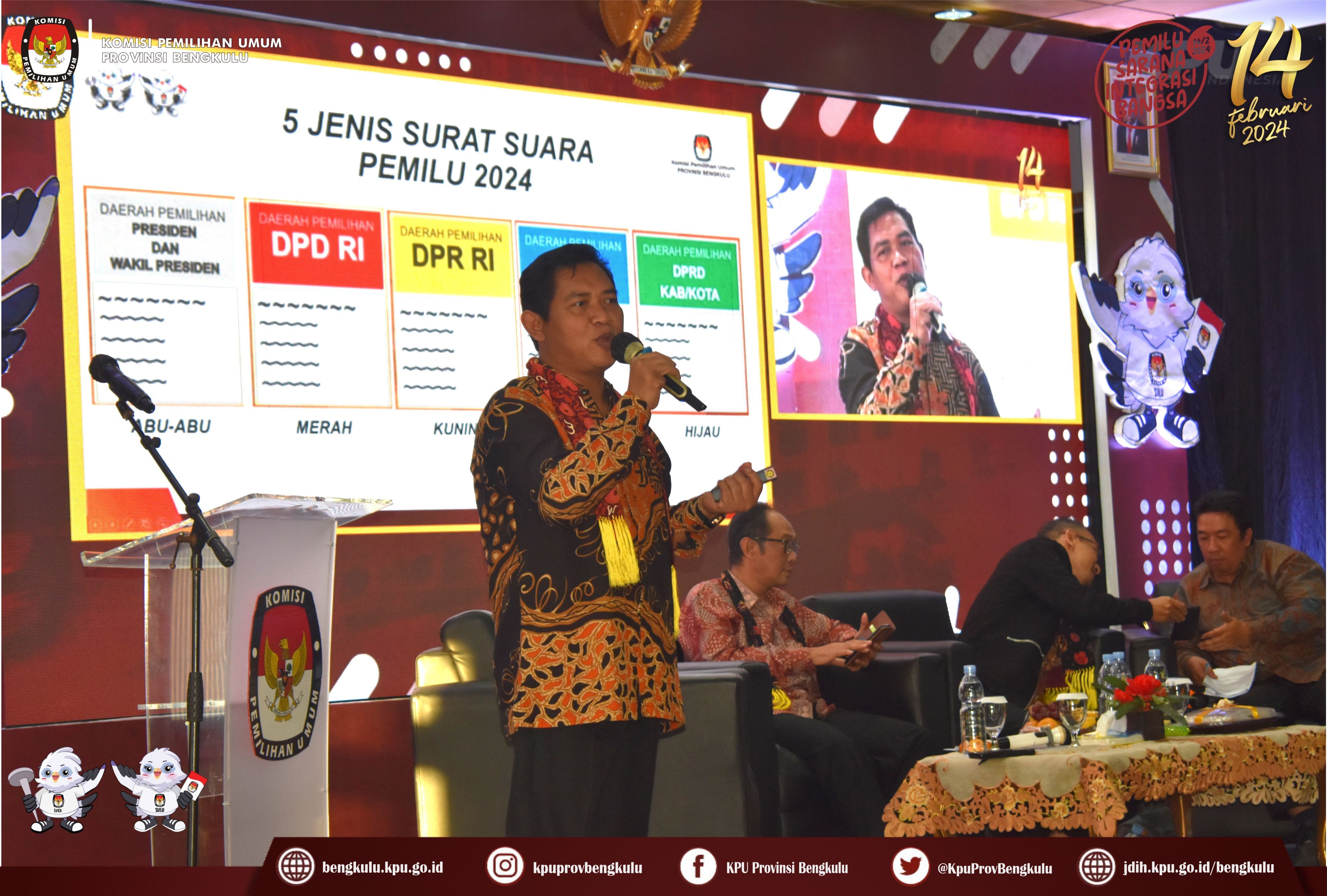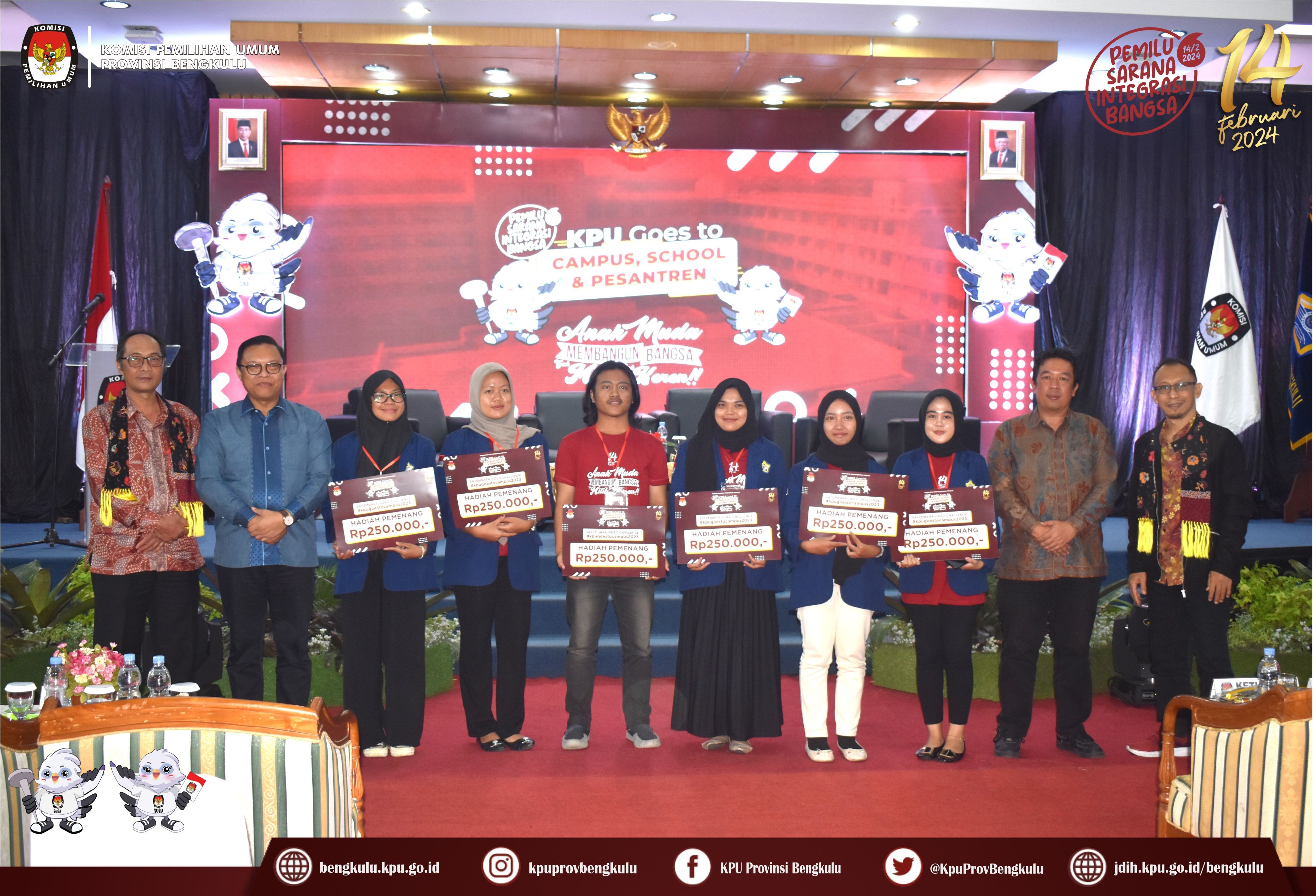 Bengkulu, bengkulu.kpu.go.id - Menindaklanjuti Surat KPU Nomor 4863/PP.06-SD/09/2023 dalam rangka meningkatkan partisipasi masyarakat, KPU melaksanakan kegiatan Sosialisasi dan Pendidikan Pemilu dalam bentuk KPU Goes To Campus bertema Anak Muda Membangun Bangsa Gak Milih Gak Keren di Universitas Bengkulu pada Senin, (11/12/2023). Peserta yang hadir mahasiswa/i berasal dari perwakilan fakultas dan program studi yang berjumlah 200 orang. Hadir dalam kegiatan Tenaga Ahli KPU RI Bapak Yenli Elmanoferi, Dekan Fisip Unib Dr. Yunilisiah, M.Si dan Narasumber Anggota KPU Provinsi Bengkulu Dodi Hendra Supiarso, Koordinator Program Pascasarjana Magister Administrasi Publik Fisip Unib Prof. Assoc. Dr. Sugeng Suharto, MM.,M.Si dan Analis Politik Exposit Strategic Dosen LSPR Jakarta Arif Susanto, Sekretaris KPU Provinsi Bengkulu Kemas Mohammad Ajir serta Moderator Dr. Mas Agus Firmansyah, S.Sos.,M.Si. Acara dipandu MC Afifa Manca Nabila dan dibuka dengan menyanyikan Lagu Kebangsaan Indonesia Raya dan Jingle Pemilu, Pembacaan Doa oleh Hasbi, Penampilan Tari Persembahan, Sambutan sekaligus pembukaan acara oleh Dekan Fisip Unib Dr. Yunilisiah, M.Si, Sambutan dan arahan Tenaga Ahli KPU RI Bapak Yenli Elmanoferi yang mengajak seluruh peserta untuk melakukan sosialisasi kepada masyarakat agar datang ke TPS menggunakan hak pilihnya pada Rabu 14 Februari 2024 agar partisipasi pemilih di Provinsi Bengkulu meningkat dari pemilu sebelumnya, kemudian dilanjutkan foto bersama dan penyampaian materi, sayembara video dan merchandise. Sugeng menyampaikan materi terkait peran pemilih pemula dalam pemilu 2024 salah satunya datang ke TPS pada Rabu 14 Februari 2024 dan jangan golput, Dodi menyampaikan materi peran pemilih muda dalam pemilu diantaranya pemahaman apa itu demokrasi dan pemilu, 5 jenis surat suara, yaitu Abu-Abu (Presiden dan Wakil Presiden), Merah (DPD RI), Kuning (DPR RI), Biru (DPRD Provinsi) dan Hijau (DPRD Kabupaten/Kota), Tris Politika (Legislatif, Eksekutif, dan yudikatif), partikan Terdaftar di DPT dengan cara cek pada link https://cekdptonline.kpu.go.id/, Penyelenggara Pemilu, Partisipasi Pemilih pada Pemilu 2019 dan Pilkada 2020, dan cara menjadi pemilih cerdas, Sedangkan Arif memaparkan materi peran penting pemilih dalam menyukseskan Pemilu Tahun 2024.