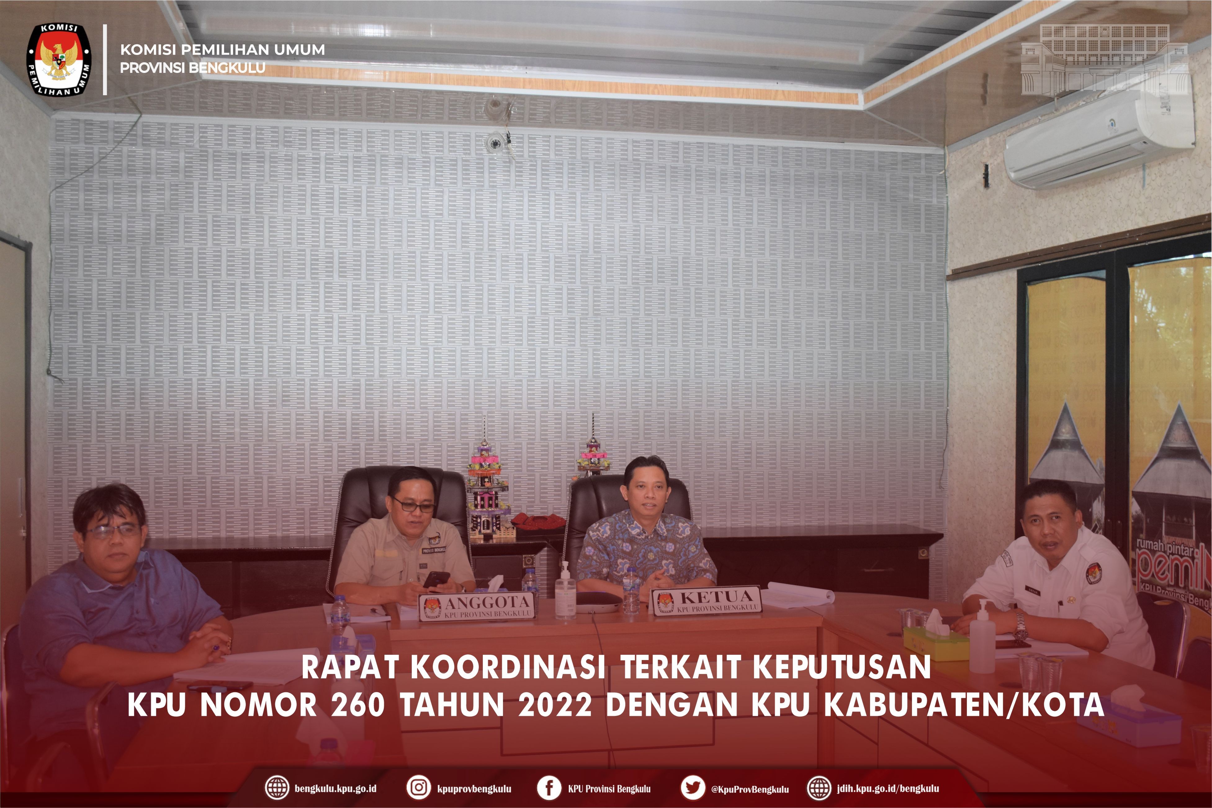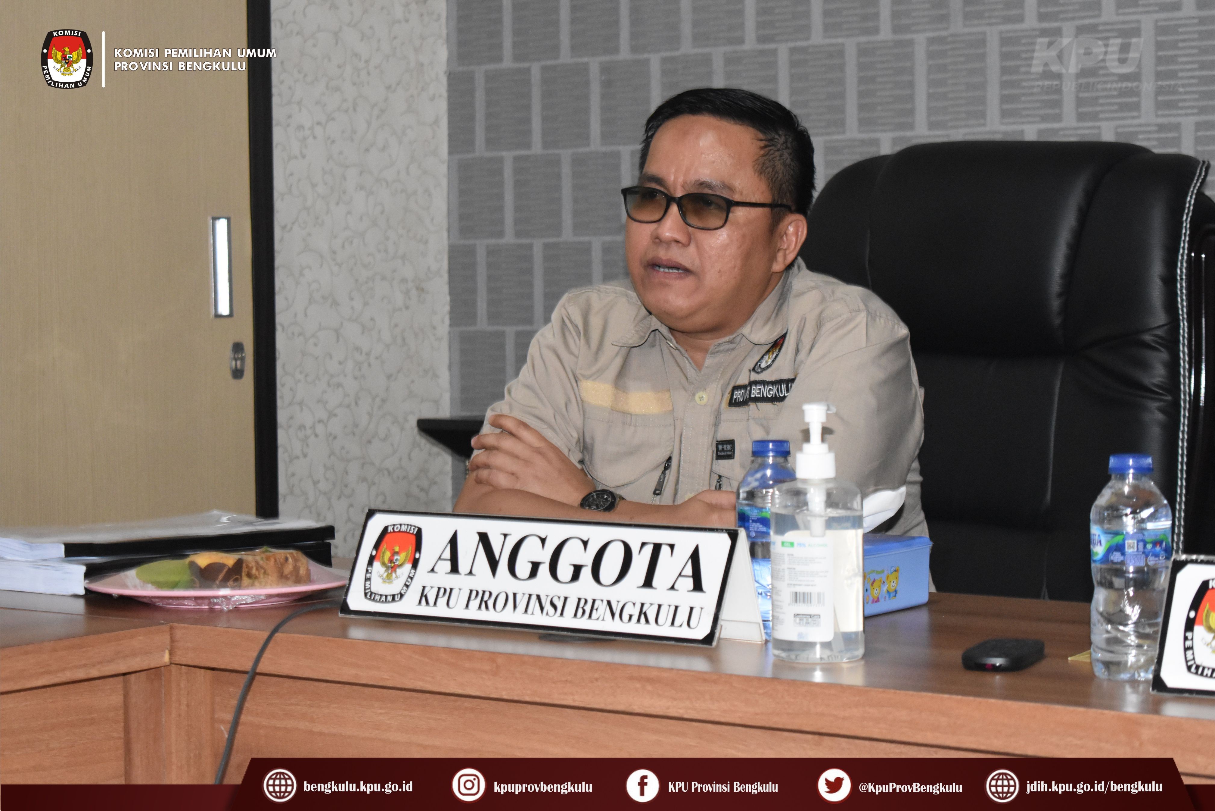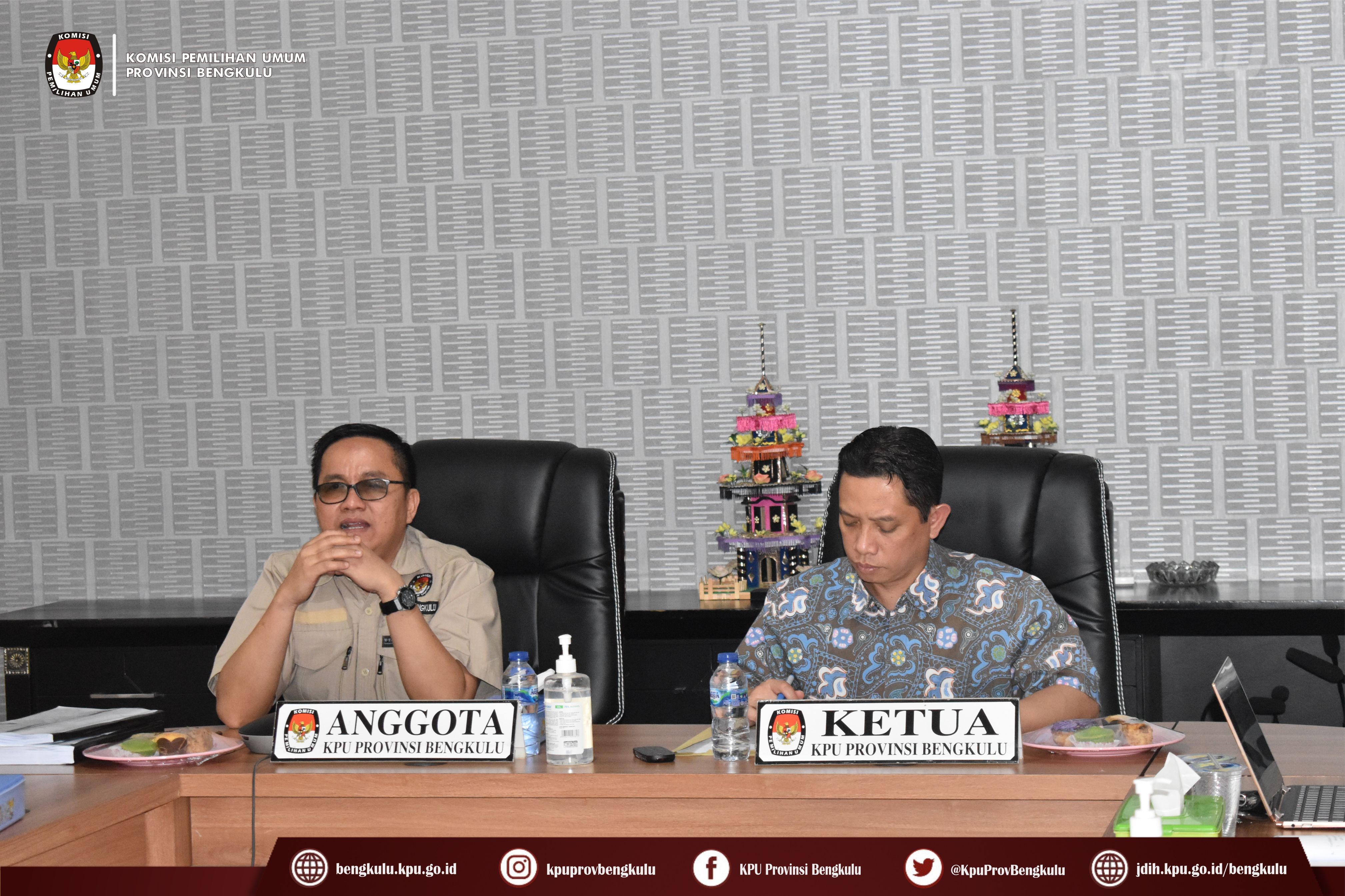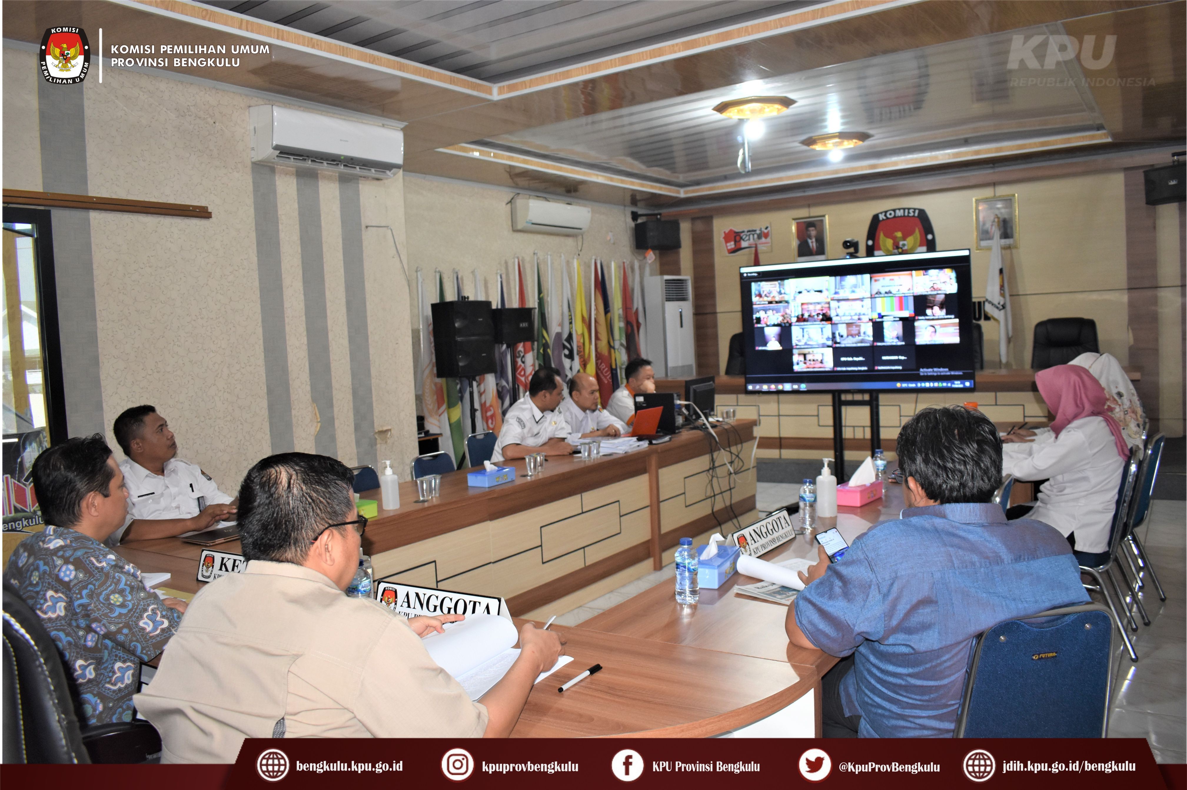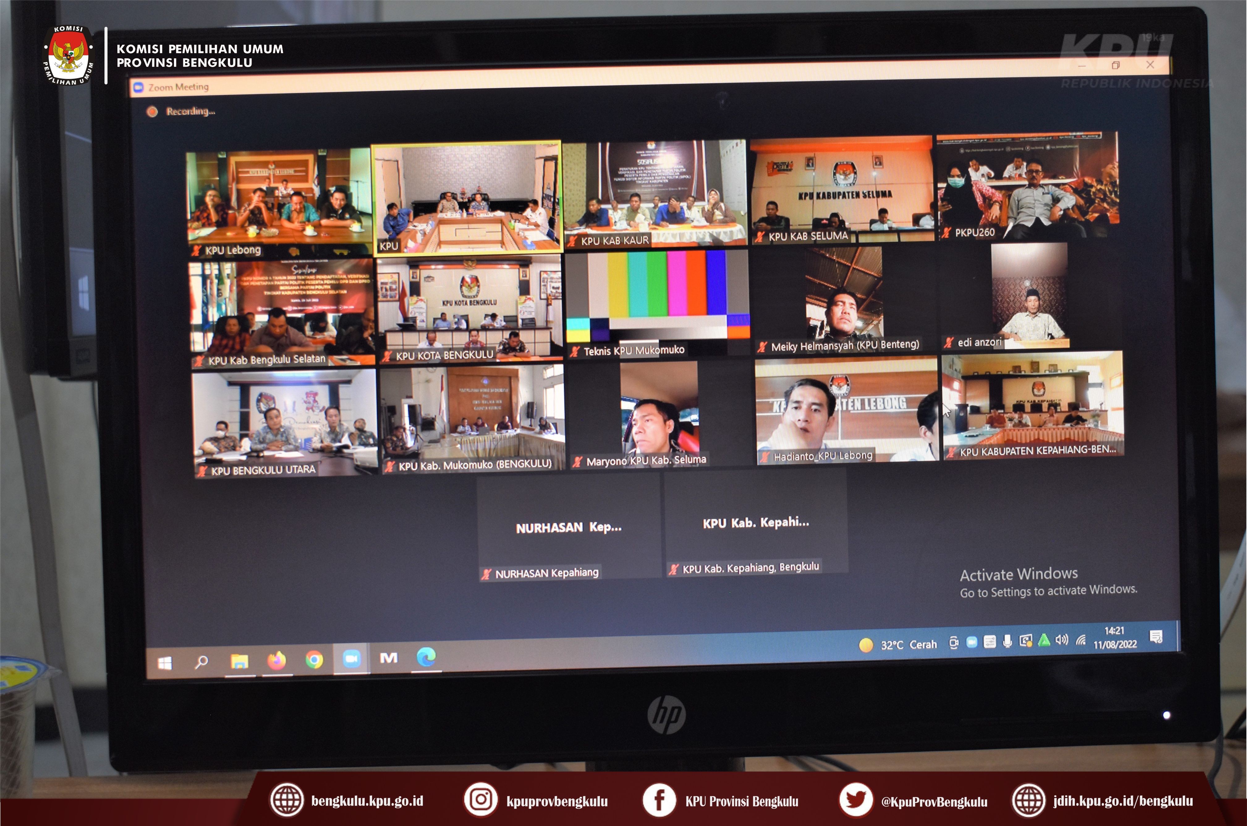 Bengkulu-bengkulu.kpu.go.id, Ketua KPU Provinsi Bengkulu Irwan Saputra didampingi Anggota KPU Provinsi Bengkulu Emex Verzoni dan Darlinsyah serta Kabag TPPPHHS Oktan Huzaeiry, Kasubbag TPPPH M. Benny Eka Putra, Kasubbag Hukum dan SDM Hafiz Umar dan Staf mengikuti Rapat Koordinasi Terkait Keputusan Komisi Pemilihan Umum Nomor 260 Tahun 2022 tentang Pedoman Teknis Bagi KPU, KPU Provinsi dan KPU Kabupaten/Kota Dalam Pelaksanaan Pendaftaran, Verifikasi, dan Penetapan Partai Politik Peserta pemilihan Umum Anggota DPR dan DPRD dengan KPU Kabupaten/Kota Se-Provinsi Bengkulu secara daring (zoom meeting) Kamis (11/8).