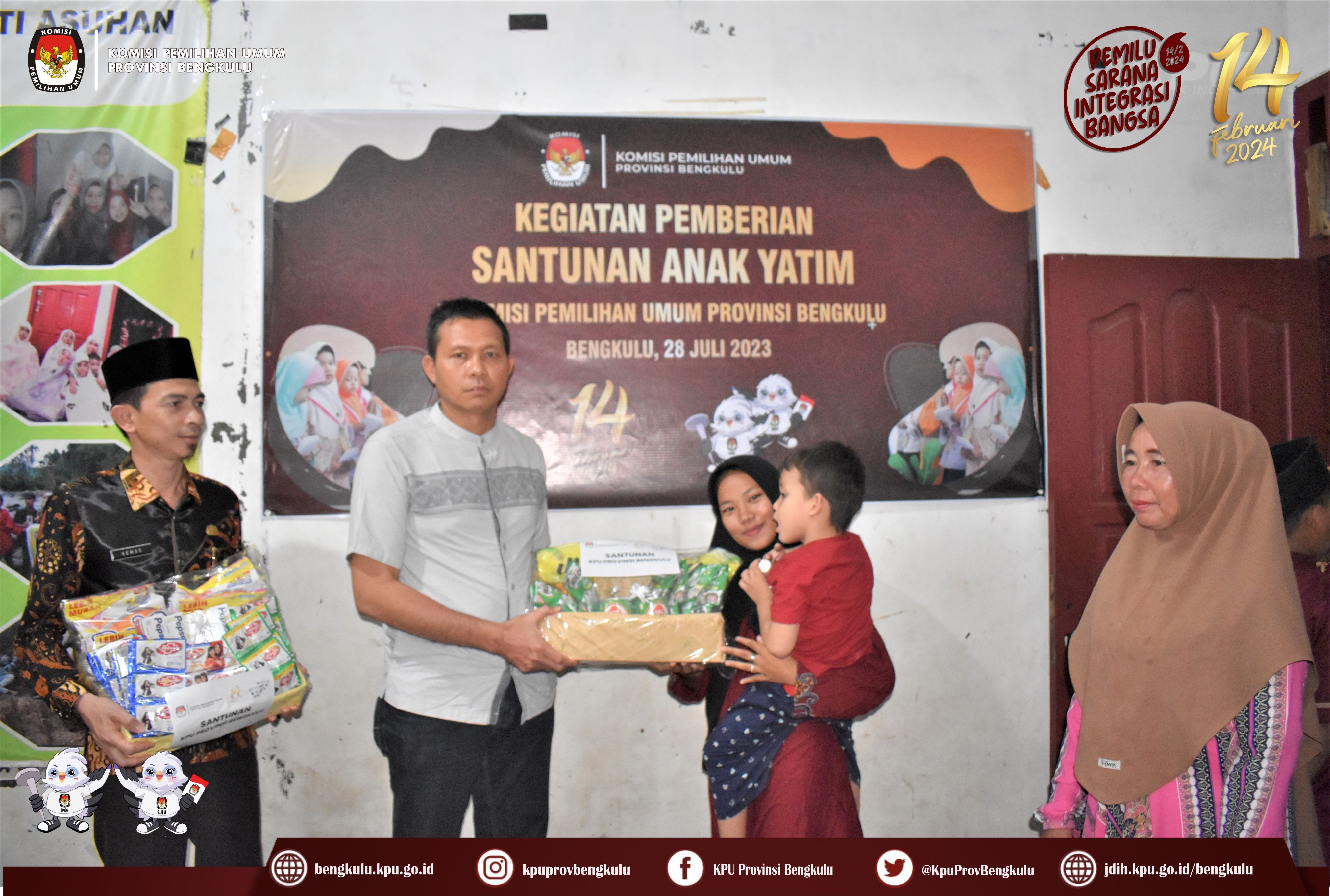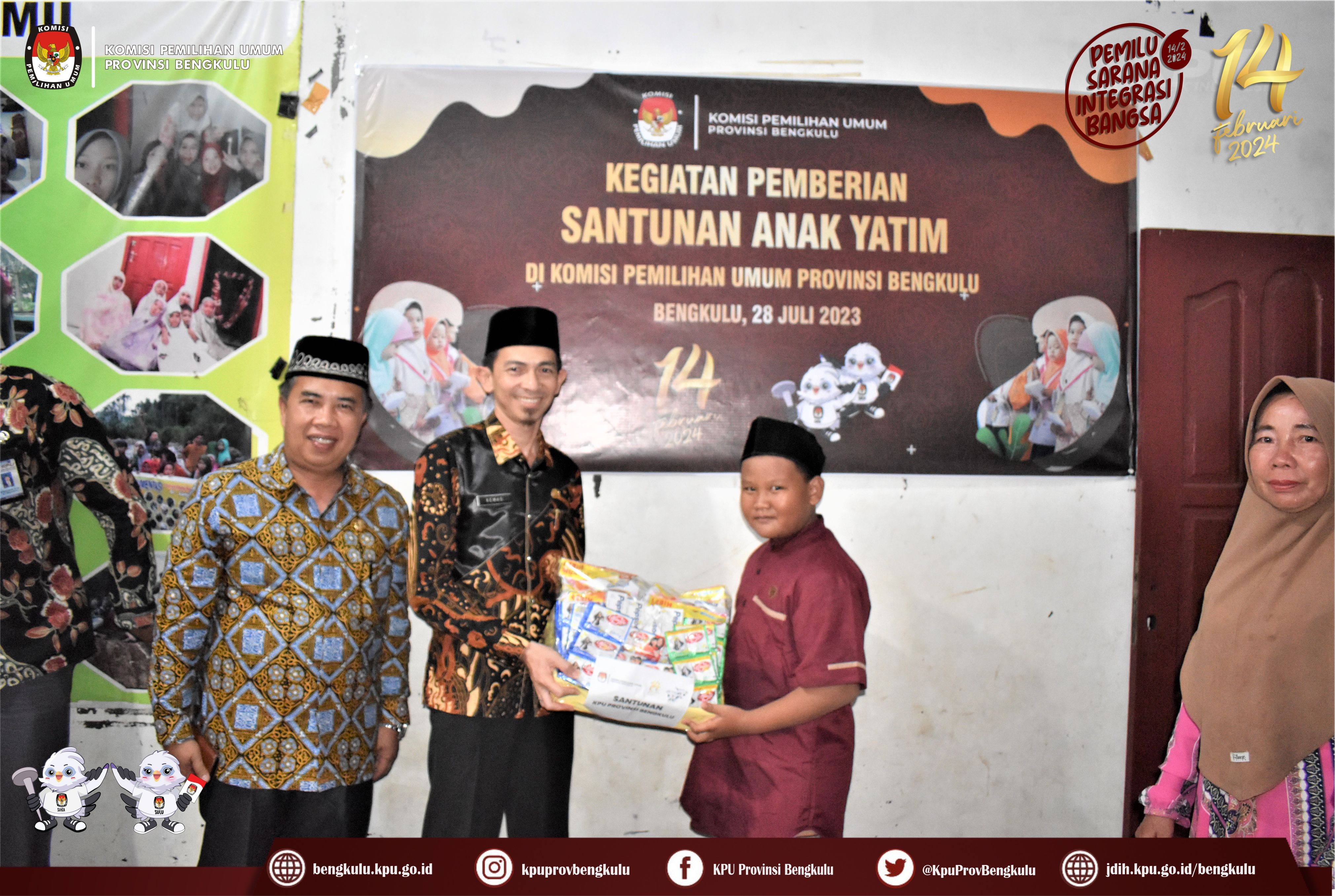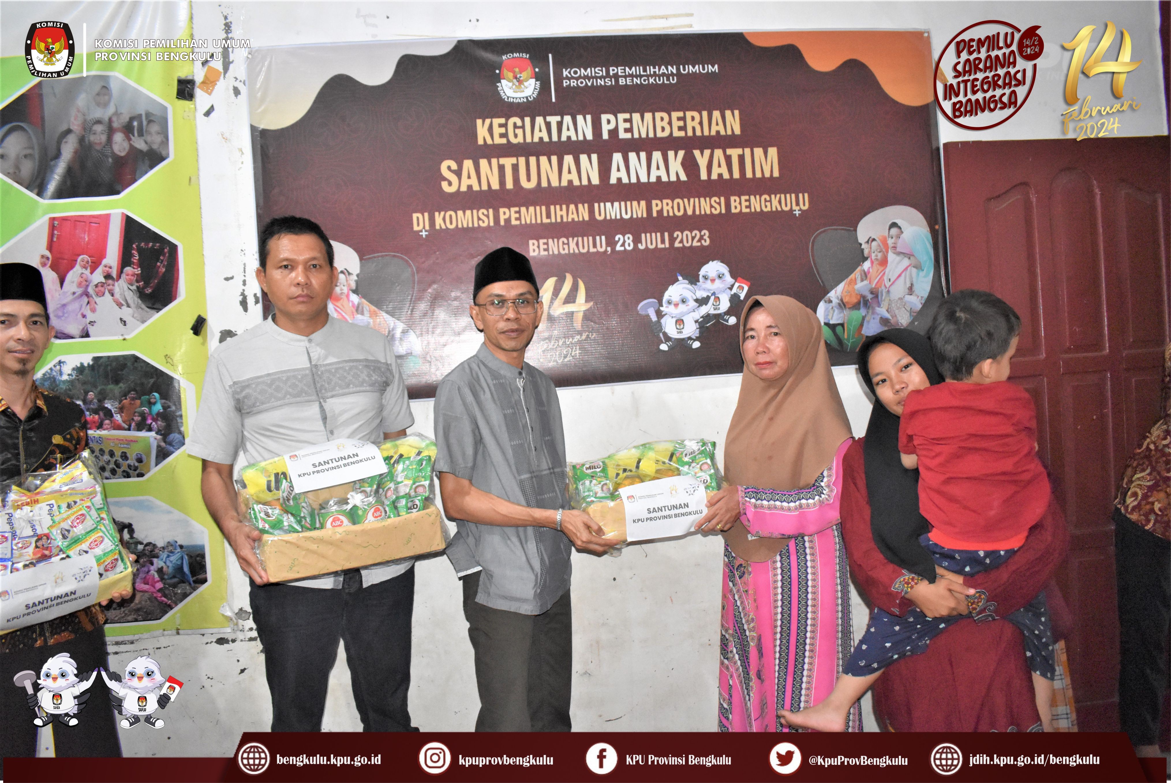 Bengkulu, bengkulu.kpu.go.id - Dalam rangka menindaklanjuti dan melaksanakan Surat Sekretaris Jenderal KPU Nomor 2723/TU.01.1-SD/03/2023 perihal Pemberian Santunan Anak Yatim di Lingkungan KPU dan Masyarakat, Ketua KPU Provinsi Bengkulu Rusman Sudarsono didampingi Anggota KPU Provinsi Bengkulu Sarjan Efendi, Sekretaris Kemas Mohammad Ajir, Kabag Keuangan Umum dan Logistik Sudirman dan Kabag Teknis Penyelenggaraan Pemilu, Partisipasi, Hubungan Masyarakat dan Hukum dan SDM Oktan Huzaeiry memberikan Santunan kepada Panti Asuhan Al-Jamii Anugrah Bengkulu. Rusman menyampaikan bahwa pemberian santunan ini dalam rangka bentuk Kepedulian Komisi Pemilihan Umum terhadap generasi bangsa dan mempererat tali silaturahmi serta meningkat solidaritas antar sesama. Pelaksanaan pemberian santunan anak yatim dilaksanakan serentak di tingkat KPU Provinsi/KIP Aceh dan KPU/KIP Kabupaten/Kota pada Jum’at, 28 Juli 2023.