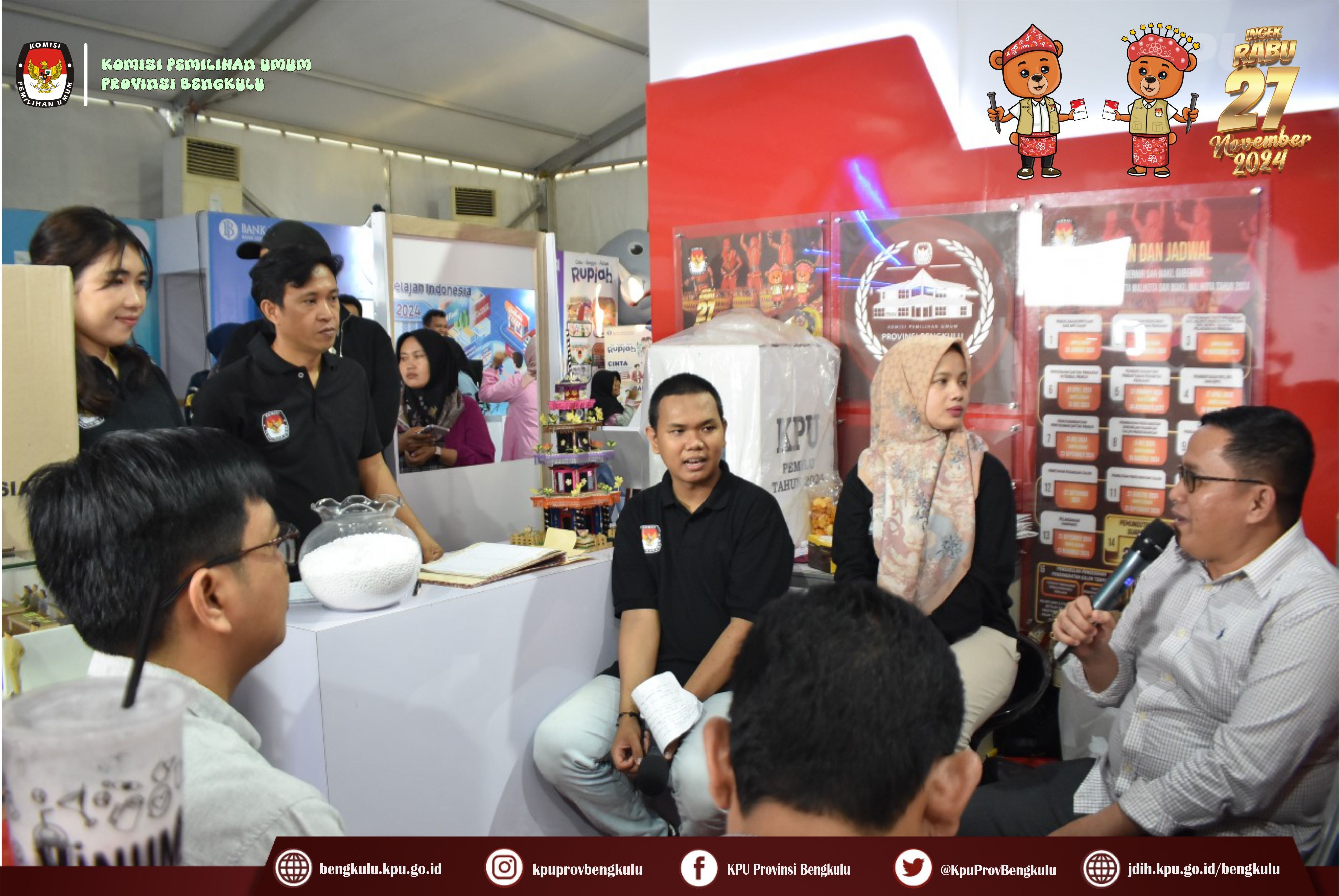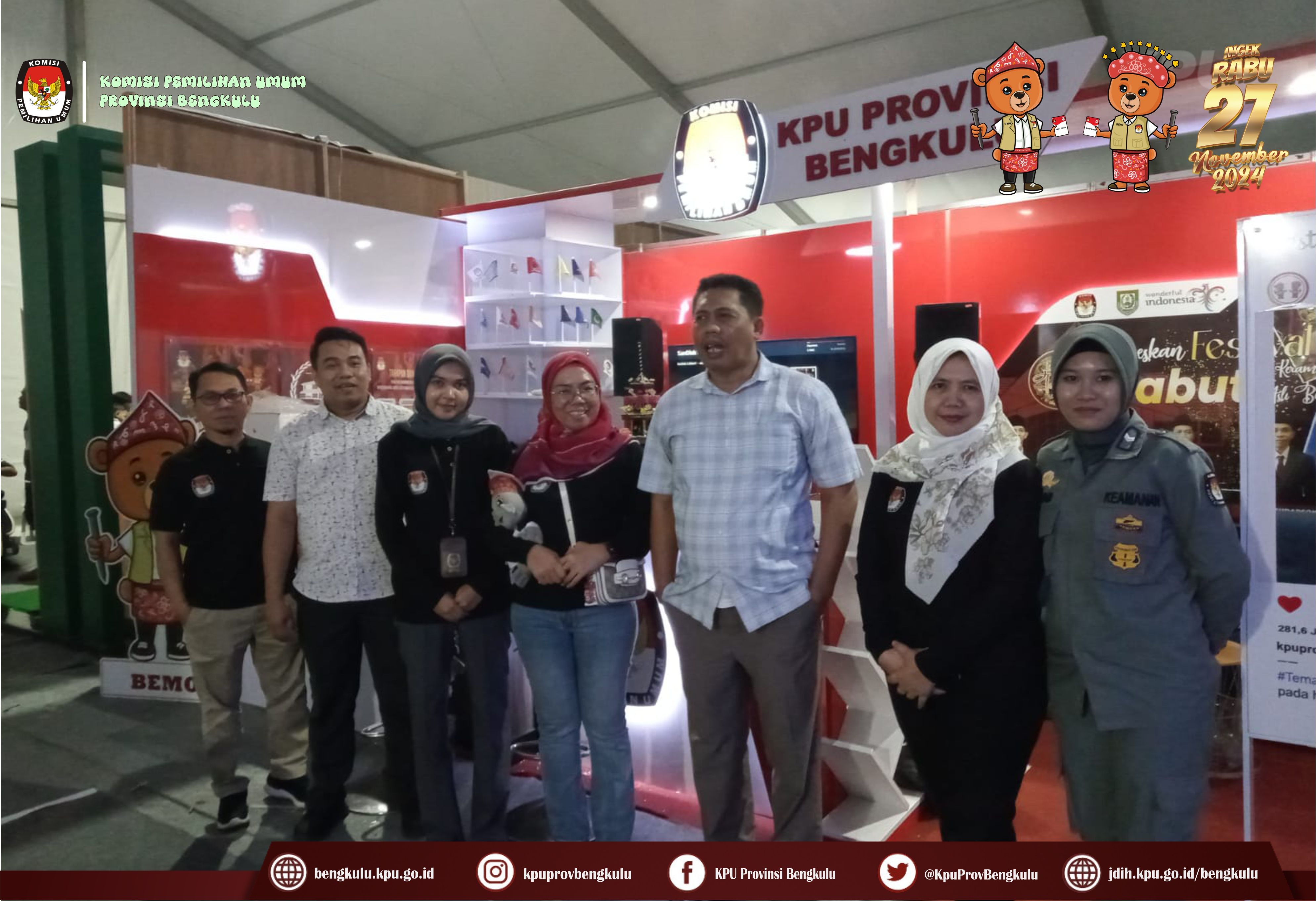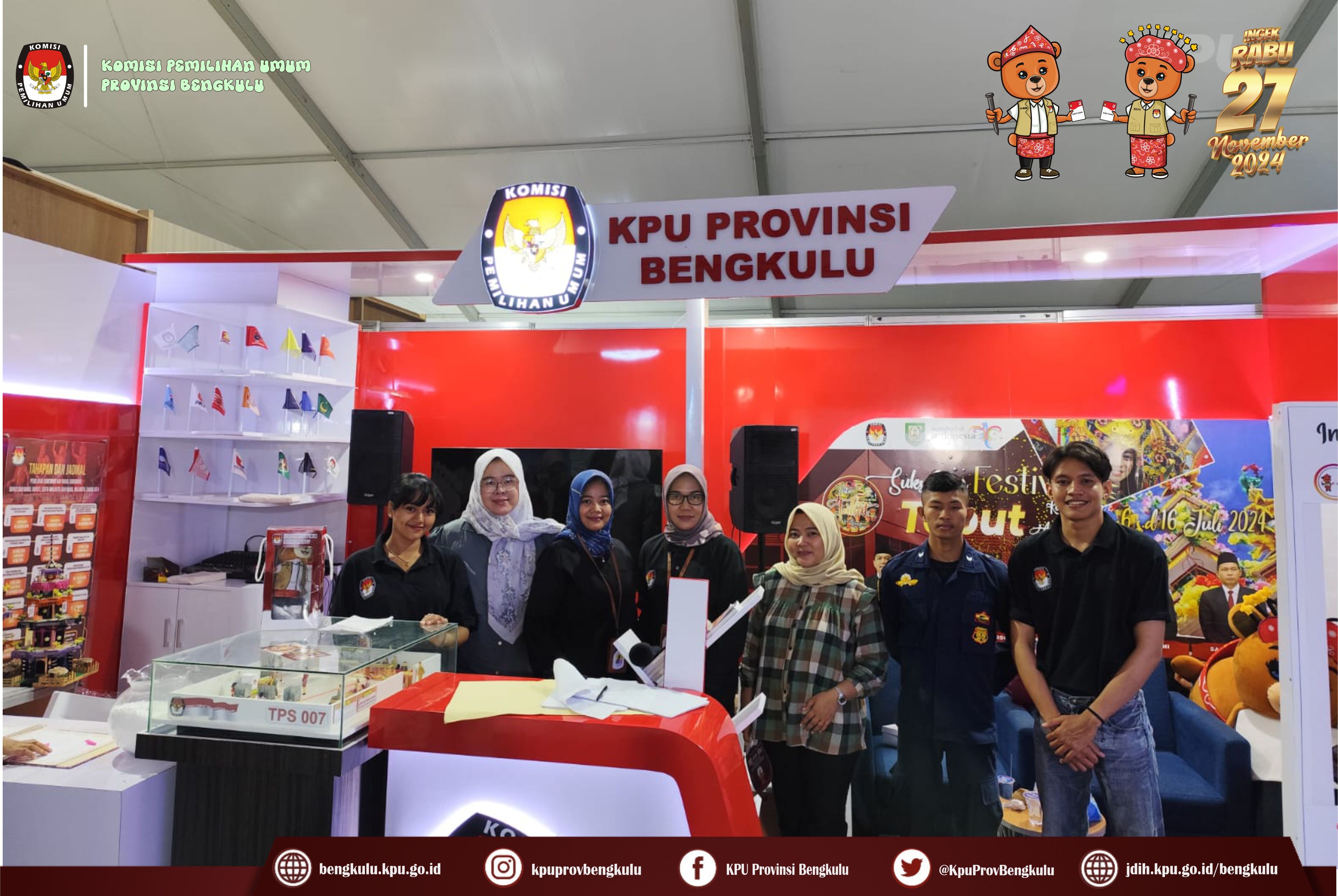 Bengkulu, bengkulu.kpu.go.id - Dalam rangka memeriahkan Festival Tabot Tahun 2024 yang berlangsung 6 s,d 16 Juli 2024 bertempat di Lapangan Merdeka Bengkulu, KPU Provinsi Bengkulu membuka Stand sebagai Sarana Media Sosialisasi dan Pendidikan Pemilih kepada masyarakat Provinsi Bengkulu. Stand KPU Provinsi Bengkulu menyajikan informasi tentang Pemilihan Serentak Tahun 2024, Kegiatan Tahapan yang telah dan sedang berjalan, Coklit yang berlangsung 24 Juni s.d 24 Juli 2024, Cek tanggapan masyarakat pada link https://infopemilu.kpu.go.id/Pemilihan/cek_pendukung, Partai Politik Peserta Pemilu 2024, Pendaftaran Pencalonan Gubernur, Bupati dan Walikota yang dimulai pada 27-29 Agustus 2024 serta Pemungutan Suara pada Rabu 27 November 2024 dan sebagainya. Ketua KPU Provinsi Bengkulu Rusman Sudarsono bersama Anggota KPU Provinsi Bengkulu Alpin Samsen, Dodi Hendra Supiarso dan Emex Verzoni serta Sekretaris Kemas Mohammad Ajir dan Kabag TPHS Oktan Huzaeiry hadir langsung ke stand KPU Provinsi Bengkulu. Selain itu, KPU Provinsi Bengkulu menyiapkan doorprize hadiah bagi masyarakat dengan cara memfollow instagram KPU Provinsi Bengkulu diantaranya Payung, Jam Dinding, Mug, Boneka Maskot Pilkada Si Bemi dan Si Bemo, Headset, Gantung kunci dan sebagainya.