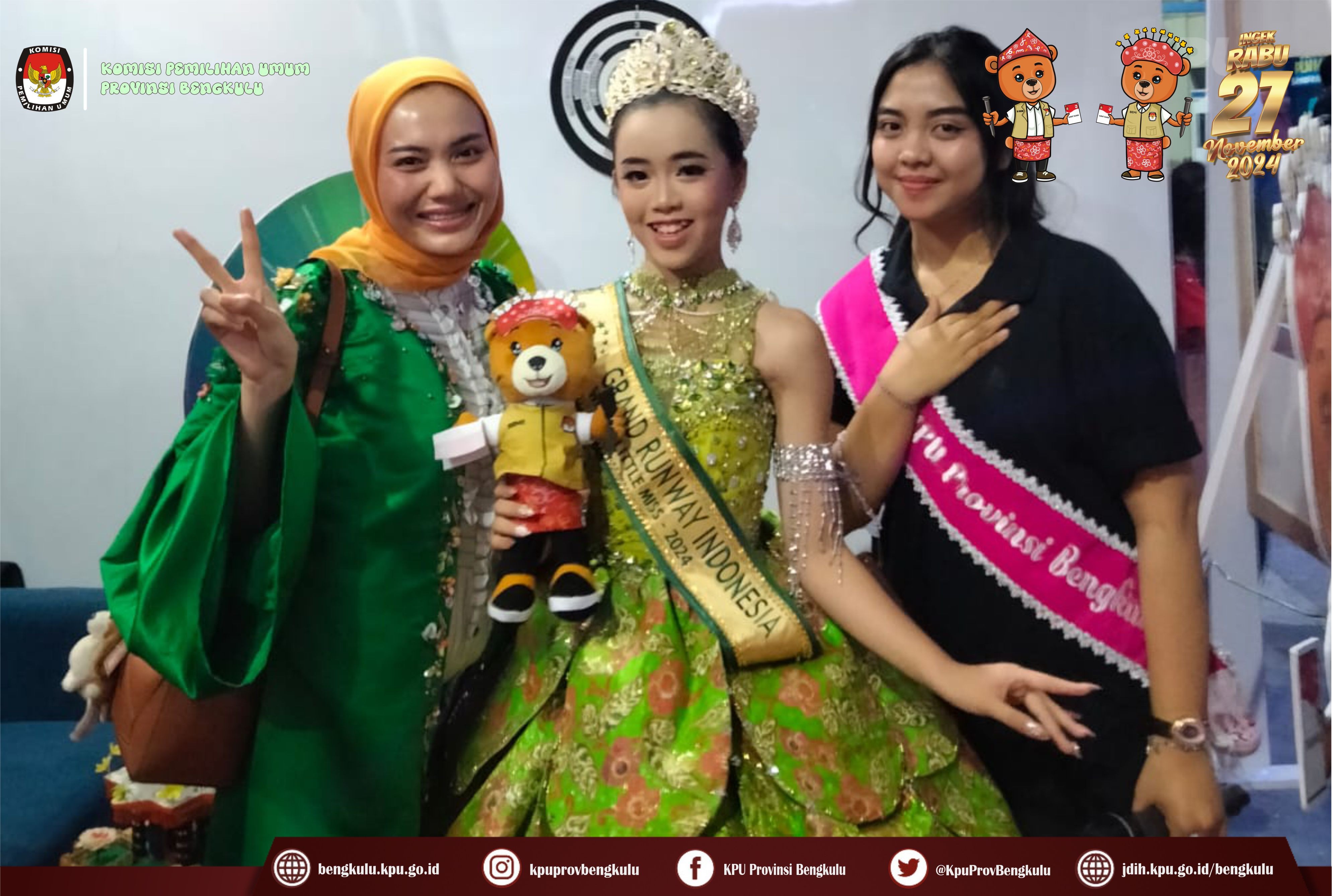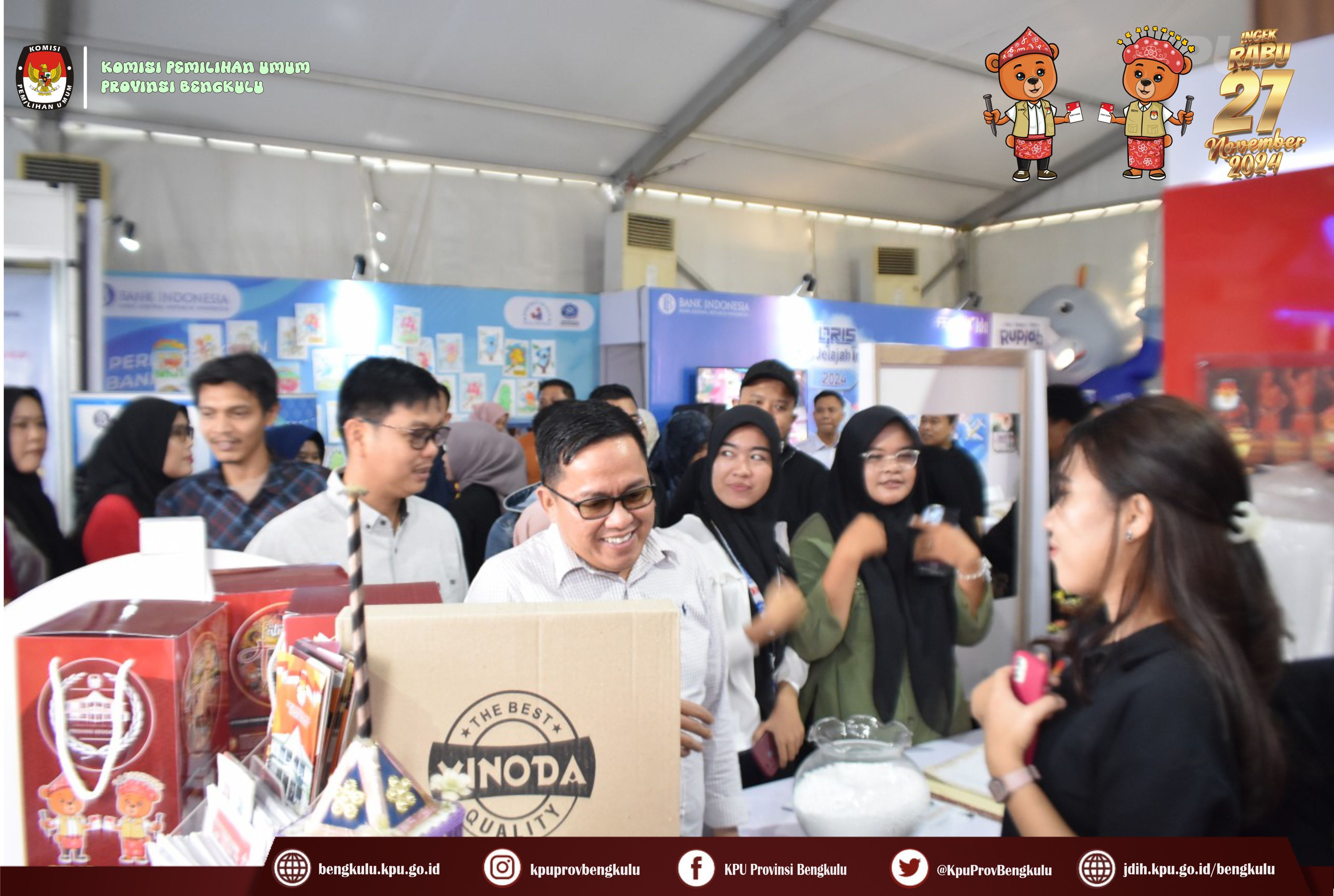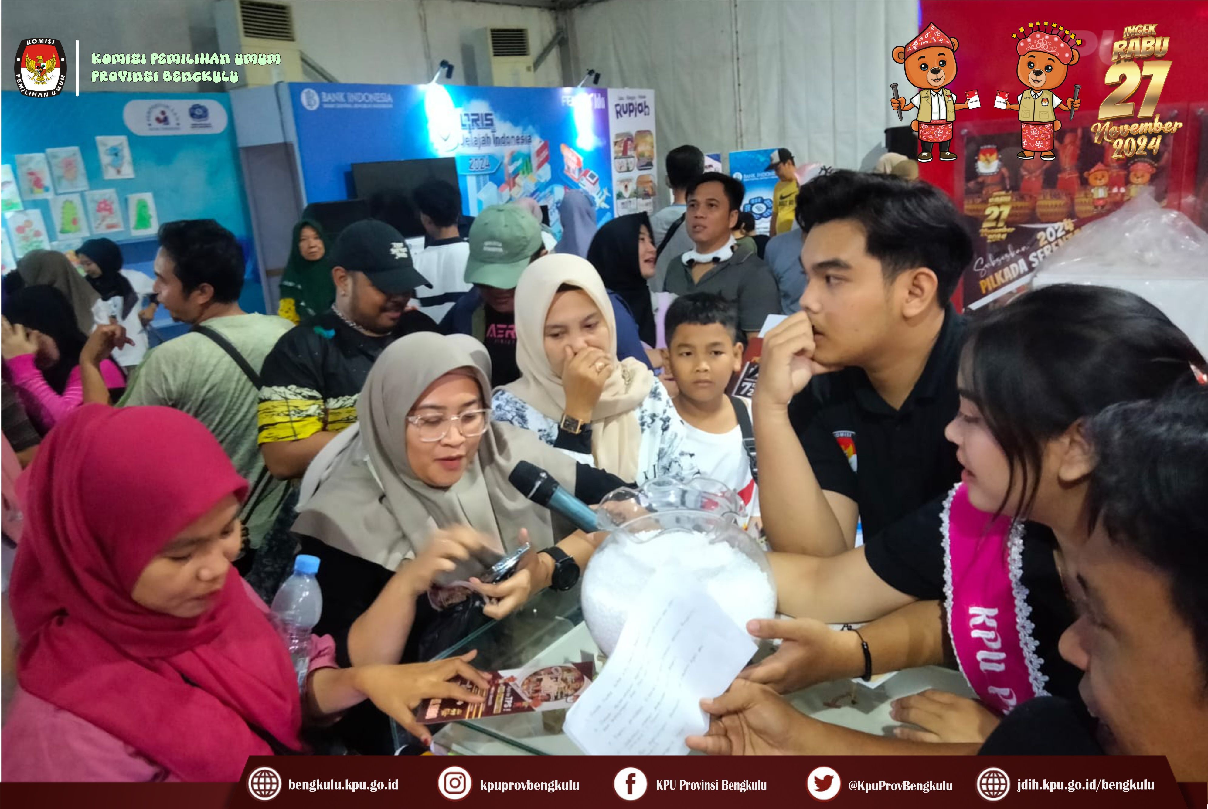 Bengkulu, bengkulu.kpu.go.id - Dalam rangka memeriahkan Festival Tabot Tahun 2024 yang berlangsung 6 s,d 16 Juli 2024 bertempat di Lapangan Merdeka Bengkulu, KPU Provinsi Bengkulu membuka Stand sebagai Sarana Media Sosialisasi dan Pendidikan Pemilih kepada masyarakat Provinsi Bengkulu. Stand KPU Provinsi Bengkulu menyajikan informasi tentang Pemilihan Serentak Tahun 2024, Kegiatan Tahapan yang telah dan sedang berjalan, Coklit yang berlangsung 24 Juni s.d 24 Juli 2024, Cek tanggapan masyarakat pada link https://infopemilu.kpu.go.id/Pemilihan/cek_pendukung, Partai Politik Peserta Pemilu 2024, Pendaftaran Pencalonan Gubernur, Bupati dan Walikota yang dimulai pada 27-29 Agustus 2024 serta Pemungutan Suara pada Rabu 27 November 2024 dan sebagainya. Ketua KPU Provinsi Bengkulu Rusman Sudarsono bersama Anggota KPU Provinsi Bengkulu Alpin Samsen, Dodi Hendra Supiarso dan Emex Verzoni serta Sekretaris Kemas Mohammad Ajir dan Kabag TPHS Oktan Huzaeiry hadir langsung ke stand KPU Provinsi Bengkulu. Selain itu, KPU Provinsi Bengkulu menyiapkan doorprize hadiah bagi masyarakat dengan cara memfollow instagram KPU Provinsi Bengkulu diantaranya Payung, Jam Dinding, Mug, Boneka Maskot Pilkada Si Bemi dan Si Bemo, Headset, Gantung kunci dan sebagainya.