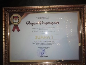 Terbaik dalam Pelaporan Badan Adhoc Penyelenggaraan Pemilihan Serentak Tahun 2020, Juara I Provinsi Terbaik Penginput Data Daftar Pemilih Tetap (DPT) ke dalam Sidalih Dalam Pemilihan Tahun 2020, Juara 2 Provinsi Terbaik dalam bidang Partisipasi Pemilihan Gubernur dan Wakil Gubernur Tahun 2020, Juara 3 Provinsi terbaik Penginput Data Hasil Coklit ke Sidalih dalam Pemilihan Tahun 2020 dan Juara 3 Provinsi Terbaik dalam Pelayanan dan Fasilitasi Pelaporan Dana Kampanye Pemilihan Tahun 2020.