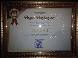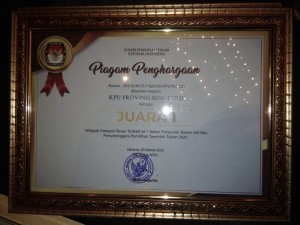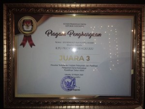 Penghargaan ini didedikasikan kepada seluruh penyelenggara pemilihan mulai dari KPPS, PPDP, PPK, KPU Kab/Kabupaten Kota, Instansi/Stakeholder terkait dan seluruh masyarakat Provinsi Bengkulu, yang telah berpartisipasi dalam menyukseskan penyelenggaraan Pemilihan Serentak Tahun 2020, baik Pemilihan Gubernur dan Wakil Gubernur maupun Pemilihan Bupati dan Wakil Bupati.