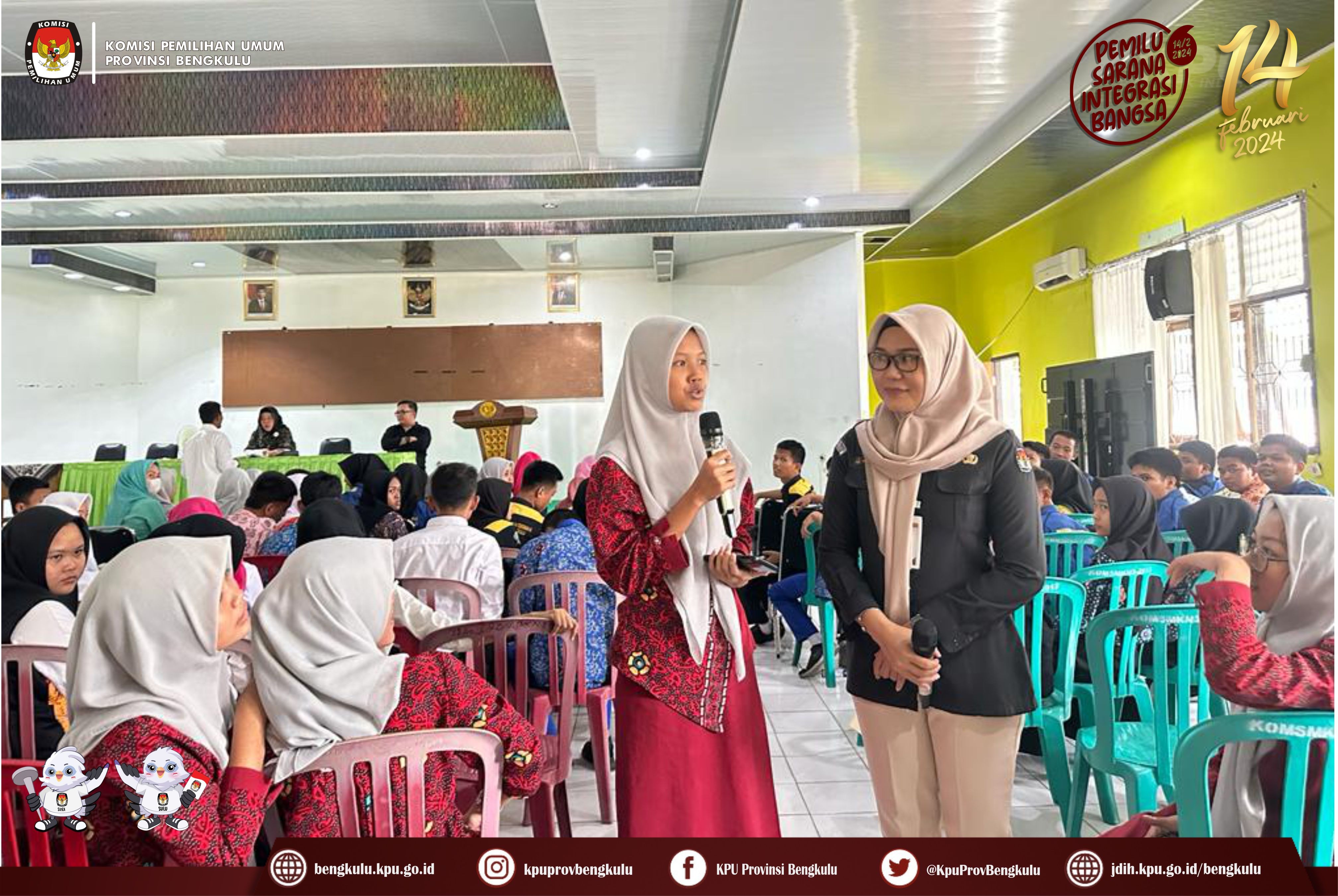 Bengkulu, bengkulu.kpu.go.id, - Staf Hukum dan SDM KPU Provinsi Bengkulu Media Septidira hadir sebagai Narasumber Roadshow Sosialisasi Pemilu Serentak Tahun 2024 yang diselenggarakan kerjasama KPU Provinsi Bengkulu dan Harian Rakyat Bengkulu, Rabu (9/8/2023) bertempat di Aula SMKN 3 Kota Bengkulu. Peserta kegiatan adalah Siswa Siswi SMKN 3 Kota Bengkulu. Dalam kesempatan itu, Media menyampaikan materi terkait peran pemilih pemula dalam Pemilu Tahun 2024, Cek DPT online di https://dptonline.kpu.go.id/ , cara cerdas menjadi pemilih pemula, syarat menjadi pemilih, dan sebagainya. Selain itu, ada diskusi tanya jawab dan pembagian doorprize.