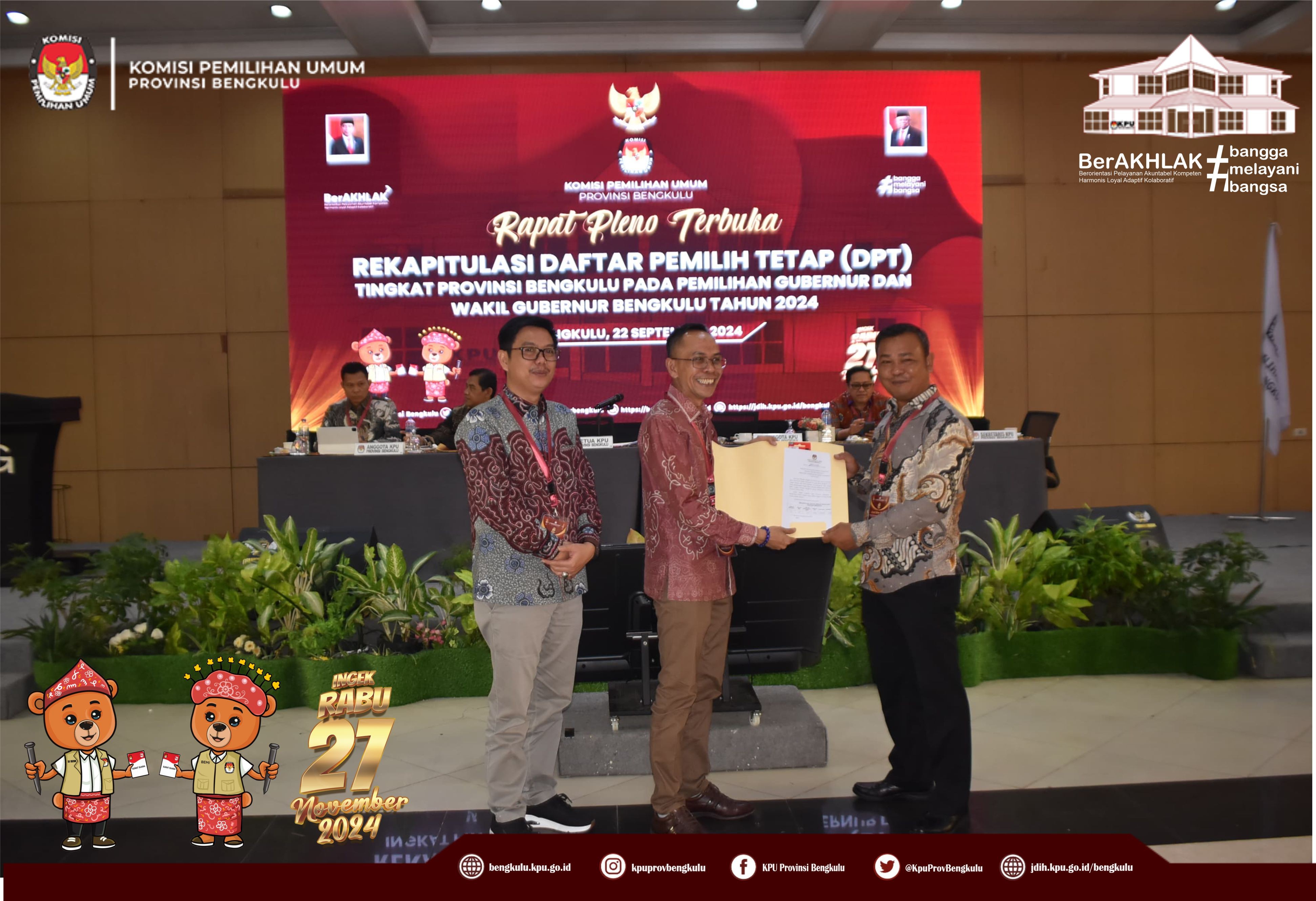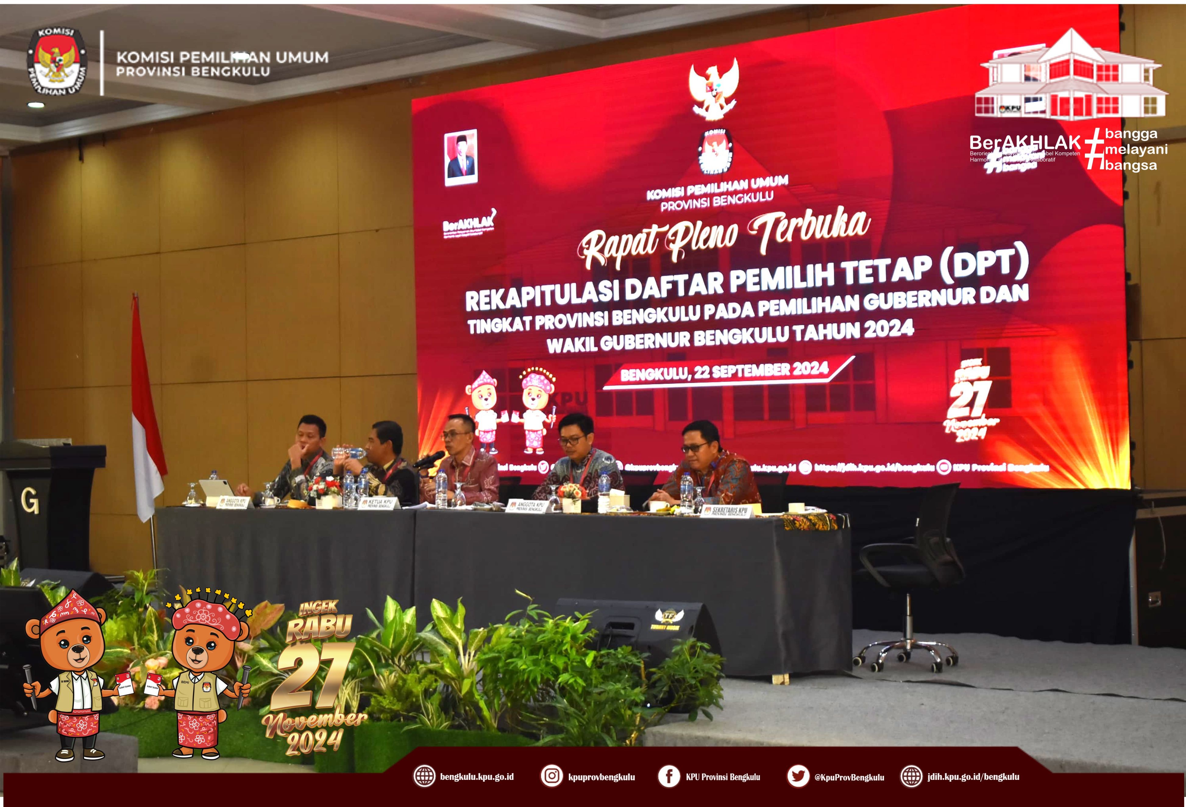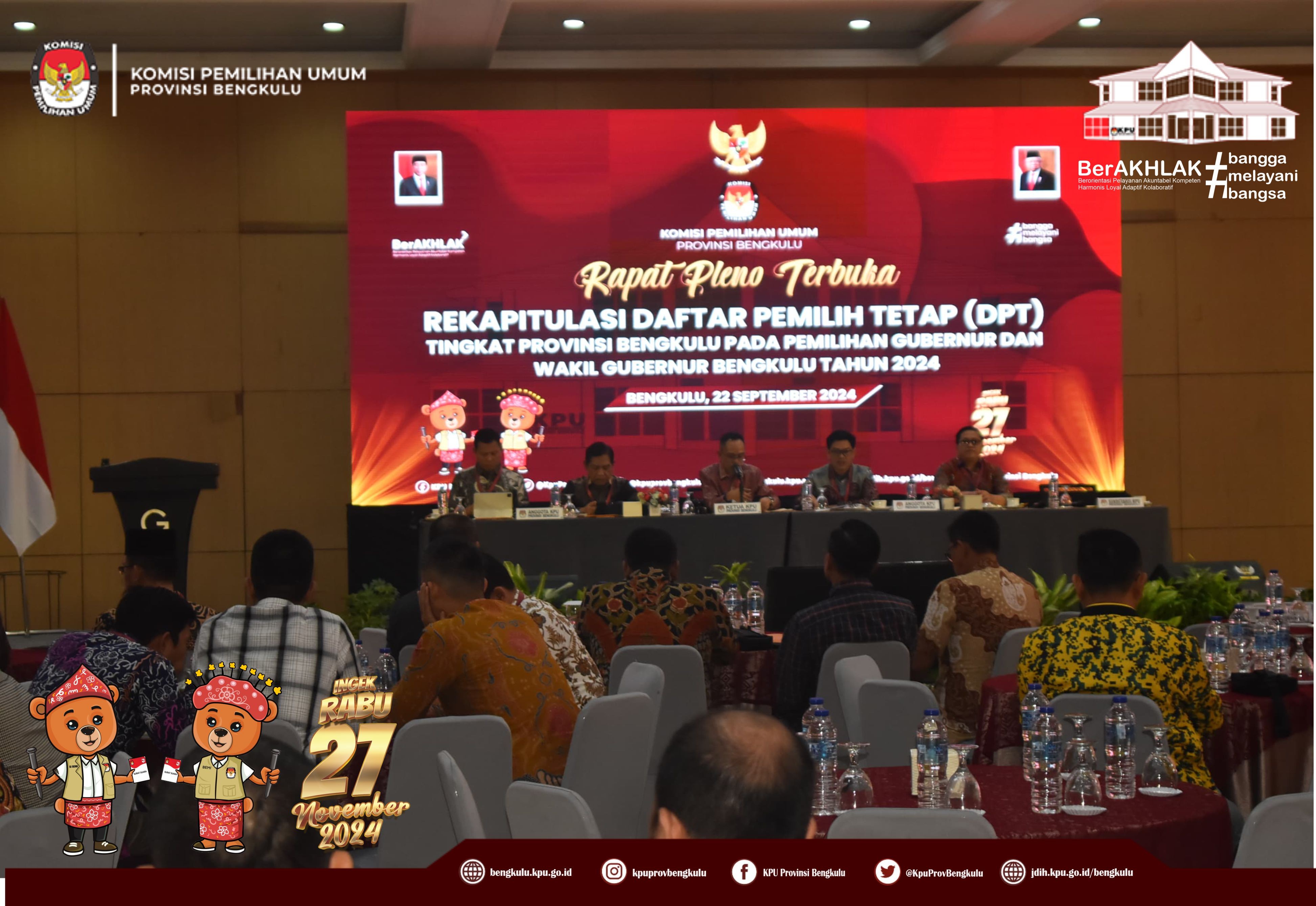 Bengkulu, bengkulu.kpu.go.id - Ketua KPU Provinsi Bengkulu Rusman Sudarsono bersama Anggota KPU Provinsi Bengkulu Alpin Samsen, Dodi Hendra Supiarso, Emex Verzoni dan Sarjan Efendi membuka dan memimpin pelaksanaan Rapat Pleno Terbuka Rekapitulasi Daftar Pemilih Tetap (DPT) Tingkat Provinsi Bengkulu Pada Pemilihan Gubernur dan Wakil Gubernur Bengkulu Tahun 2024, Minggu (22/9/2024) di Grage Hotel Bengkulu. Hadir perwakilan unsur forkopimda meliputi Gubernur, Polda, Korem 041 Gamas, DPRD Provinsi, Kejati, Pengadilan Tinggi, Lanal, Binda, KPID, KIP, Kesbangpol, Kanwil Kemenkumham, Dinas Dukcapil, Bawaslu, Tim Pelaksana Kegiatan, Tim Bakal Pasangan Calon Gubernur dan Wakil Gubernur Bengkulu serta Ketua, Anggota, Sekretaris Kasubbag Perencanaan Data dan Informasi serta Admin/Operator Sidalih KPU Kabupaten/Kota se-Provinsi Bengkulu. Berdasarkan hasil rapat pleno terbuka KPU Provinsi Bengkulu menetapkan Daftar Pemilih Tetap (DPT) sebanyak 1.503.923 pemlih dengan rincian laki-Laki sebanyak 759.095 pemilih dan perempuan sebanyak 744.828 pemilih yang tersebar pada 10 Kabupaten/Kota, 129 Kecamatan, 1.513 Desa/Kelurahan dan 3.452 TPS. Hasil penetapan DPT dituangkan ke dalam Berita Acara dan Keputusan KPU Provinsi Bengkulu. KPU Provinsi Bengkulu menyampaikan hasil rekapitulasi DPT Tingkat Provinsi Bengkulu kepada Tim Bakal Pasangan Calon Gubernur dan Wakil Gubernur, Forkompinda dan Bawaslu Provinsi Bengkulu.