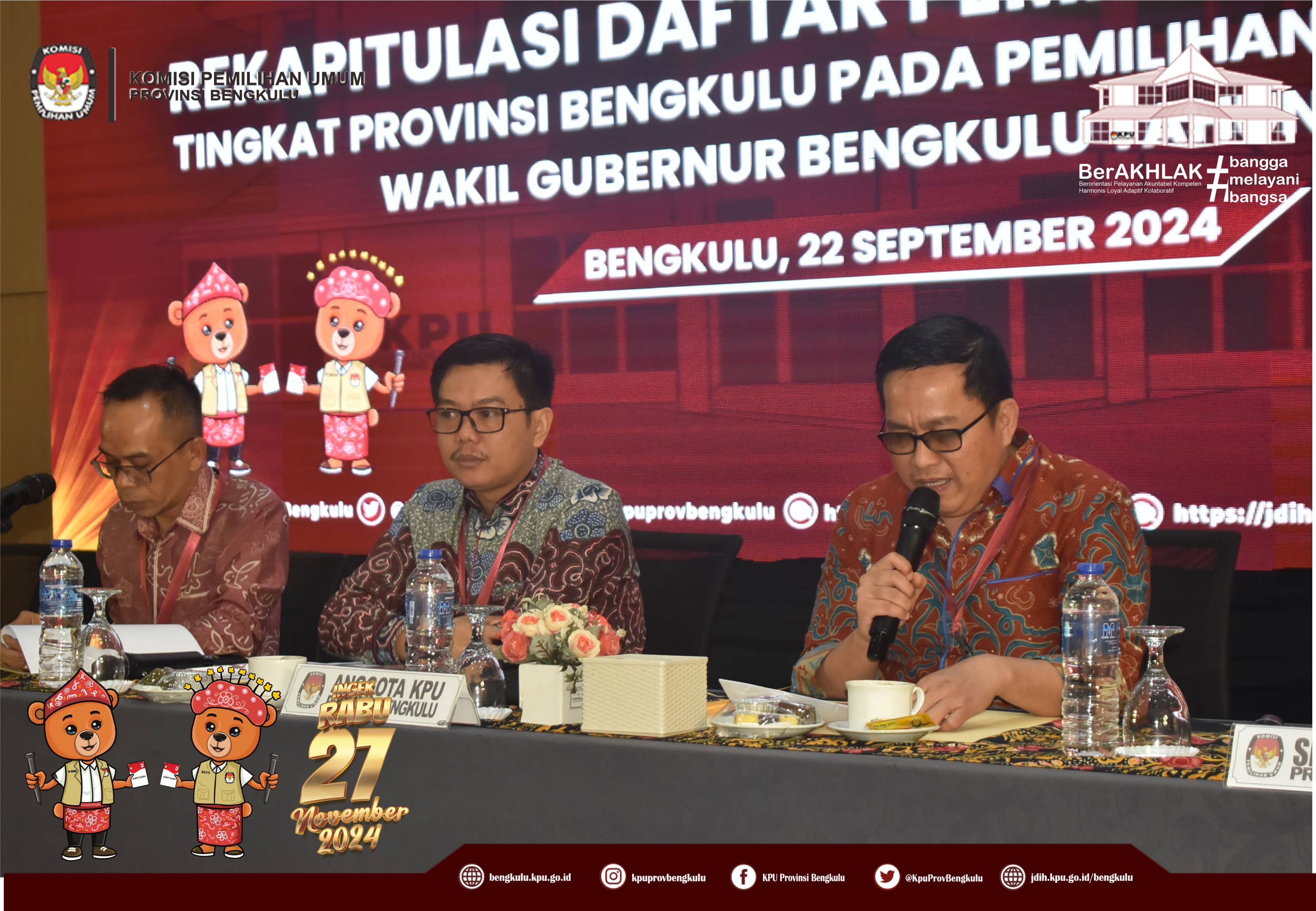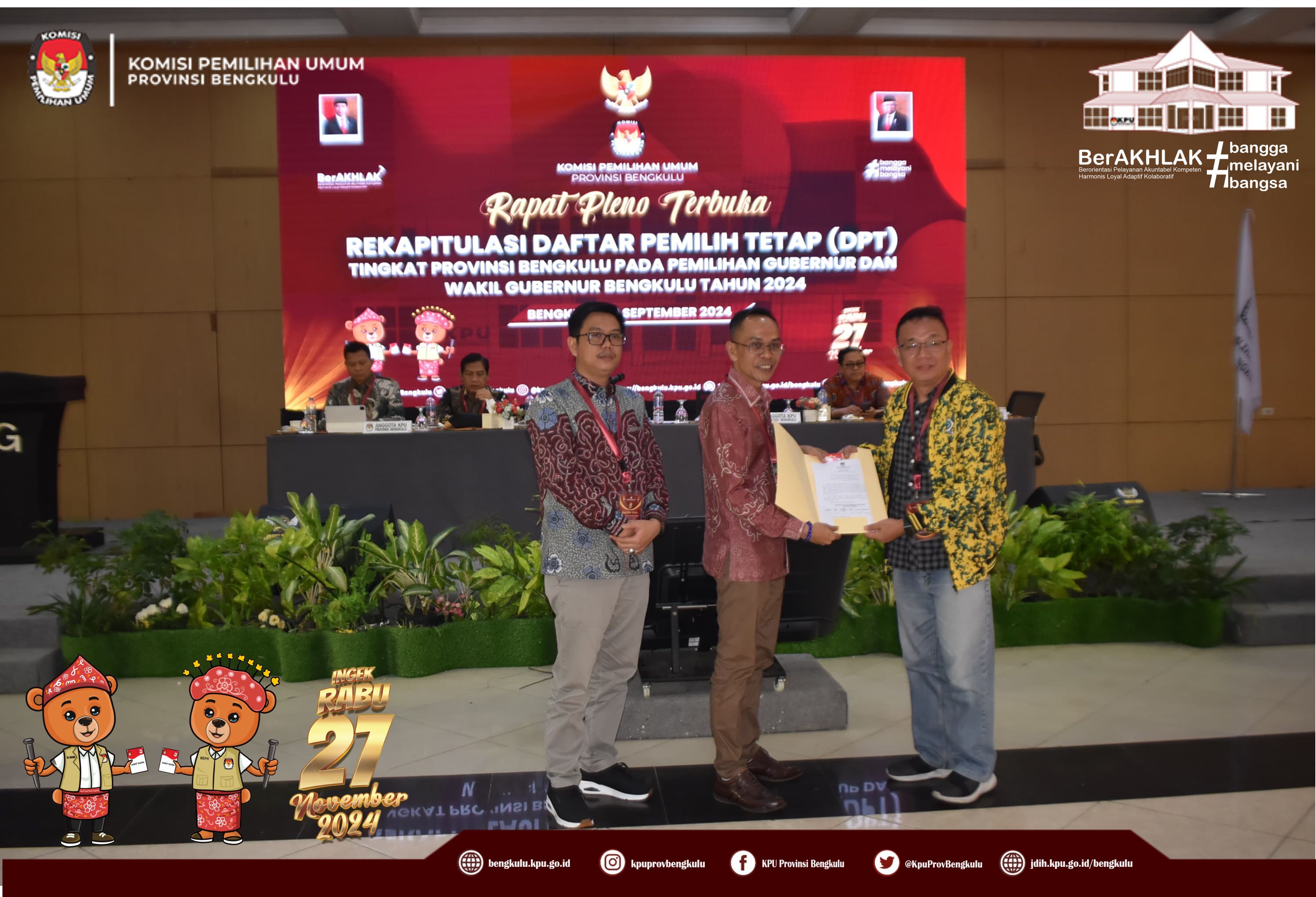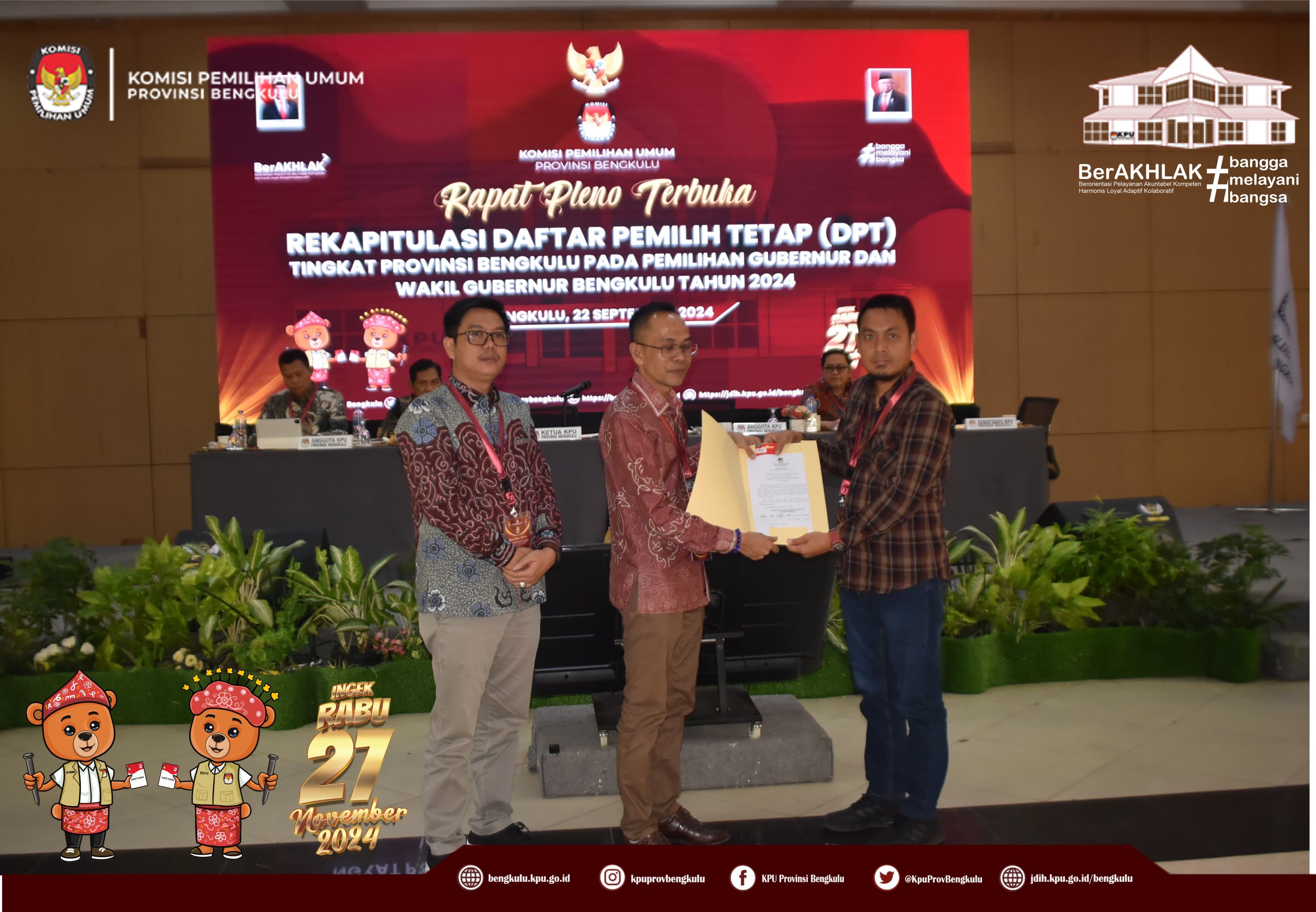 Bengkulu, bengkulu.kpu.go.id - Ketua KPU Provinsi Bengkulu Rusman Sudarsono bersama Anggota KPU Provinsi Bengkulu Alpin Samsen, Dodi Hendra Supiarso, Emex Verzoni dan Sarjan Efendi membuka dan memimpin pelaksanaan Rapat Pleno Terbuka Rekapitulasi Daftar Pemilih Tetap (DPT) Tingkat Provinsi Bengkulu Pada Pemilihan Gubernur dan Wakil Gubernur Bengkulu Tahun 2024, Minggu (22/9/2024) di Grage Hotel Bengkulu. Hadir perwakilan unsur forkopimda meliputi Gubernur, Polda, Korem 041 Gamas, DPRD Provinsi, Kejati, Pengadilan Tinggi, Lanal, Binda, KPID, KIP, Kesbangpol, Kanwil Kemenkumham, Dinas Dukcapil, Bawaslu, Tim Pelaksana Kegiatan, Tim Bakal Pasangan Calon Gubernur dan Wakil Gubernur Bengkulu serta Ketua, Anggota, Sekretaris Kasubbag Perencanaan Data dan Informasi serta Admin/Operator Sidalih KPU Kabupaten/Kota se-Provinsi Bengkulu. Berdasarkan hasil rapat pleno terbuka KPU Provinsi Bengkulu menetapkan Daftar Pemilih Tetap (DPT) sebanyak 1.503.923 pemlih dengan rincian laki-Laki sebanyak 759.095 pemilih dan perempuan sebanyak 744.828 pemilih yang tersebar pada 10 Kabupaten/Kota, 129 Kecamatan, 1.513 Desa/Kelurahan dan 3.452 TPS. Hasil penetapan DPT dituangkan ke dalam Berita Acara dan Keputusan KPU Provinsi Bengkulu. KPU Provinsi Bengkulu menyampaikan hasil rekapitulasi DPT Tingkat Provinsi Bengkulu kepada Tim Bakal Pasangan Calon Gubernur dan Wakil Gubernur, Forkompinda dan Bawaslu Provinsi Bengkulu.